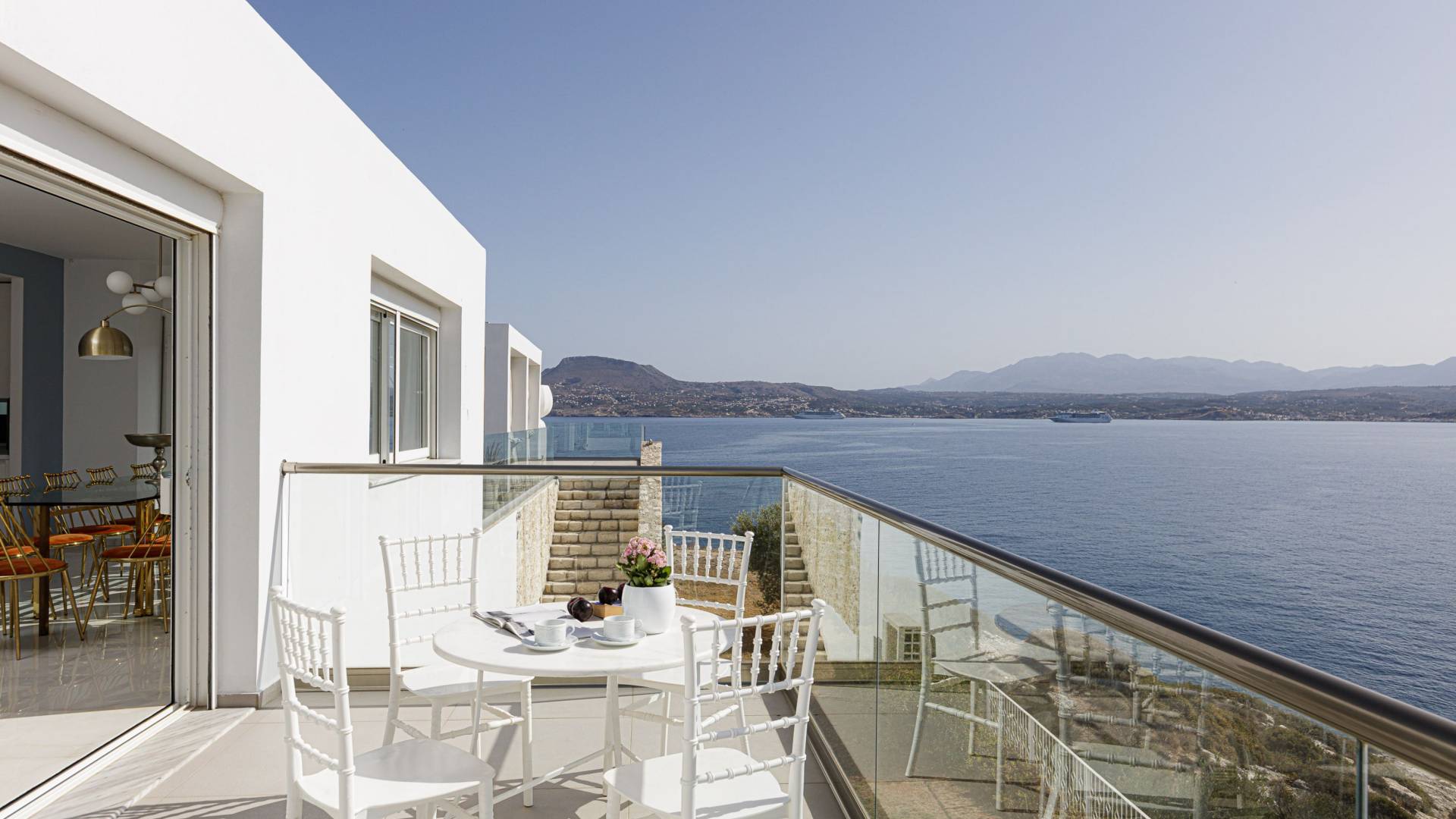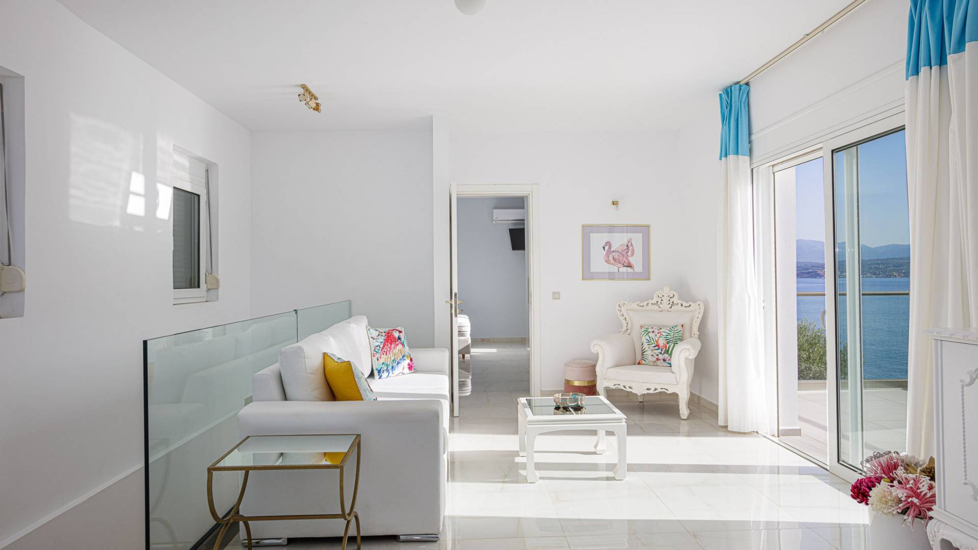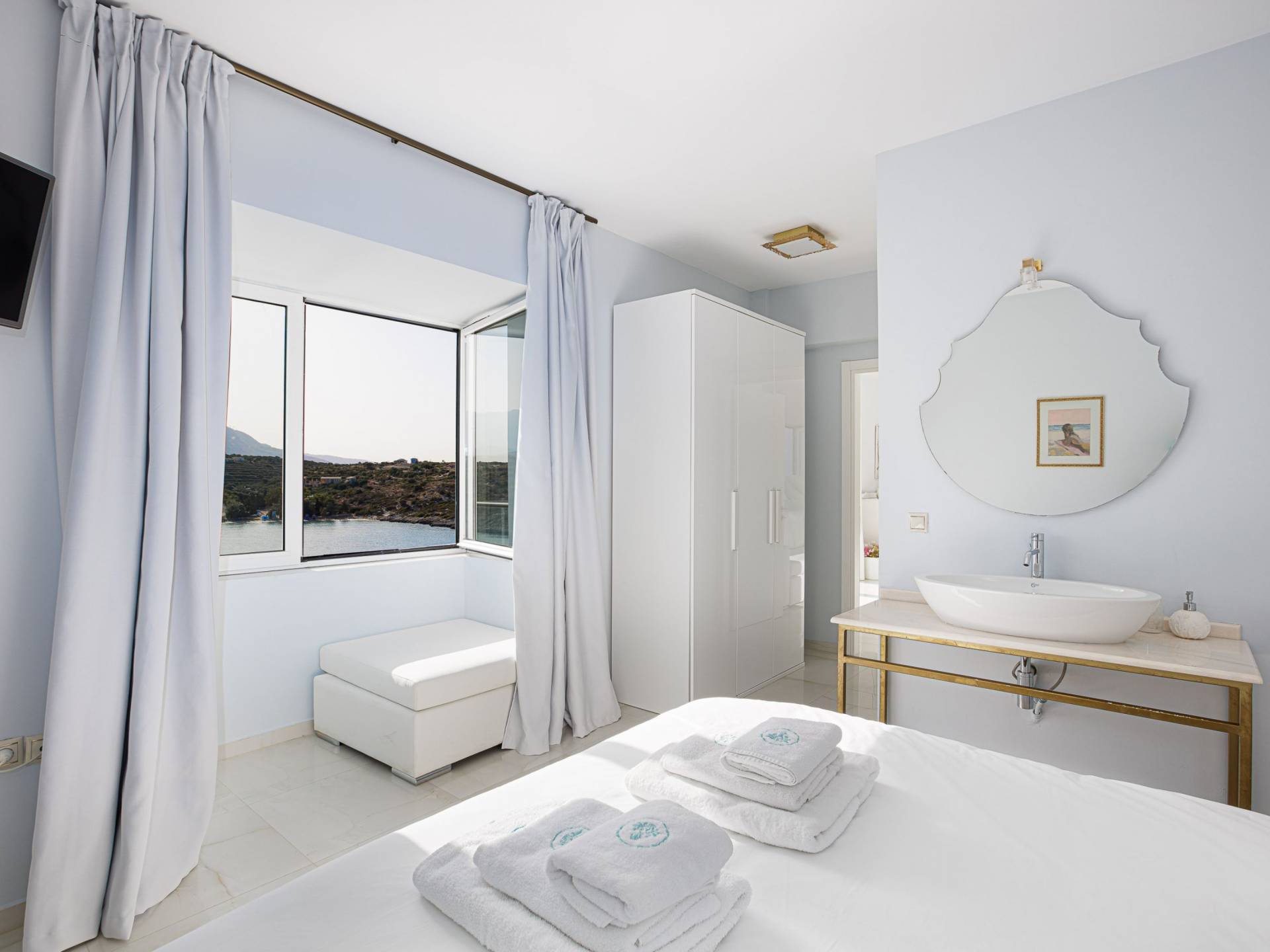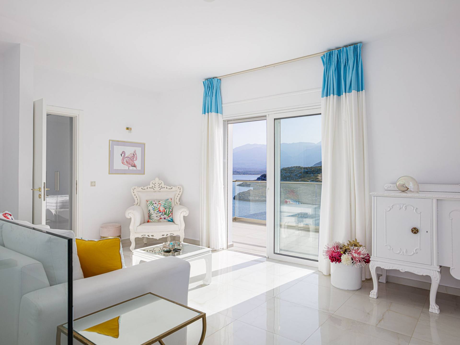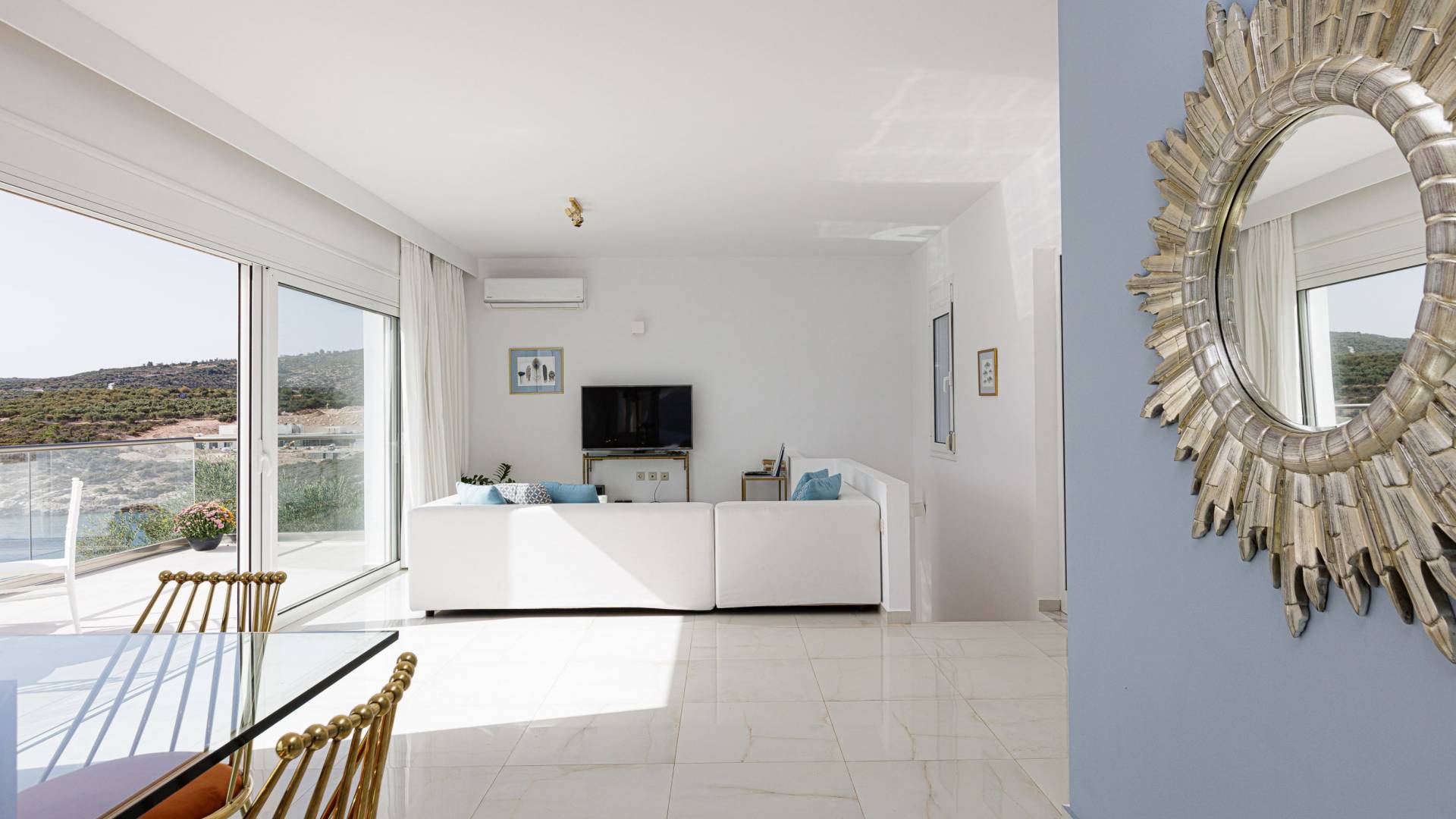 Villa Seasa Chania ha uno stile minimale ma eclettico con tocchi di ottone e colori oro. In tandem con le lussureggianti tende bianche che drappeggiano le porte scorrevoli in vetro che conducono ai balconi che offrono viste discrete sulla baia di Loutraki, l'arredamento ricorda il vecchio stile Regency. Questa è stata la base dell'intera costruzione e decorazione della villa ed è ciò che la rende unica e molto diversa dalle tendenze contemporanee di oggi.