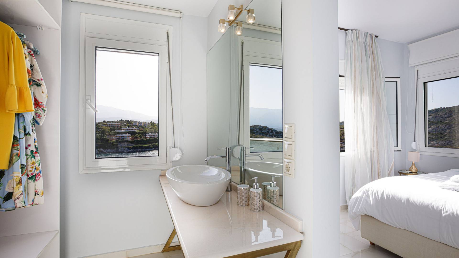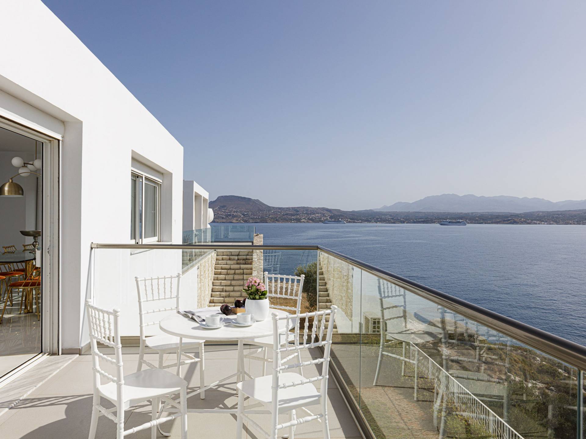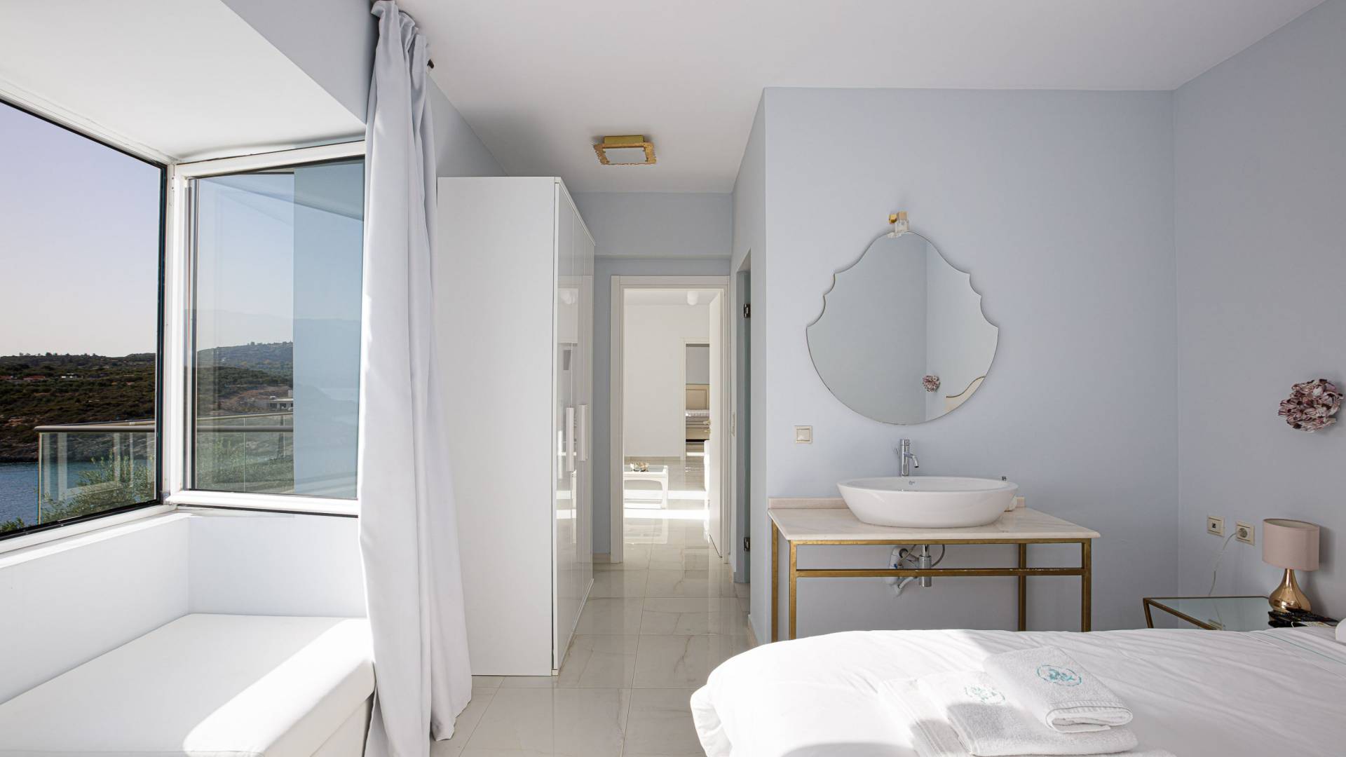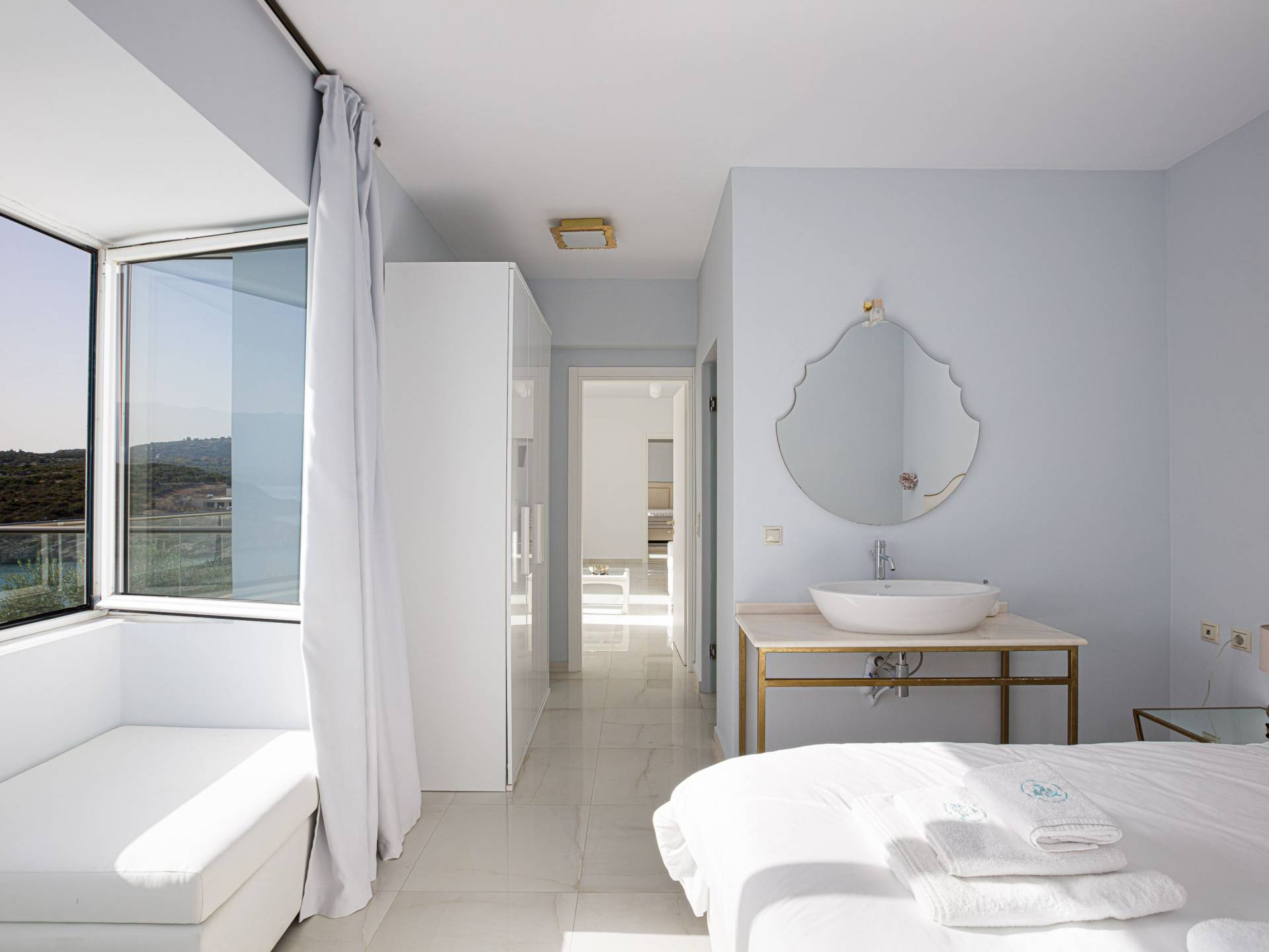 Villa Seasa Chania ha uno stile minimale ma eclettico con tocchi di ottone e colori oro. In tandem con le lussureggianti tende bianche che drappeggiano le porte scorrevoli in vetro che conducono ai balconi che offrono viste discrete sulla baia di Loutraki, l'arredamento ricorda il vecchio stile Regency. Questa è stata la base dell'intera costruzione e decorazione della villa ed è ciò che la rende unica e molto diversa dalle tendenze contemporanee di oggi.