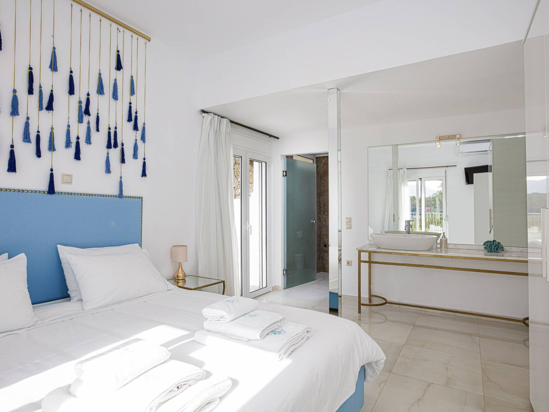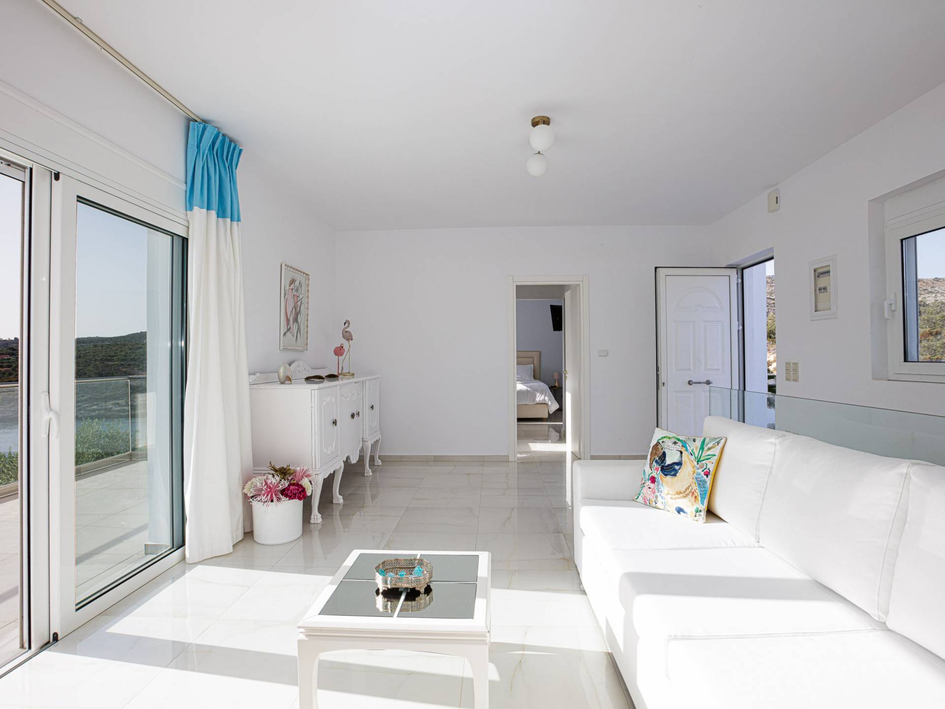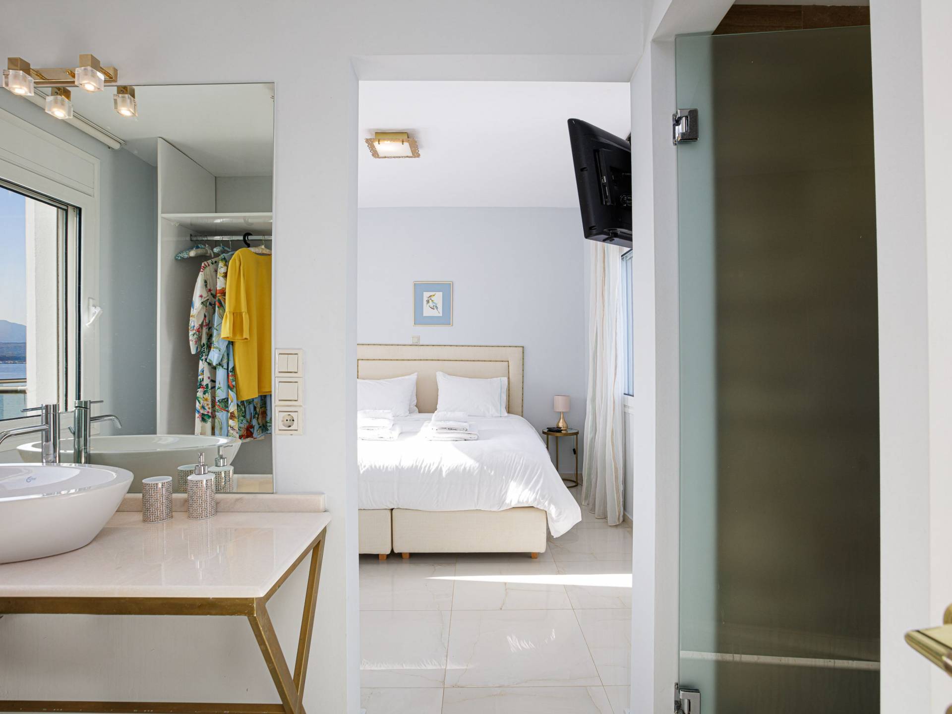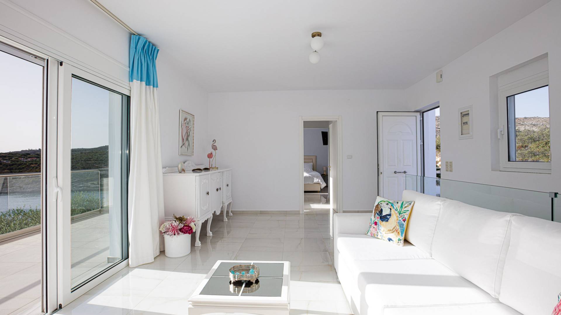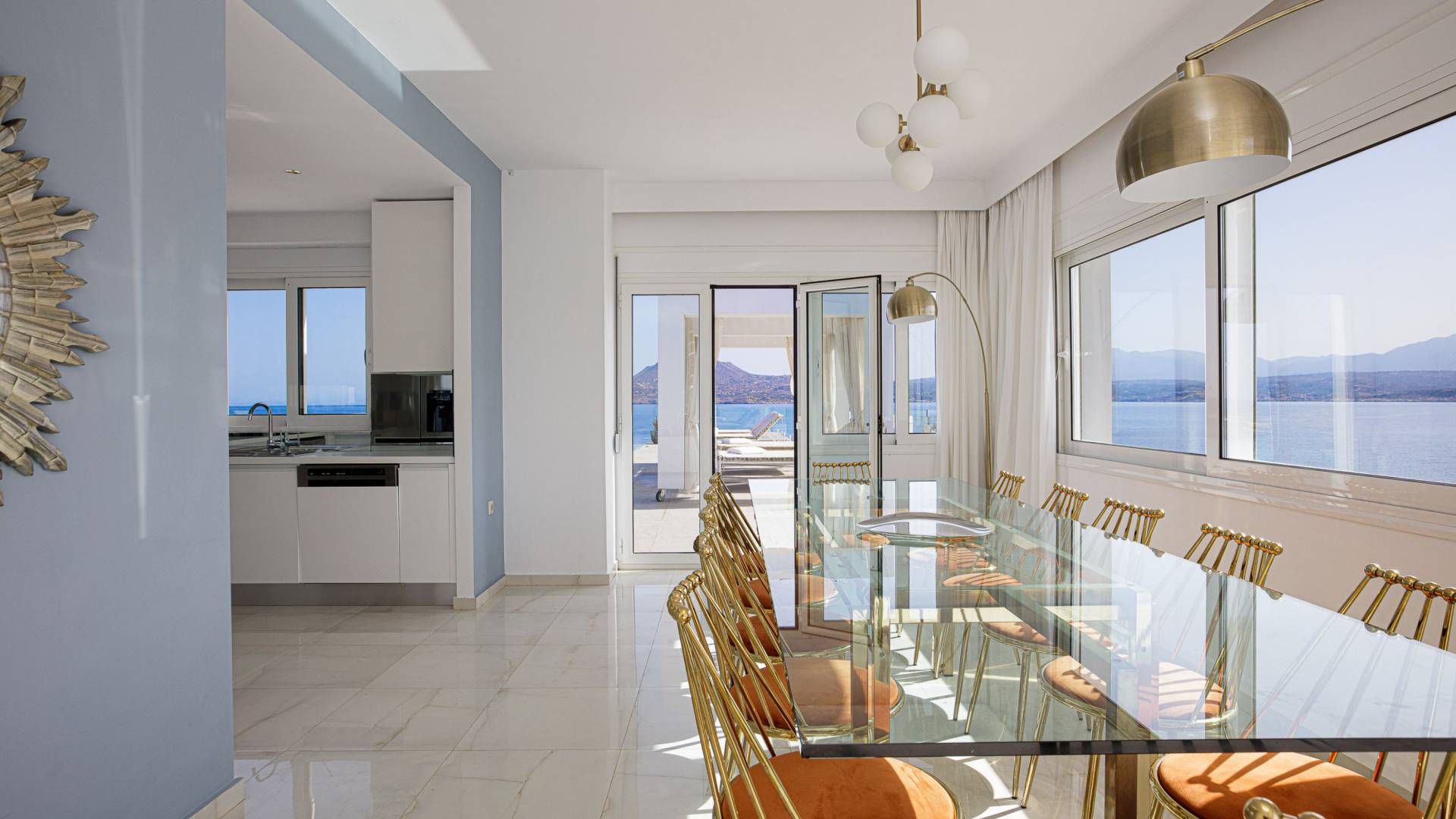 Villa Seasa Chania ha uno stile minimale ma eclettico con tocchi di ottone e colori oro. In tandem con le lussureggianti tende bianche che drappeggiano le porte scorrevoli in vetro che conducono ai balconi che offrono viste discrete sulla baia di Loutraki, l'arredamento ricorda il vecchio stile Regency. Questa è stata la base dell'intera costruzione e decorazione della villa ed è ciò che la rende unica e molto diversa dalle tendenze contemporanee di oggi.