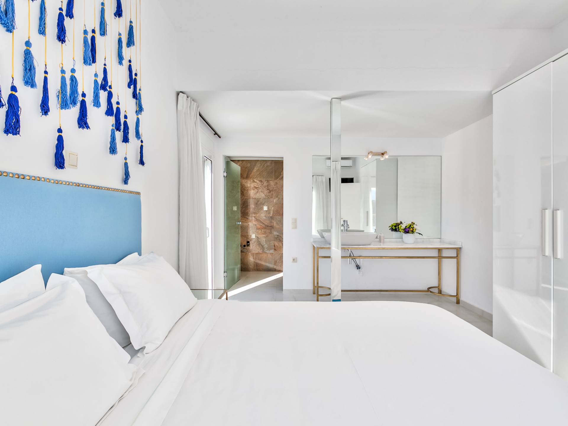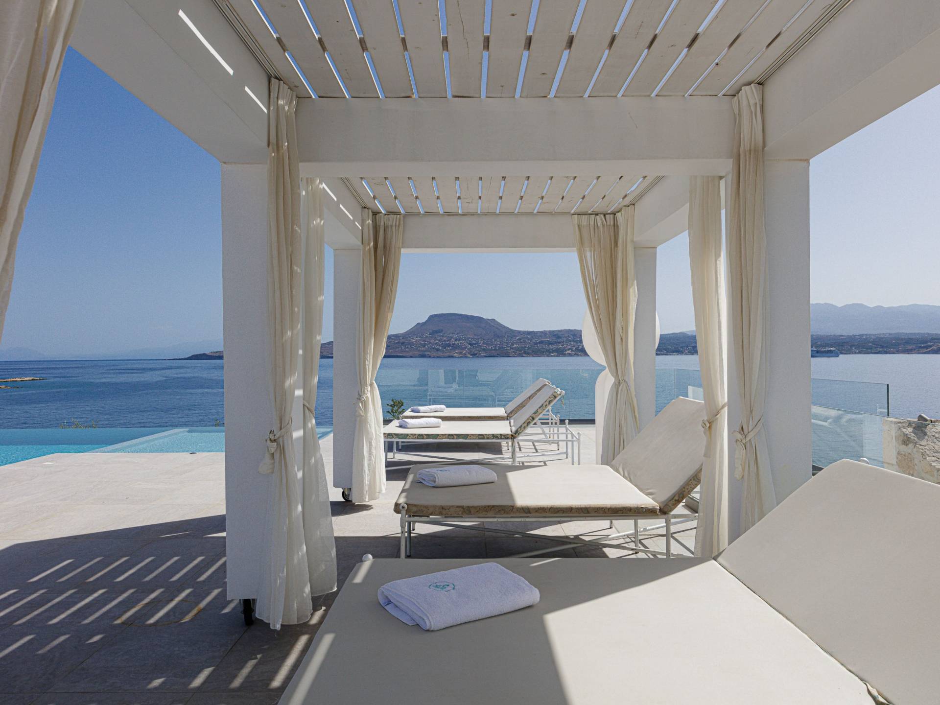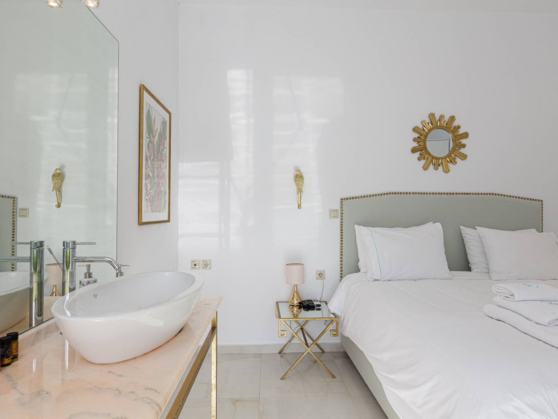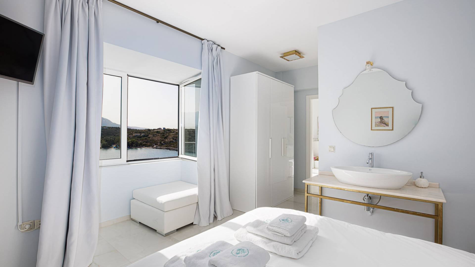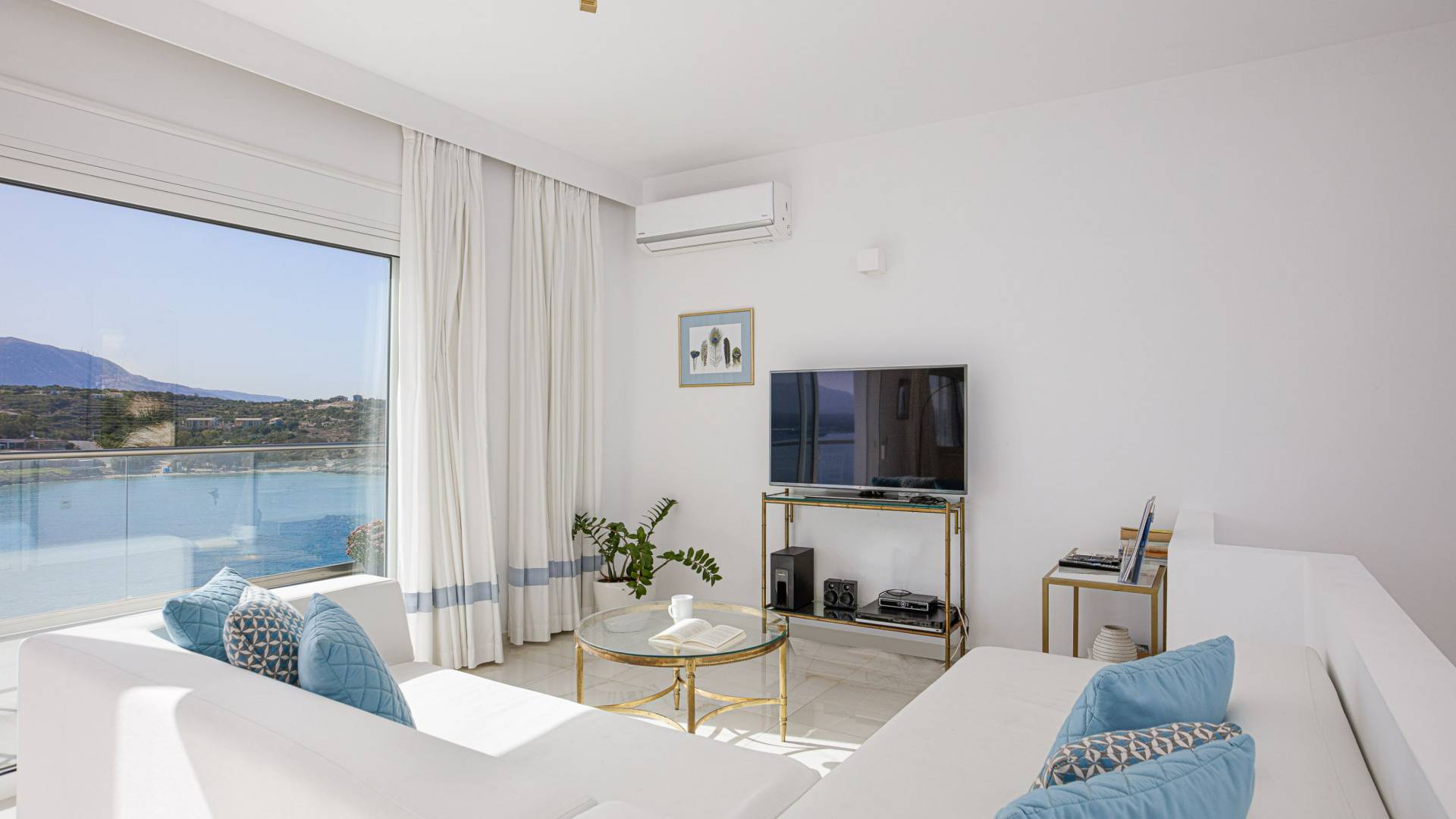 Villa Seasa Chania ha uno stile minimale ma eclettico con tocchi di ottone e colori oro. In tandem con le lussureggianti tende bianche che drappeggiano le porte scorrevoli in vetro che conducono ai balconi che offrono viste discrete sulla baia di Loutraki, l'arredamento ricorda il vecchio stile Regency. Questa è stata la base dell'intera costruzione e decorazione della villa ed è ciò che la rende unica e molto diversa dalle tendenze contemporanee di oggi.