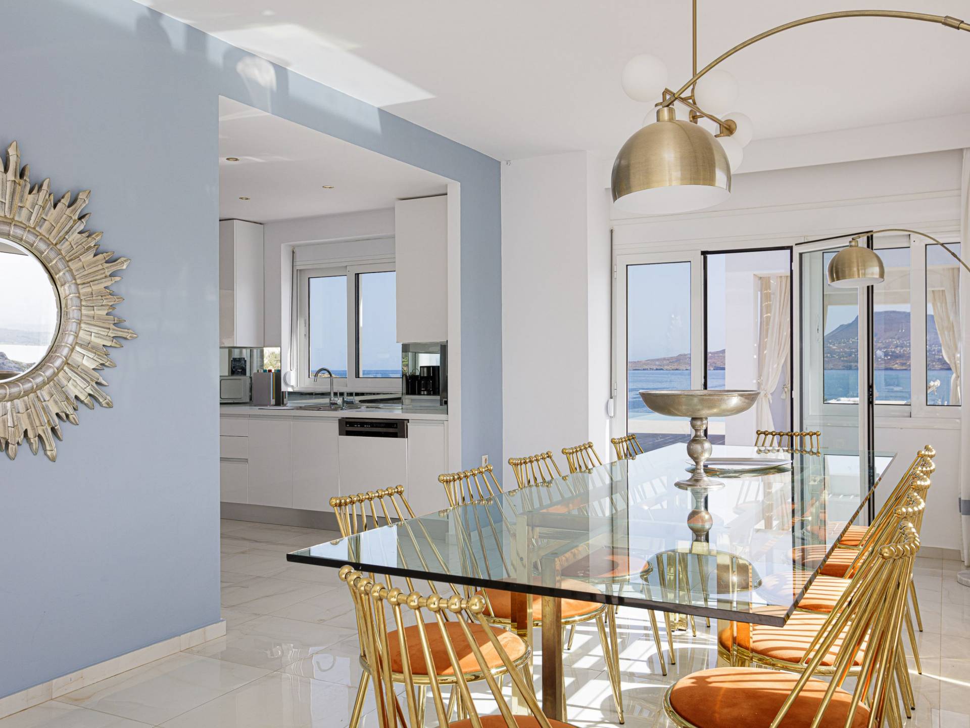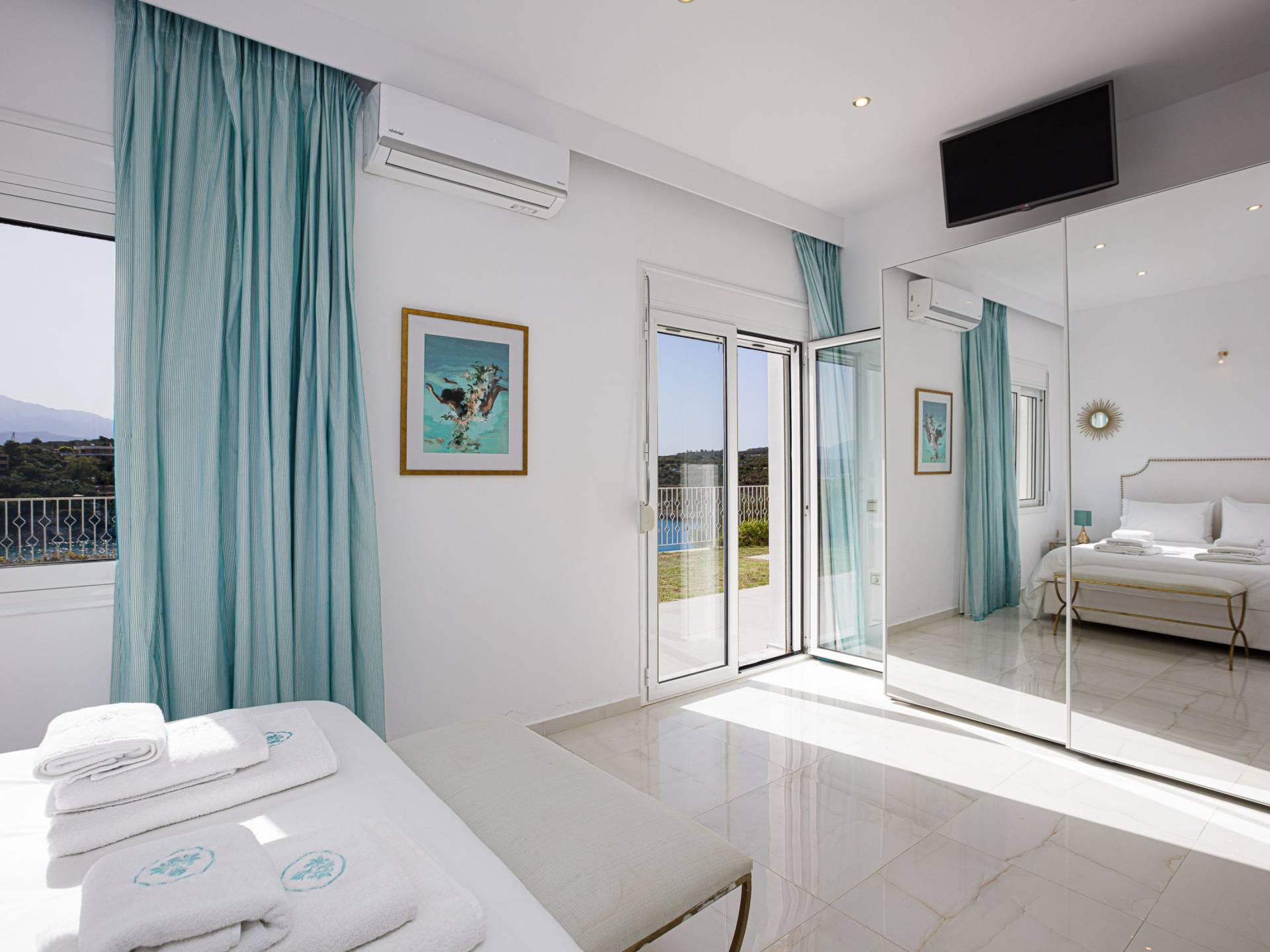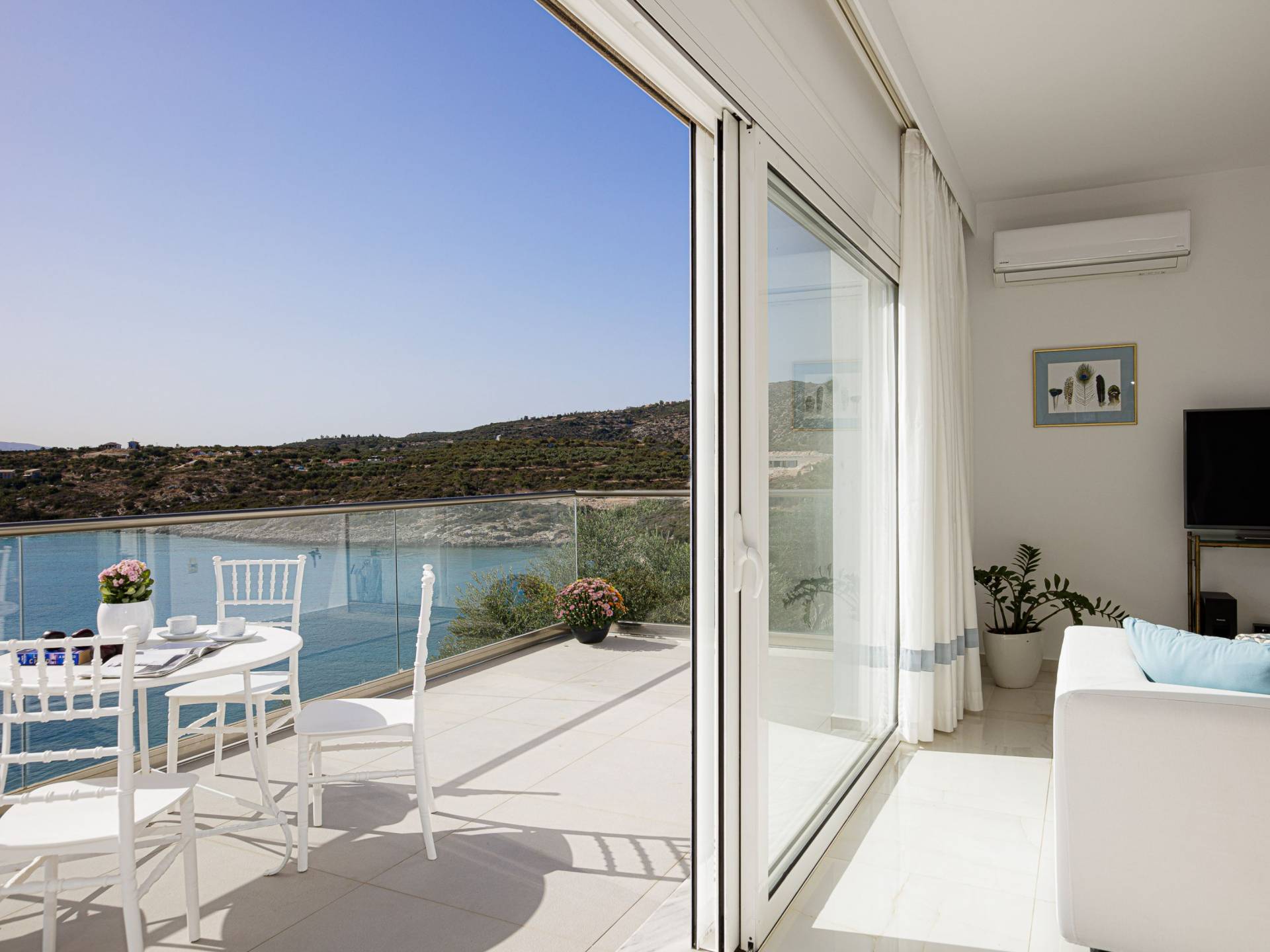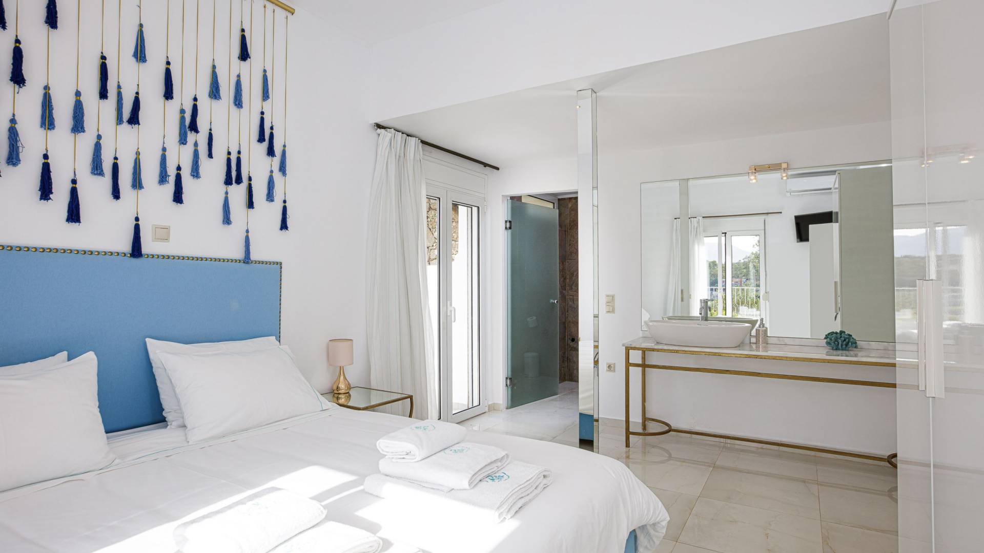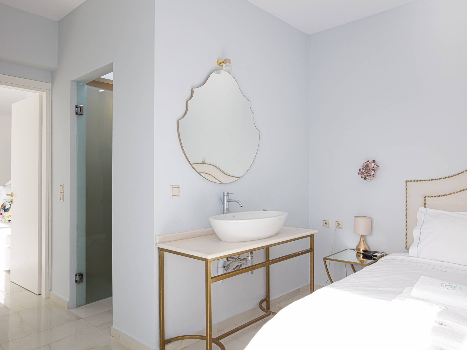 Villa Seasa Chania ha uno stile minimale ma eclettico con tocchi di ottone e colori oro. In tandem con le lussureggianti tende bianche che drappeggiano le porte scorrevoli in vetro che conducono ai balconi che offrono viste discrete sulla baia di Loutraki, l'arredamento ricorda il vecchio stile Regency. Questa è stata la base dell'intera costruzione e decorazione della villa ed è ciò che la rende unica e molto diversa dalle tendenze contemporanee di oggi.