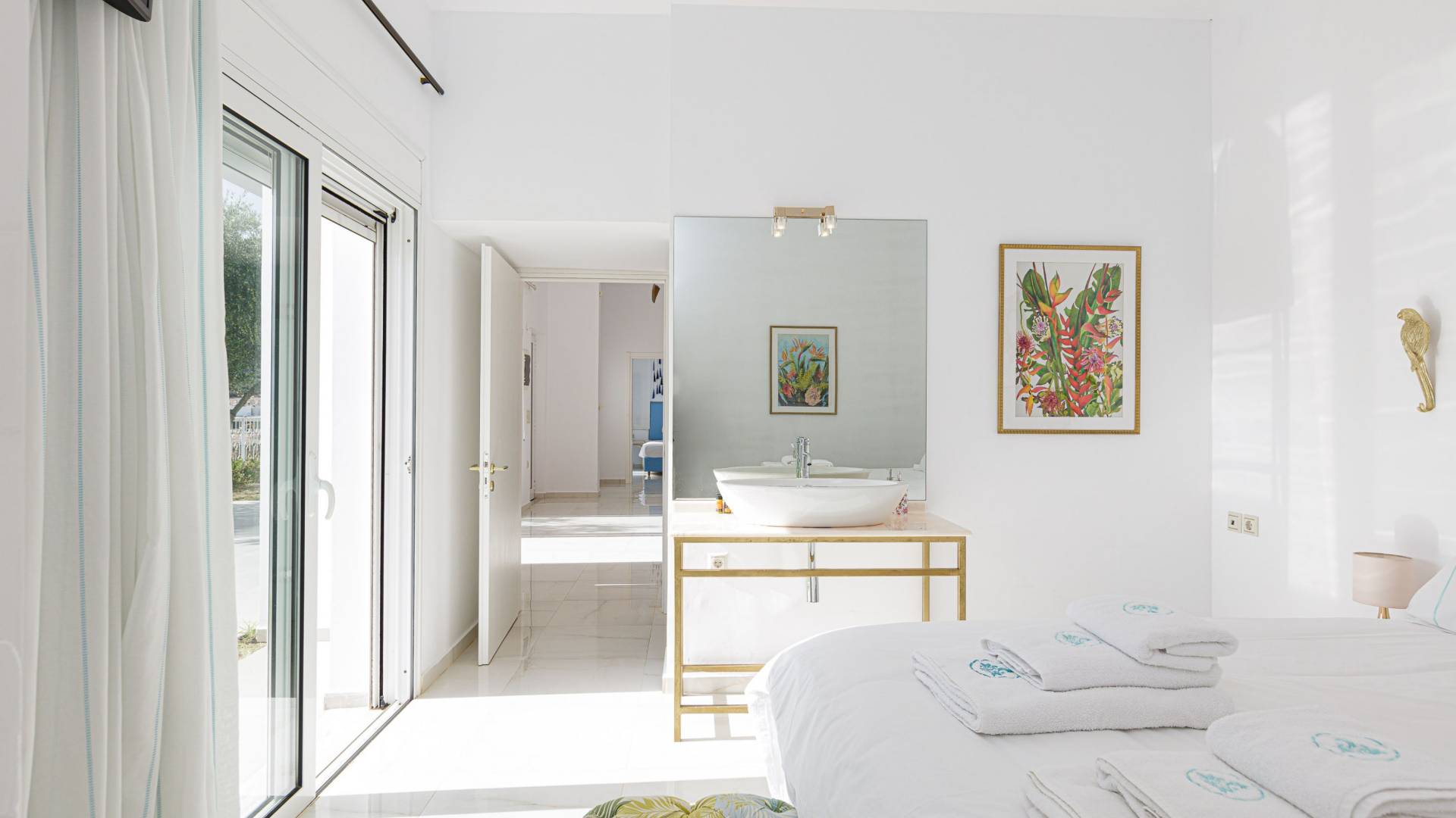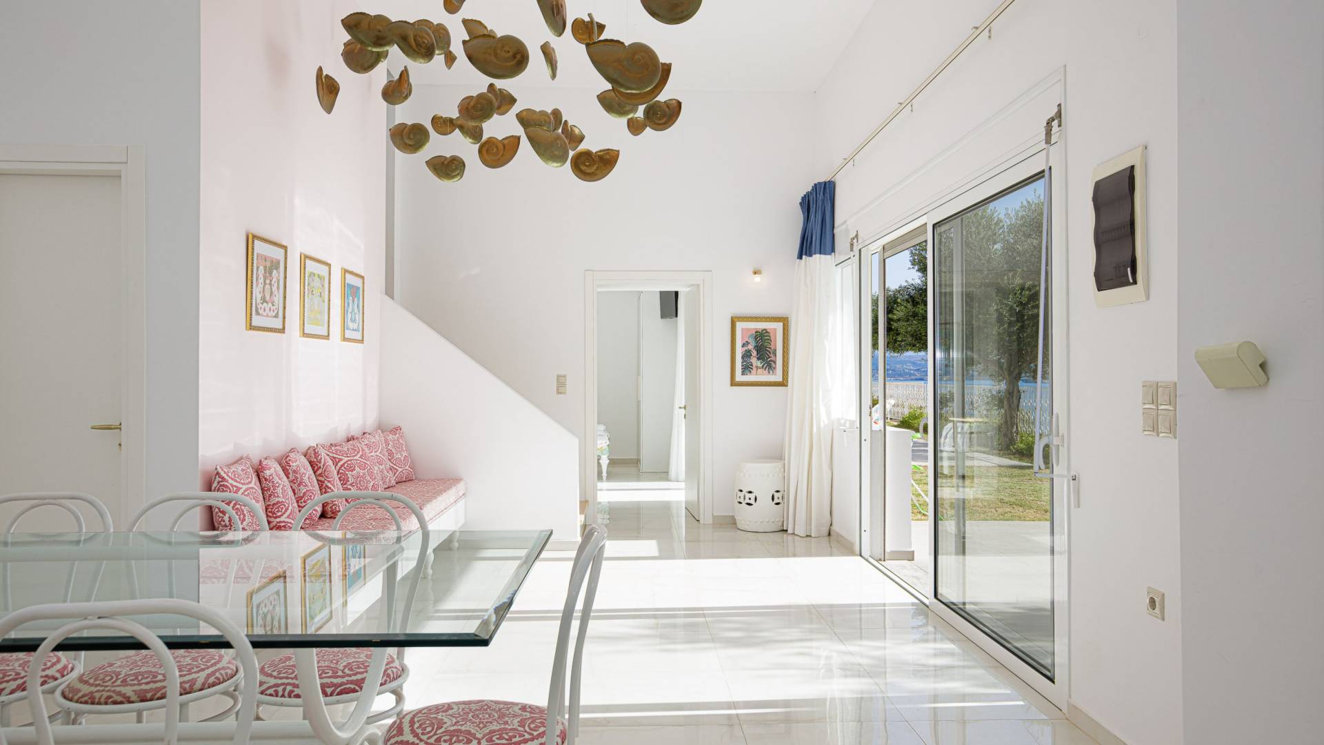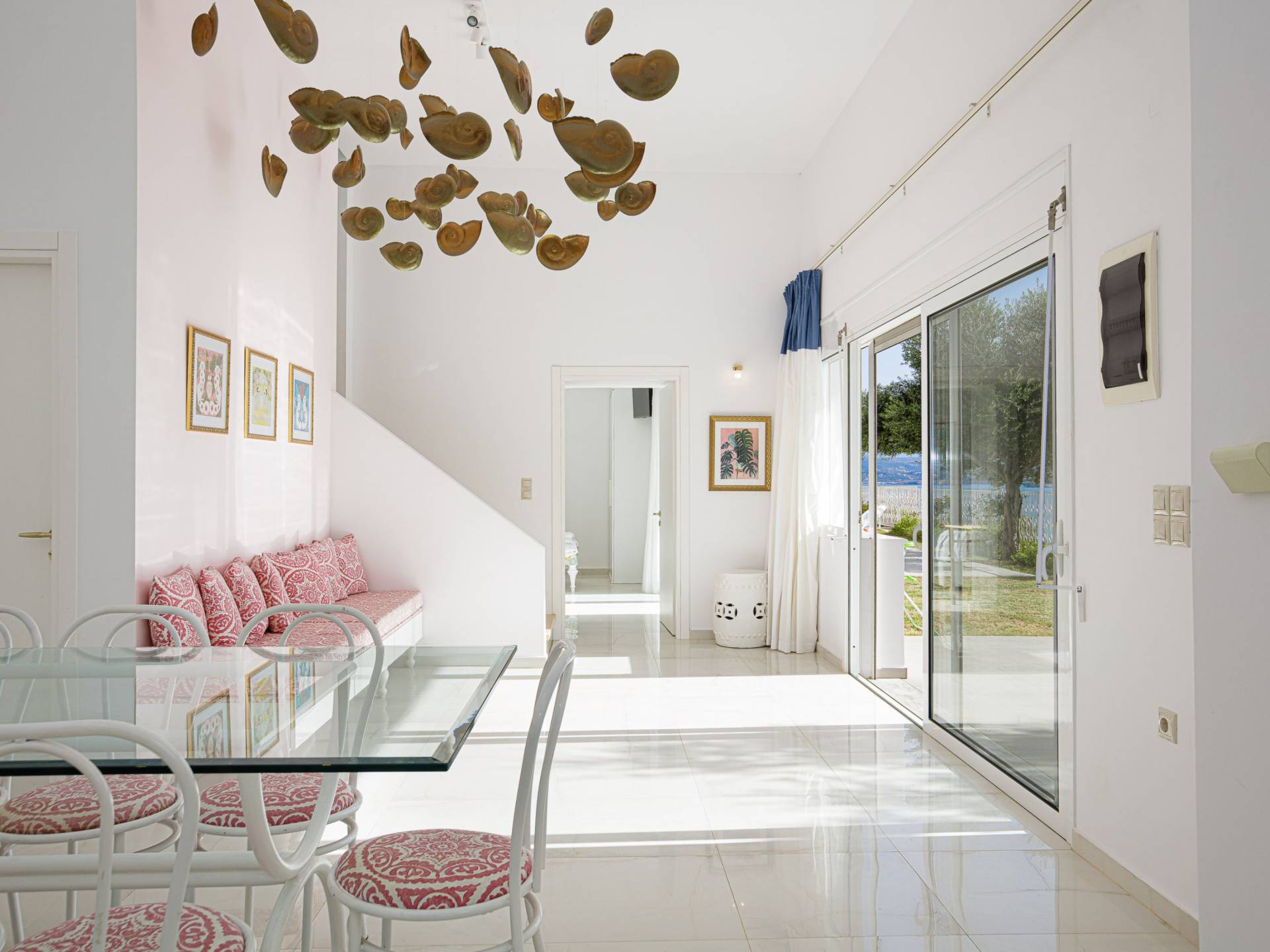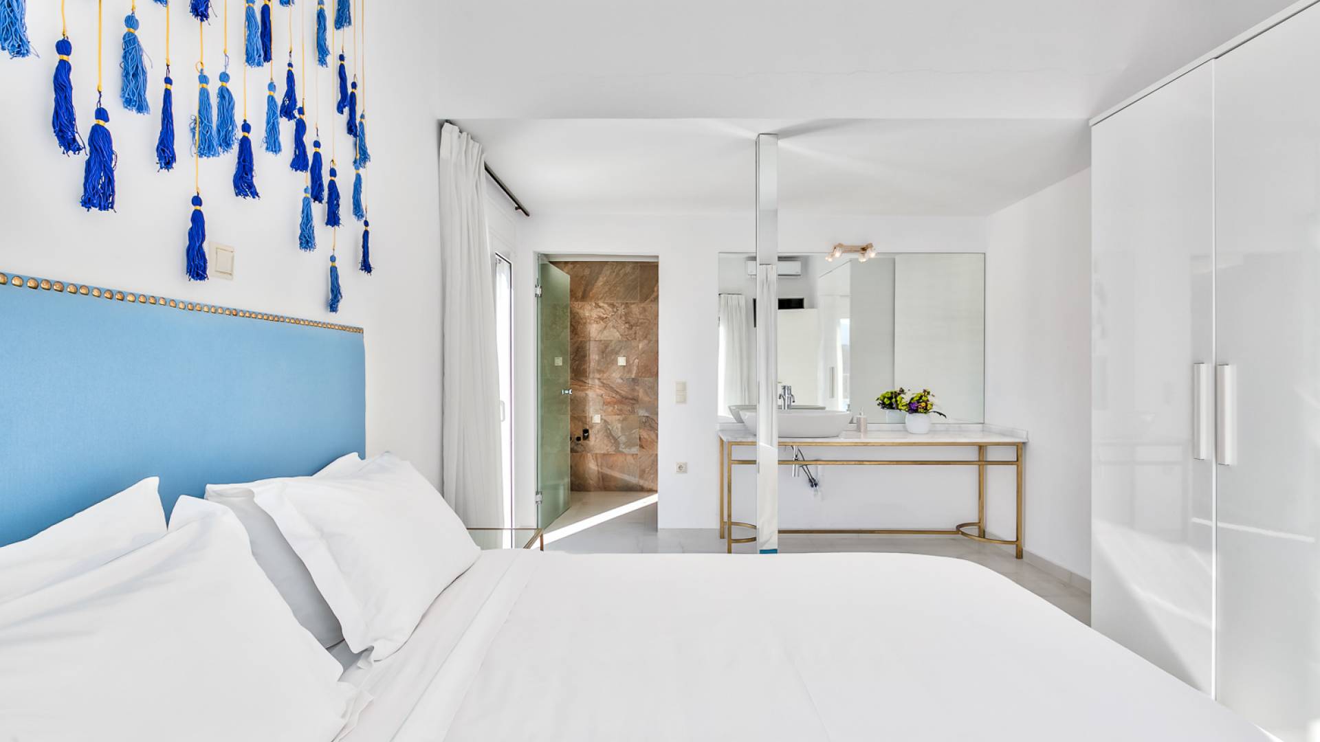 Villa Seasa Chania ha uno stile minimale ma eclettico con tocchi di ottone e colori oro. In tandem con le lussureggianti tende bianche che drappeggiano le porte scorrevoli in vetro che conducono ai balconi che offrono viste discrete sulla baia di Loutraki, l'arredamento ricorda il vecchio stile Regency. Questa è stata la base dell'intera costruzione e decorazione della villa ed è ciò che la rende unica e molto diversa dalle tendenze contemporanee di oggi.