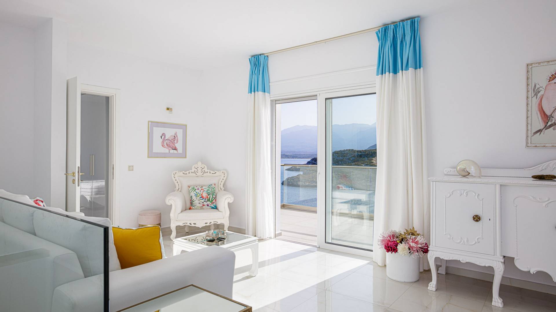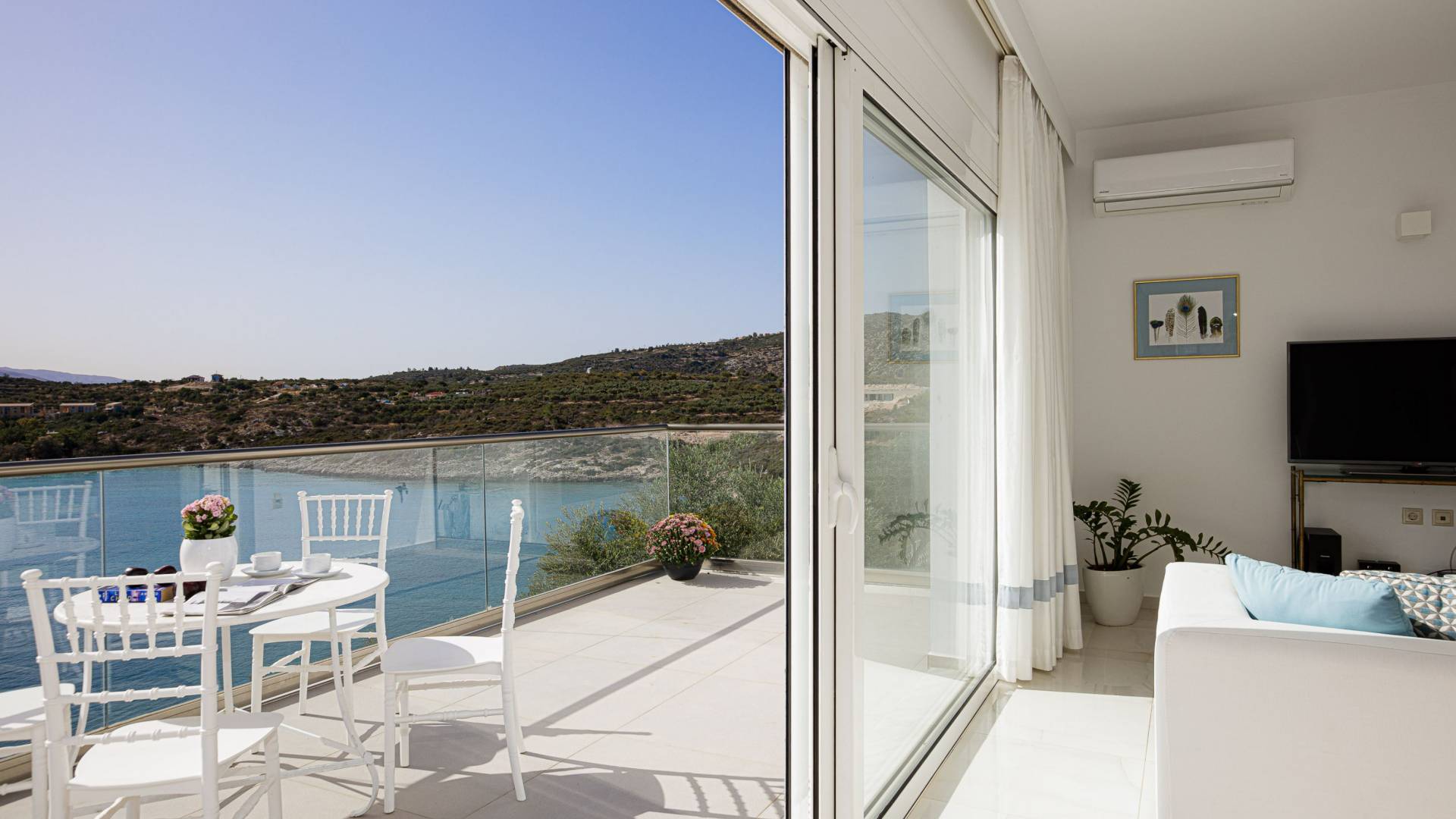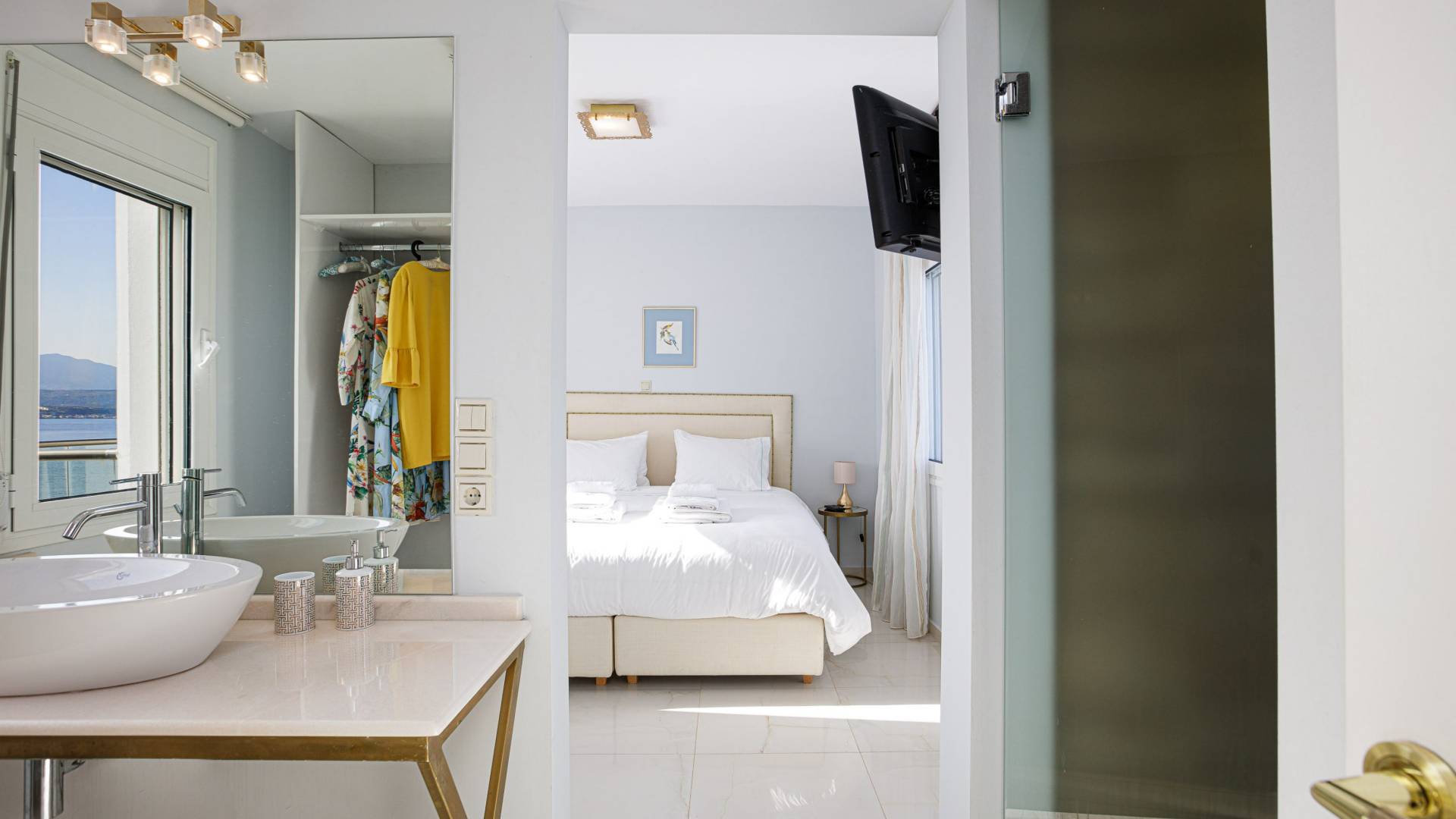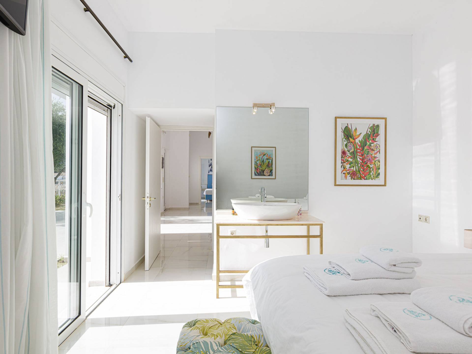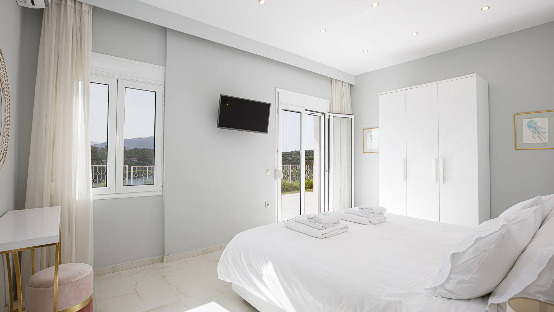 Villa Seasa Chania ha uno stile minimale ma eclettico con tocchi di ottone e colori oro. In tandem con le lussureggianti tende bianche che drappeggiano le porte scorrevoli in vetro che conducono ai balconi che offrono viste discrete sulla baia di Loutraki, l'arredamento ricorda il vecchio stile Regency. Questa è stata la base dell'intera costruzione e decorazione della villa ed è ciò che la rende unica e molto diversa dalle tendenze contemporanee di oggi.