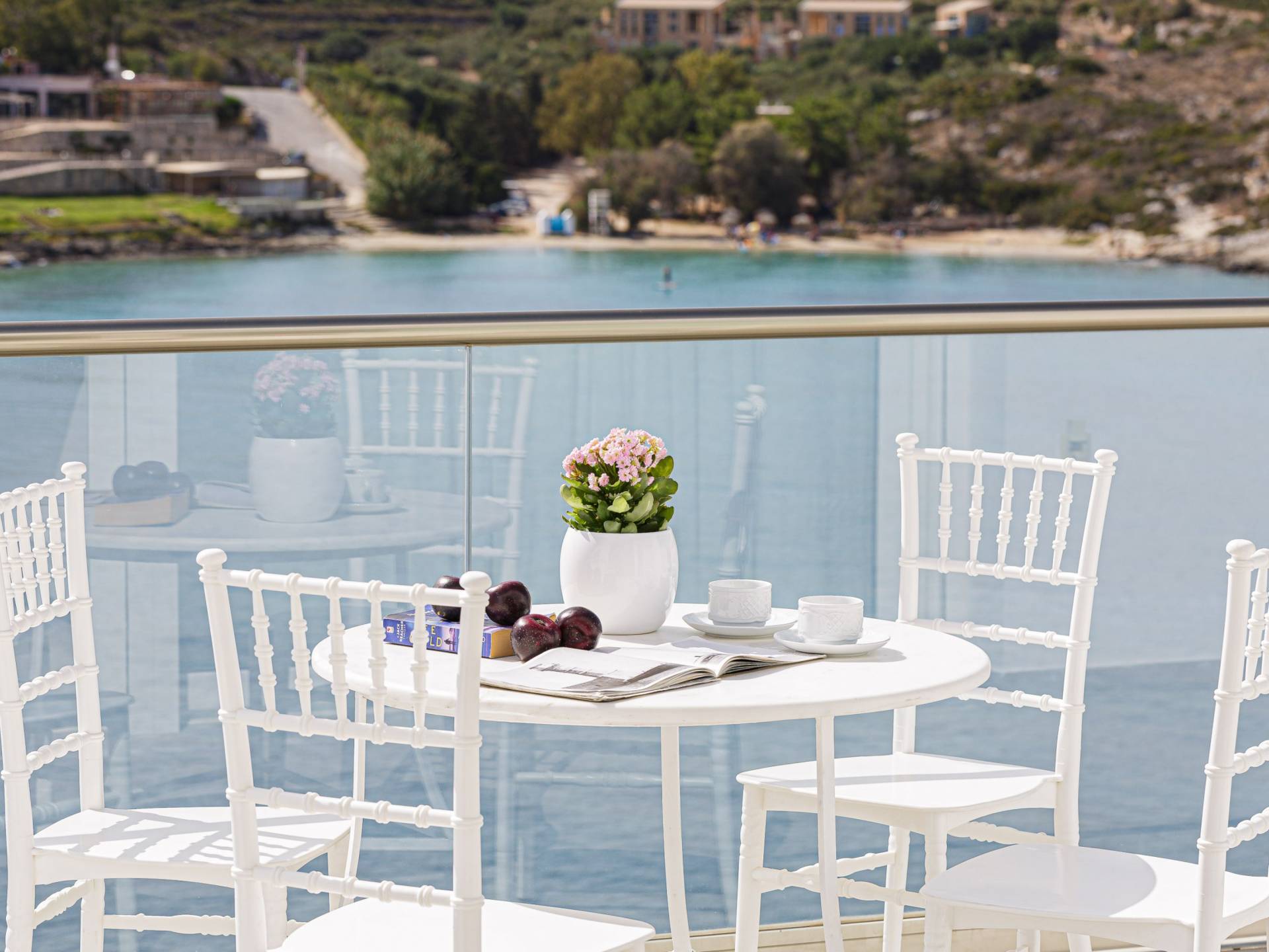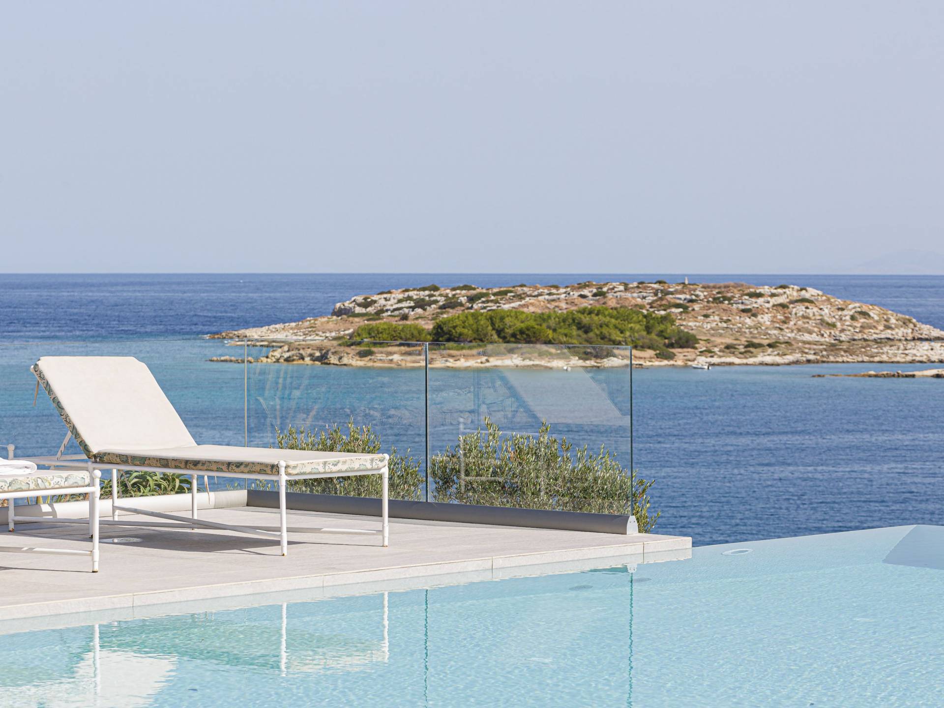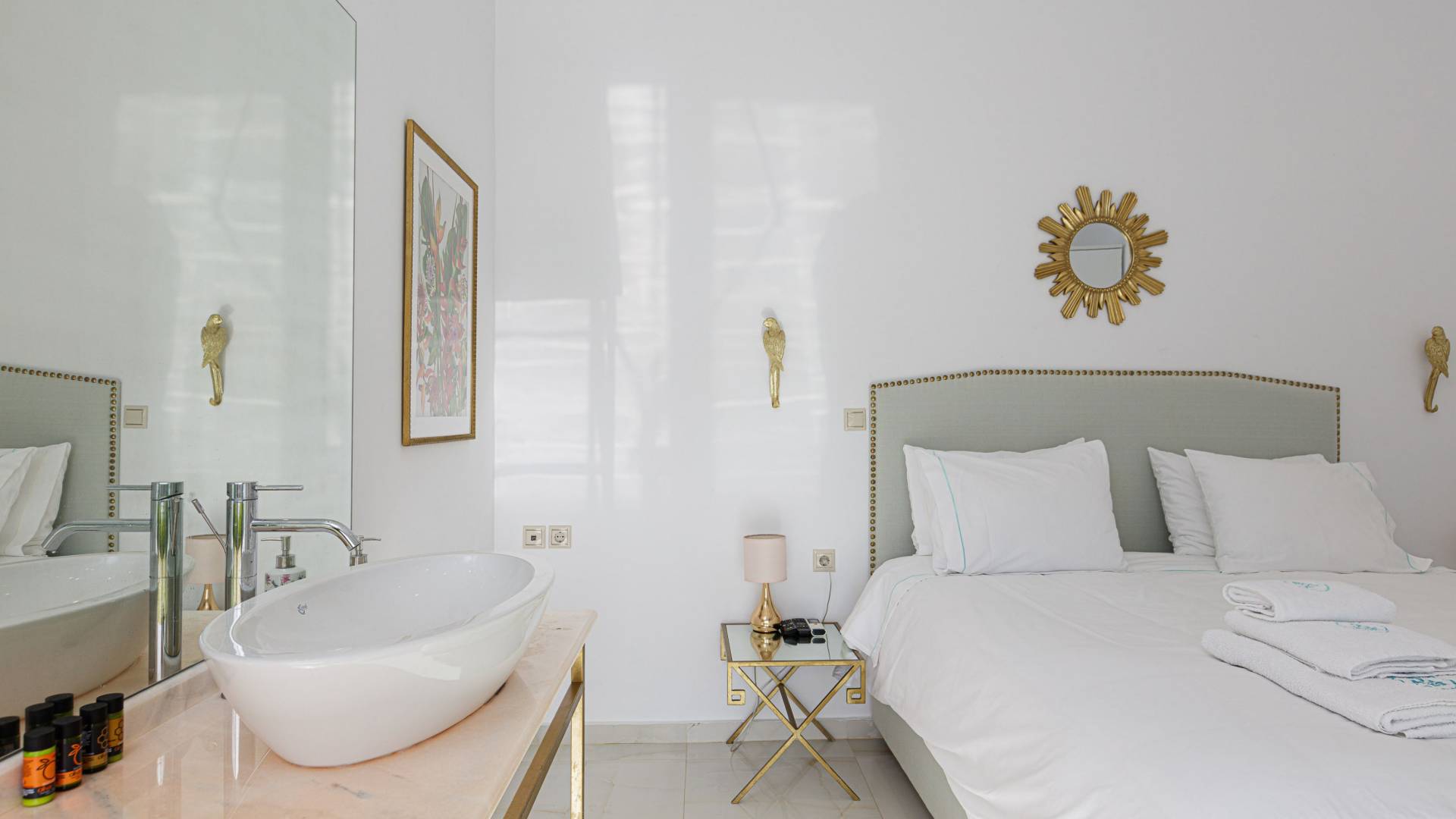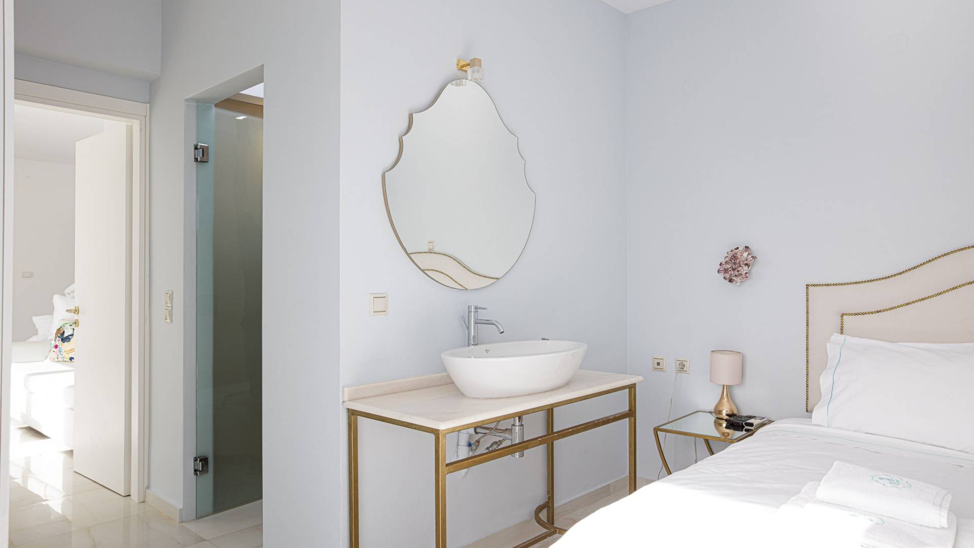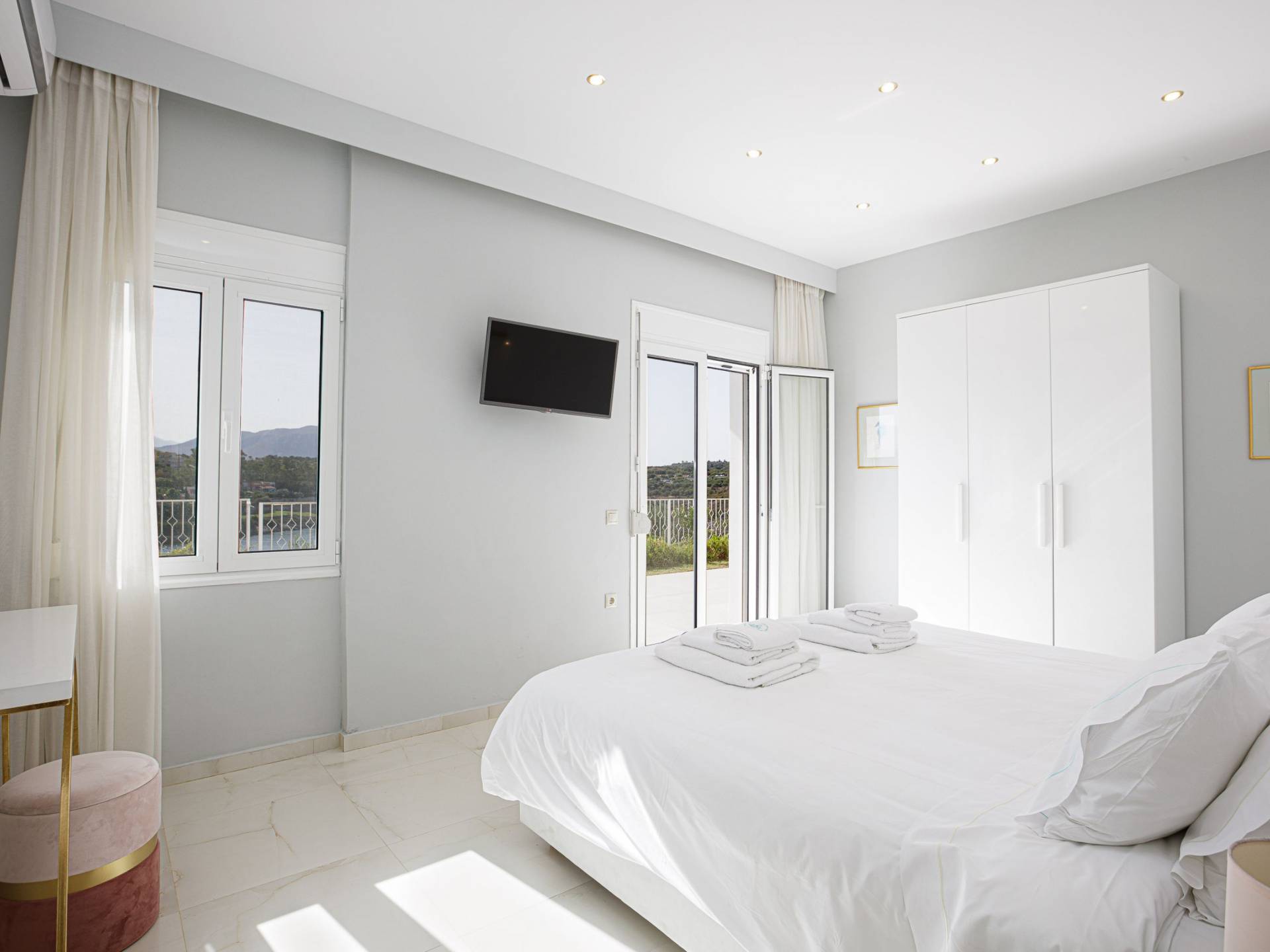Villa Seasa Chania ha uno stile minimale ma eclettico con tocchi di ottone e colori oro. In tandem con le lussureggianti tende bianche che drappeggiano le porte scorrevoli in vetro che conducono ai balconi che offrono viste discrete sulla baia di Loutraki, l'arredamento ricorda il vecchio stile Regency. Questa è stata la base dell'intera costruzione e decorazione della villa ed è ciò che la rende unica e molto diversa dalle tendenze contemporanee di oggi.
