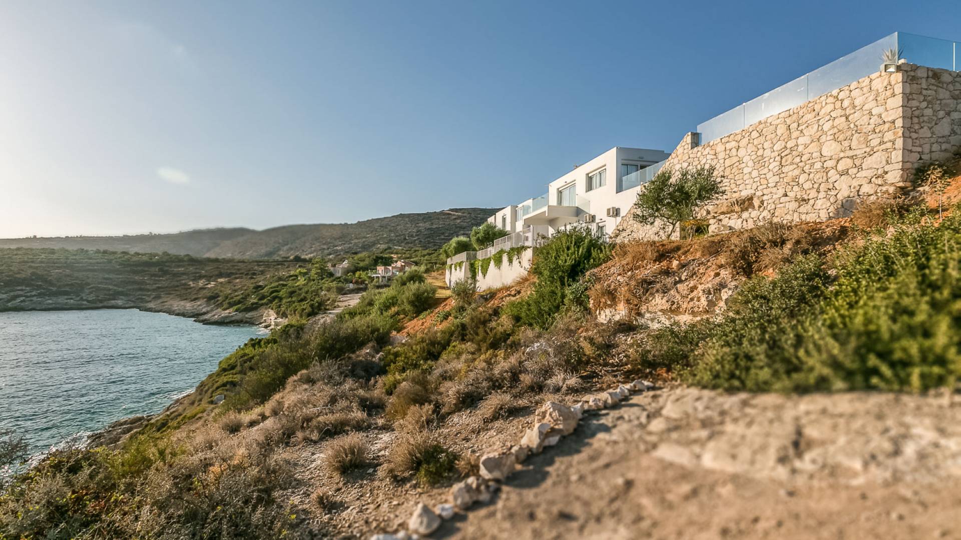 Alla fine di un vialetto privato si trova un maestoso e imponente insieme di edifici a due piani circondato da 3000 metri quadrati di terreno, che lo rendono ideale non solo per l'alloggio ma anche per varie celebrazioni fino a 300 persone. La serena combinazione di tonalità verde, terra e blu della costruzione completa la bellezza già esistente del paesaggio cretese. L'area esterna è caratterizzata da semplicità e ambienti che rilassano e aiutano la mente a staccarsi.