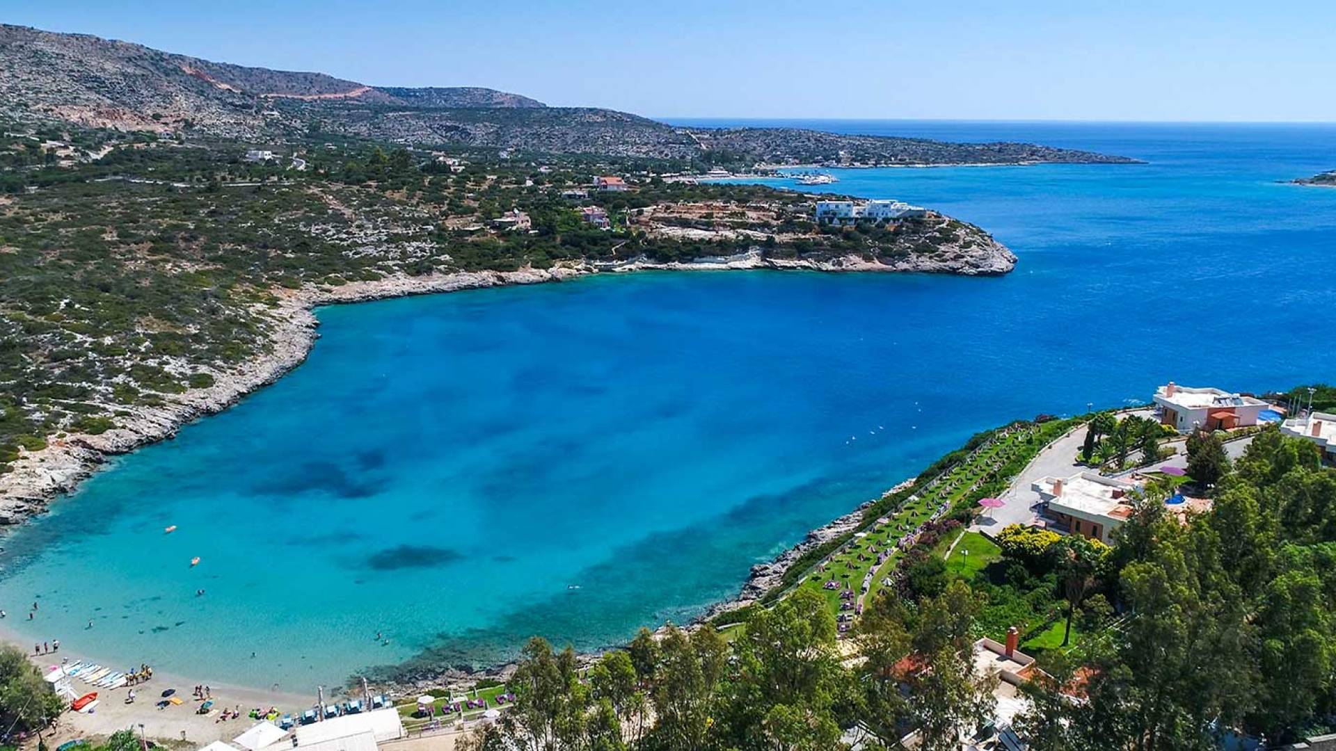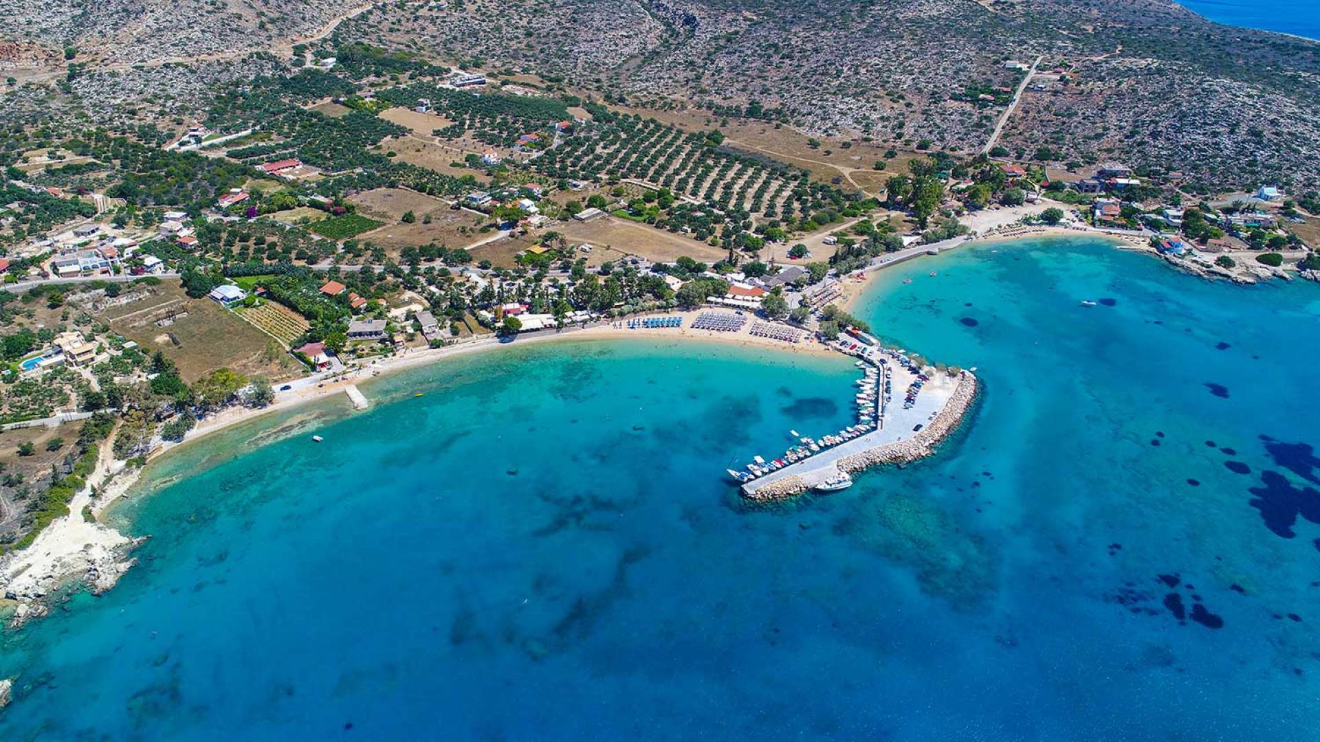 A pochi minuti di auto si trova Marathi, una spiaggia incantevole e leggermente più vivace. Le sue due baie a mezzaluna sono riparate dal vento, rendendo il mare calmo e sicuro tutto l’anno. È il luogo ideale per nuotare, fare snorkeling o paddleboard. Le taverne sul mare servono pesce fresco, meze tradizionali e ottimi vini locali, con una splendida vista sulla baia di Souda.