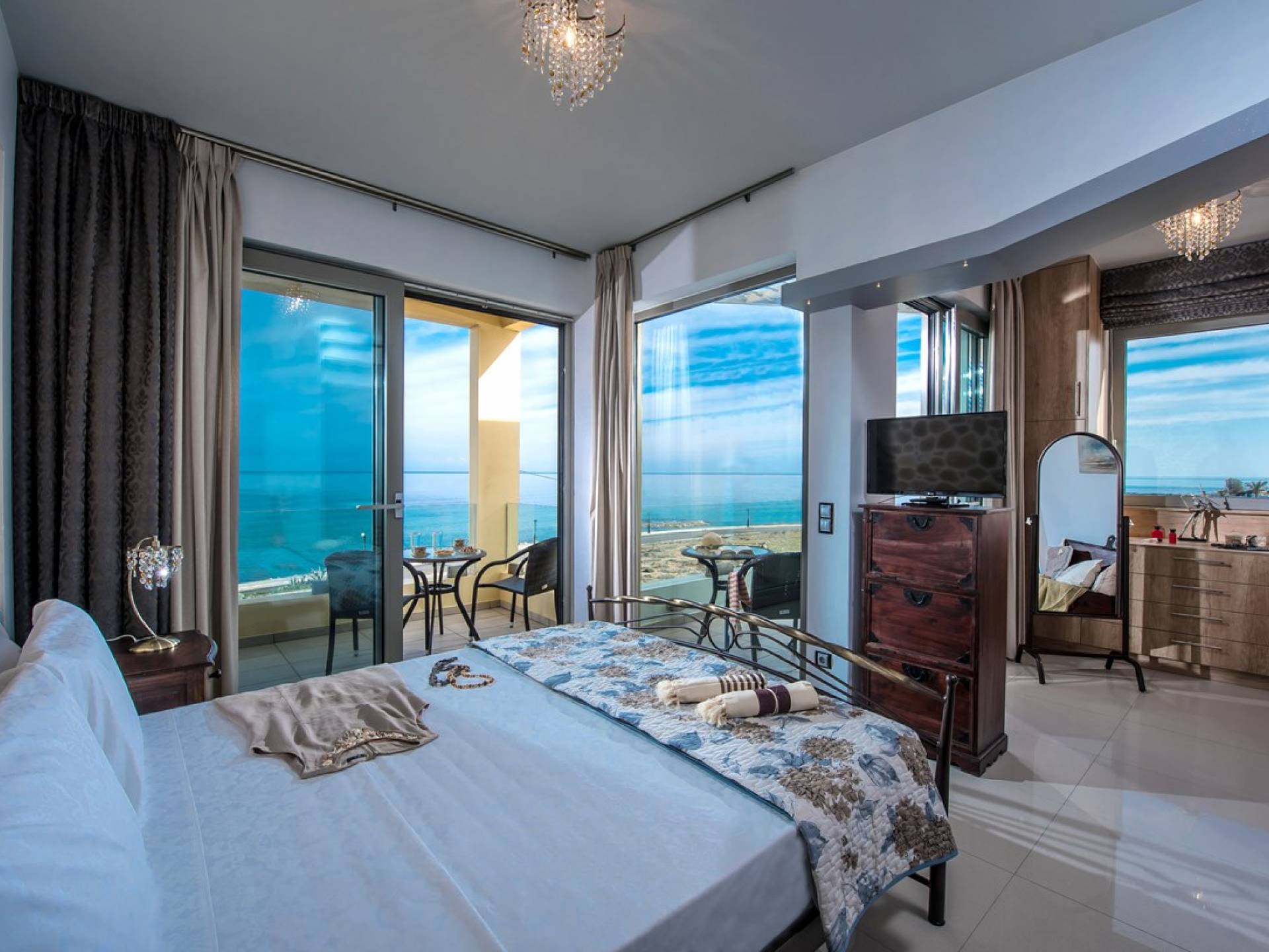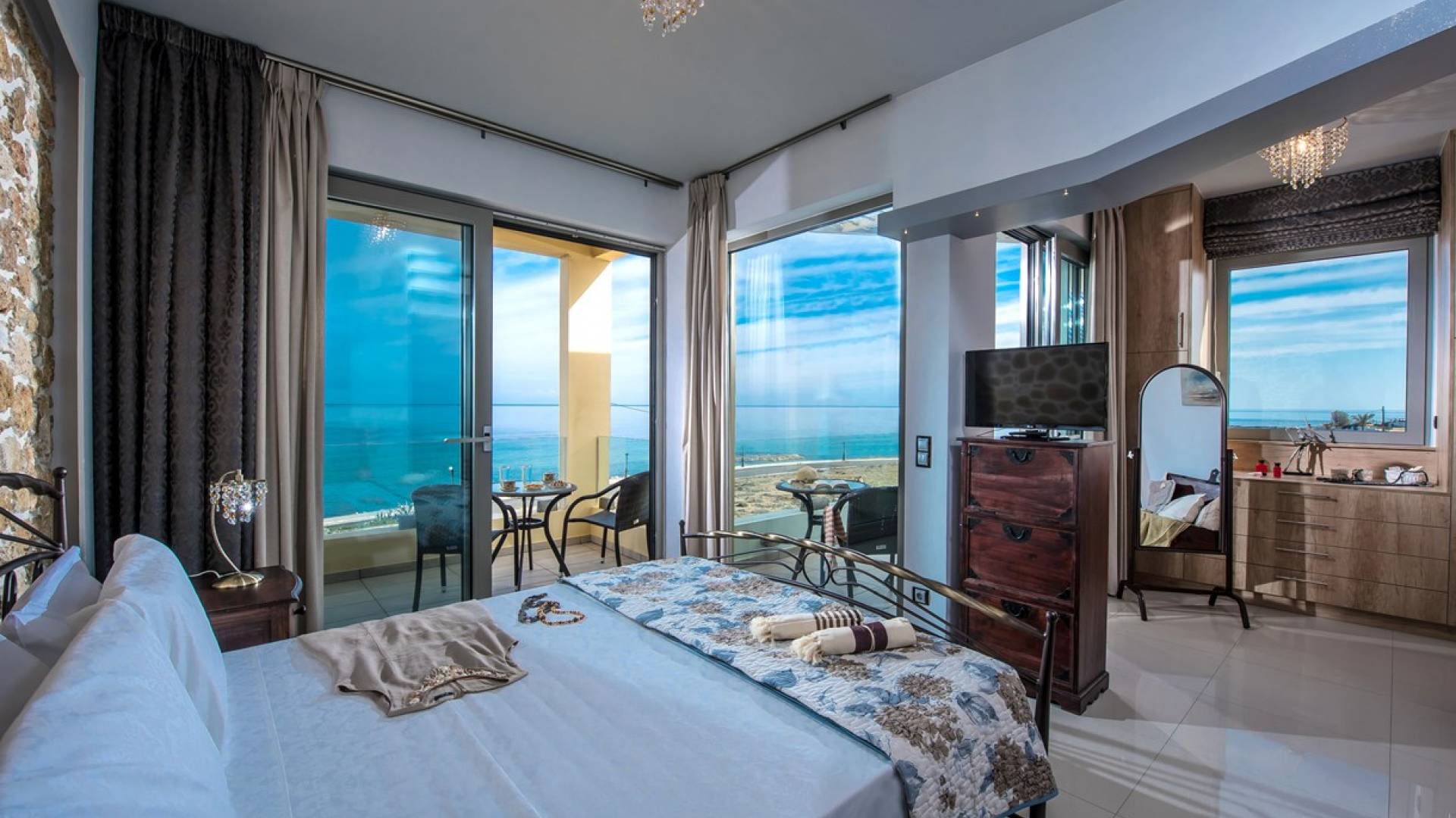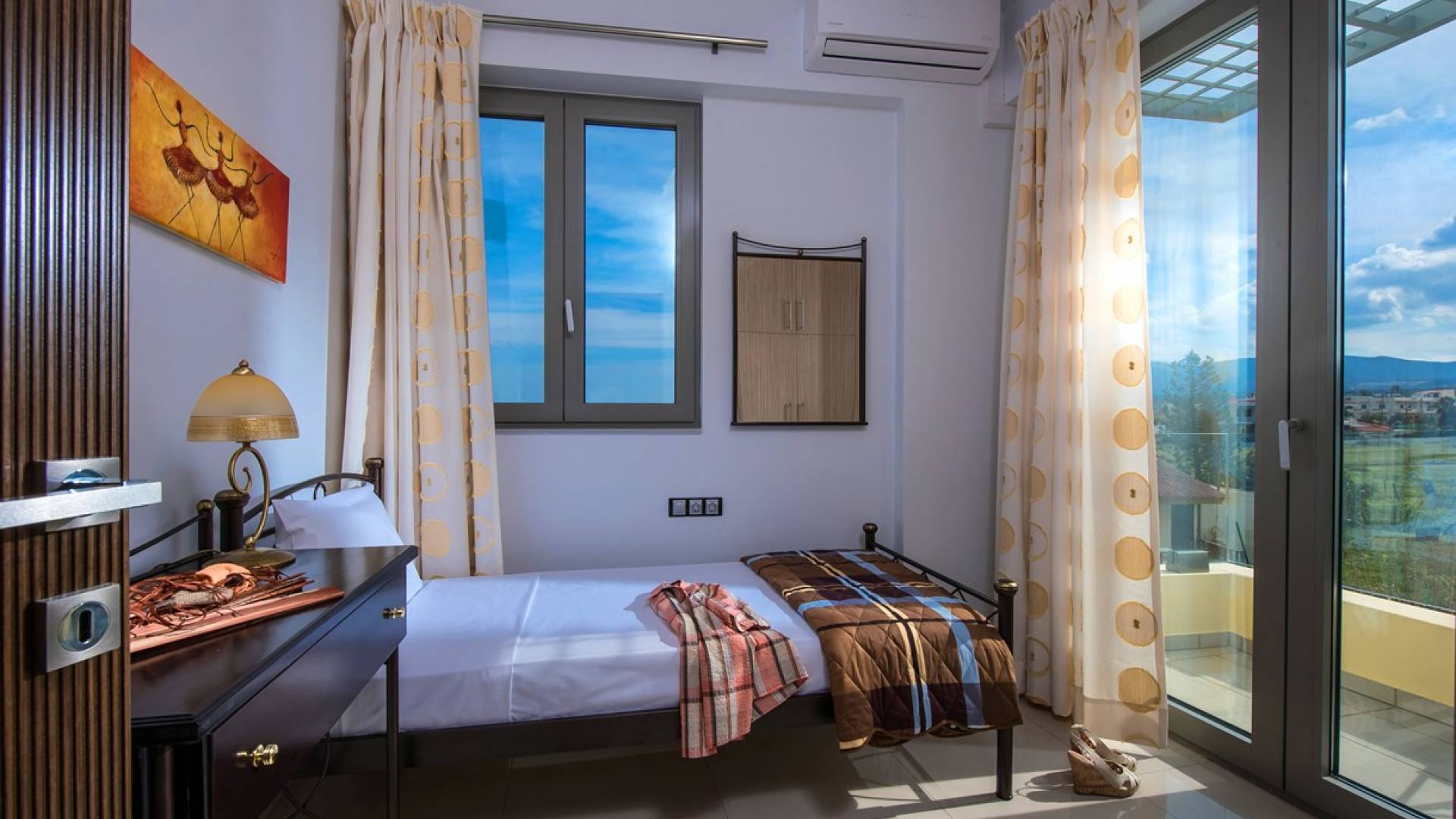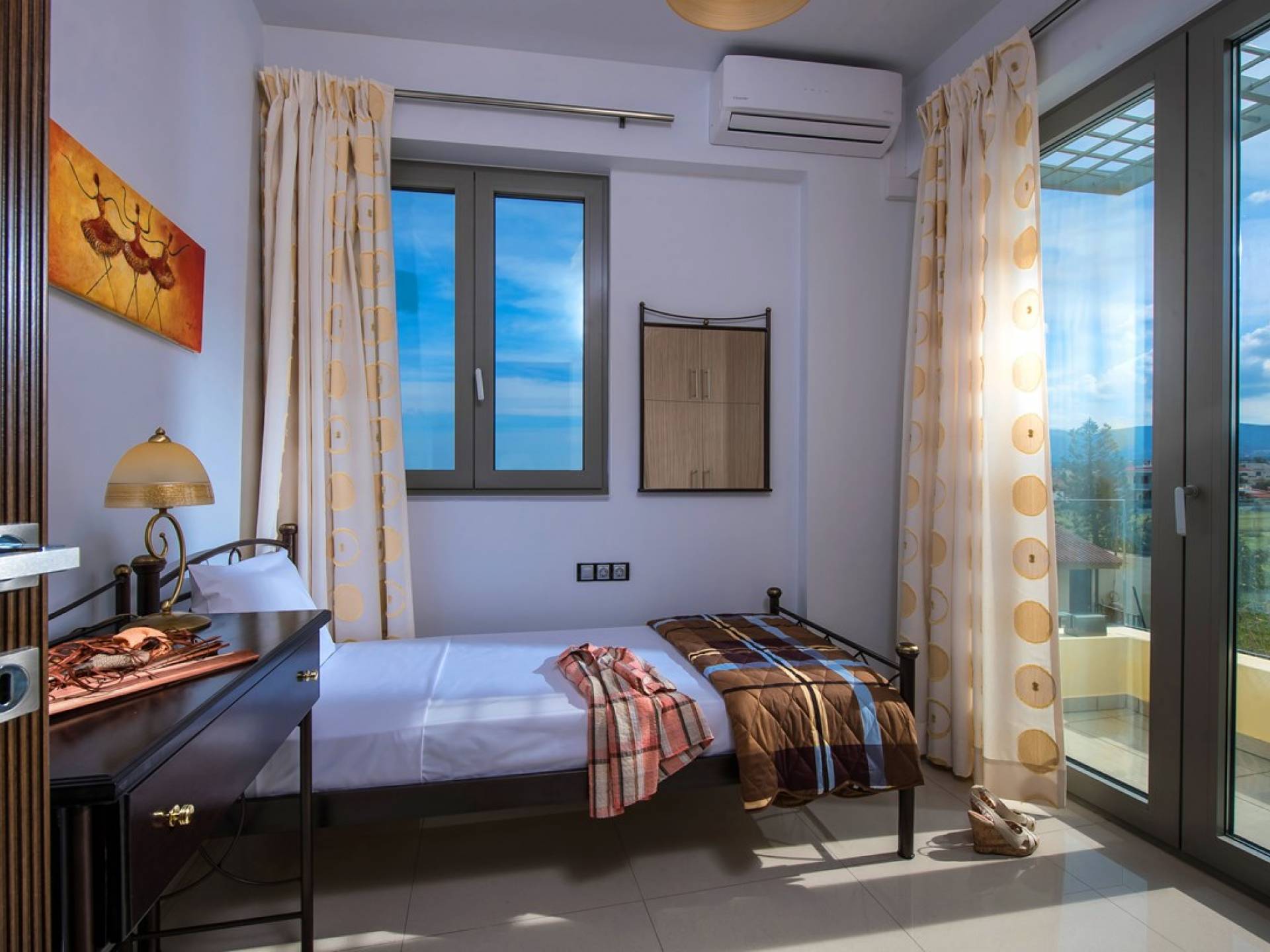 La rampa di scale interna porta gli ospiti al livello inferiore dove si trova una piccola palestra privata, attrezzata con attrezzi ginnici Kettler (cyclette, ellittica, pesi, ecc.). Un angolo giocoso nella stanza dei giochi offre momenti di spensieratezza senza fine agli ospiti di tutte le età. Sullo stesso piano è disponibile una camera con letto matrimoniale dall'arredo romantico, un bagno con vasca e una zona lavanderia completamente attrezzata, asciugatrice e armadio. Il primo piano di Artemis Villa Heraklion è un omaggio all'ospitalità di lusso. Qui, la camera matrimoniale decorata con tenui colori della terra offre agli ospiti calore e un ambiente di gusto squisito. Le caratteristiche in pietra contraddicono i cristalli Swarovski degli infissi e il romantico letto metallico, mentre la TV a schermo piatto e lo specchio a figura intera aggiungono un tocco di lusso in più. La camera ha accesso a due verande private con vista libera sul mare. La camera offre un WC privato con doccia.