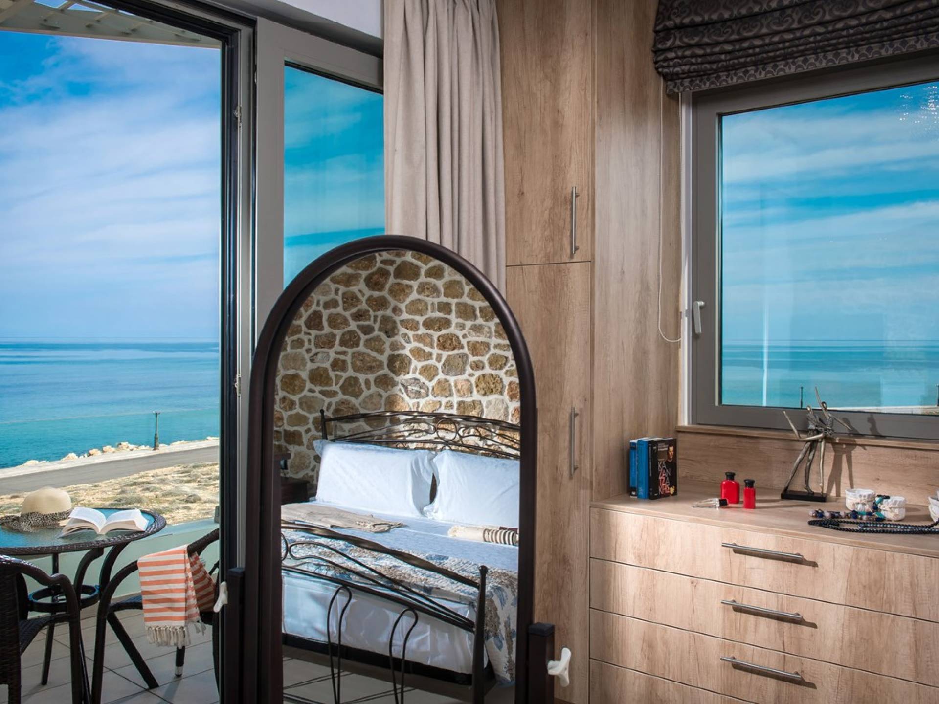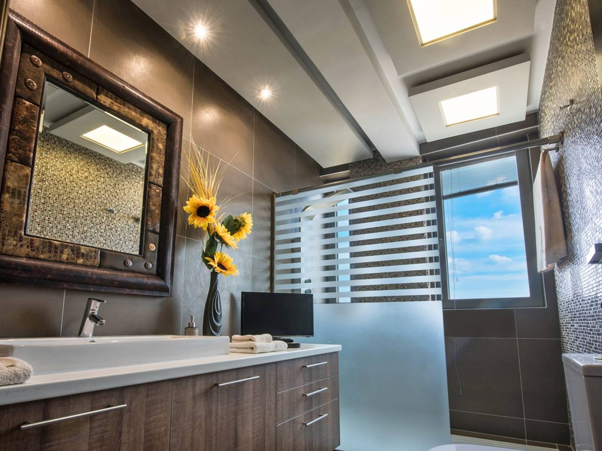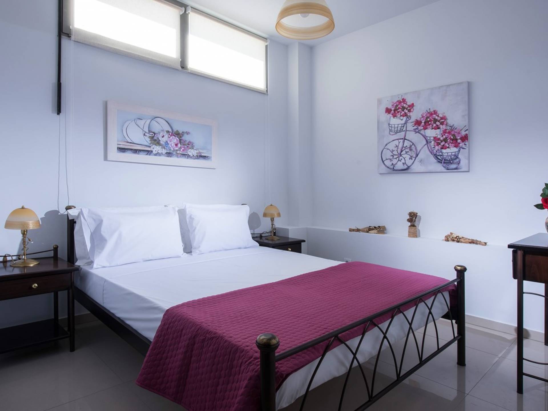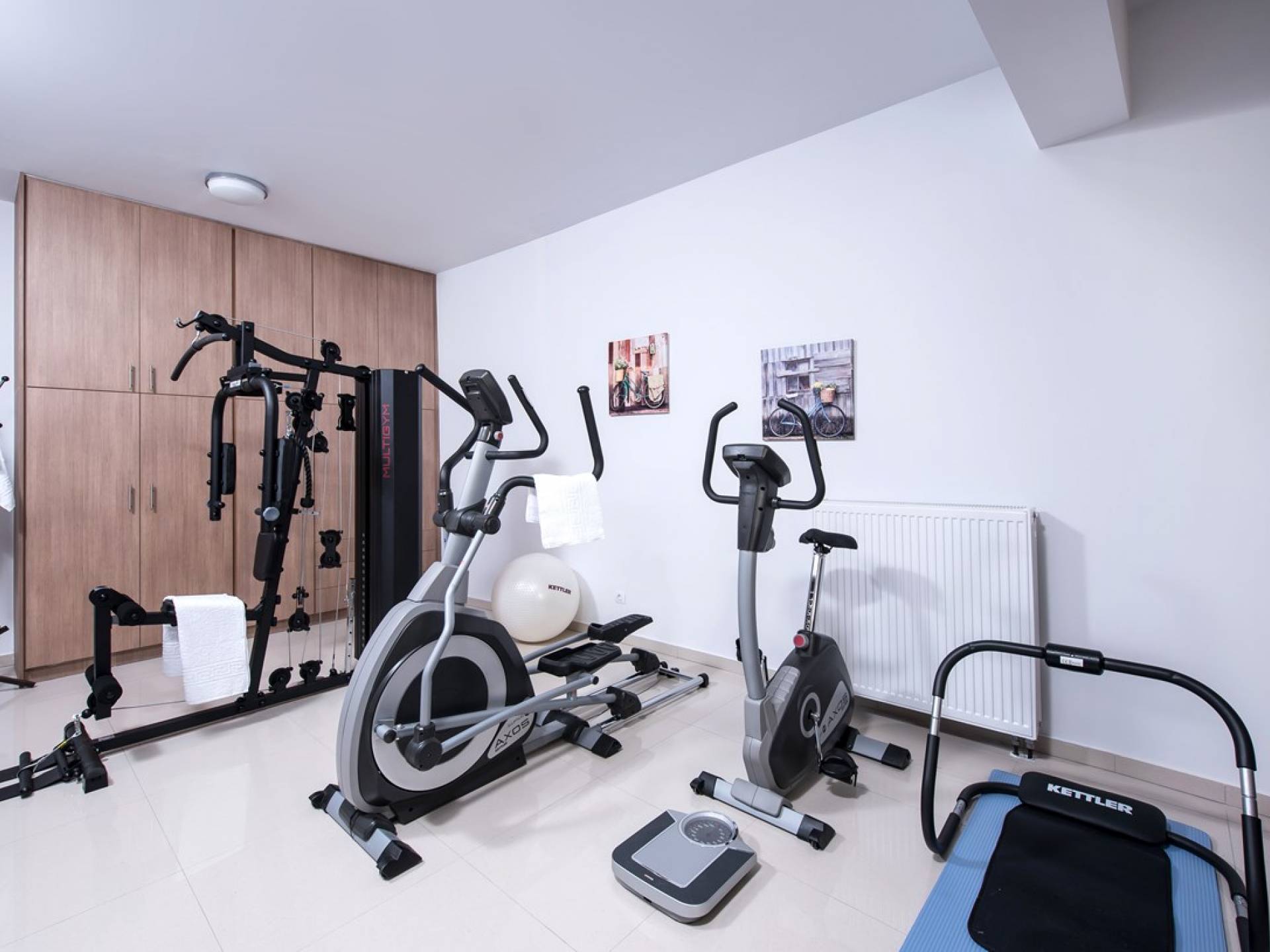 La rampa di scale interna porta gli ospiti al livello inferiore dove si trova una piccola palestra privata, attrezzata con attrezzi ginnici Kettler (cyclette, ellittica, pesi, ecc.). Un angolo giocoso nella stanza dei giochi offre momenti di spensieratezza senza fine agli ospiti di tutte le età. Sullo stesso piano è disponibile una camera con letto matrimoniale dall'arredo romantico, un bagno con vasca e una zona lavanderia completamente attrezzata, asciugatrice e armadio. Il primo piano di Artemis Villa Heraklion è un omaggio all'ospitalità di lusso. Qui, la camera matrimoniale decorata con tenui colori della terra offre agli ospiti calore e un ambiente di gusto squisito. Le caratteristiche in pietra contraddicono i cristalli Swarovski degli infissi e il romantico letto metallico, mentre la TV a schermo piatto e lo specchio a figura intera aggiungono un tocco di lusso in più. La camera ha accesso a due verande private con vista libera sul mare. La camera offre un WC privato con doccia.