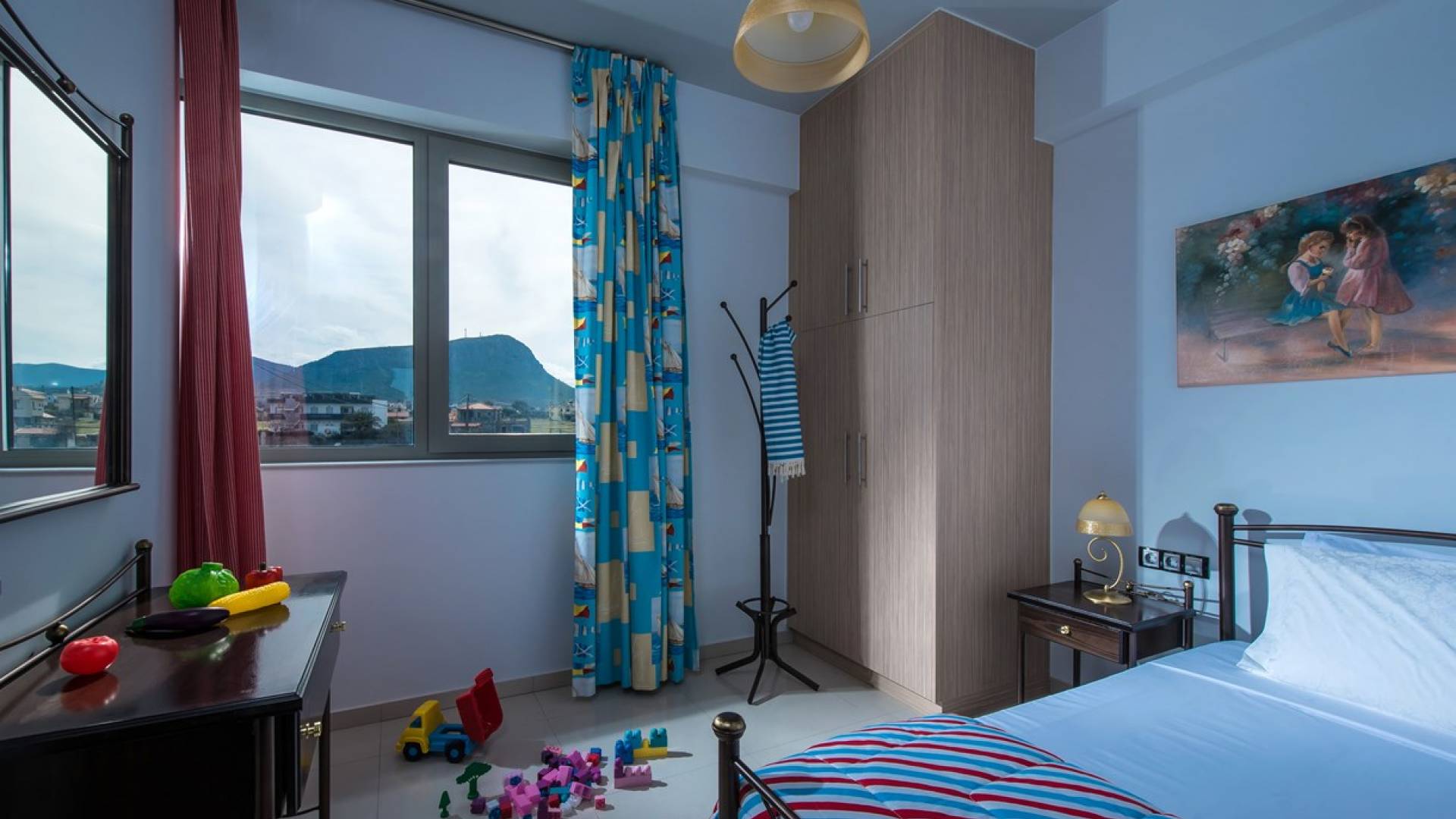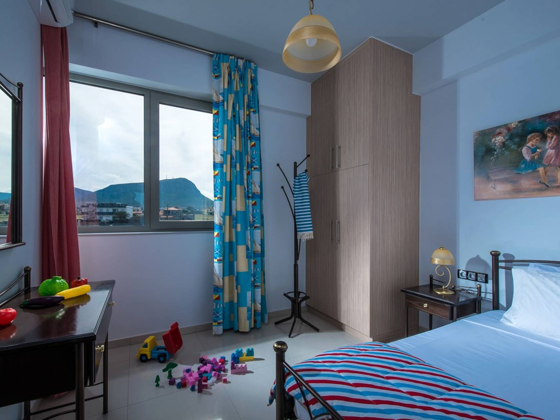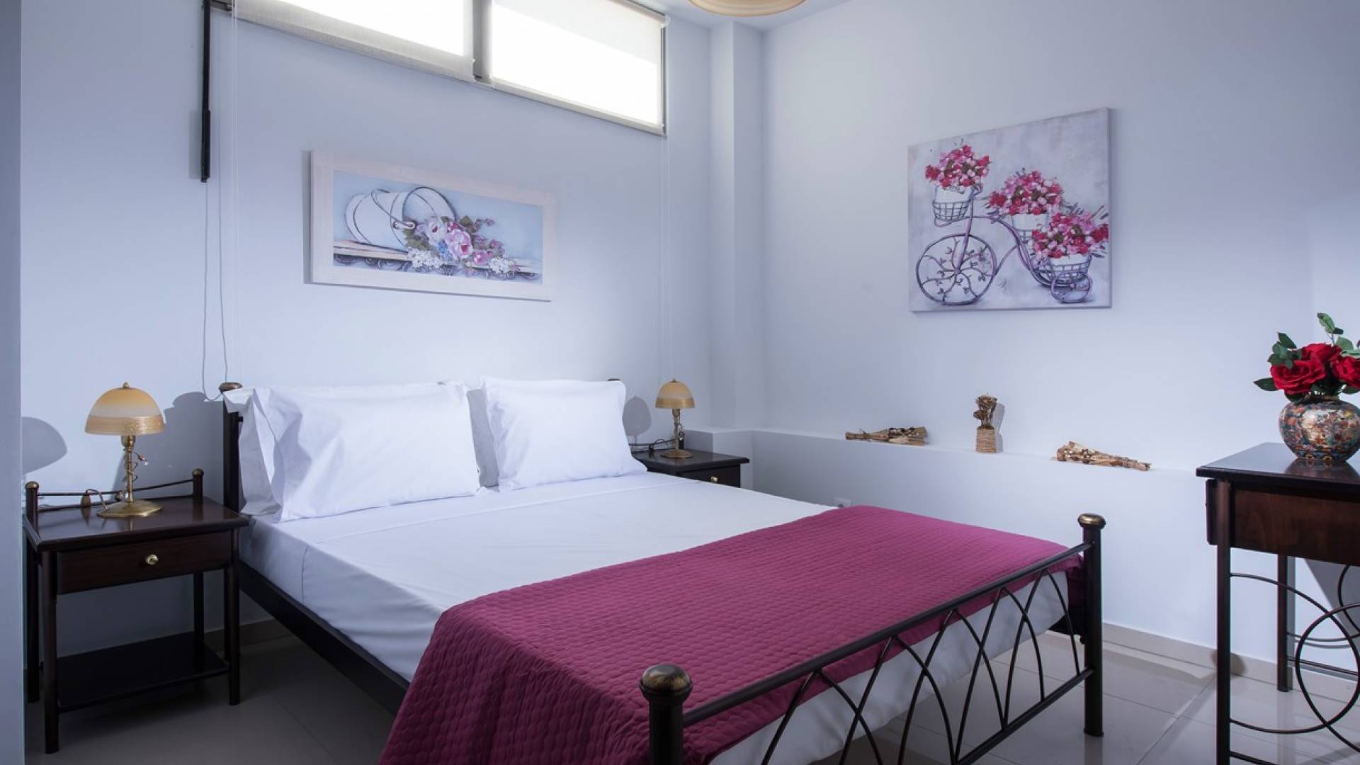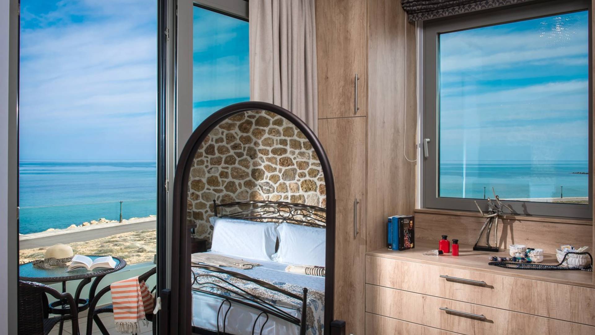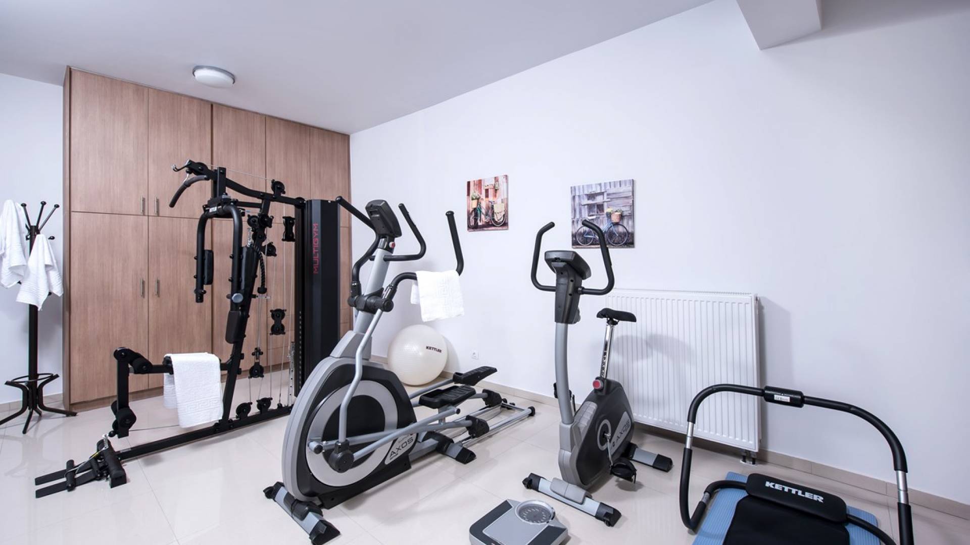 La rampa di scale interna porta gli ospiti al livello inferiore dove si trova una piccola palestra privata, attrezzata con attrezzi ginnici Kettler (cyclette, ellittica, pesi, ecc.). Un angolo giocoso nella stanza dei giochi offre momenti di spensieratezza senza fine agli ospiti di tutte le età. Sullo stesso piano è disponibile una camera con letto matrimoniale dall'arredo romantico, un bagno con vasca e una zona lavanderia completamente attrezzata, asciugatrice e armadio. Il primo piano di Artemis Villa Heraklion è un omaggio all'ospitalità di lusso. Qui, la camera matrimoniale decorata con tenui colori della terra offre agli ospiti calore e un ambiente di gusto squisito. Le caratteristiche in pietra contraddicono i cristalli Swarovski degli infissi e il romantico letto metallico, mentre la TV a schermo piatto e lo specchio a figura intera aggiungono un tocco di lusso in più. La camera ha accesso a due verande private con vista libera sul mare. La camera offre un WC privato con doccia.