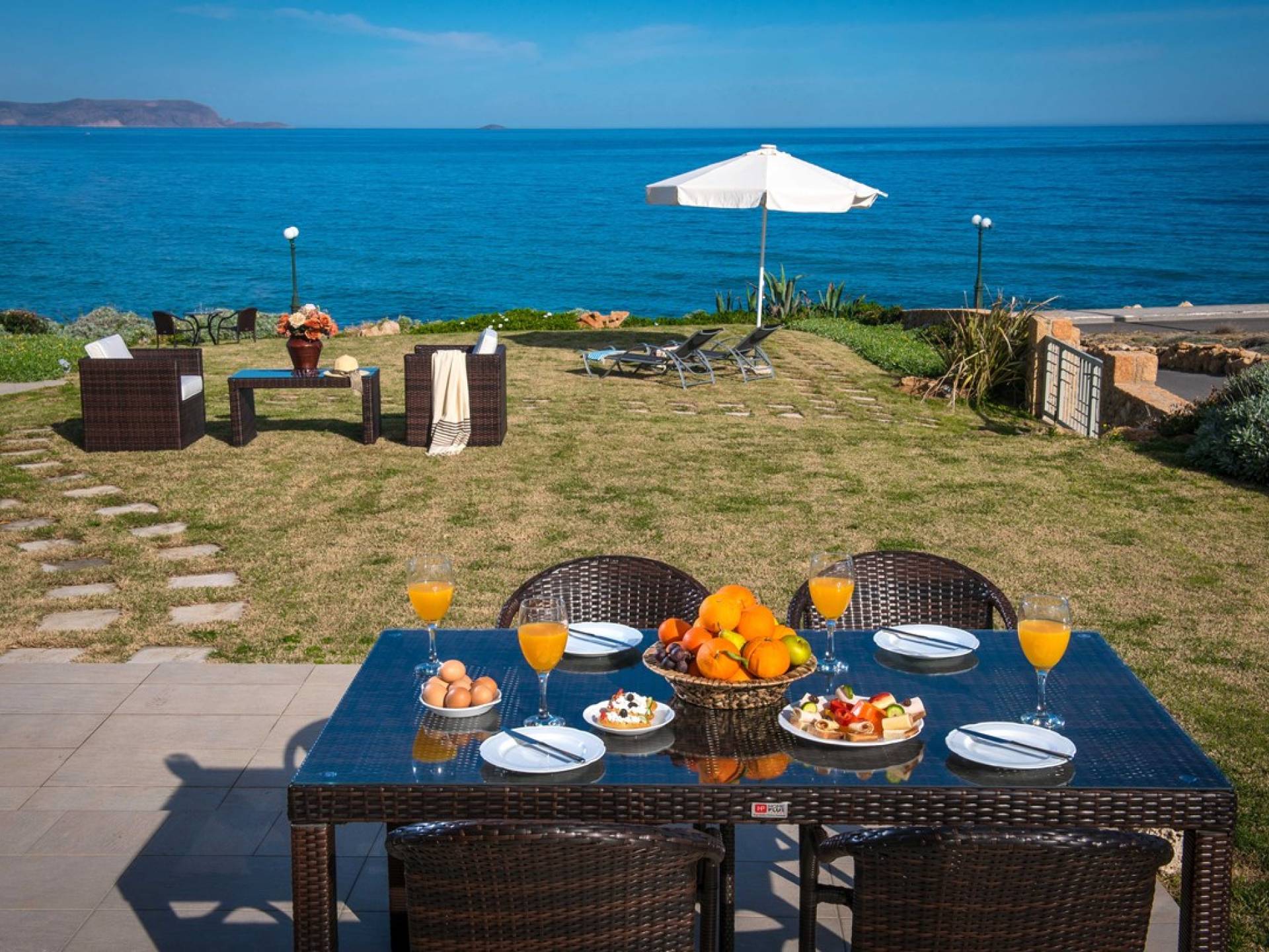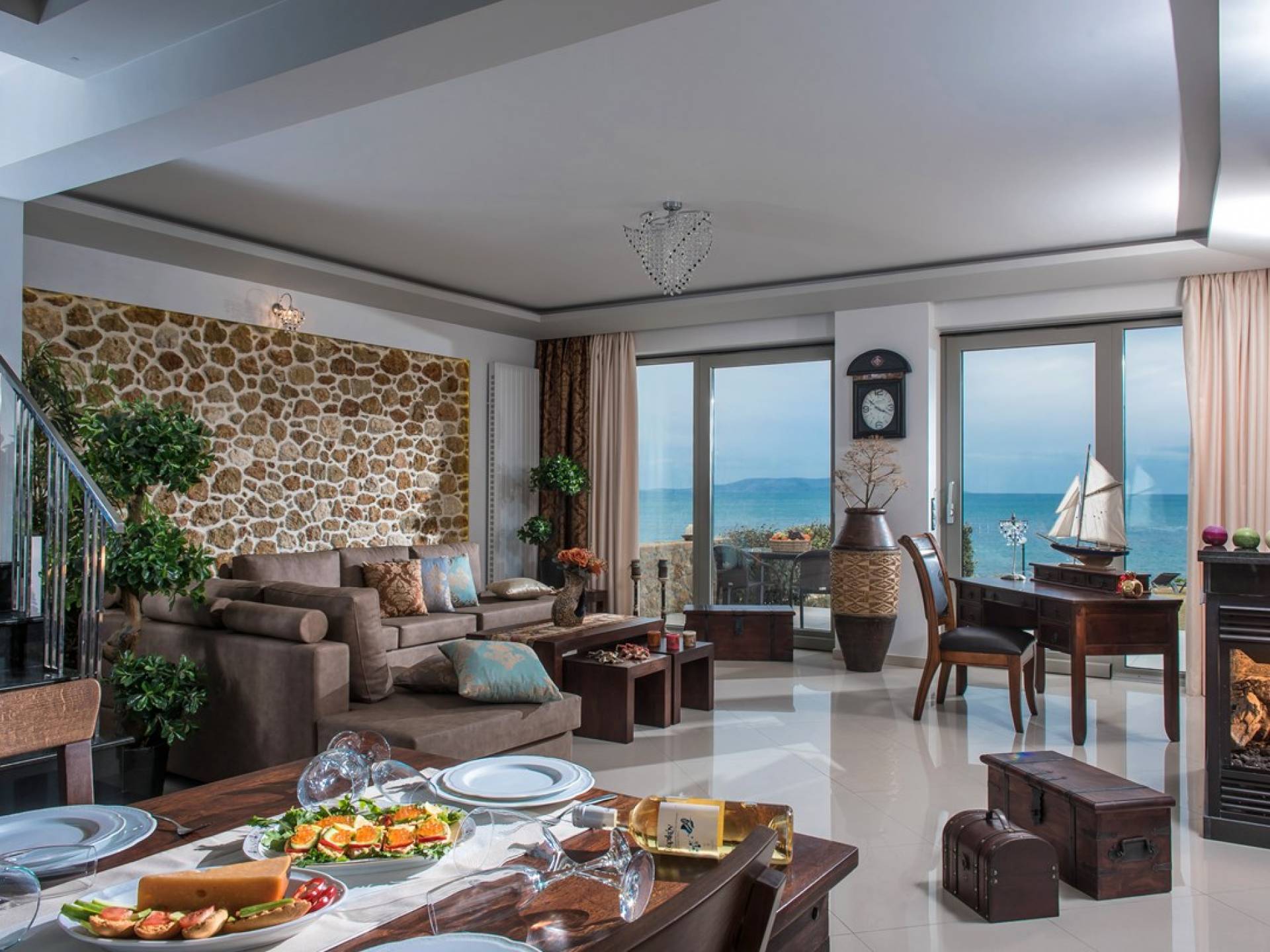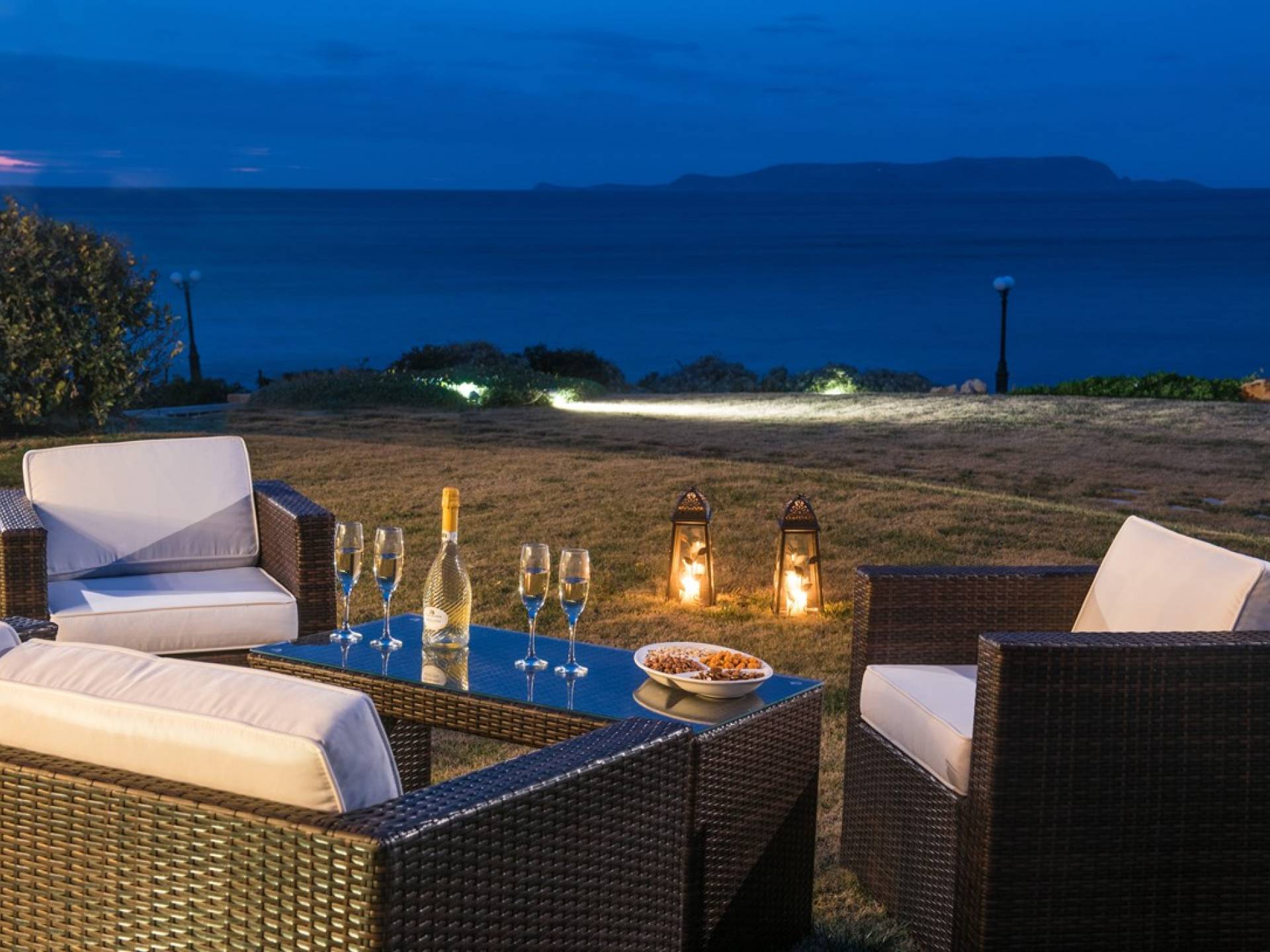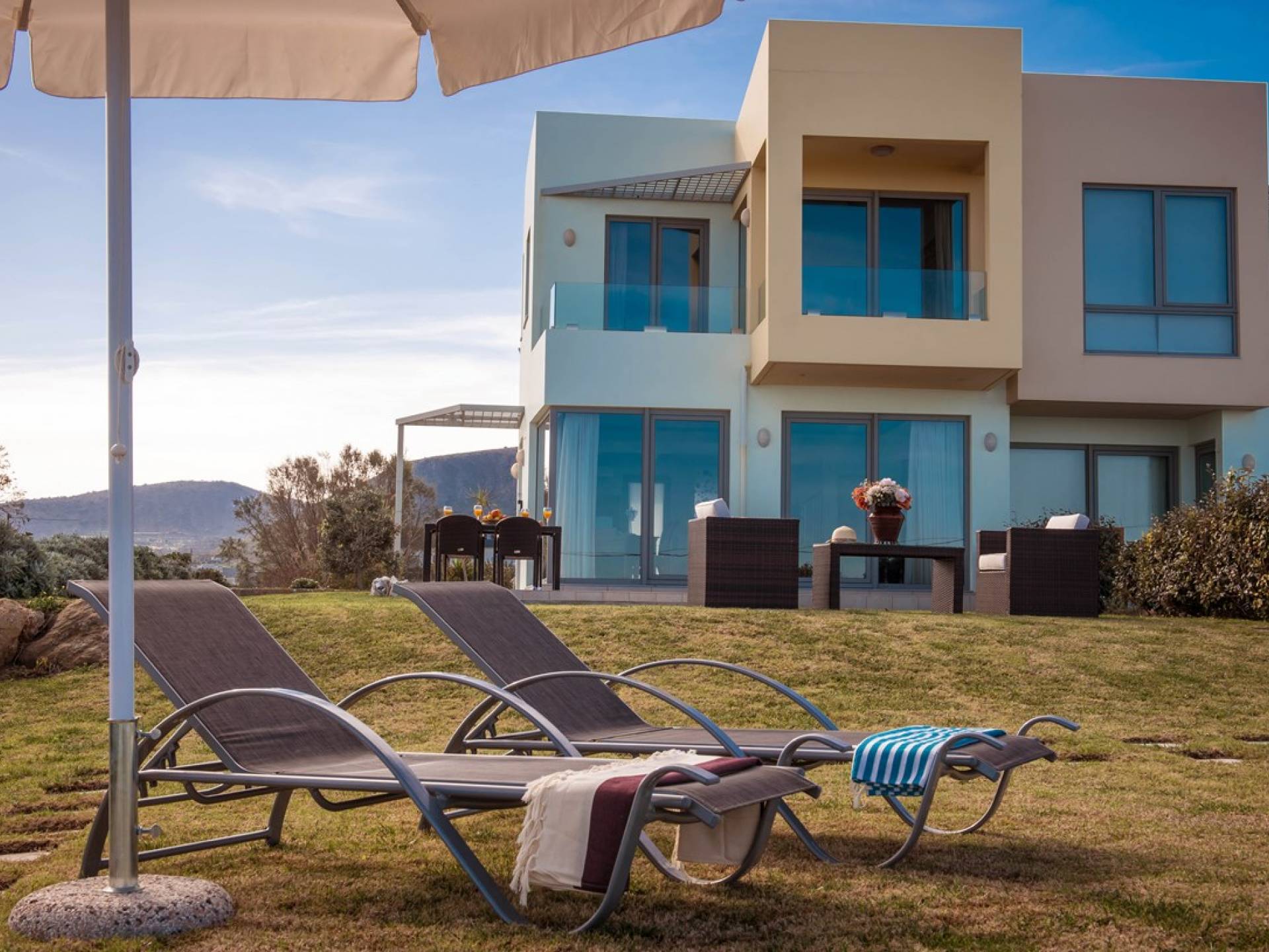 Due comode camere da letto con letti semi-matrimoniali e un ampio bagno completano il piano. Una doccia idromassaggio, un minibar e una TV a schermo piatto sono i punti forti del bagno, ma soprattutto la vista incorniciata dalle finestre è mozzafiato. Artemis Villa Heraklion, oltre alle verande al primo piano, offre un'ampia terrazza al piano terra, la cui naturale prosecuzione è un ampio giardino con prato e piante ornamentali. Qui gli ospiti possono rilassarsi prendendo il sole su comodi lettini da spiaggia o godersi una cena privata tra i caldi colori del tramonto.
