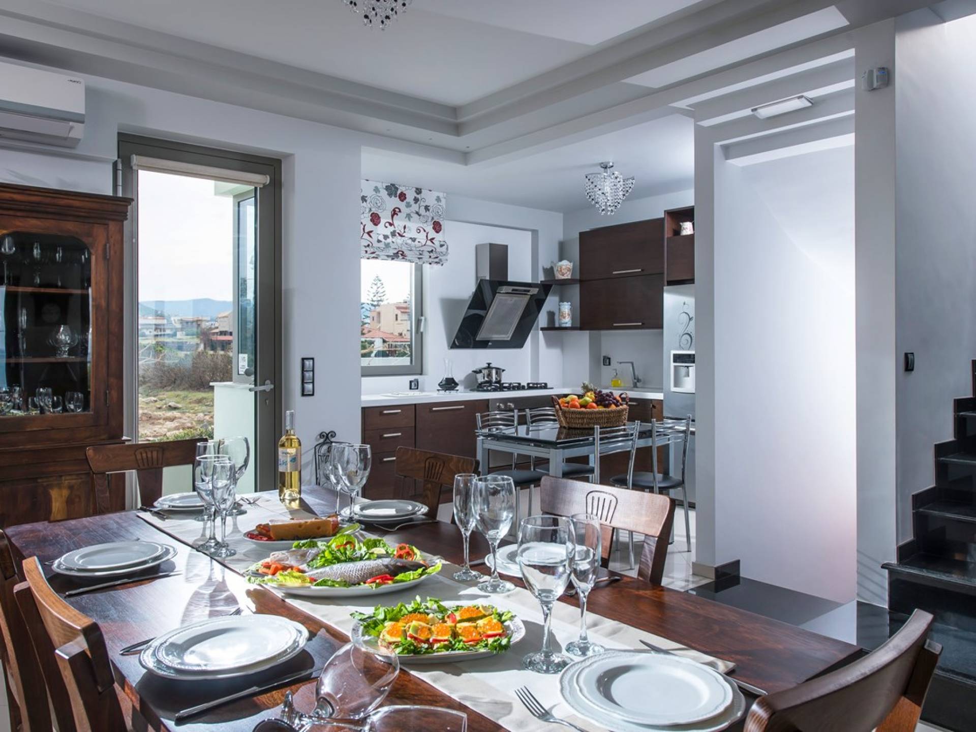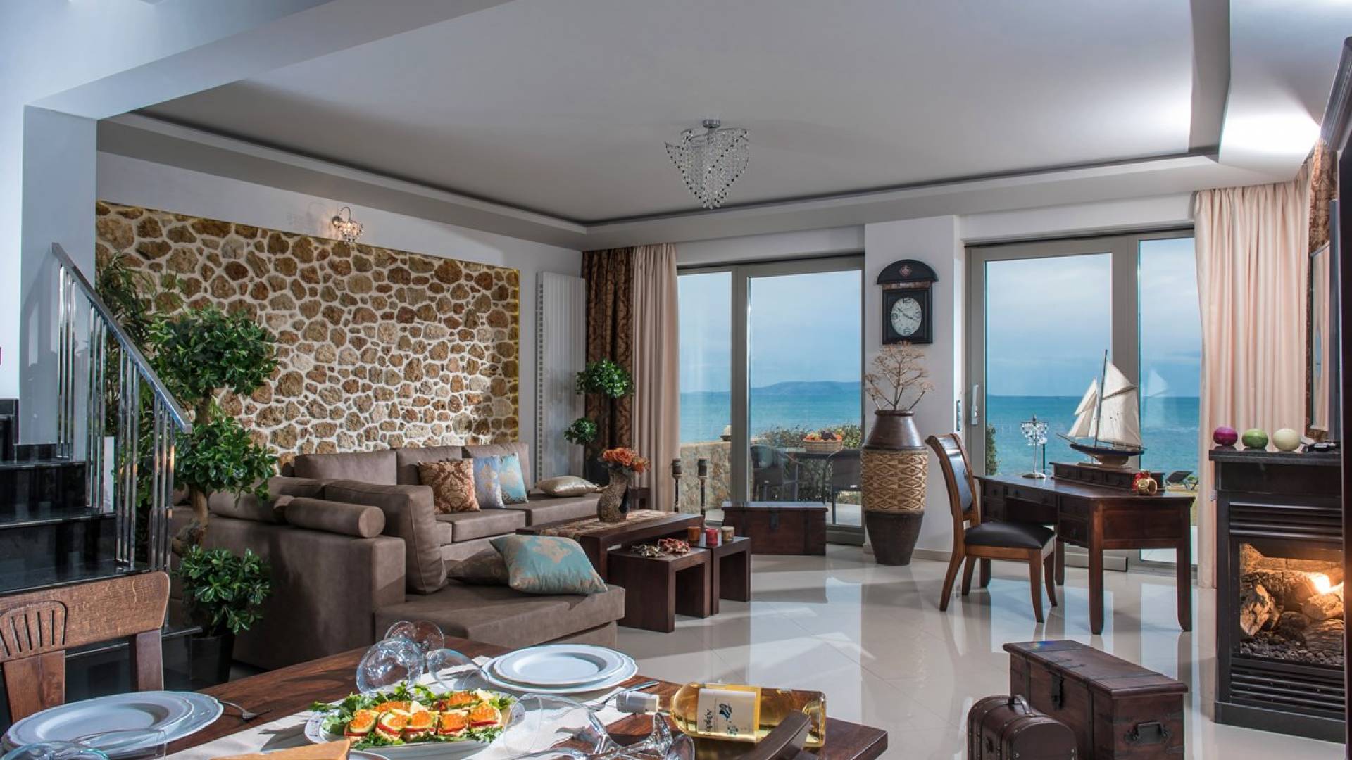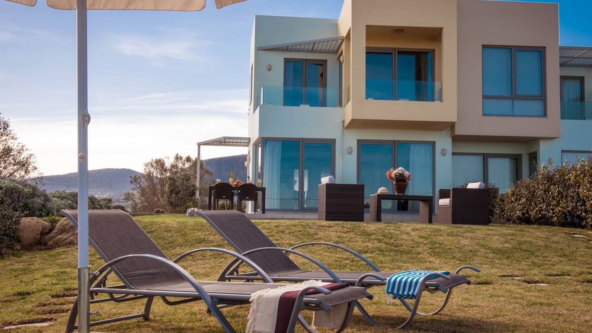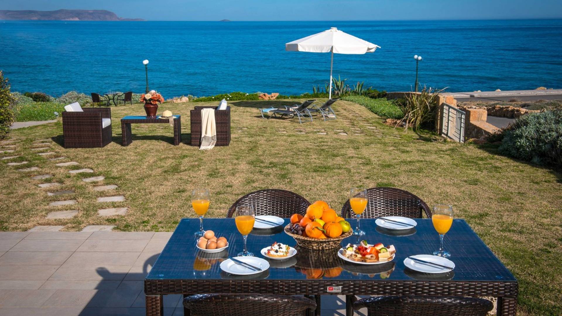 Due comode camere da letto con letti semi-matrimoniali e un ampio bagno completano il piano. Una doccia idromassaggio, un minibar e una TV a schermo piatto sono i punti forti del bagno, ma soprattutto la vista incorniciata dalle finestre è mozzafiato. Artemis Villa Heraklion, oltre alle verande al primo piano, offre un'ampia terrazza al piano terra, la cui naturale prosecuzione è un ampio giardino con prato e piante ornamentali. Qui gli ospiti possono rilassarsi prendendo il sole su comodi lettini da spiaggia o godersi una cena privata tra i caldi colori del tramonto.