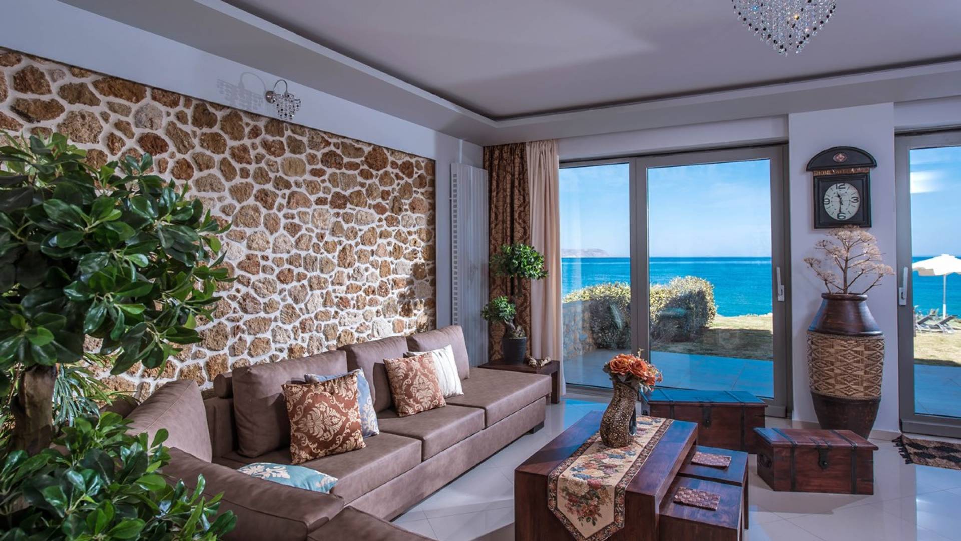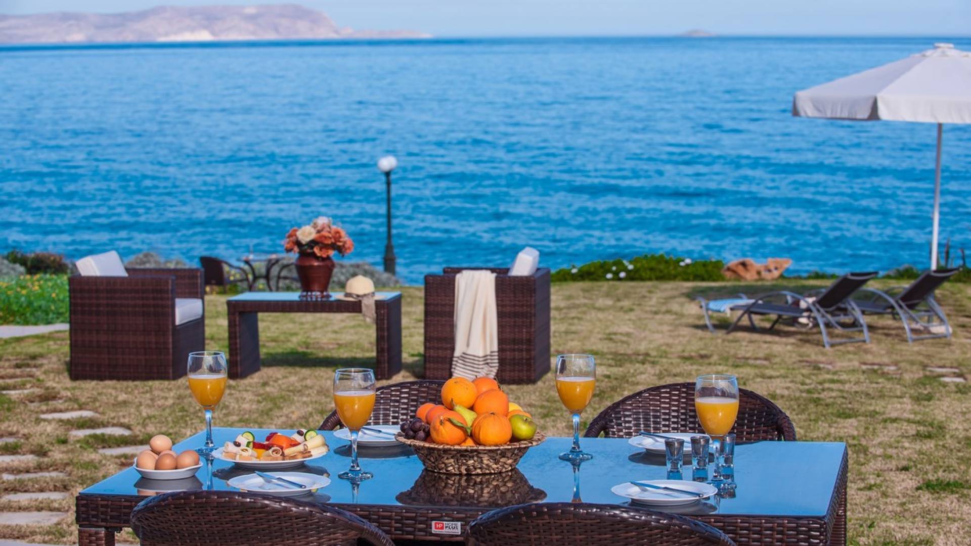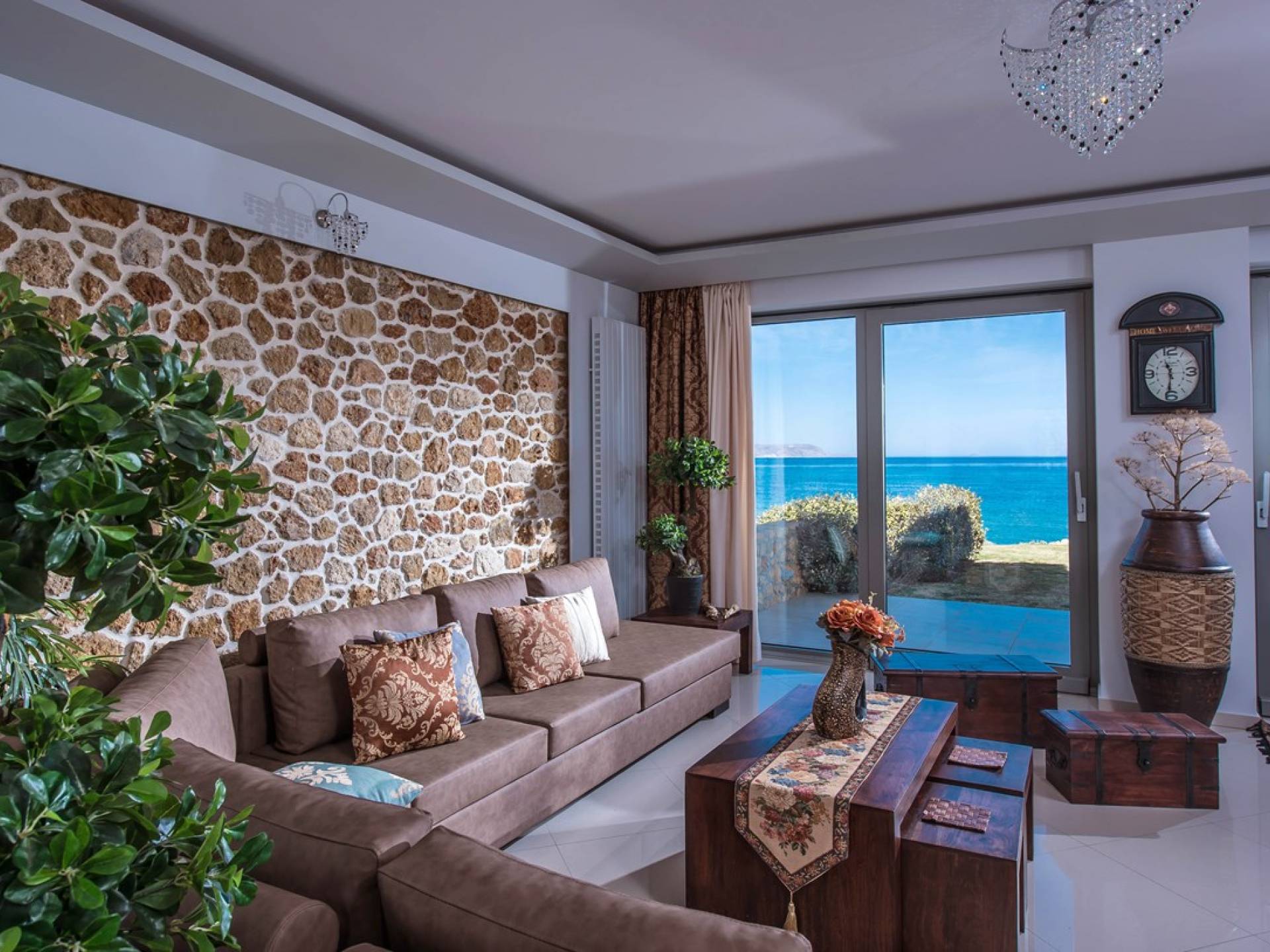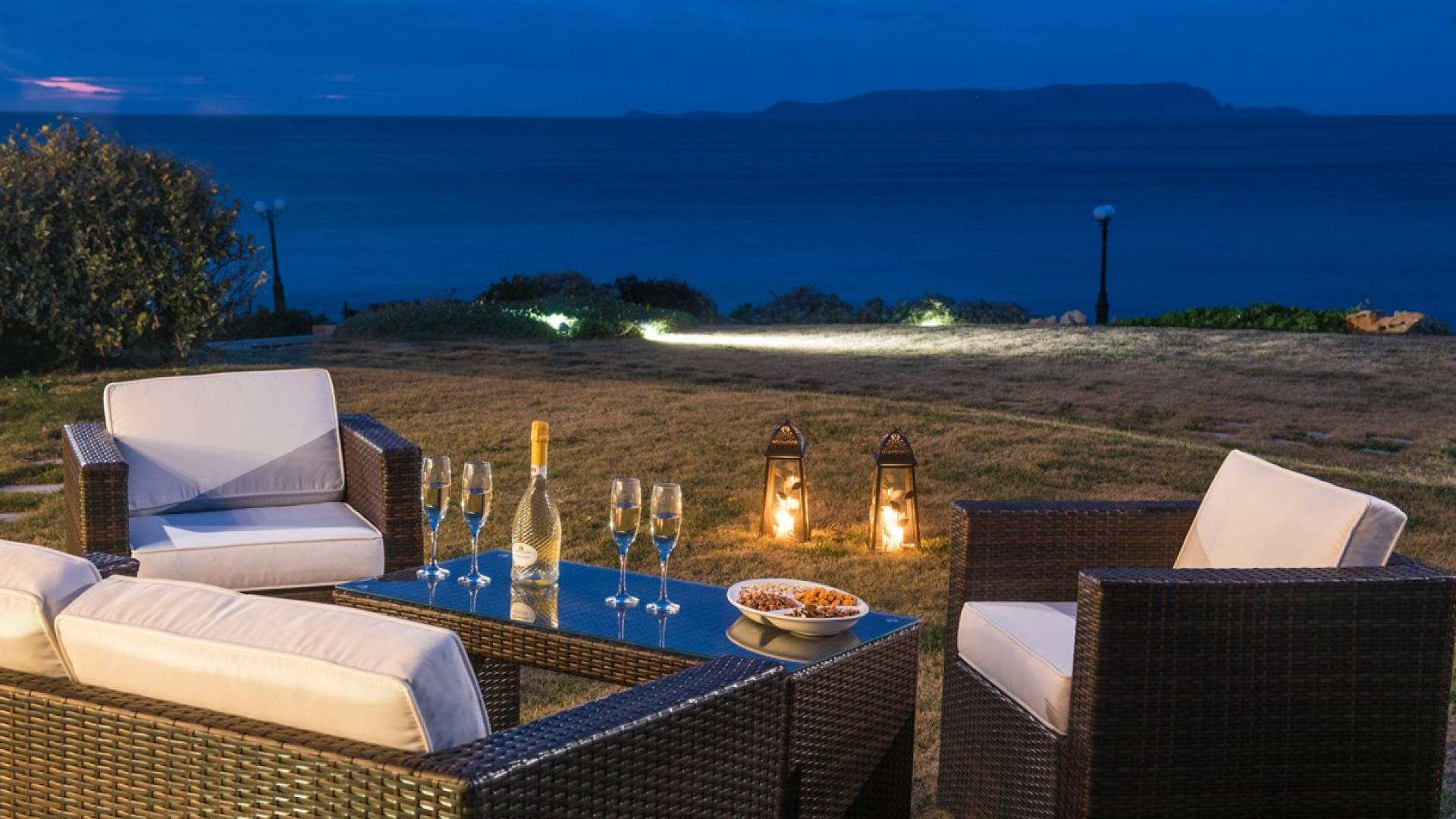 Due comode camere da letto con letti semi-matrimoniali e un ampio bagno completano il piano. Una doccia idromassaggio, un minibar e una TV a schermo piatto sono i punti forti del bagno, ma soprattutto la vista incorniciata dalle finestre è mozzafiato. Artemis Villa Heraklion, oltre alle verande al primo piano, offre un'ampia terrazza al piano terra, la cui naturale prosecuzione è un ampio giardino con prato e piante ornamentali. Qui gli ospiti possono rilassarsi prendendo il sole su comodi lettini da spiaggia o godersi una cena privata tra i caldi colori del tramonto.