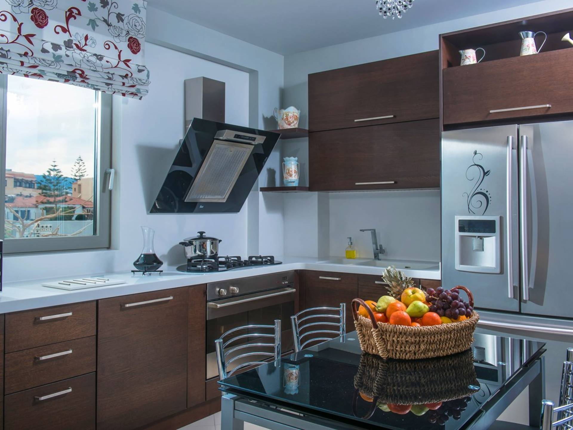 Il lusso inizia a dispiegarsi nell'area open space del piano terra: un enorme divano ad angolo, infissi artigianali con cristalli Swarovski, luci nascoste che compongono un'atmosfera raffinata, un camino a gas, una scrivania in legno artigianale con il giardini e il mare sullo sfondo, un'ampia zona pranzo con mobili in legno scuro e una dominante Smart TV Samsung 65'' curvo. Inoltre, piccoli mobili artigianali e pezzi d'arte completano il quadro, mentre il frigorifero a doppia porta e il grande fornello a gas dominano la cucina completamente attrezzata. La luce e la vista invadono la stanza dalle grandi porte-balcone, collegando mentalmente l'esterno con gli interni.