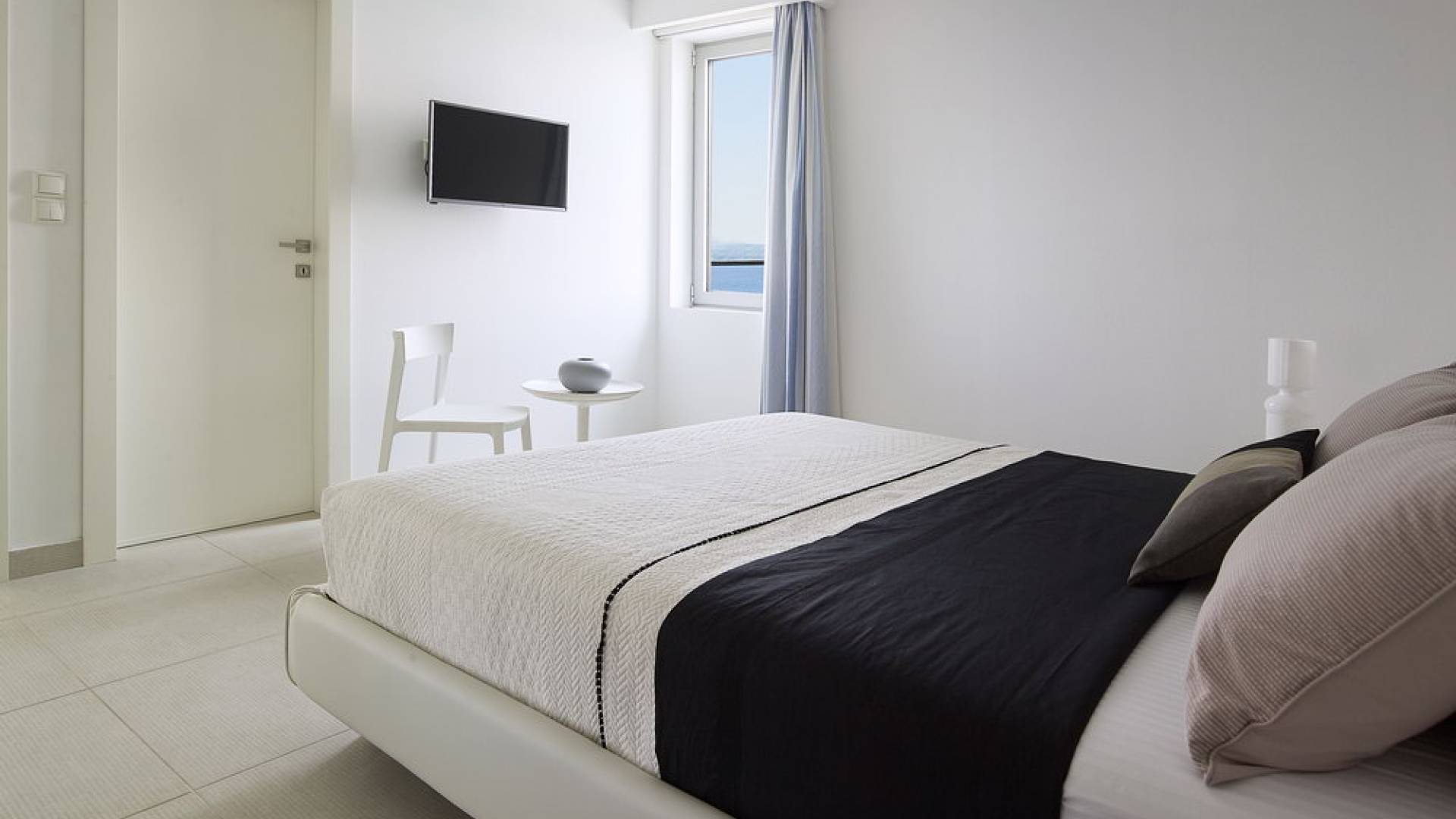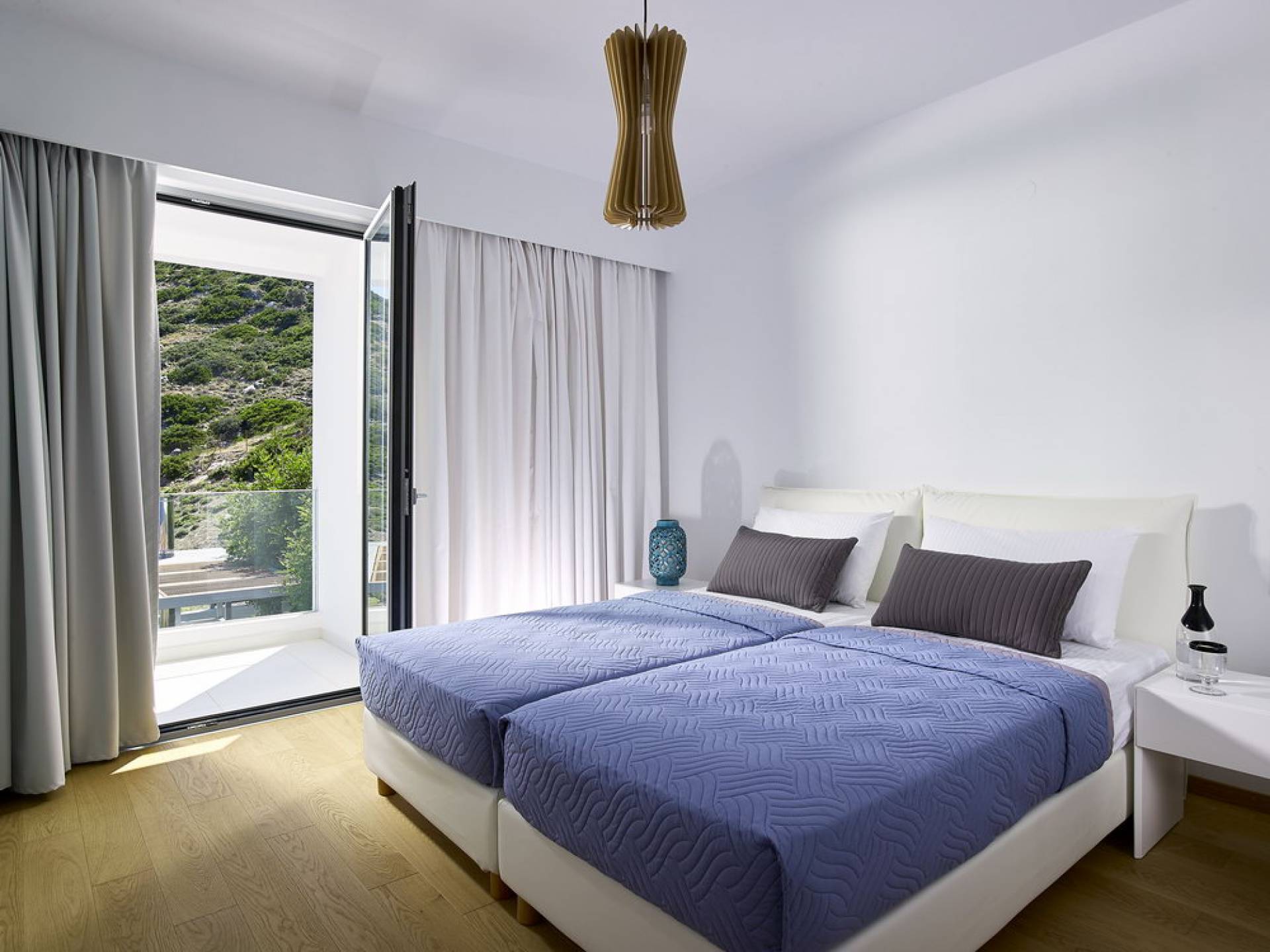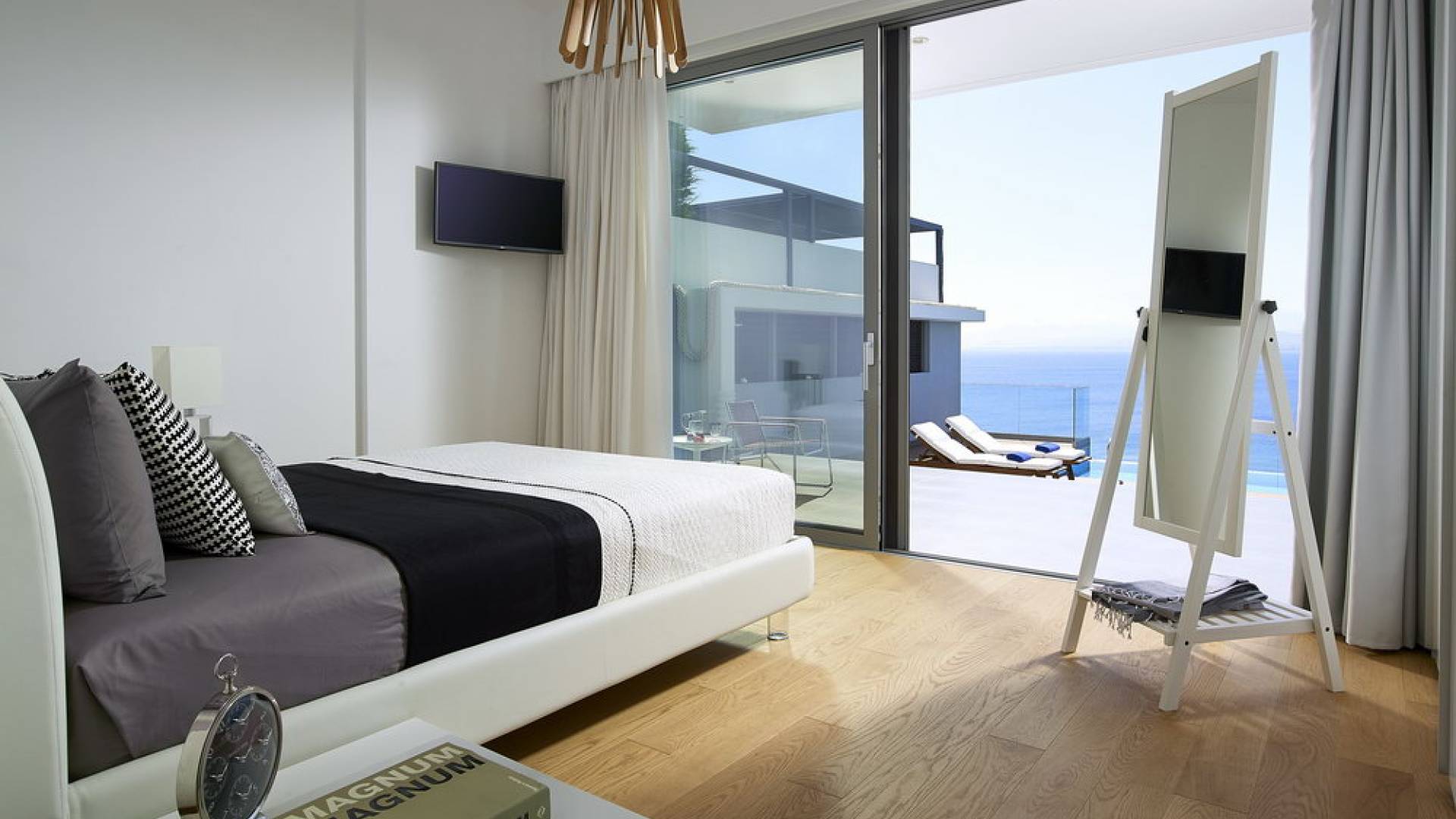 Primo piano: quando apri la porta d'ingresso, troverai le scale che portano al piano superiore, dove si trova la zona notte principale. Ogni camera ha il proprio ingresso privato collegato all'area palestra climatizzata allestita con finestre dal pavimento al soffitto. Qui, mentre ti alleni, puoi guardare un blu infinito del mare di Creta o ammirare splendidi tramonti sopra l'orizzonte blu. Ogni camera dispone di TV satellitare a schermo piatto, aria condizionata, armadi a muro, comodino con lampada e ampio bagno privato con doccia. Dalle porte del balcone dal pavimento al soffitto, ad eccezione di una camera da letto, è possibile accedere a un balcone avvolgente con una vista mozzafiato sul mare. Due camere da letto si aprono su una vista diretta sul mare e una su una vista sul mare delle montagne. Una camera su sei ha un letto king size che può anche essere separato in due letti singoli.