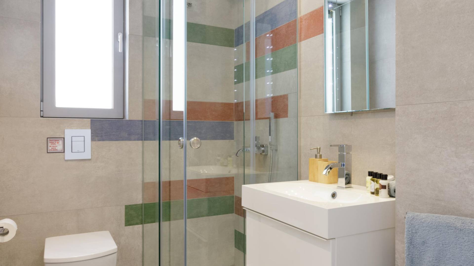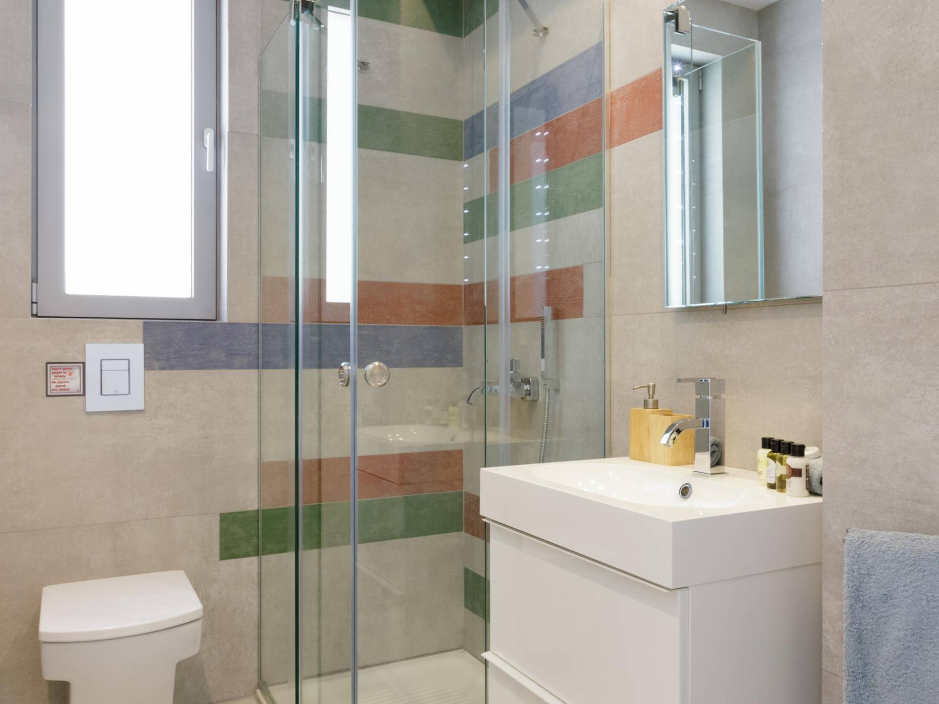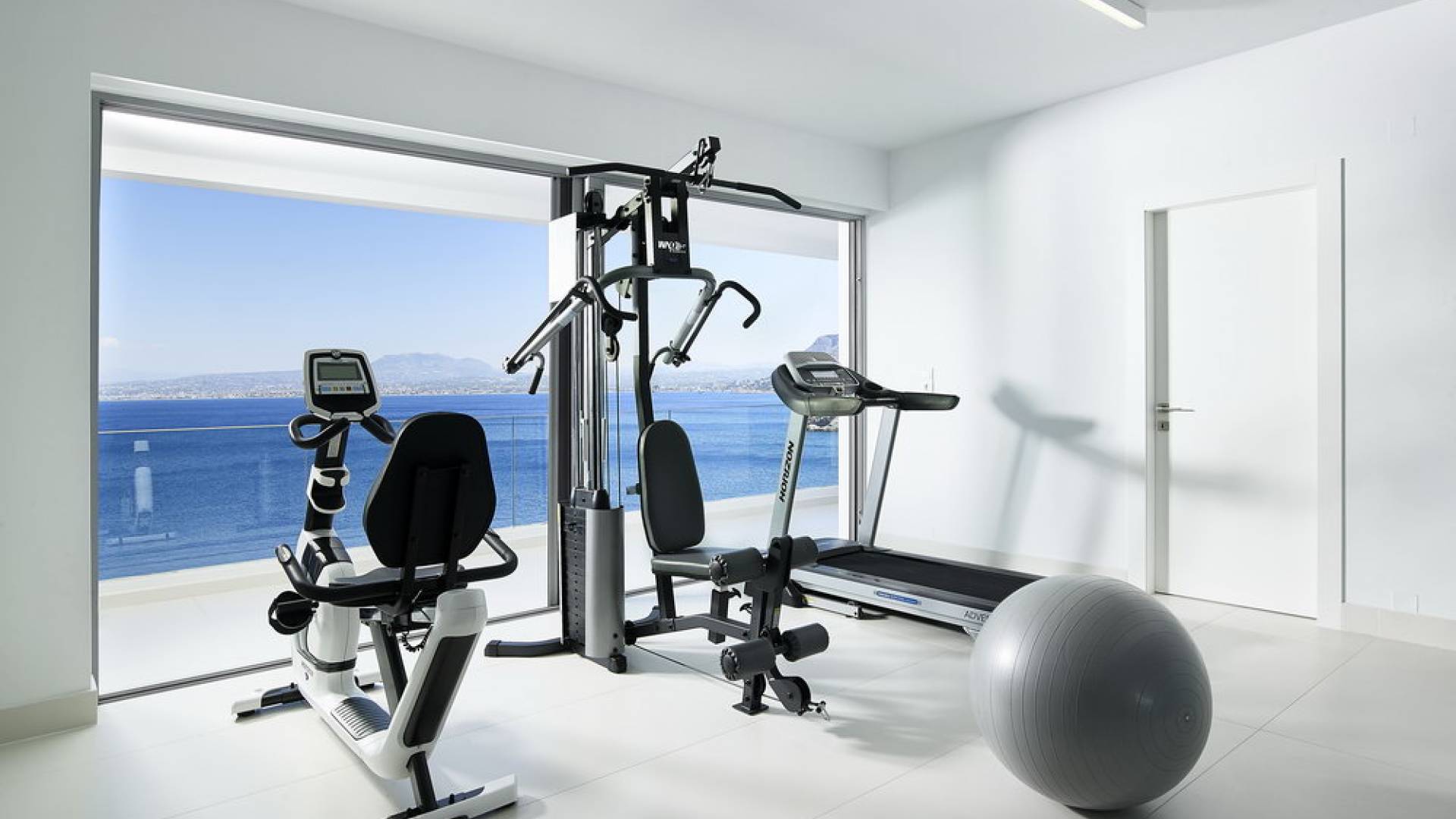 Primo piano: quando apri la porta d'ingresso, troverai le scale che portano al piano superiore, dove si trova la zona notte principale. Ogni camera ha il proprio ingresso privato collegato all'area palestra climatizzata allestita con finestre dal pavimento al soffitto. Qui, mentre ti alleni, puoi guardare un blu infinito del mare di Creta o ammirare splendidi tramonti sopra l'orizzonte blu. Ogni camera dispone di TV satellitare a schermo piatto, aria condizionata, armadi a muro, comodino con lampada e ampio bagno privato con doccia. Dalle porte del balcone dal pavimento al soffitto, ad eccezione di una camera da letto, è possibile accedere a un balcone avvolgente con una vista mozzafiato sul mare. Due camere da letto si aprono su una vista diretta sul mare e una su una vista sul mare delle montagne. Una camera su sei ha un letto king size che può anche essere separato in due letti singoli.