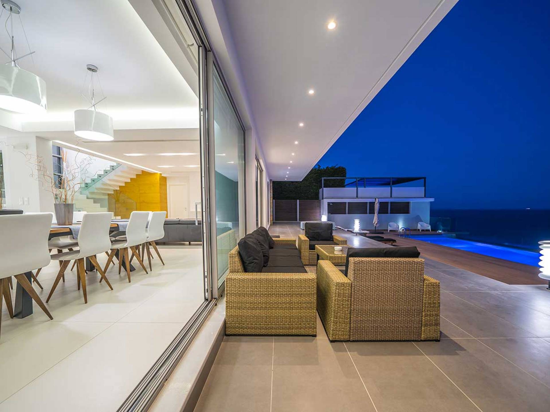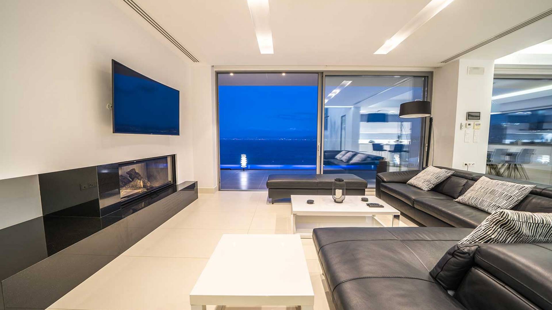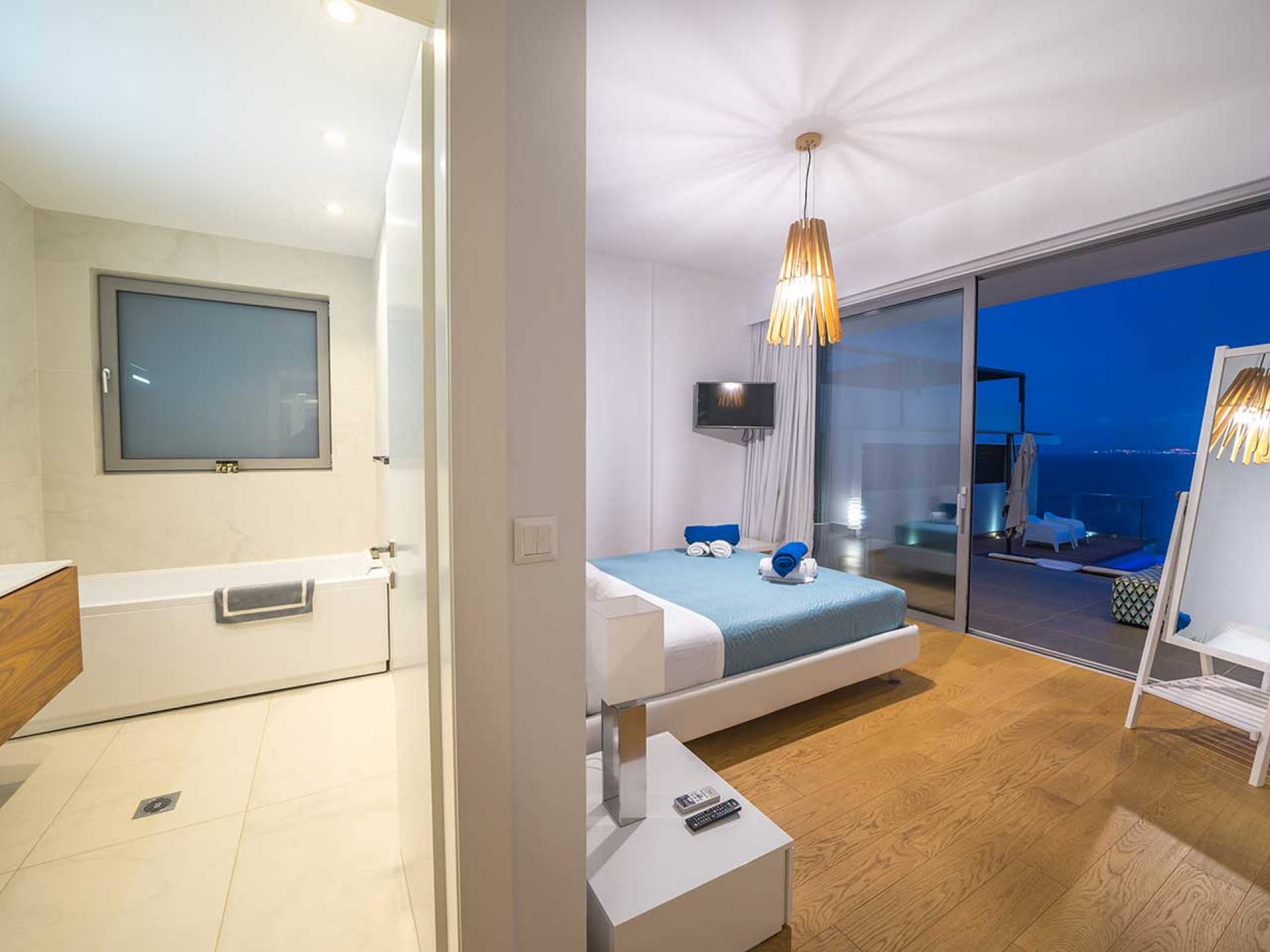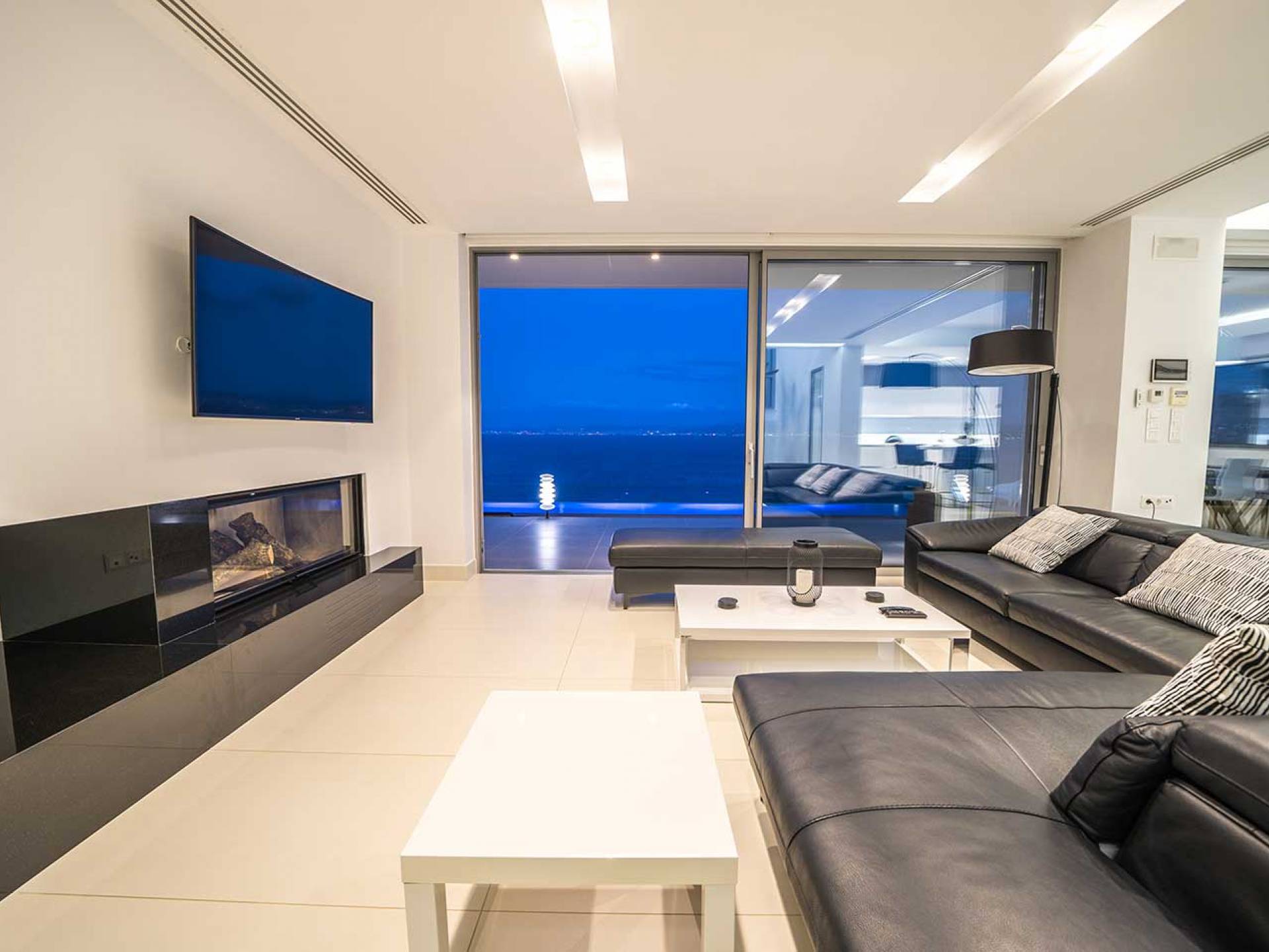 Piano terra: altre scale ti condurranno dalla sala principale alla zona giorno e pranzo a pianta aperta al piano inferiore, una camera da letto principale e una cucina moderna con accesso diretto alla piscina. La zona giorno è composta da una zona giorno climatizzata con comodi divani in pelle, caminetto, Smart TV da 55 pollici e finestre dal pavimento al soffitto. La zona pranzo combina una spaziosa cucina completamente attrezzata, un tavolo da bar con 6 sgabelli e un tavolo di design in legno per un massimo di 12 persone. La camera da letto principale è composta da un letto king-size, un armadio a muro, una smart TV, l'aria condizionata, uno specchio in piedi abbinato con cornice in legno, un comodino con una lampada, un bagno ispirato alla spa con idromassaggio e aeromassaggio e un pavimento balcone a soffitto con vista sulla piscina e sul mare. A questo livello troverai anche un ripostiglio nascosto con un bagno extra.