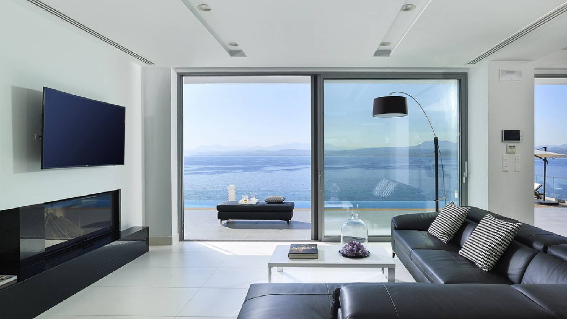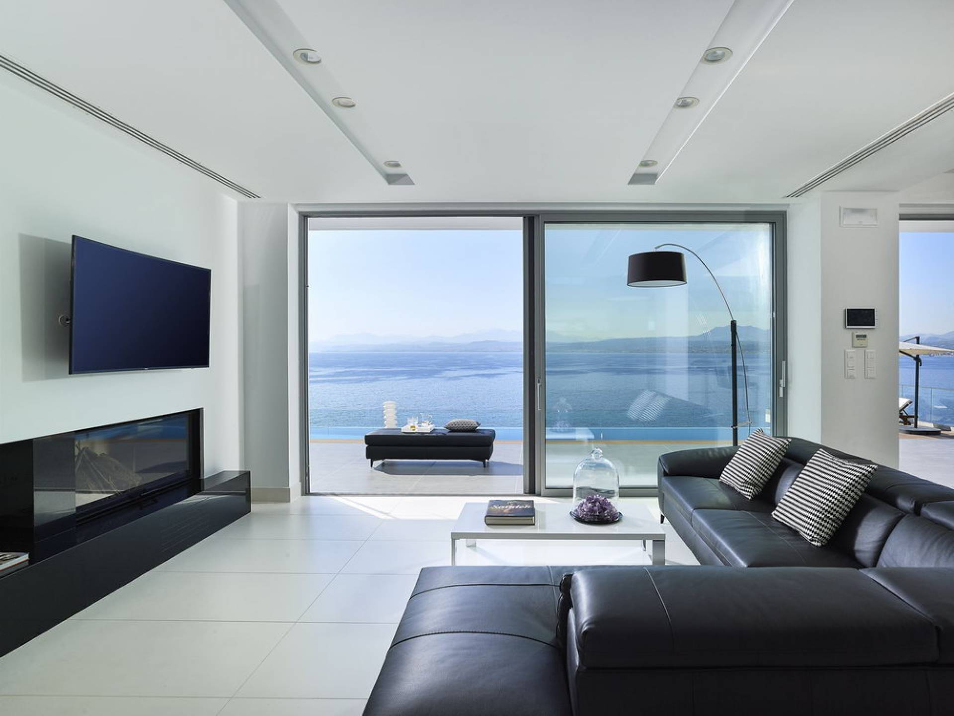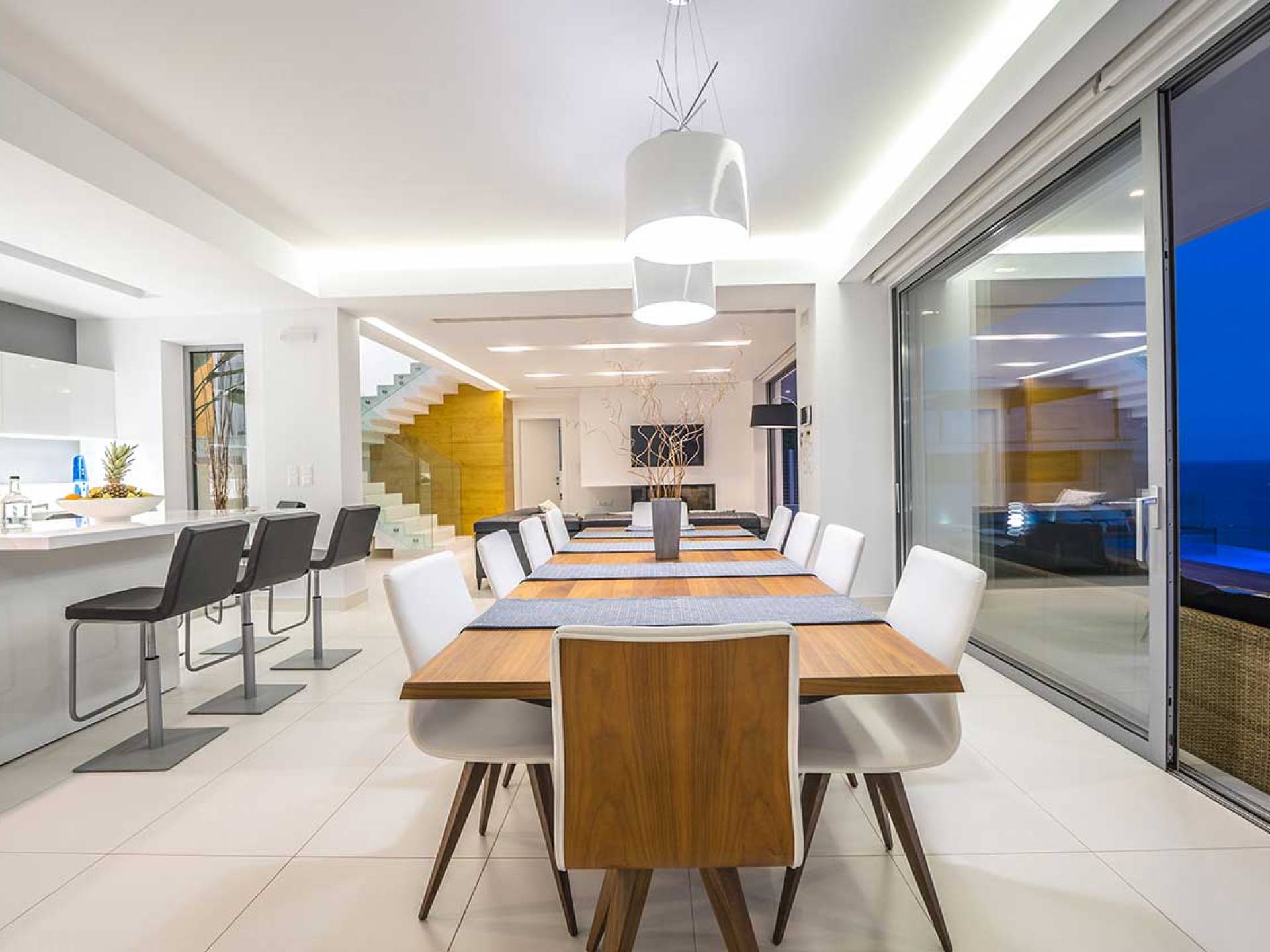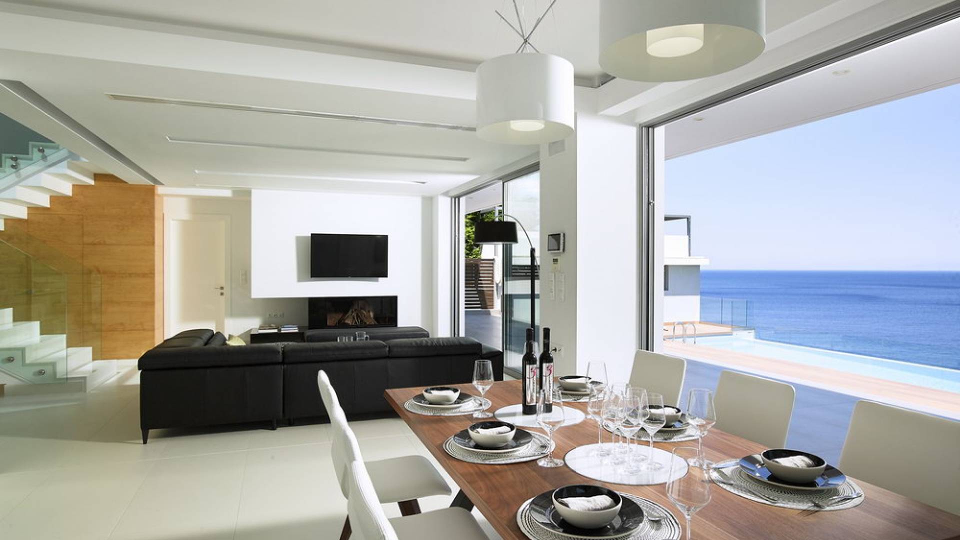 Piano terra: altre scale ti condurranno dalla sala principale alla zona giorno e pranzo a pianta aperta al piano inferiore, una camera da letto principale e una cucina moderna con accesso diretto alla piscina. La zona giorno è composta da una zona giorno climatizzata con comodi divani in pelle, caminetto, Smart TV da 55 pollici e finestre dal pavimento al soffitto. La zona pranzo combina una spaziosa cucina completamente attrezzata, un tavolo da bar con 6 sgabelli e un tavolo di design in legno per un massimo di 12 persone. La camera da letto principale è composta da un letto king-size, un armadio a muro, una smart TV, l'aria condizionata, uno specchio in piedi abbinato con cornice in legno, un comodino con una lampada, un bagno ispirato alla spa con idromassaggio e aeromassaggio e un pavimento balcone a soffitto con vista sulla piscina e sul mare. A questo livello troverai anche un ripostiglio nascosto con un bagno extra.