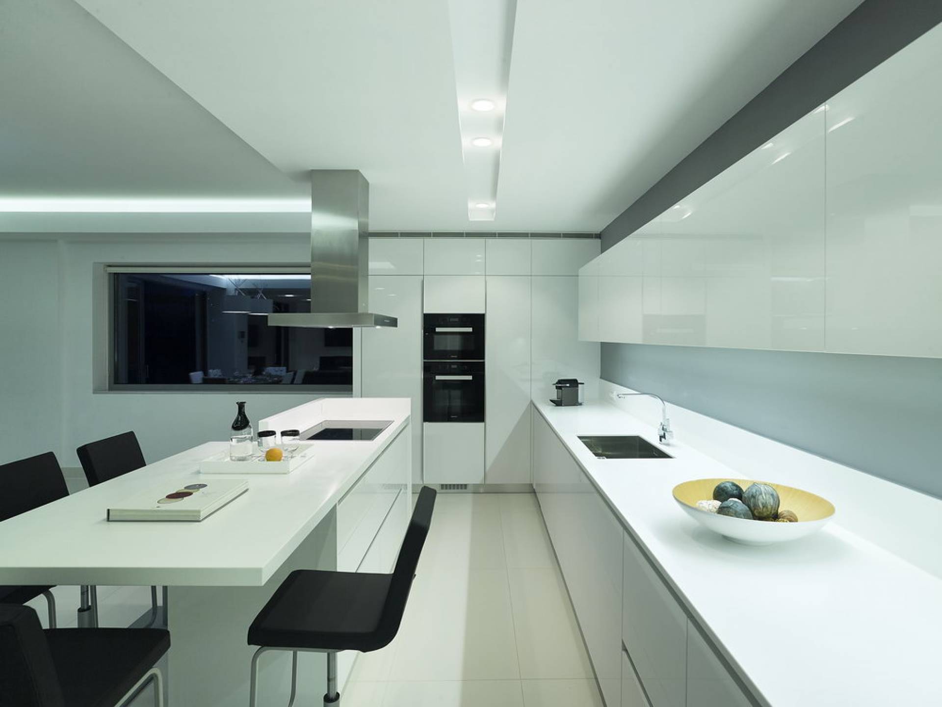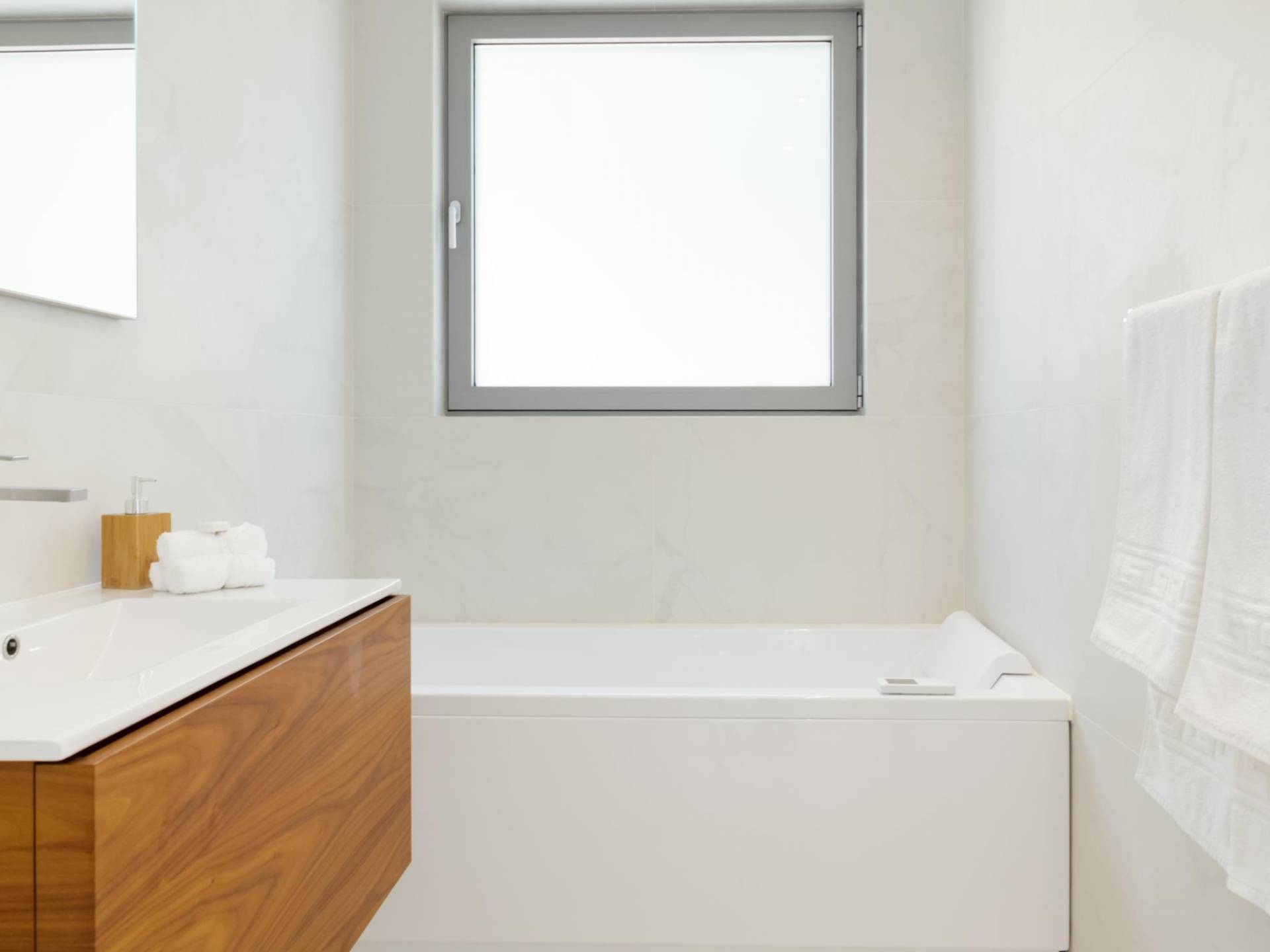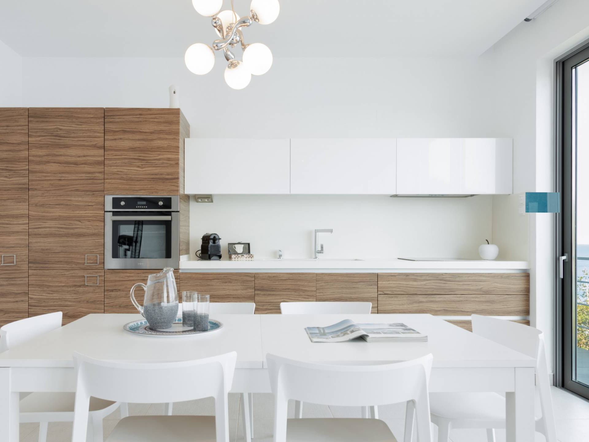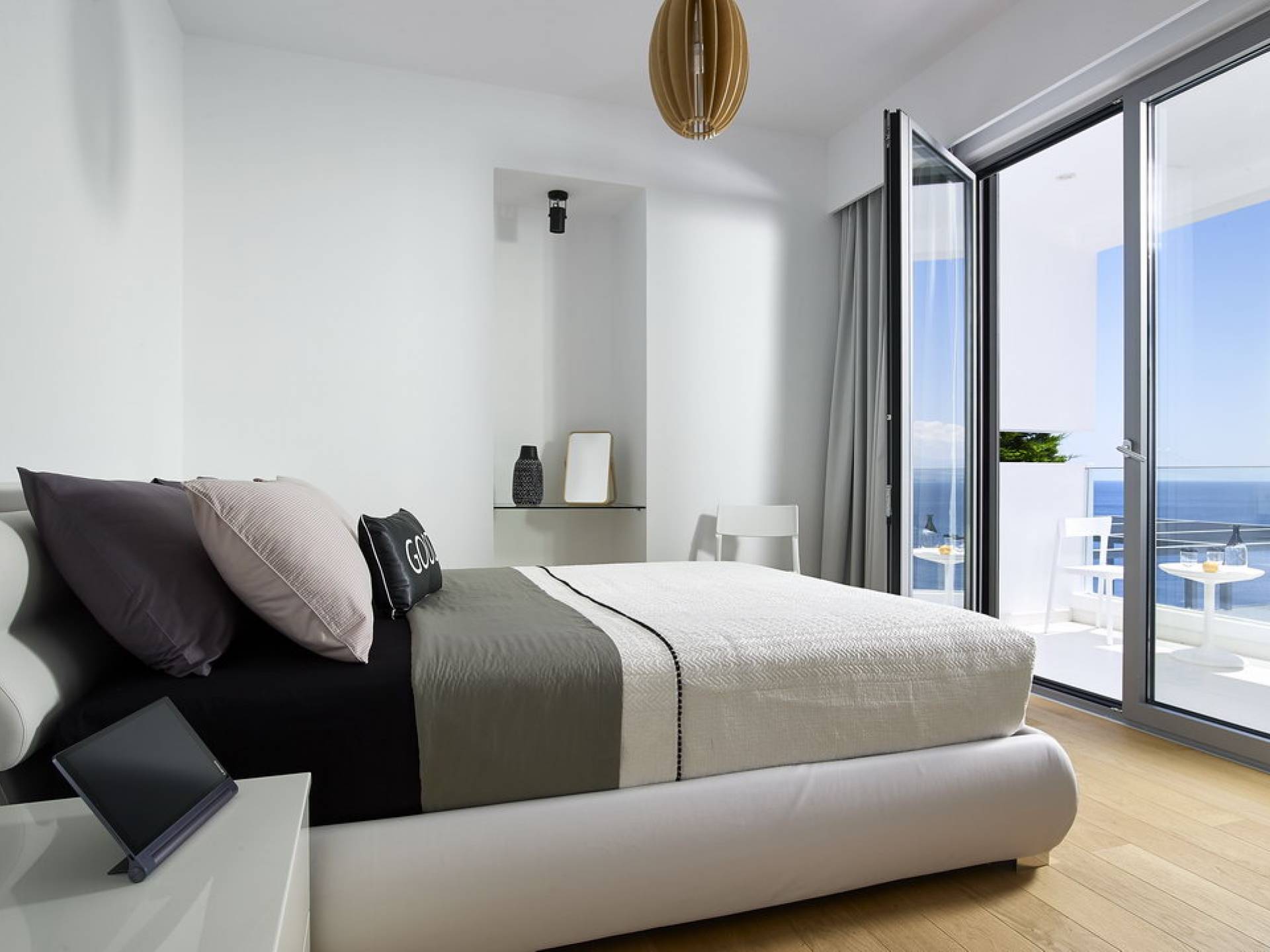Piano terra: altre scale ti condurranno dalla sala principale alla zona giorno e pranzo a pianta aperta al piano inferiore, una camera da letto principale e una cucina moderna con accesso diretto alla piscina. La zona giorno è composta da una zona giorno climatizzata con comodi divani in pelle, caminetto, Smart TV da 55 pollici e finestre dal pavimento al soffitto. La zona pranzo combina una spaziosa cucina completamente attrezzata, un tavolo da bar con 6 sgabelli e un tavolo di design in legno per un massimo di 12 persone. La camera da letto principale è composta da un letto king-size, un armadio a muro, una smart TV, l'aria condizionata, uno specchio in piedi abbinato con cornice in legno, un comodino con una lampada, un bagno ispirato alla spa con idromassaggio e aeromassaggio e un pavimento balcone a soffitto con vista sulla piscina e sul mare. A questo livello troverai anche un ripostiglio nascosto con un bagno extra.