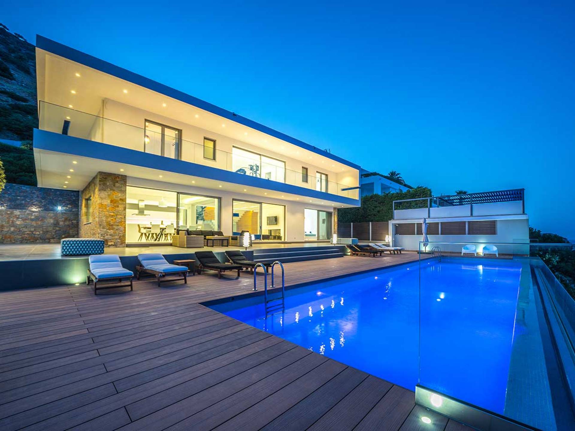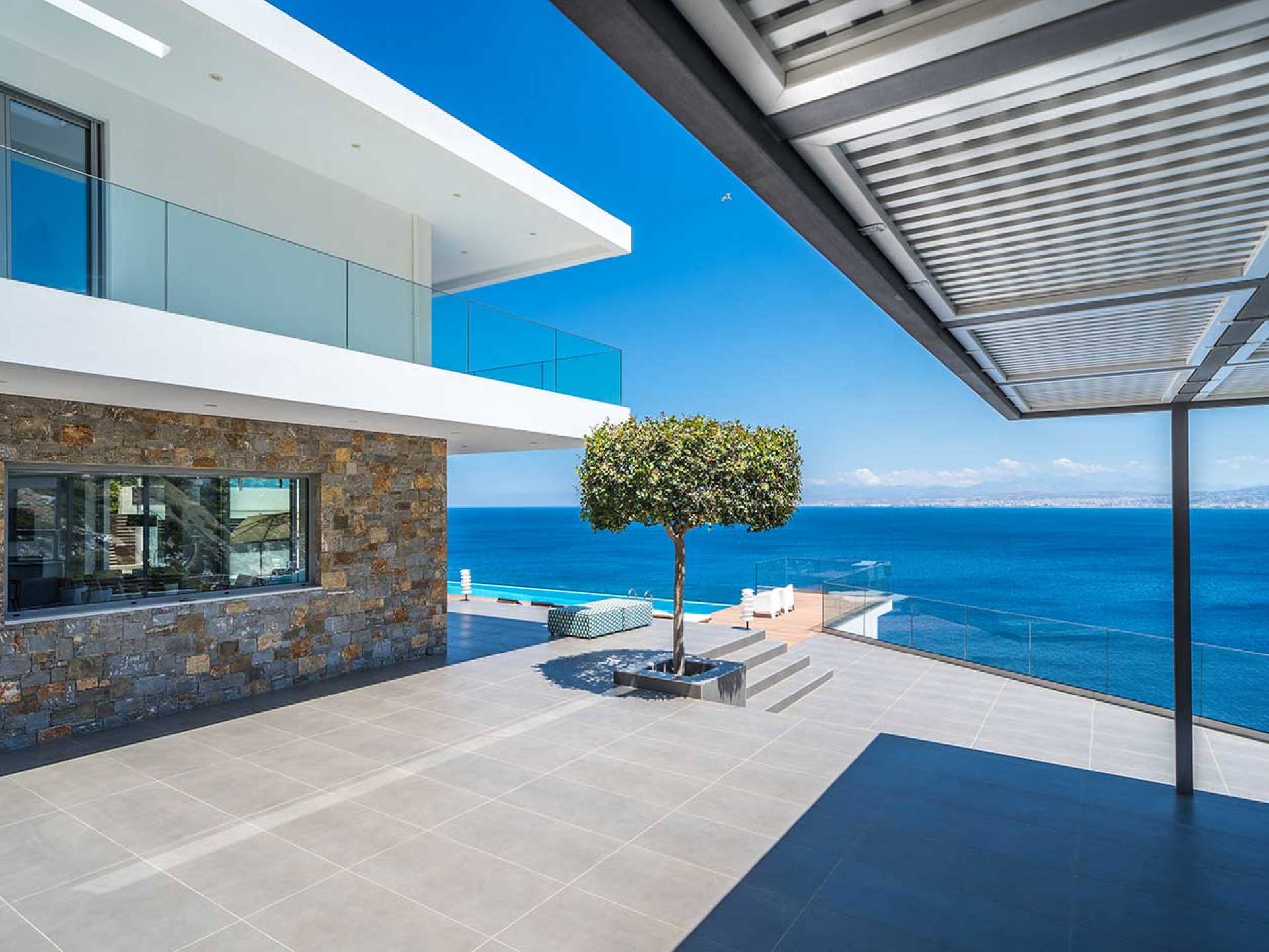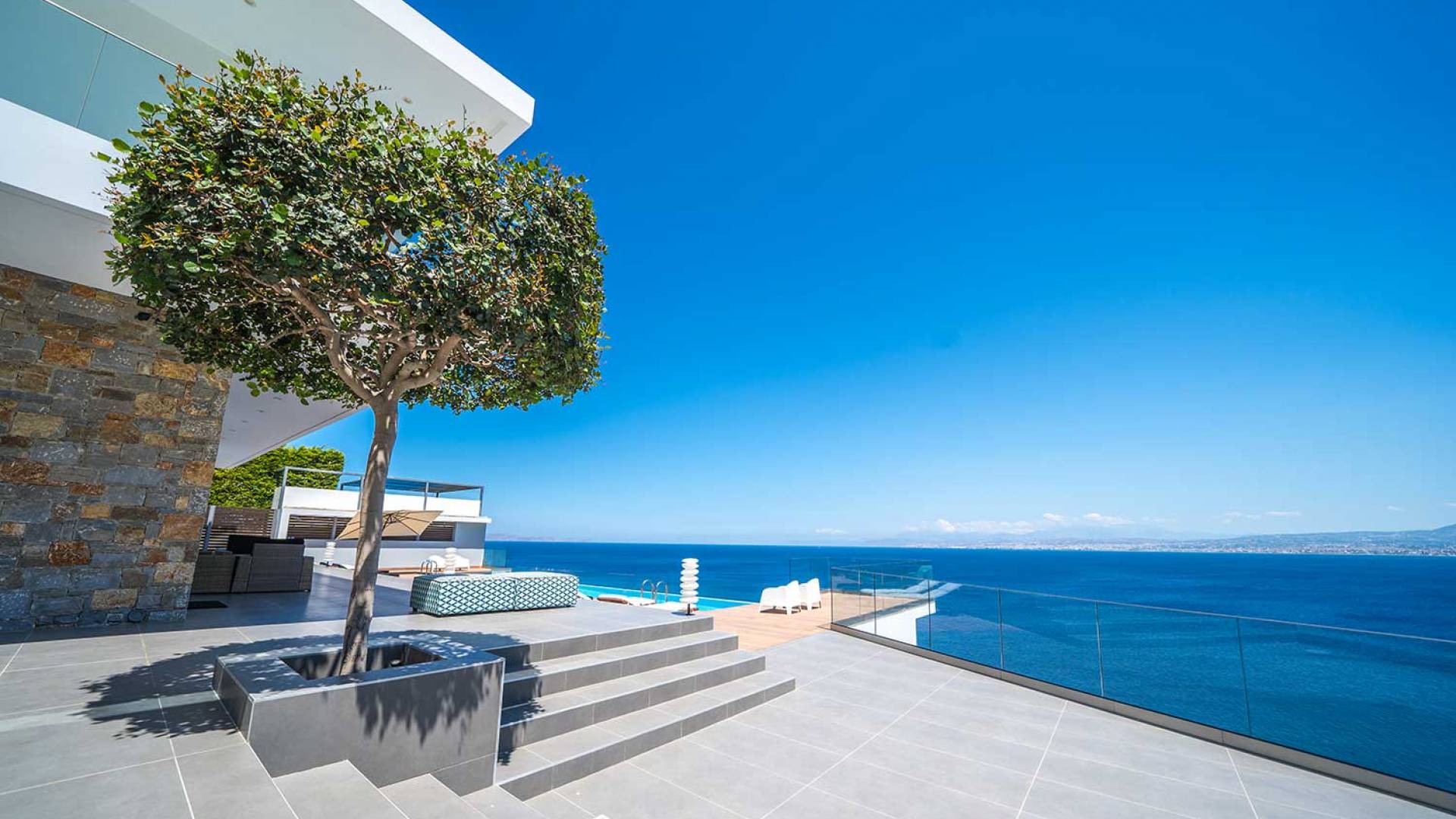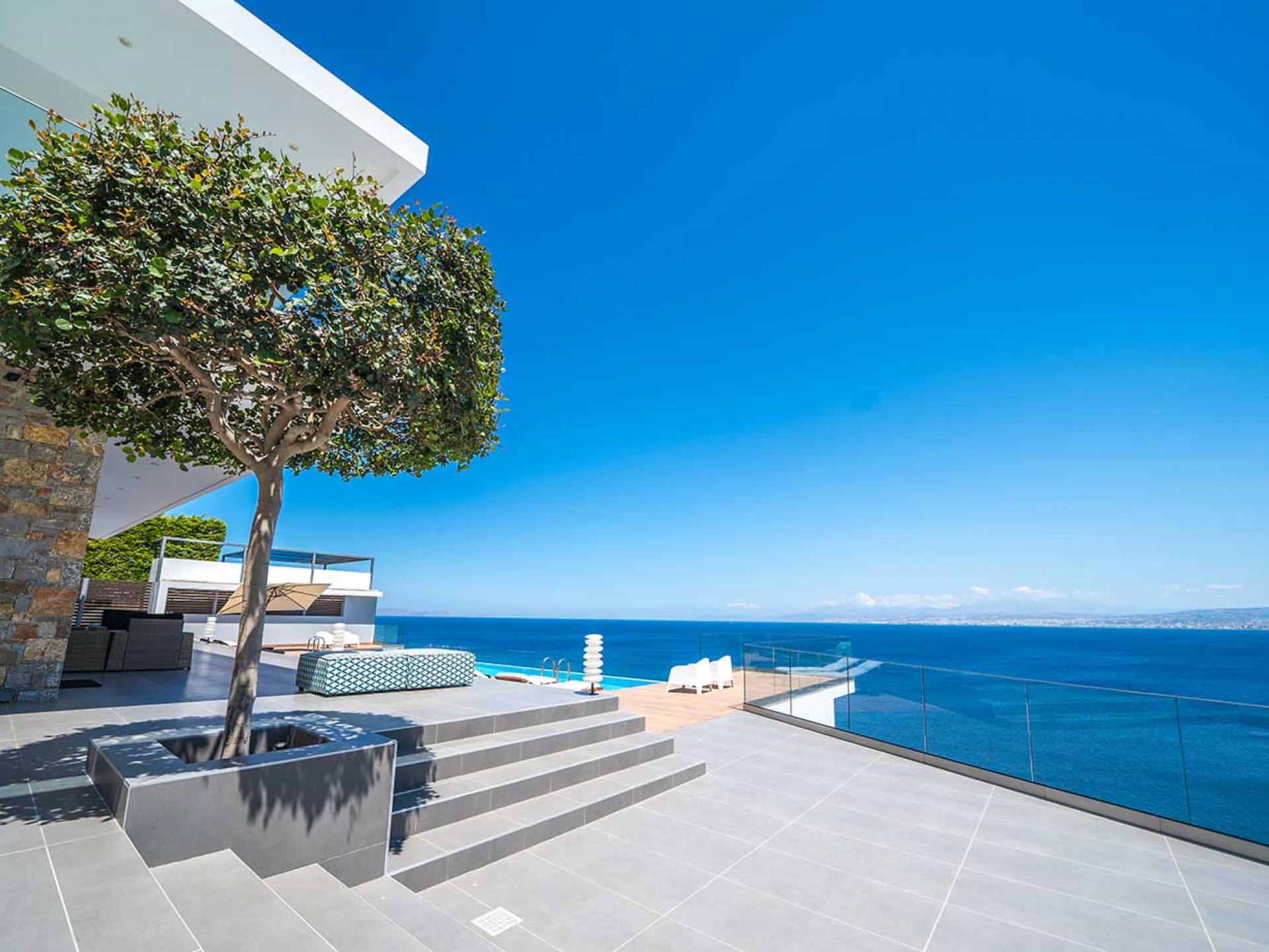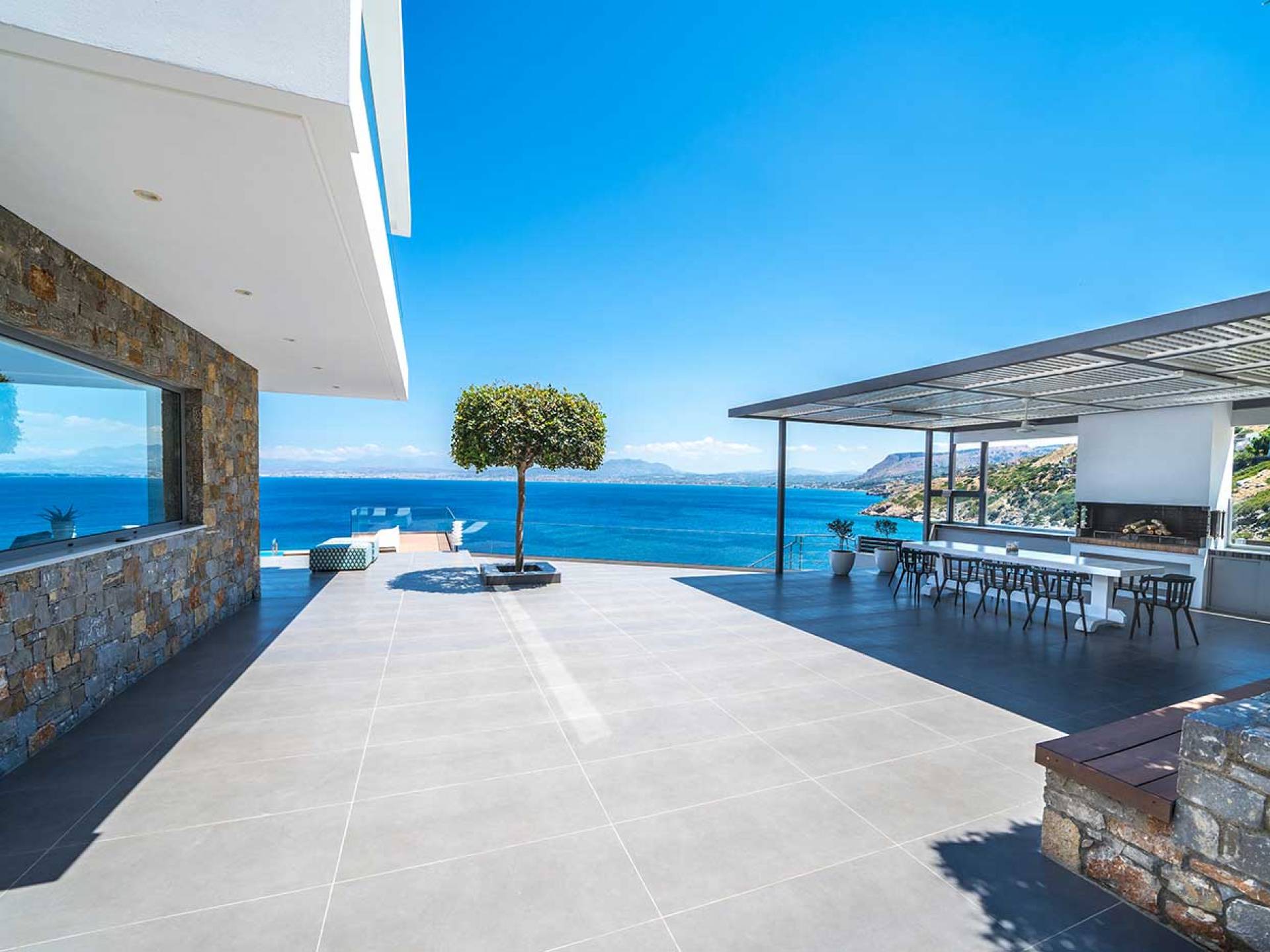 All'aperto: dal piano terra, si accede all'area esterna con una piscina a sfioro di 17 metri, una terrazza privata parzialmente coperta con un'area salotto, una terrazza della piscina con lettini prendisole e uno spazio per rilassarsi all'ombra, barbecue con un forno in pietra e un tavolo che può ospitare fino a 8 persone. Per sedersi è disponibile anche una panca in pietra a parete, accanto al forno, con comodi cuscini. Accanto alla piscina a sfioro, c'è un sentiero privato che conduce alle acque turchesi del mare di Creta, situato a soli 25 m di distanza.