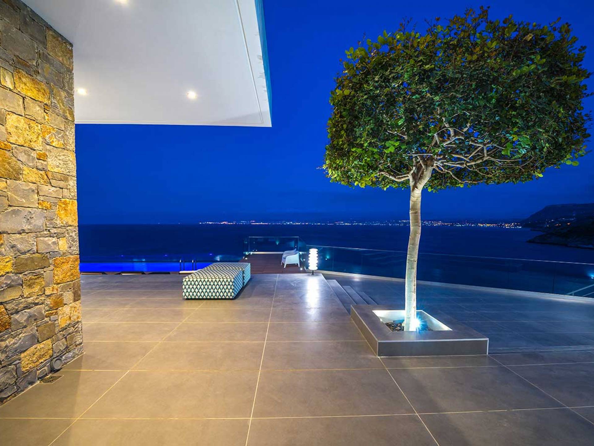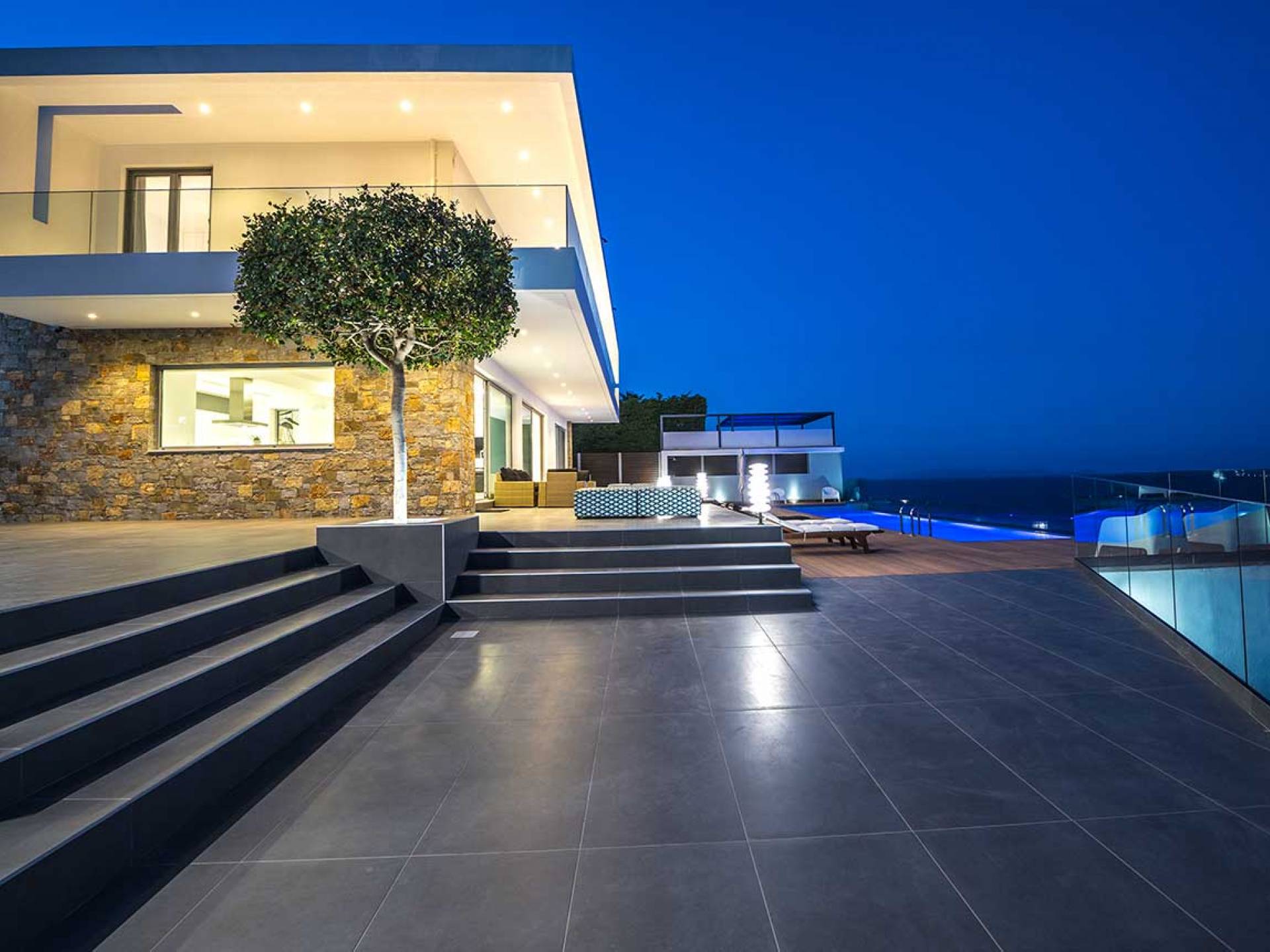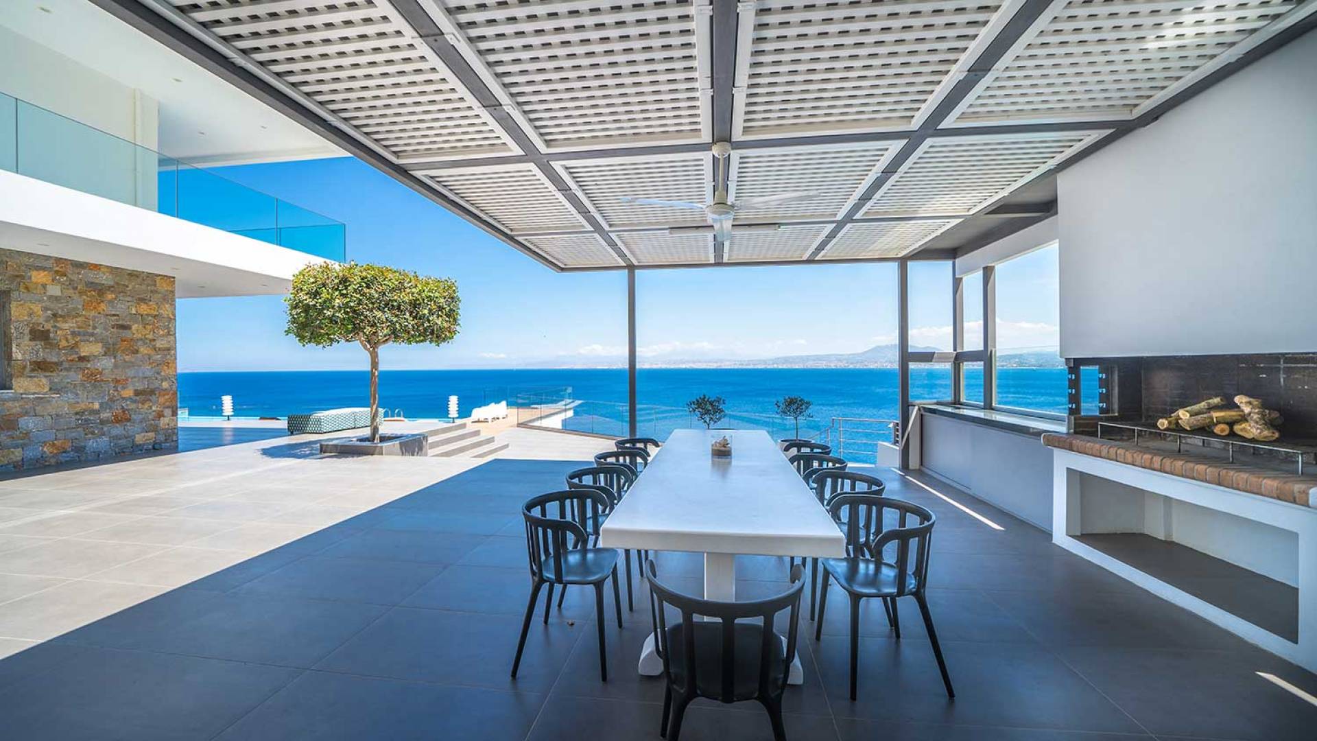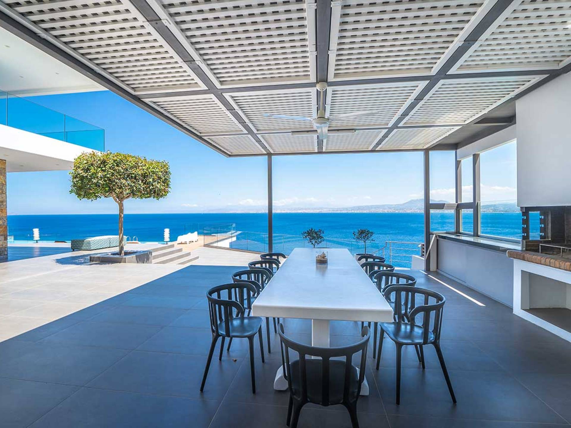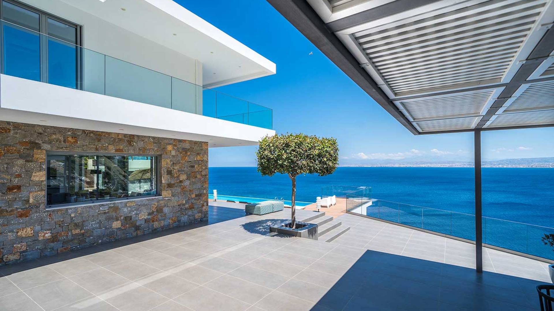 All'aperto: dal piano terra, si accede all'area esterna con una piscina a sfioro di 17 metri, una terrazza privata parzialmente coperta con un'area salotto, una terrazza della piscina con lettini prendisole e uno spazio per rilassarsi all'ombra, barbecue con un forno in pietra e un tavolo che può ospitare fino a 8 persone. Per sedersi è disponibile anche una panca in pietra a parete, accanto al forno, con comodi cuscini. Accanto alla piscina a sfioro, c'è un sentiero privato che conduce alle acque turchesi del mare di Creta, situato a soli 25 m di distanza.