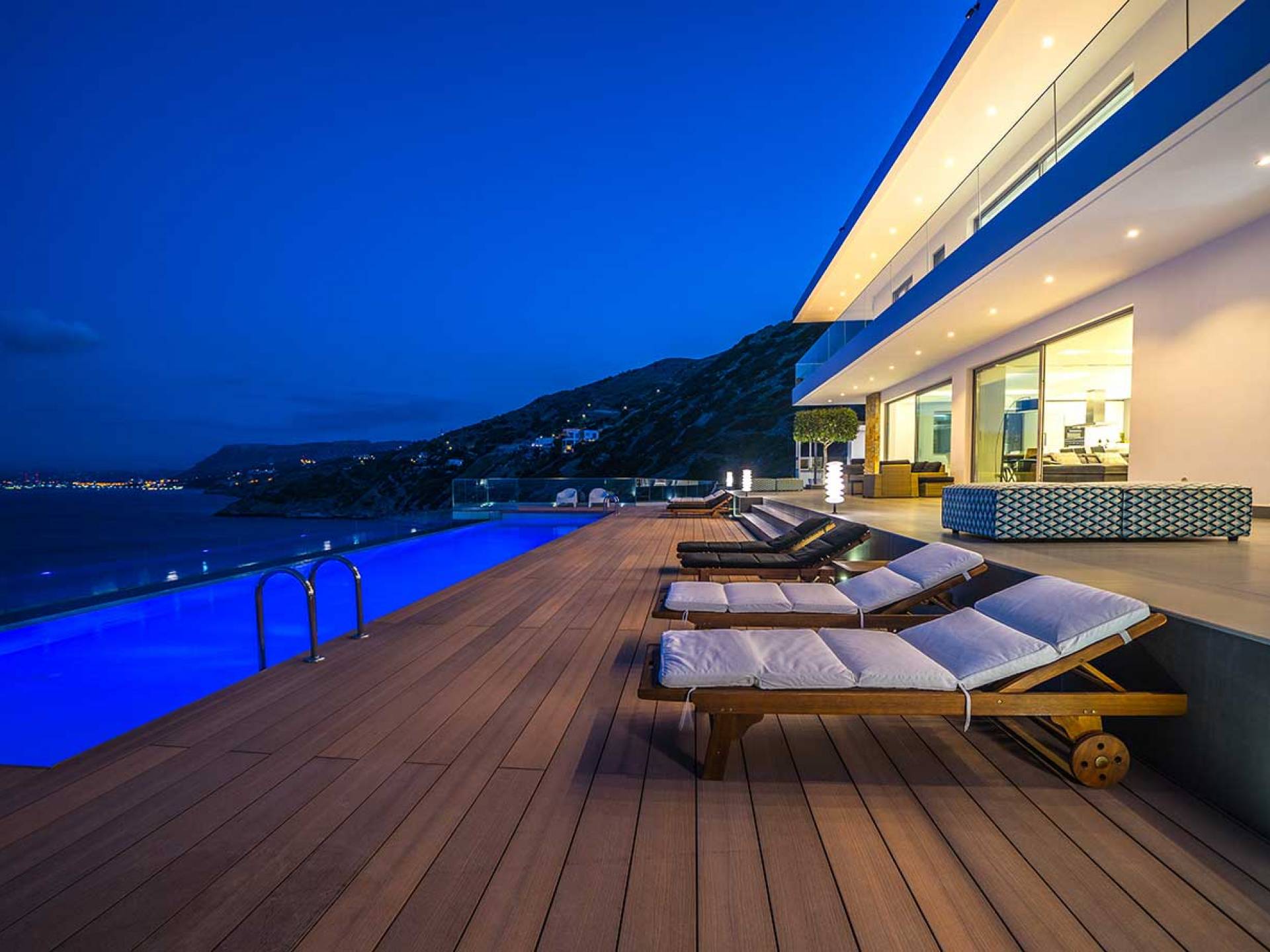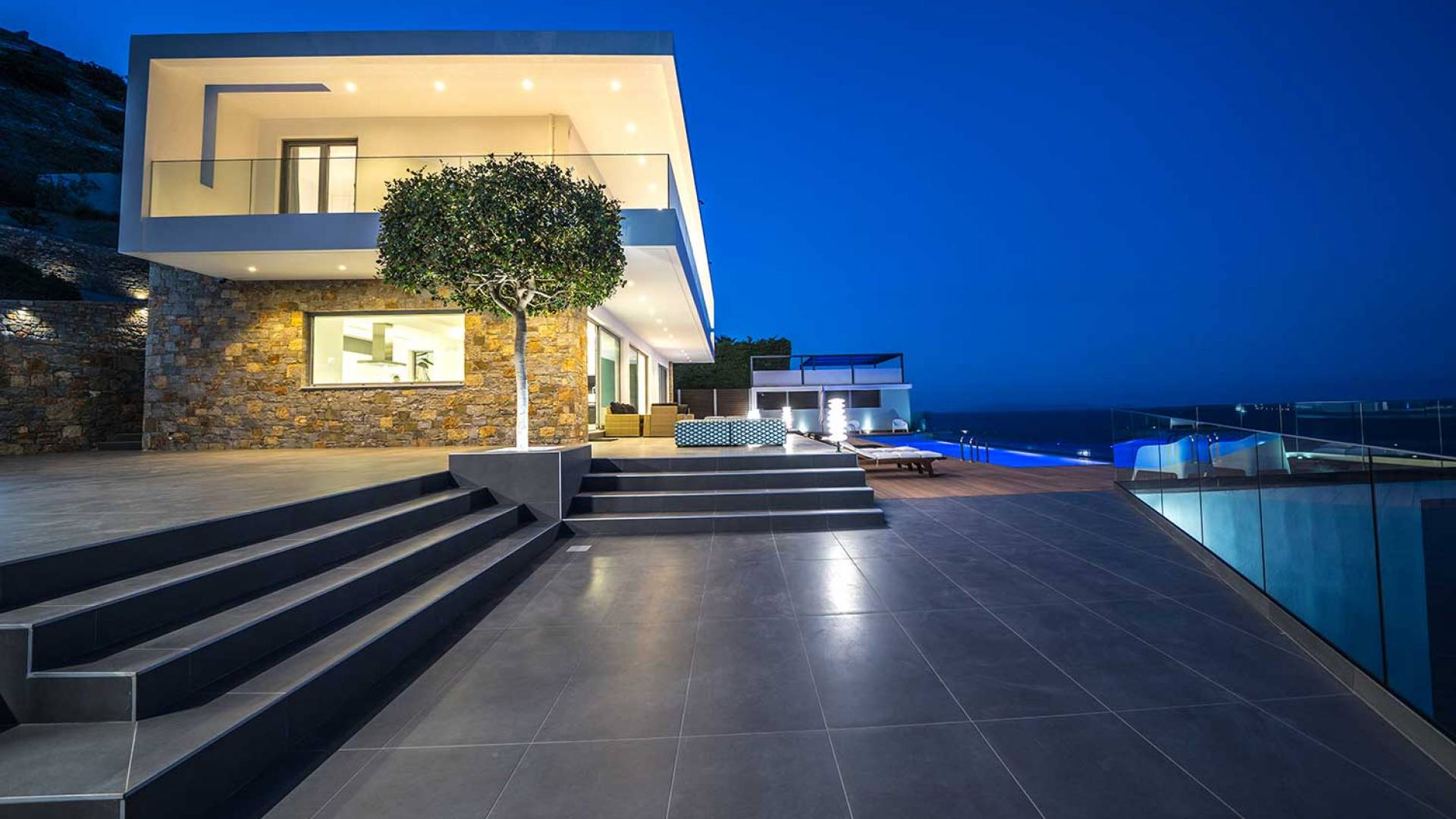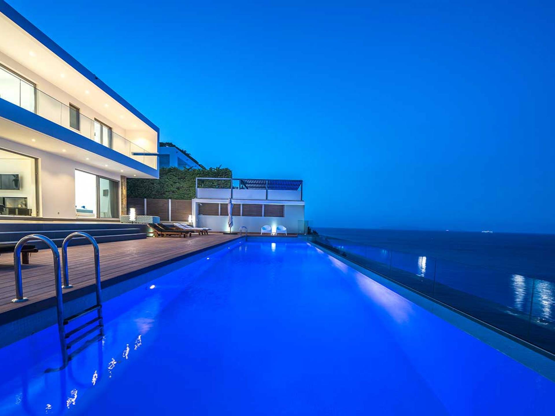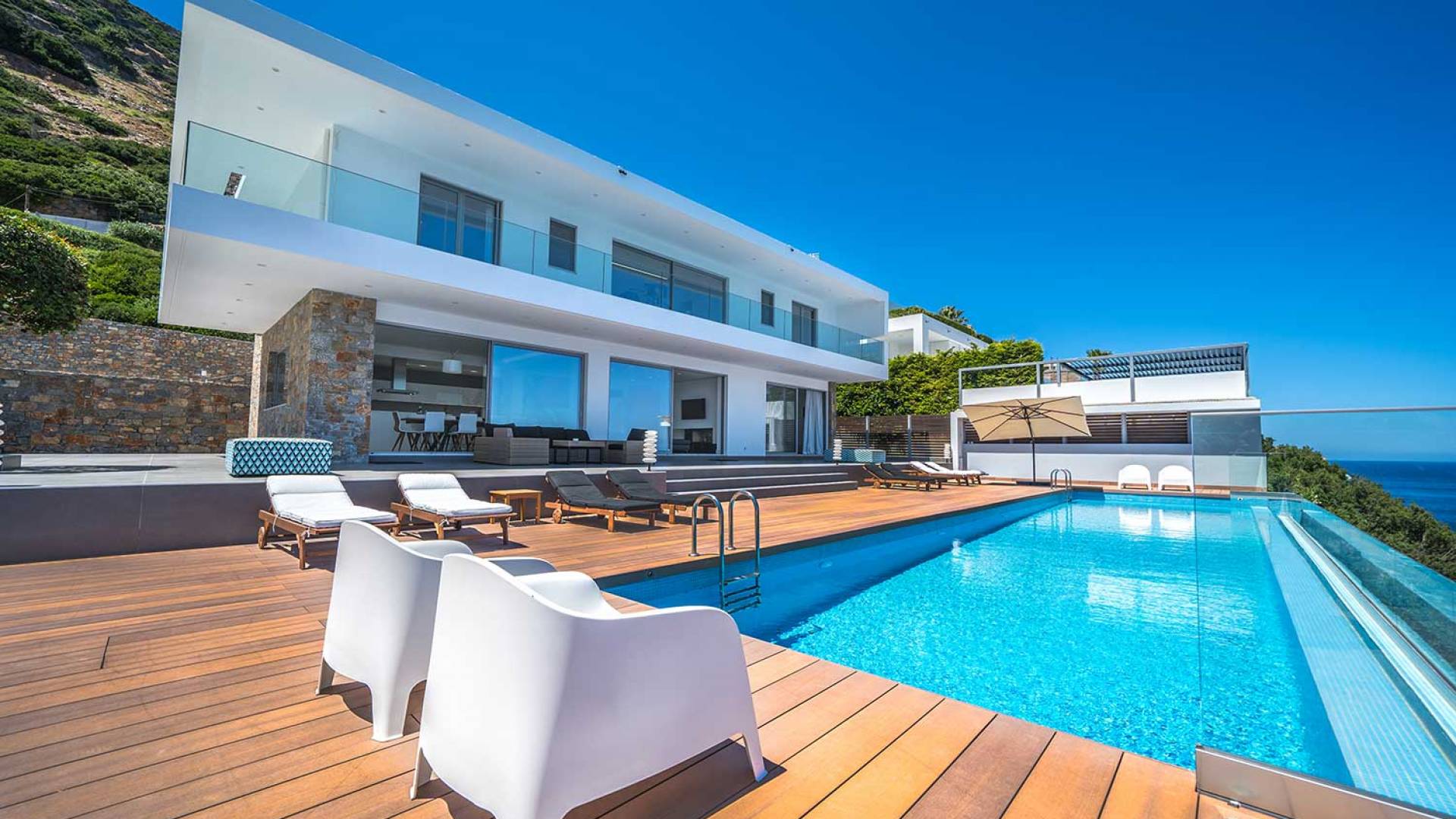 All'aperto: dal piano terra, si accede all'area esterna con una piscina a sfioro di 17 metri, una terrazza privata parzialmente coperta con un'area salotto, una terrazza della piscina con lettini prendisole e uno spazio per rilassarsi all'ombra, barbecue con un forno in pietra e un tavolo che può ospitare fino a 8 persone. Per sedersi è disponibile anche una panca in pietra a parete, accanto al forno, con comodi cuscini. Accanto alla piscina a sfioro, c'è un sentiero privato che conduce alle acque turchesi del mare di Creta, situato a soli 25 m di distanza.