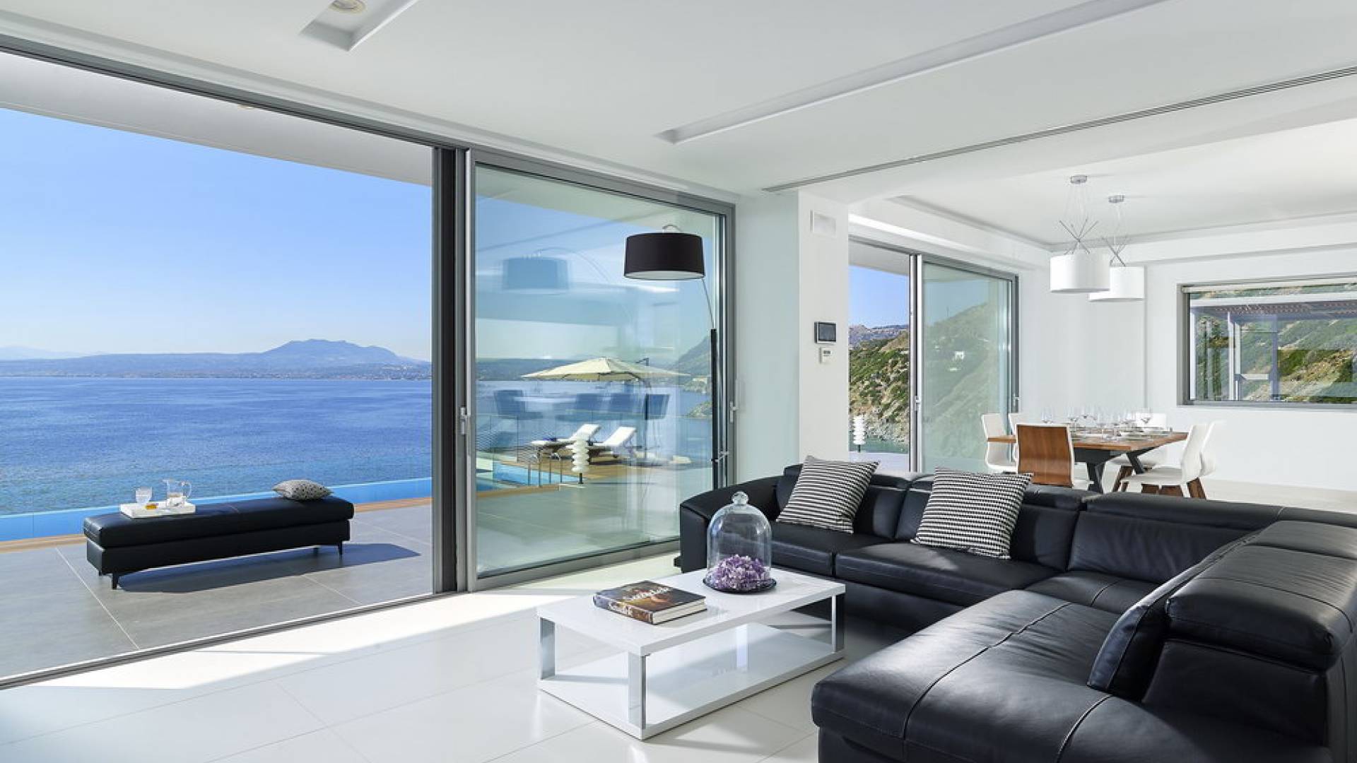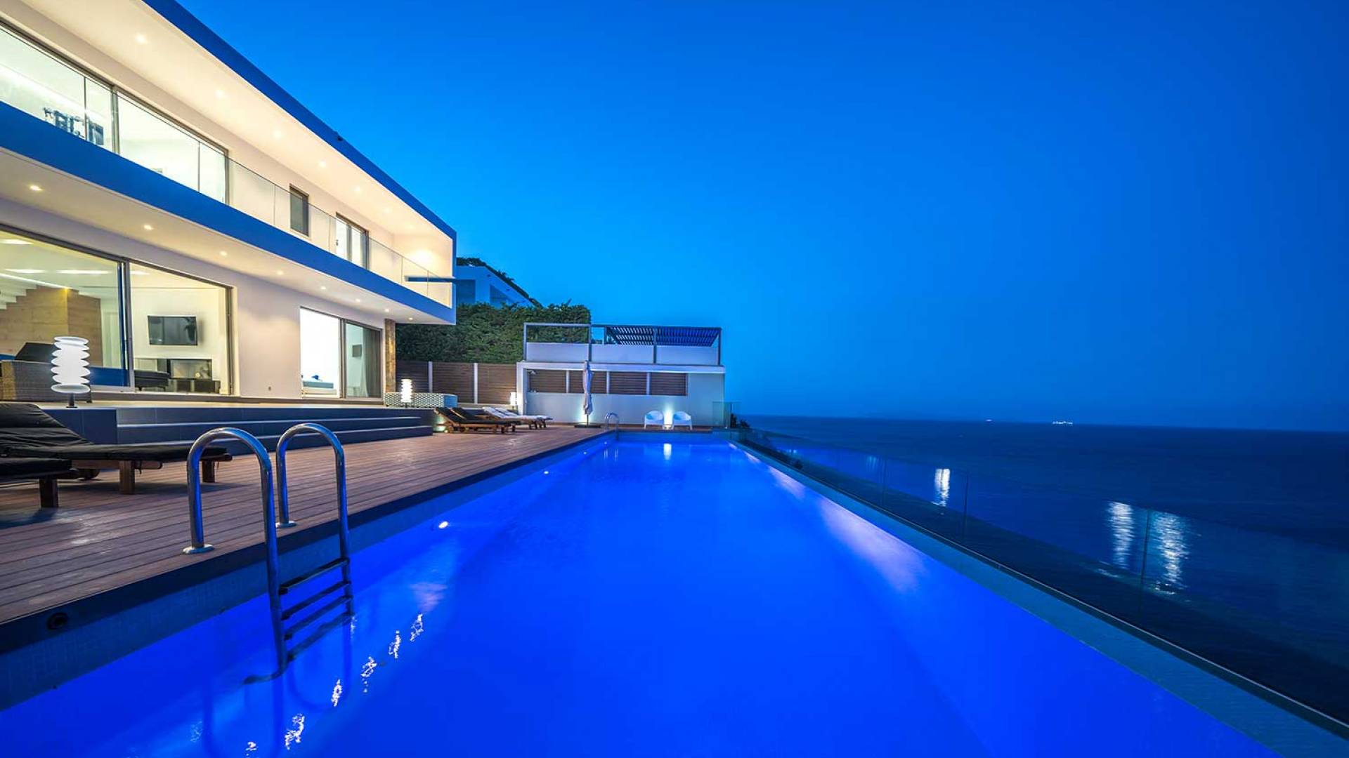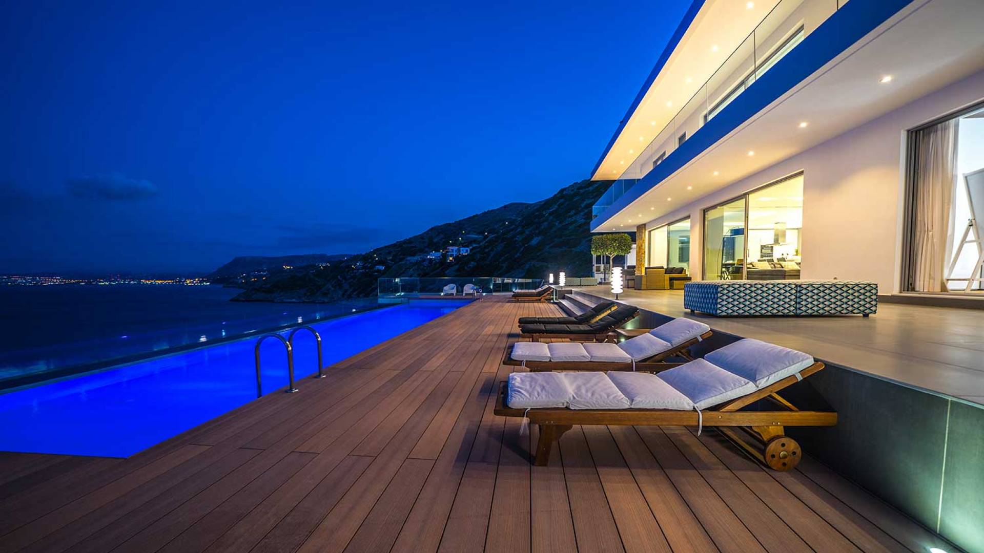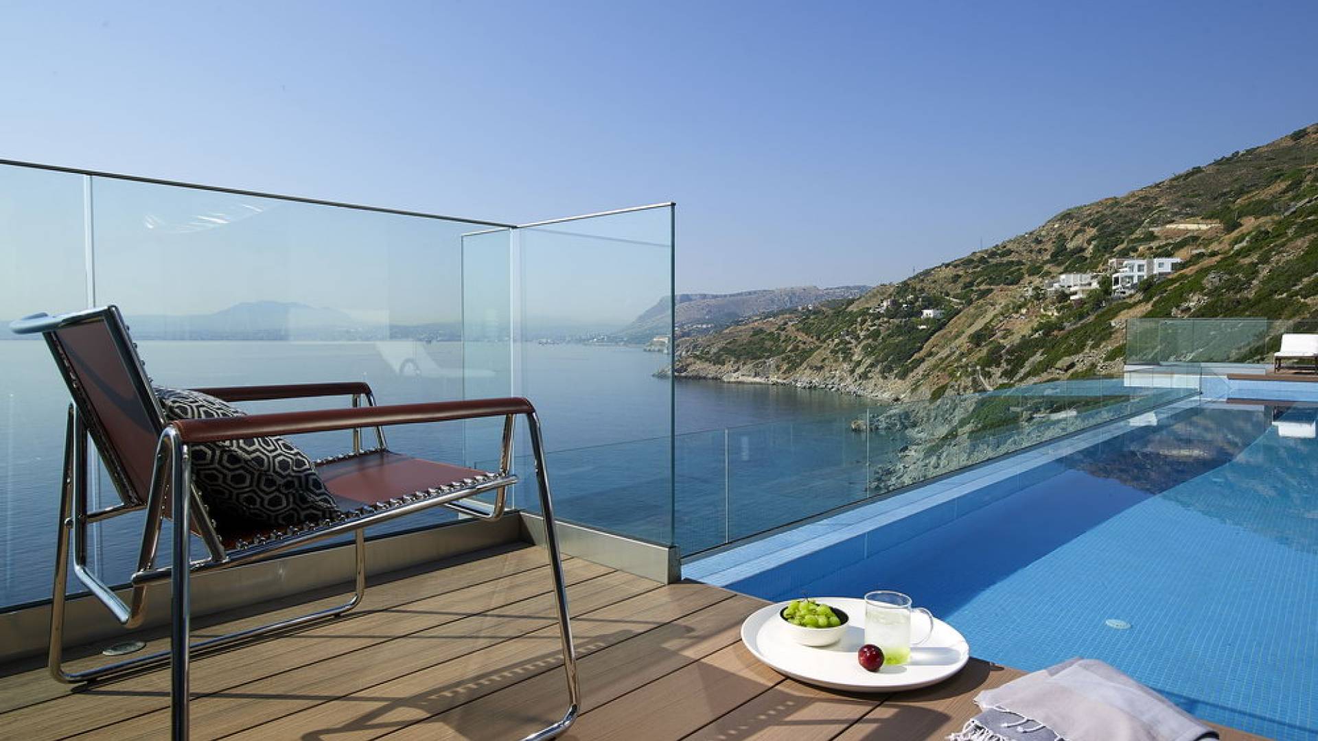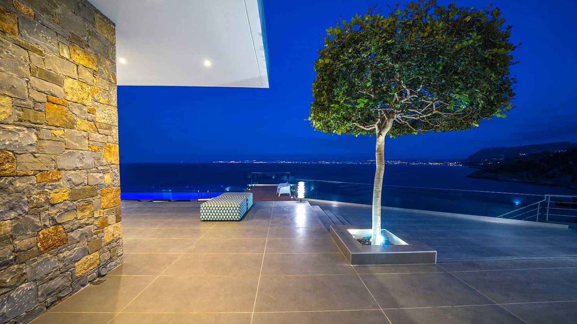 All'aperto: dal piano terra, si accede all'area esterna con una piscina a sfioro di 17 metri, una terrazza privata parzialmente coperta con un'area salotto, una terrazza della piscina con lettini prendisole e uno spazio per rilassarsi all'ombra, barbecue con un forno in pietra e un tavolo che può ospitare fino a 8 persone. Per sedersi è disponibile anche una panca in pietra a parete, accanto al forno, con comodi cuscini. Accanto alla piscina a sfioro, c'è un sentiero privato che conduce alle acque turchesi del mare di Creta, situato a soli 25 m di distanza.