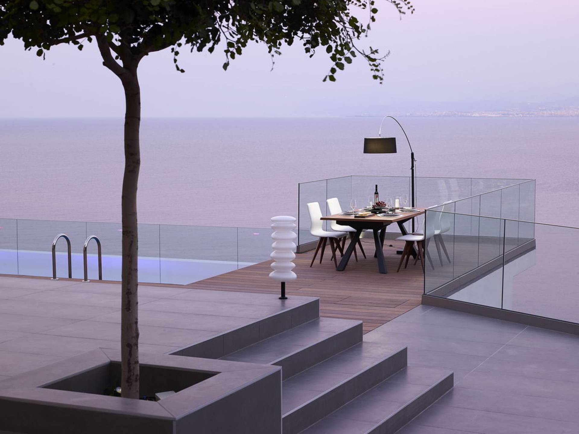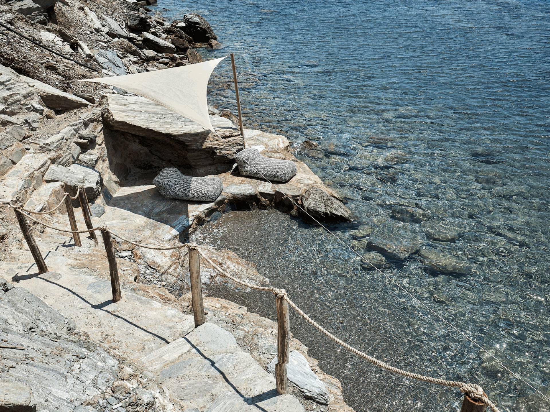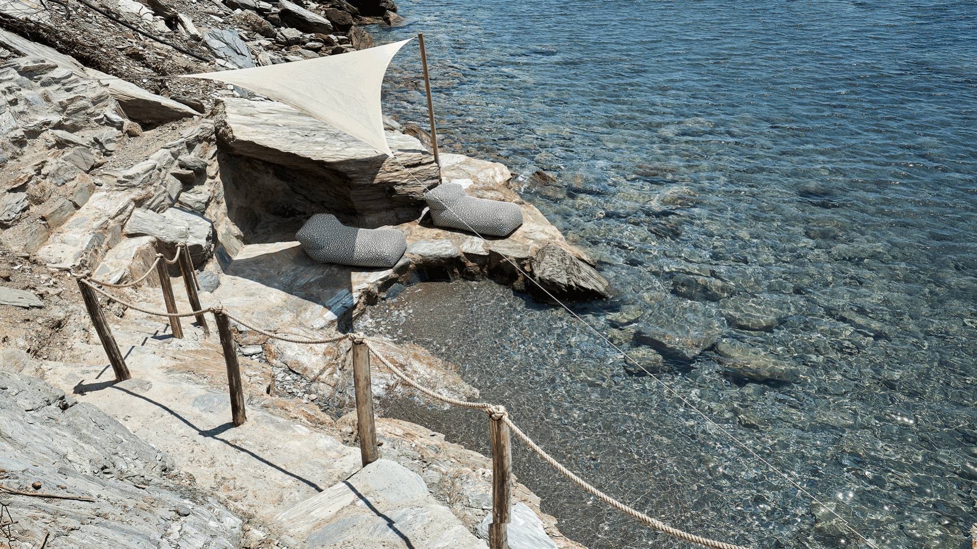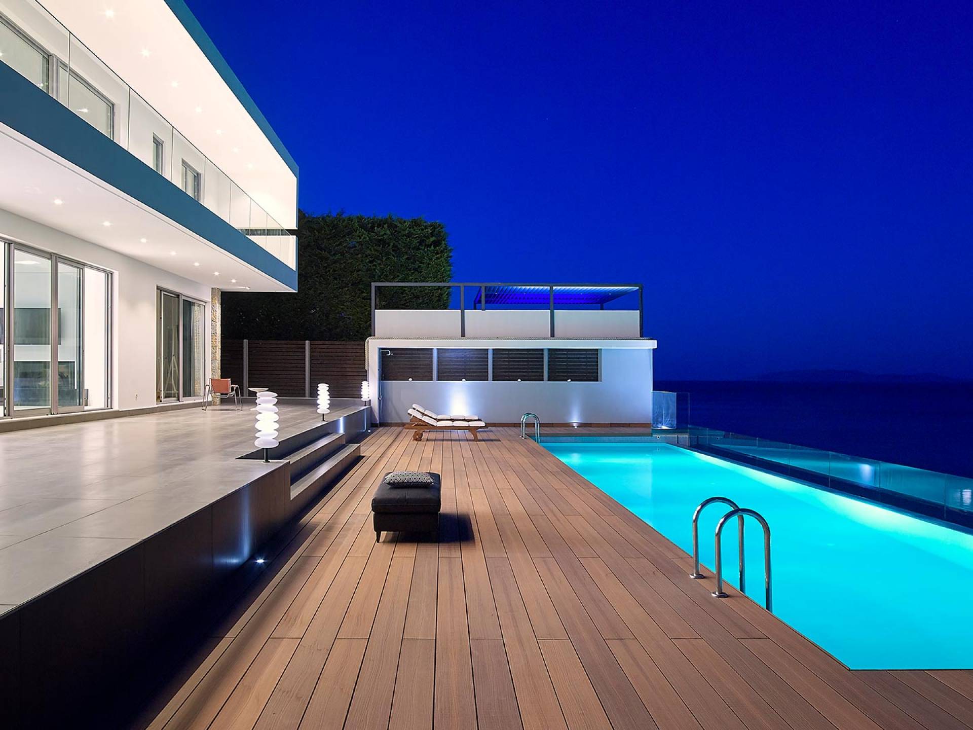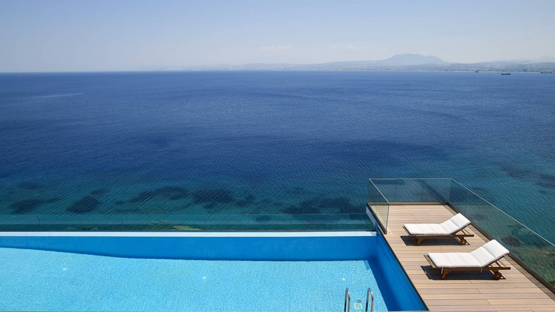 All'aperto: dal piano terra, si accede all'area esterna con una piscina a sfioro di 17 metri, una terrazza privata parzialmente coperta con un'area salotto, una terrazza della piscina con lettini prendisole e uno spazio per rilassarsi all'ombra, barbecue con un forno in pietra e un tavolo che può ospitare fino a 8 persone. Per sedersi è disponibile anche una panca in pietra a parete, accanto al forno, con comodi cuscini. Accanto alla piscina a sfioro, c'è un sentiero privato che conduce alle acque turchesi del mare di Creta, situato a soli 25 m di distanza.