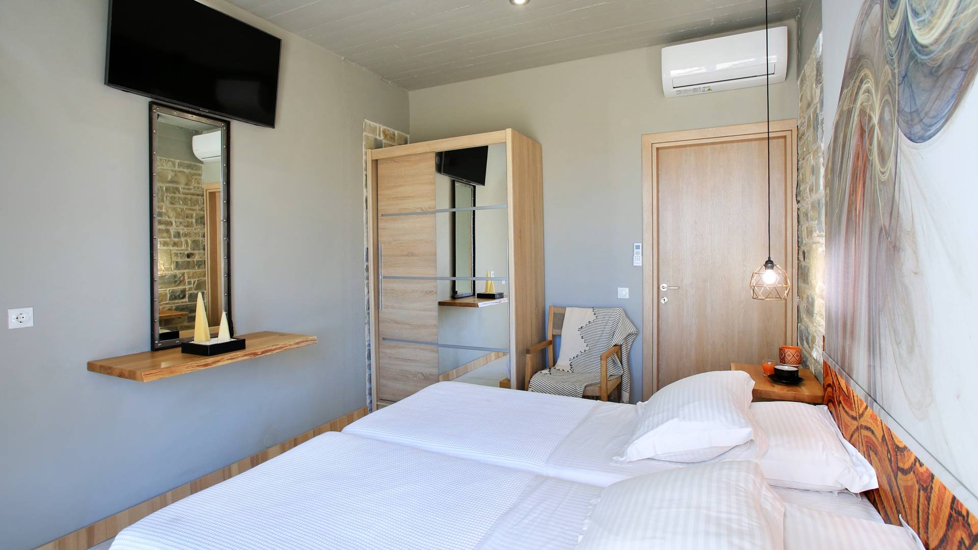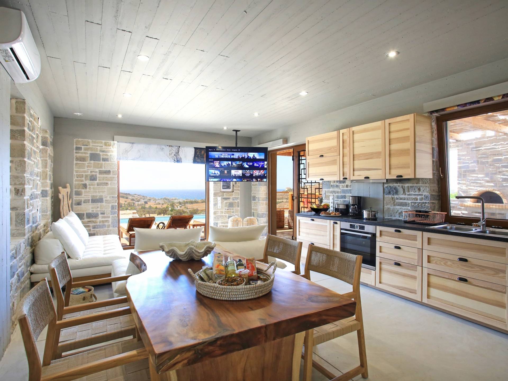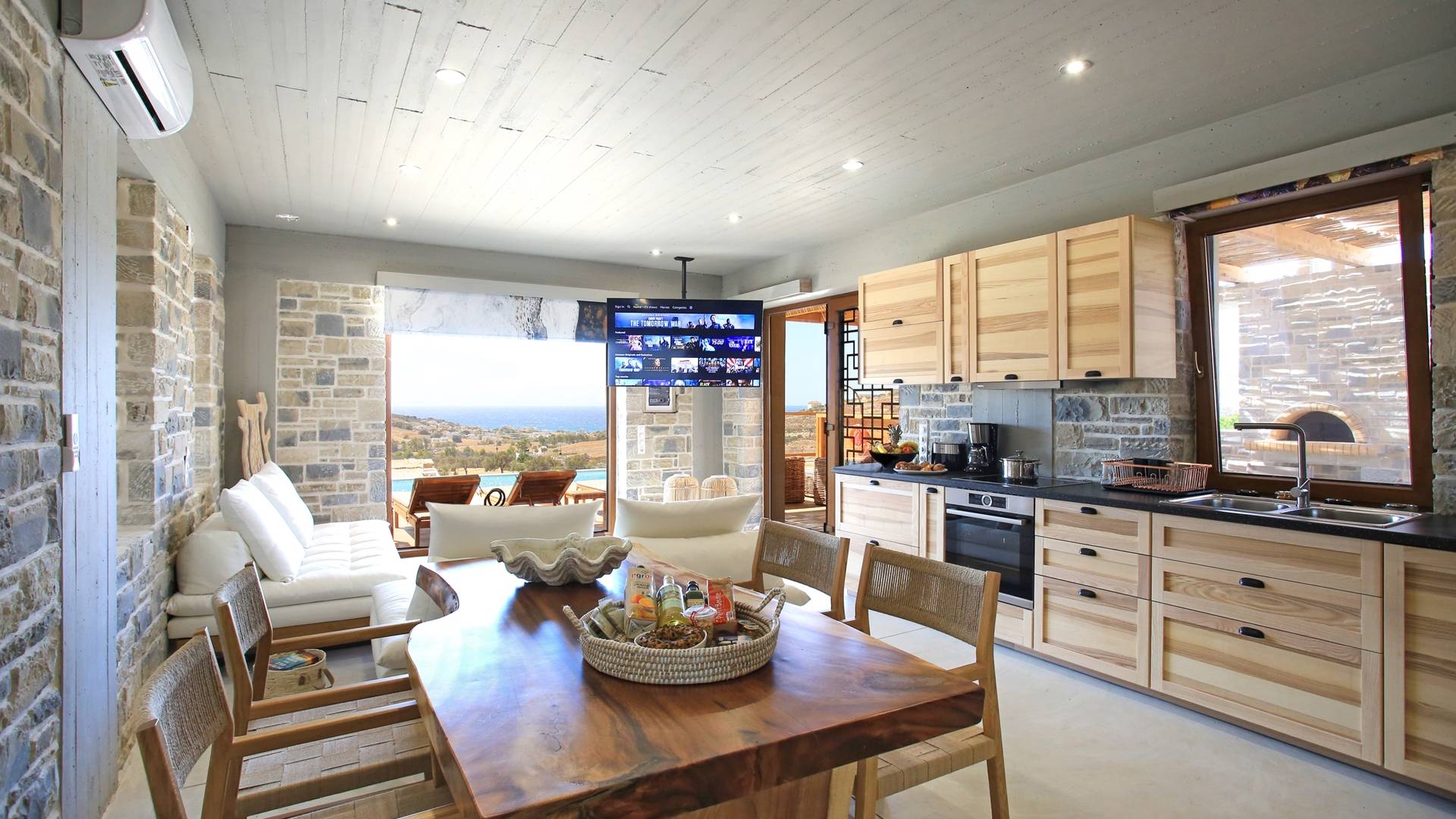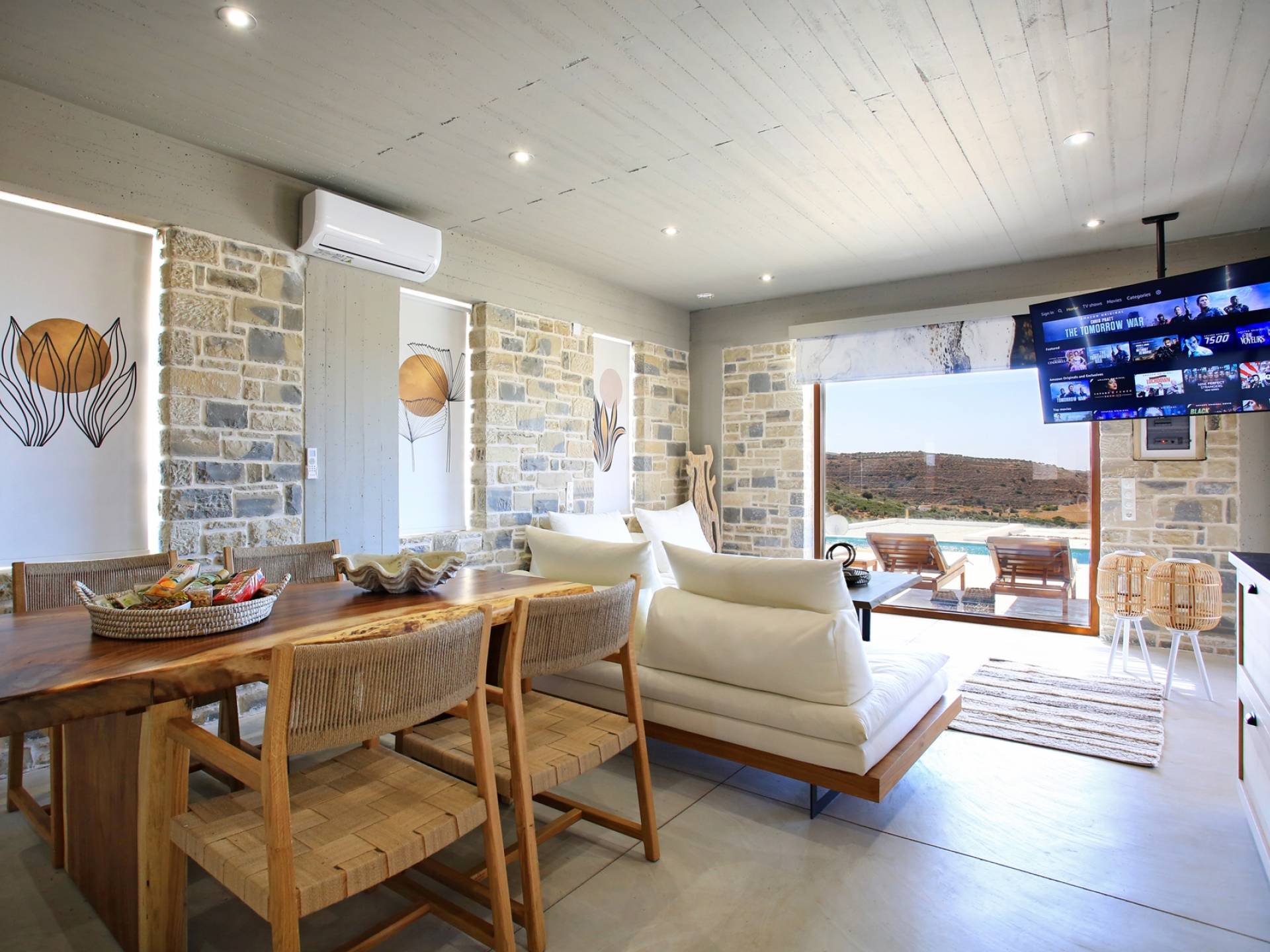 La villa si compone di tre livelli. Al piano terra si trova un open space con cucina attrezzata, sala da pranzo per 6 persone, ampio soggiorno, ulteriore zona giorno con divano trasformabile in letto matrimoniale e divisorio scorrevole che lo rende indipendente dal resto, e un comodo bagno con doccia. Al primo piano ci sono 2 camere da letto, ciascuna con letto matrimoniale e bagno privato con doccia. Entrambe le camere hanno accesso a un balcone privato con area salotto con vista sul castello veneziano di Spinalonga e sulle acque della baia di Mirabello, con la camera matrimoniale dotata anche di vasca idromassaggio privata.