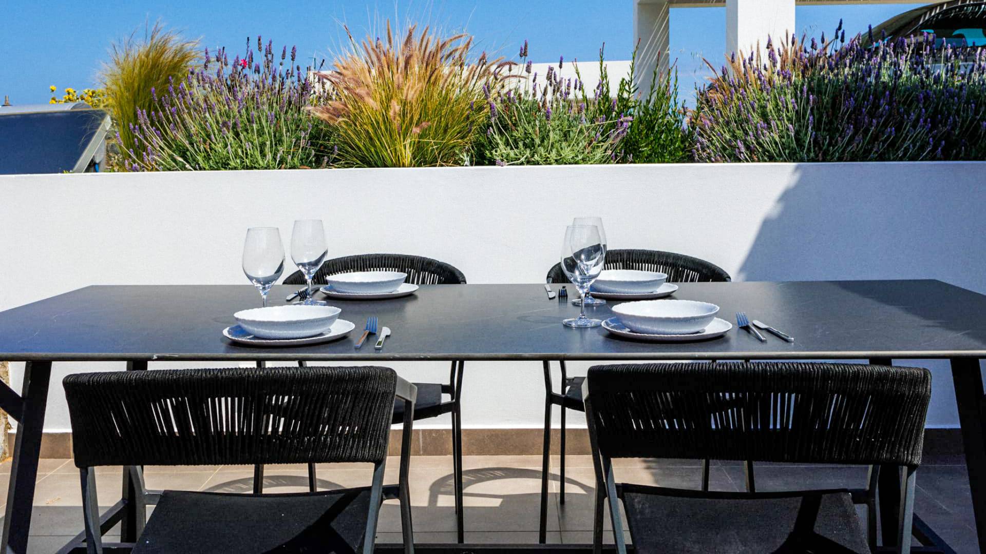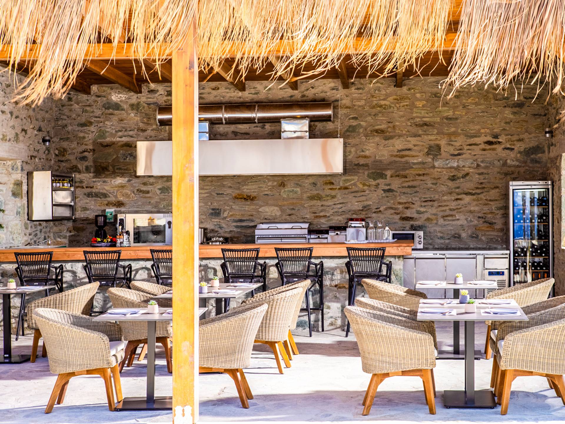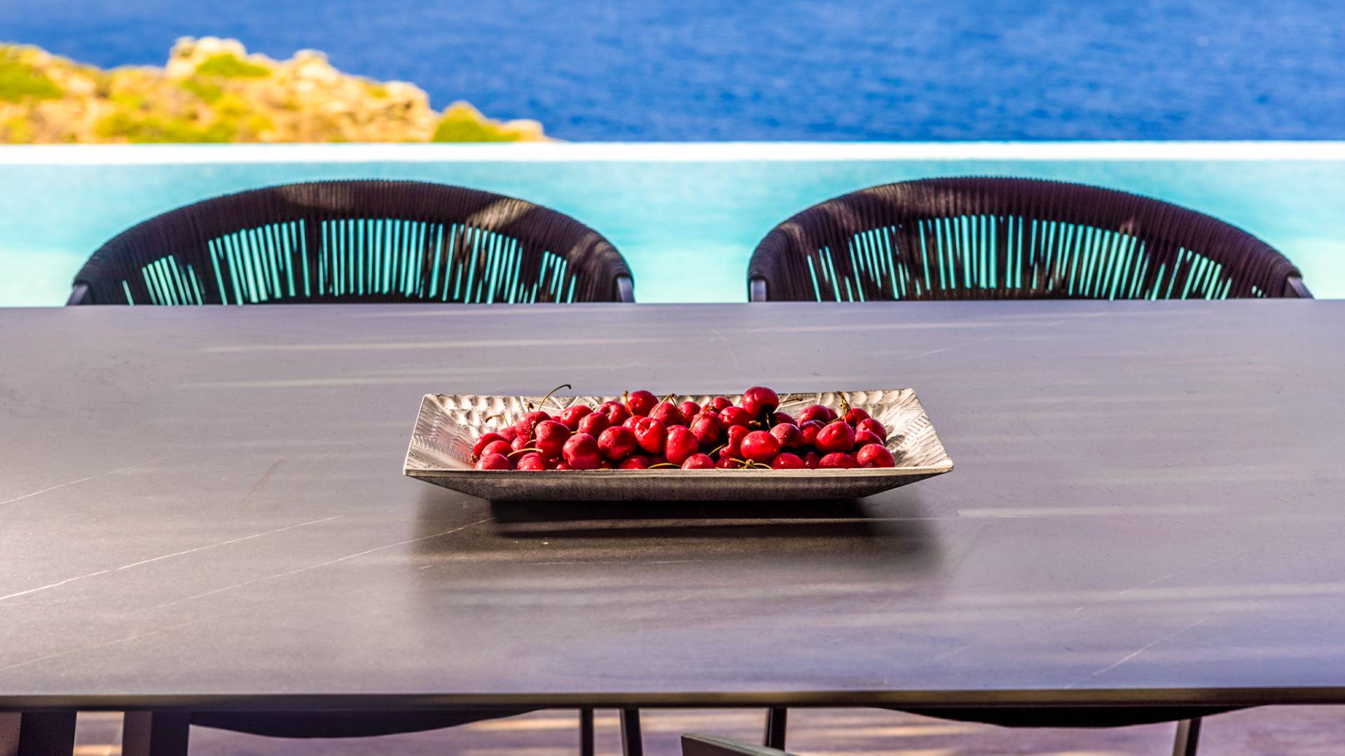 The shared taverna is a beautifully designed gathering space, ideal for special celebrations, private events, and memorable family meals. Set on a spacious terrace with picturesque panoramic views, it can comfortably accommodate up to 50 guests. The area features a fully equipped kitchen with a grill, available for guest use, professional catering services, or a private chef - offering complete flexibility for any occasion.