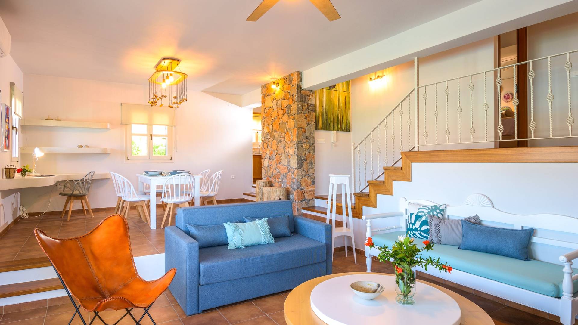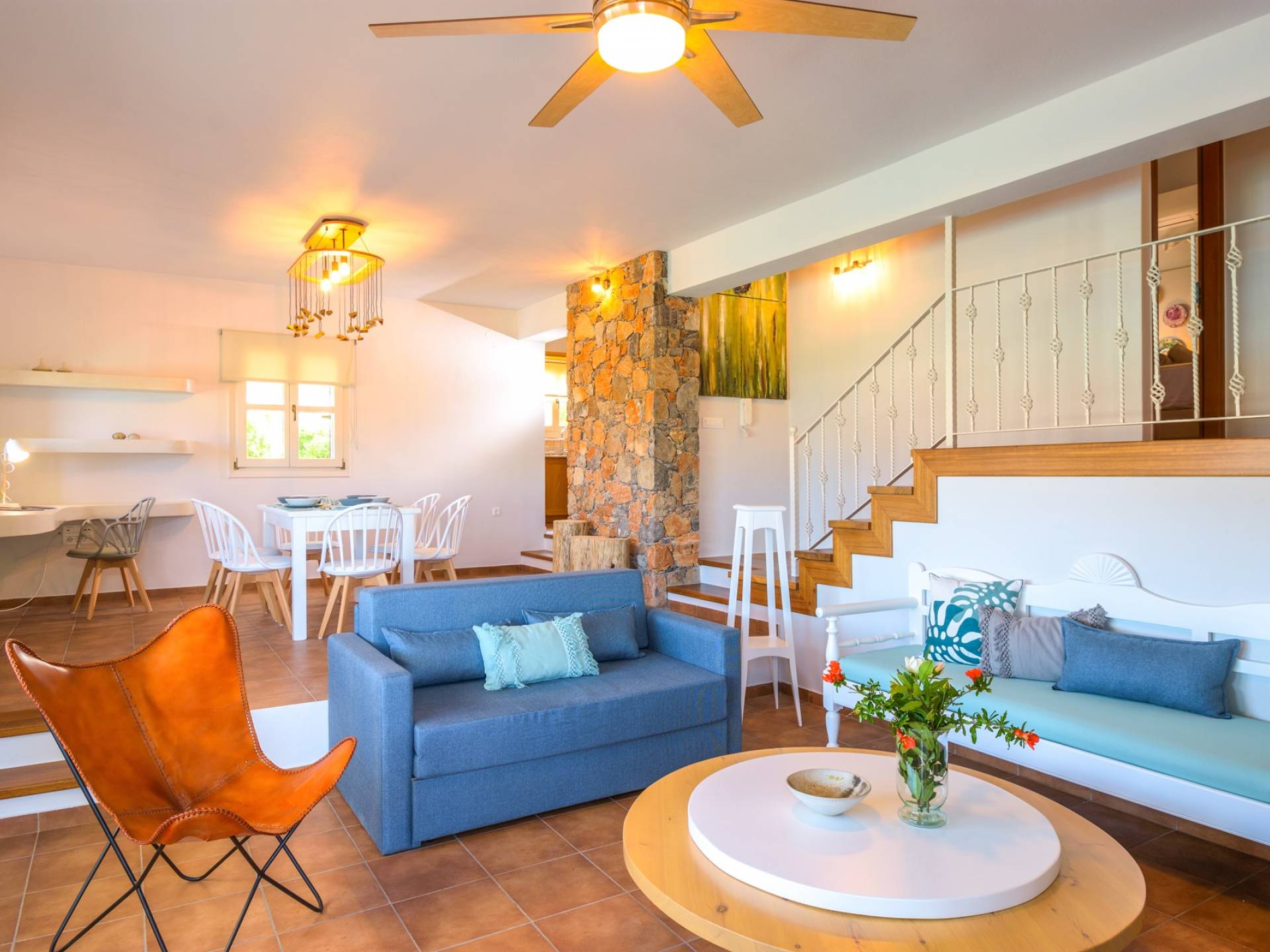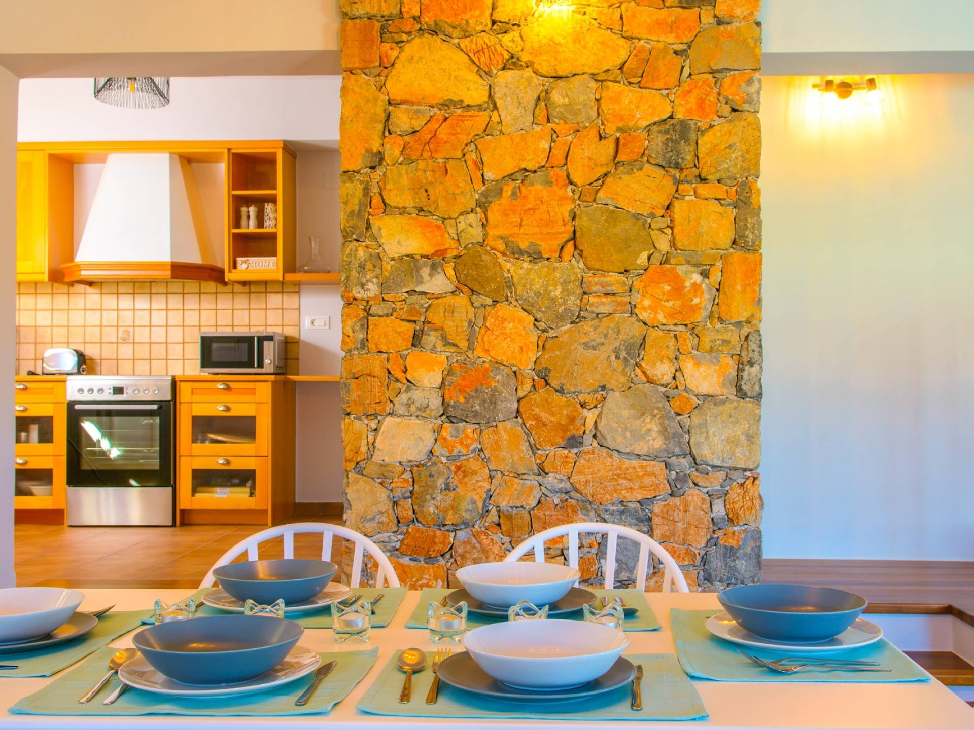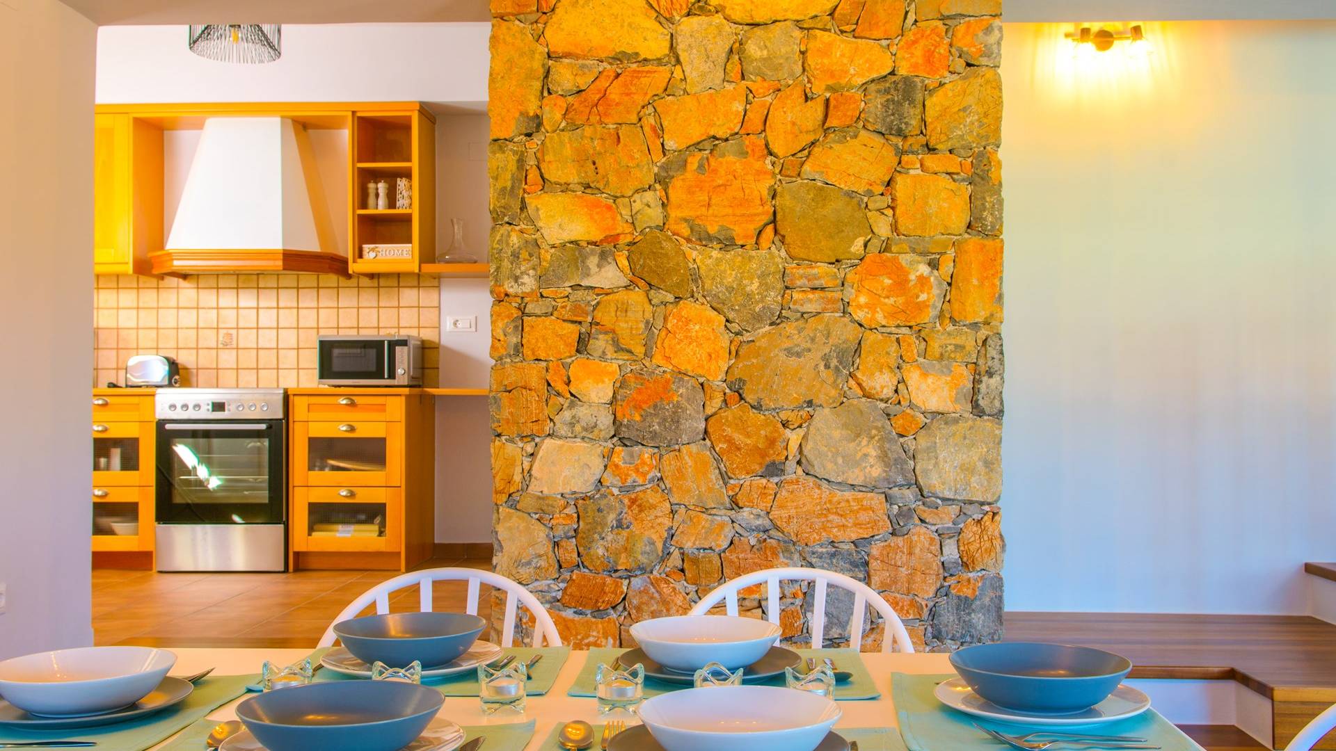 L'interno della residenza comprende una cucina completamente attrezzata con elettrodomestici inox, una sala da pranzo, un soggiorno con camino e una smart TV con tastiera, tre camere da letto e due bagni. C'è una connessione internet di alto livello sia all'interno che all'esterno della residenza. La decorazione, i mobili, i cosmetici e la biancheria sono stati scelti con cura nel rispetto della qualità e della bellezza in modo da soddisfare i gusti più sofisticati. Inoltre, sottolineano la loro identità locale.