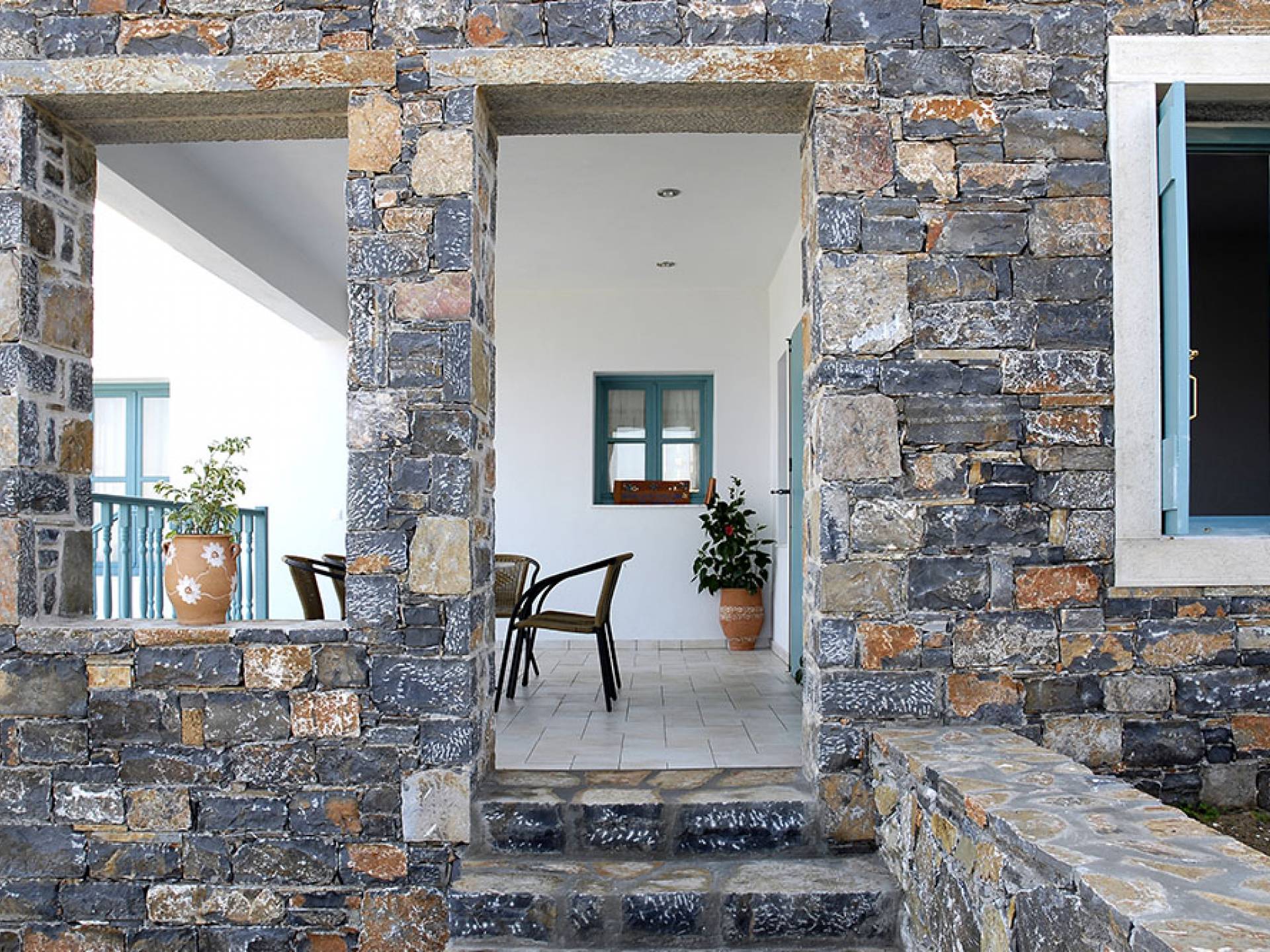 Quando passi lungo il corridoio lastricato ed entri nell'area della Calypso Villa Mochlos, racchiusa da muri in pietra e recinzioni verdi, ti senti completamente a casa. Qui puoi goderti momenti di pace e relax o momenti edificanti mentre rimugini sull'alto e spazioso balcone con la sua meravigliosa vista sulle montagne e sul mare.
