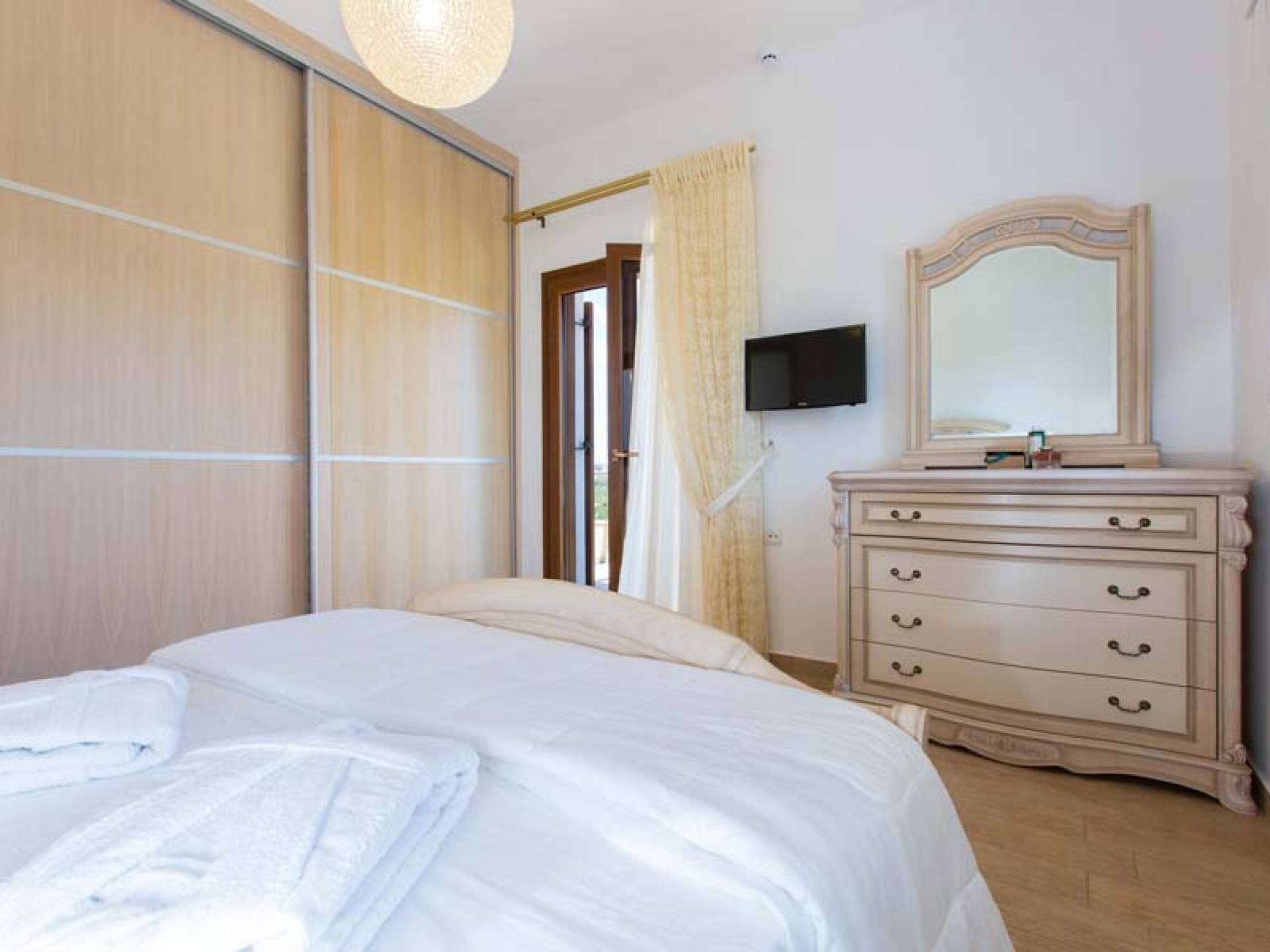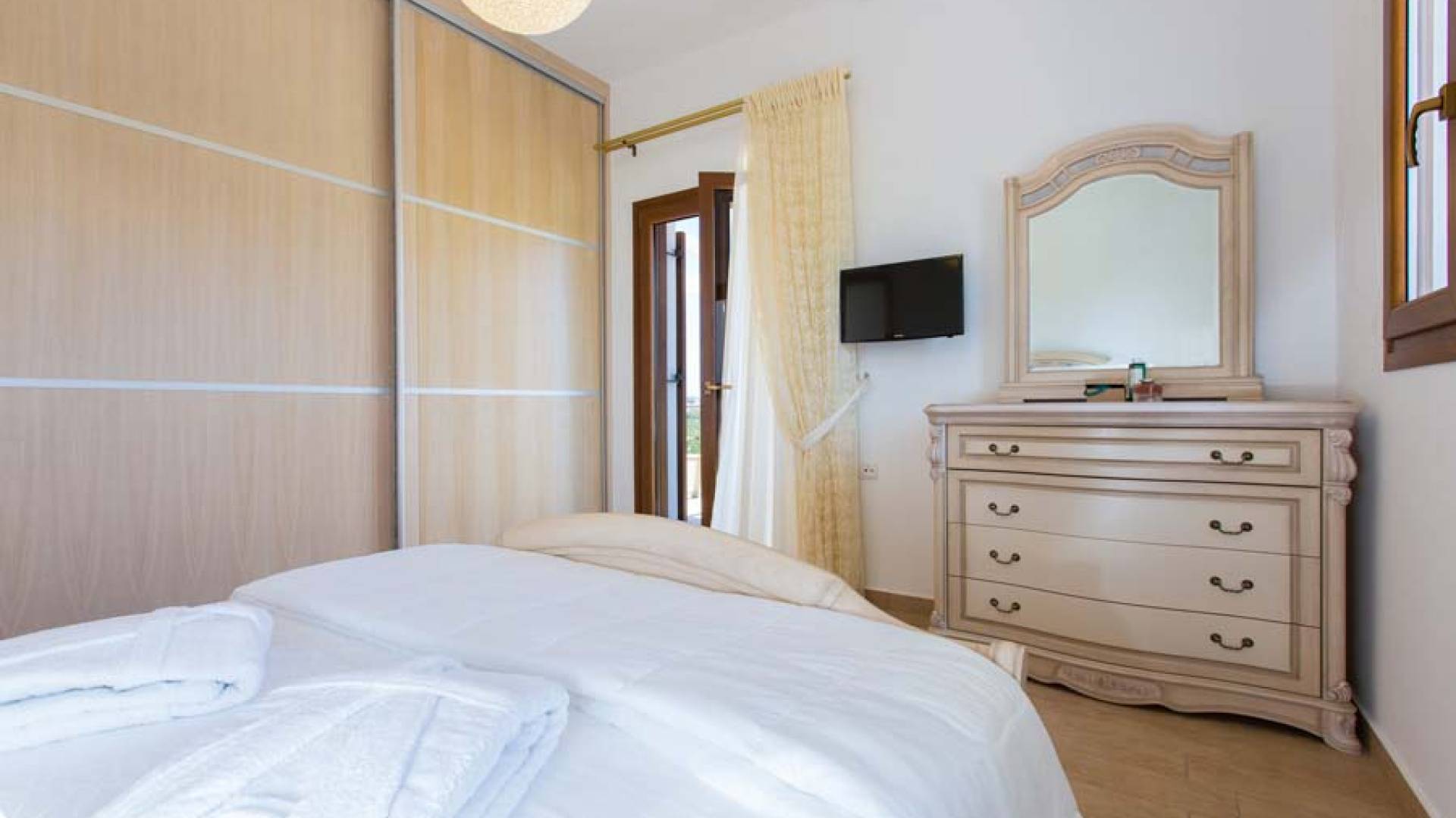 Primo piano: a questo livello si trovano le due restanti camere da letto, una delle quali dispone di un letto matrimoniale king-size (che può essere trasformato in due letti singoli, se lo si desidera) e l'altra un grande letto matrimoniale. Inoltre, su questo piano sono presenti un angolo cottura aggiuntivo con un piccolo frigorifero e un bagno con cabina doccia. Tutte le camere hanno un piccolo boudoir, comodini e un armadio. Sono tutte climatizzate e dotate di TV a schermo piatto con ricezione satellitare e offrono accesso diretto alle verande.