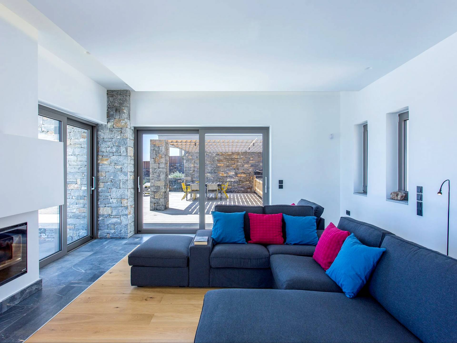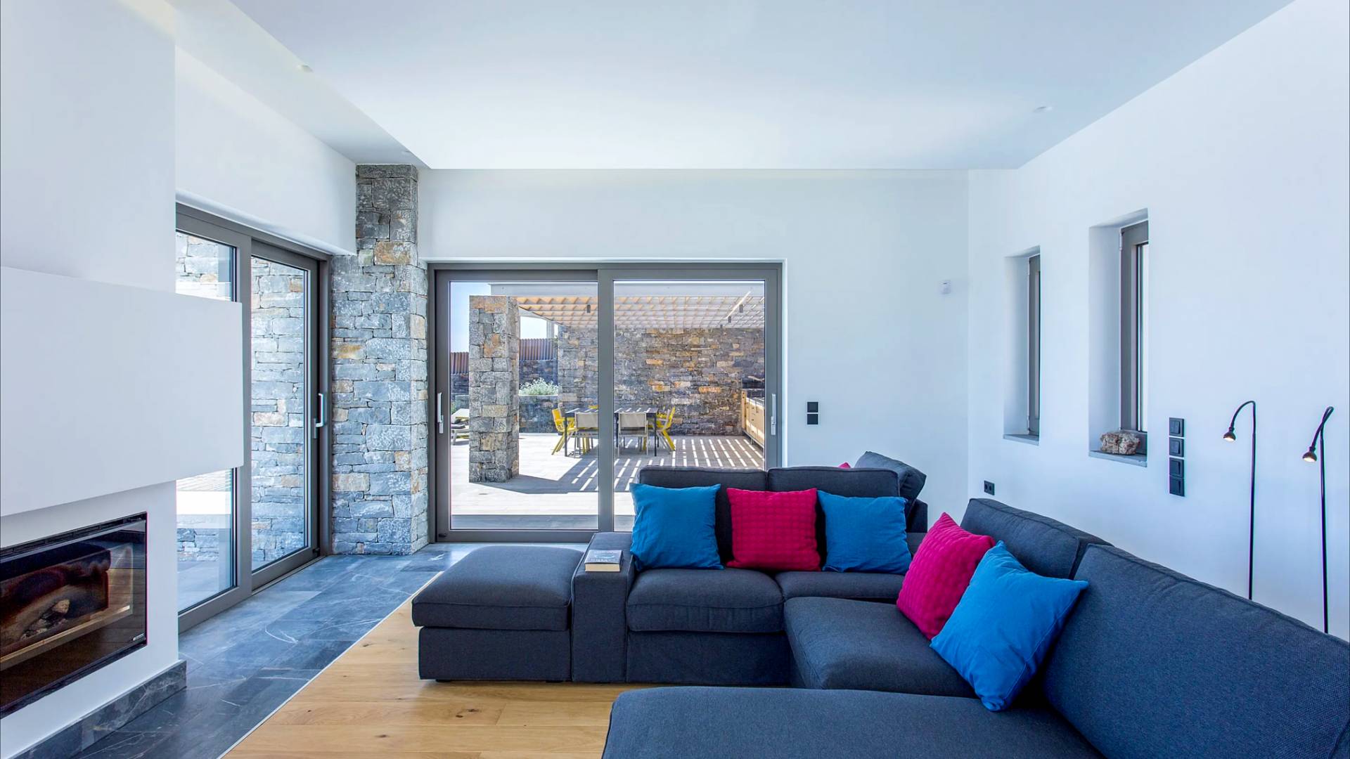 - soggiorno a pianta aperta con accogliente camino e viste sul mare