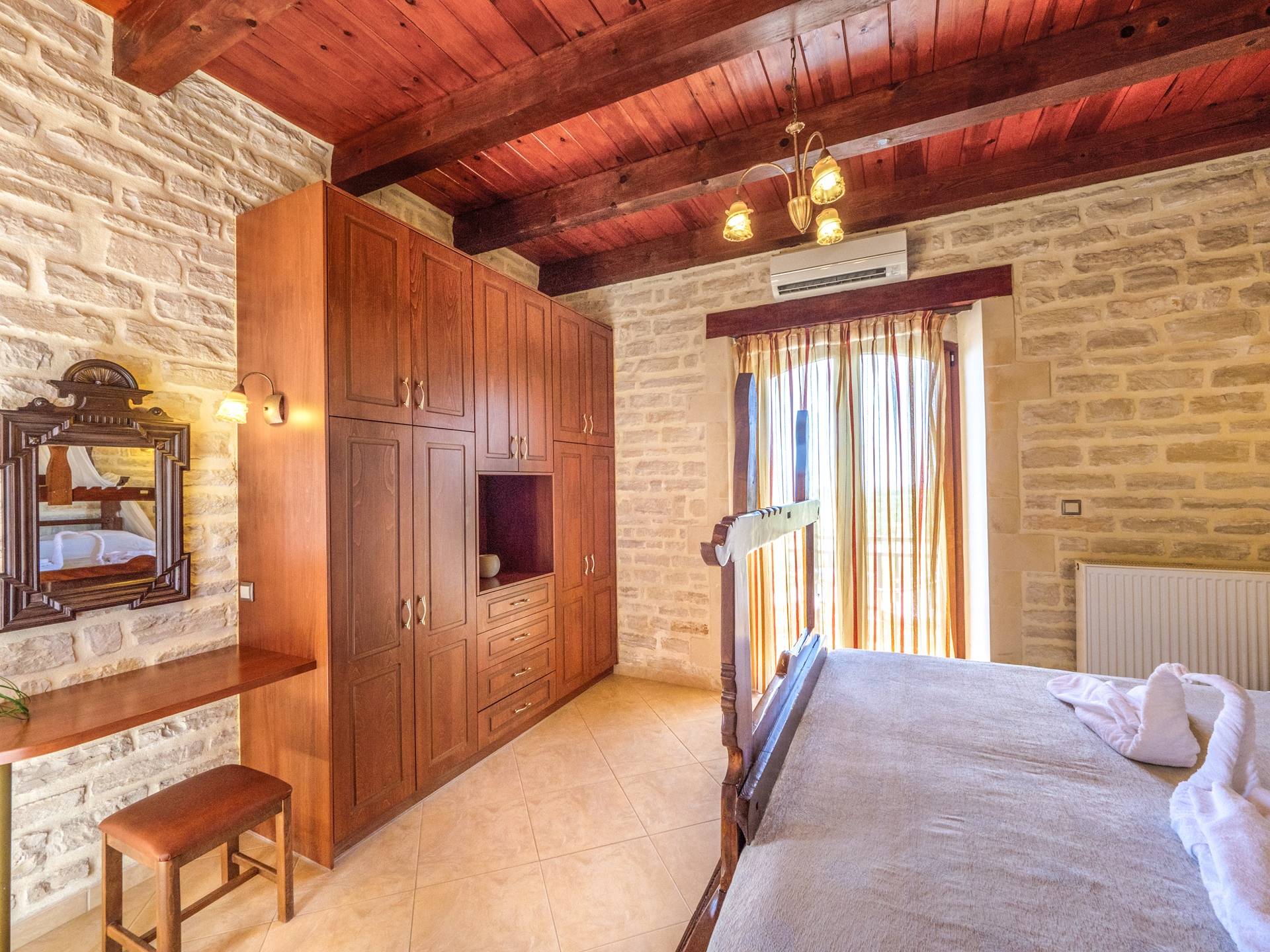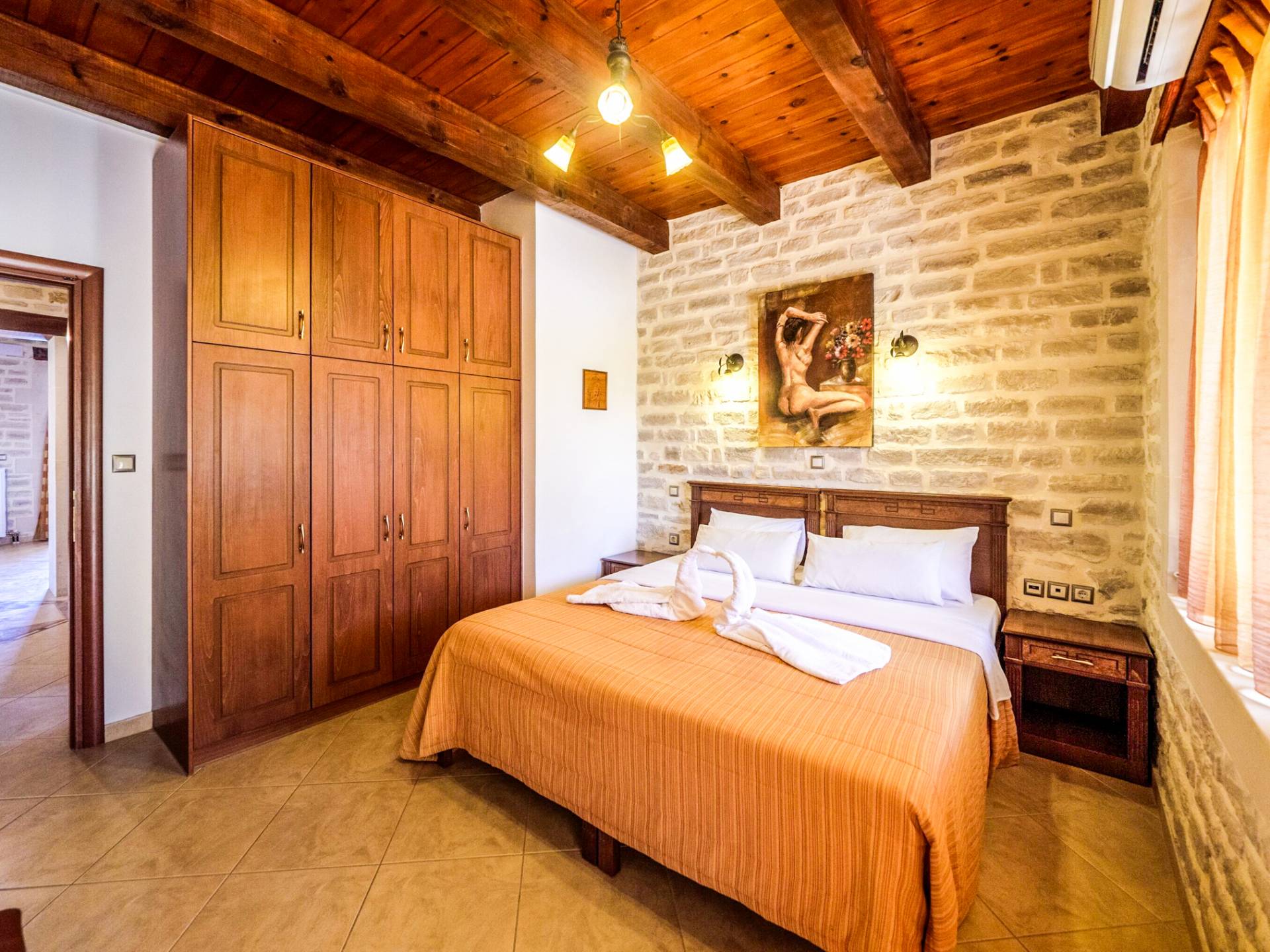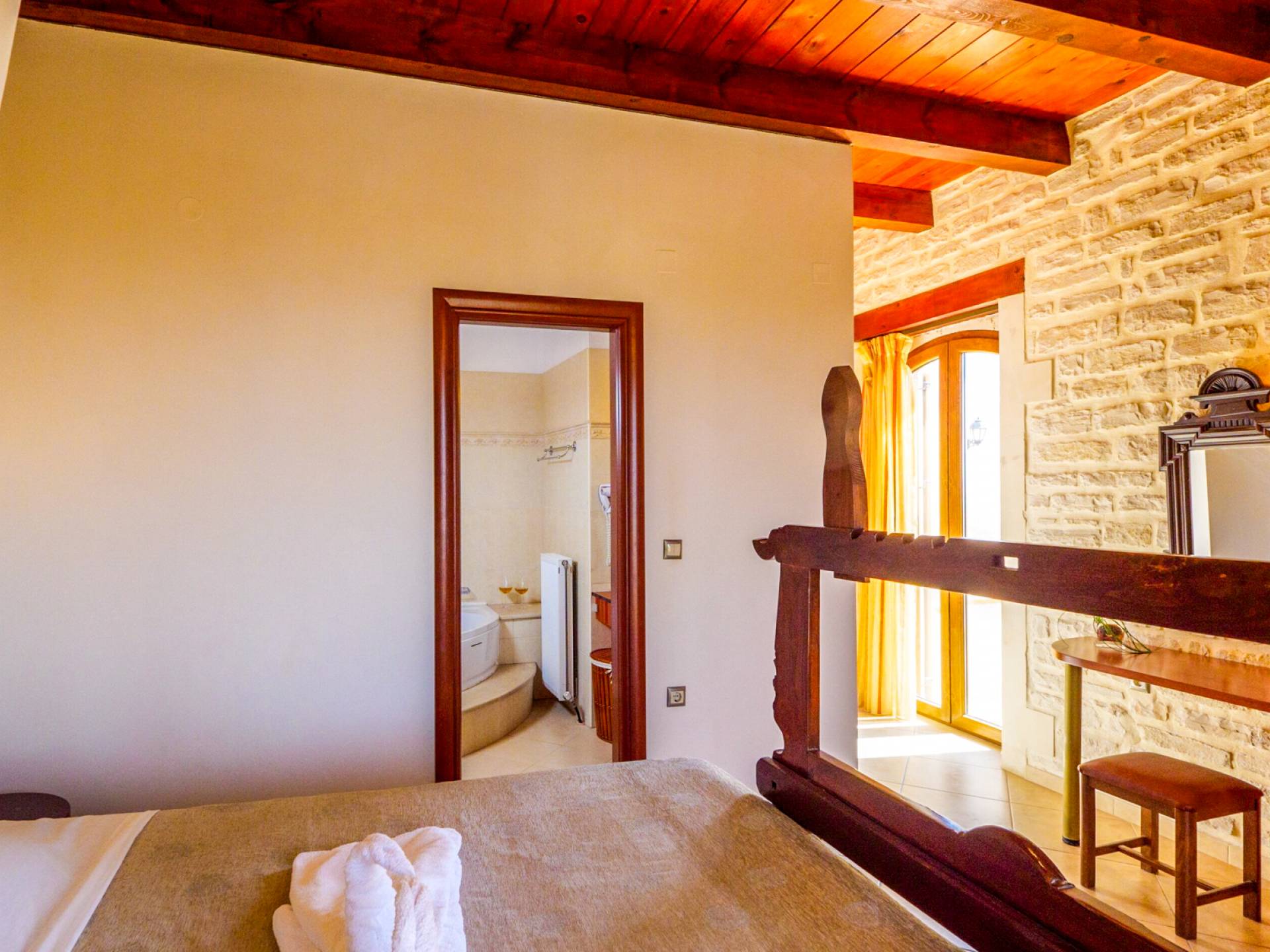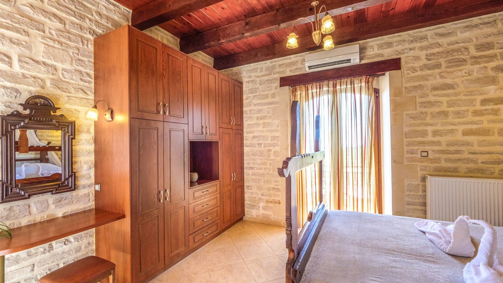 La camera da letto principale ha un letto matrimoniale e bagno/WC privato con vasca idromassaggio, le altre due hanno letti gemelli. Su questo piano si trova un altro ampio bagno con lavatrice e vasca. Ogni camera ha un balcone con una splendida vista sul mare e sulle montagne e tutte sono dotate di aria condizionata. La villa dispone anche di un bellissimo tetto di 30 mq, da cui si può godere della magnifica vista sul mare, sulle montagne e sulla città di Rethymno e rilassarsi. Eros Villa Crete offre anche ferro/asse da stiro, asciugacapelli, cassaforte, parcheggio ed è circondata da numerosi uliveti, che danno una speciale impressione di tranquillità ad ogni visitatore.