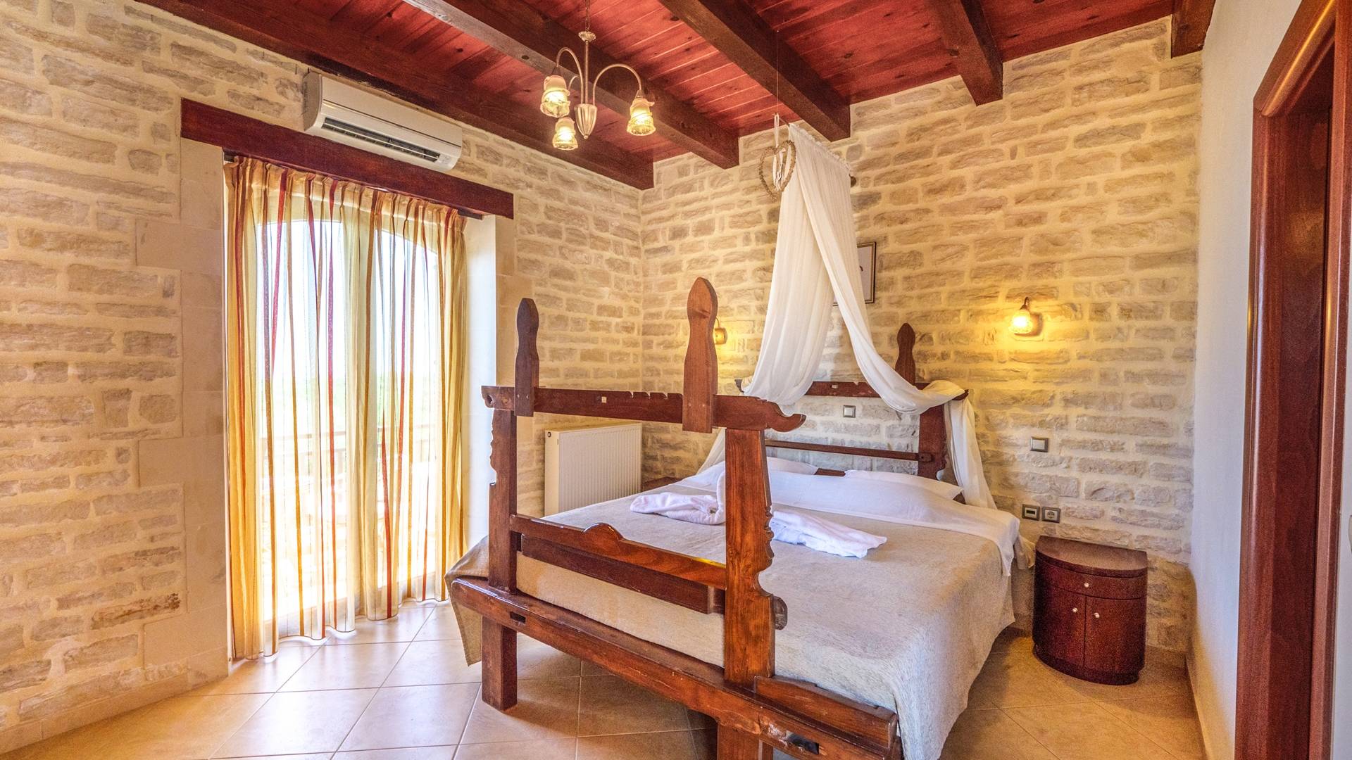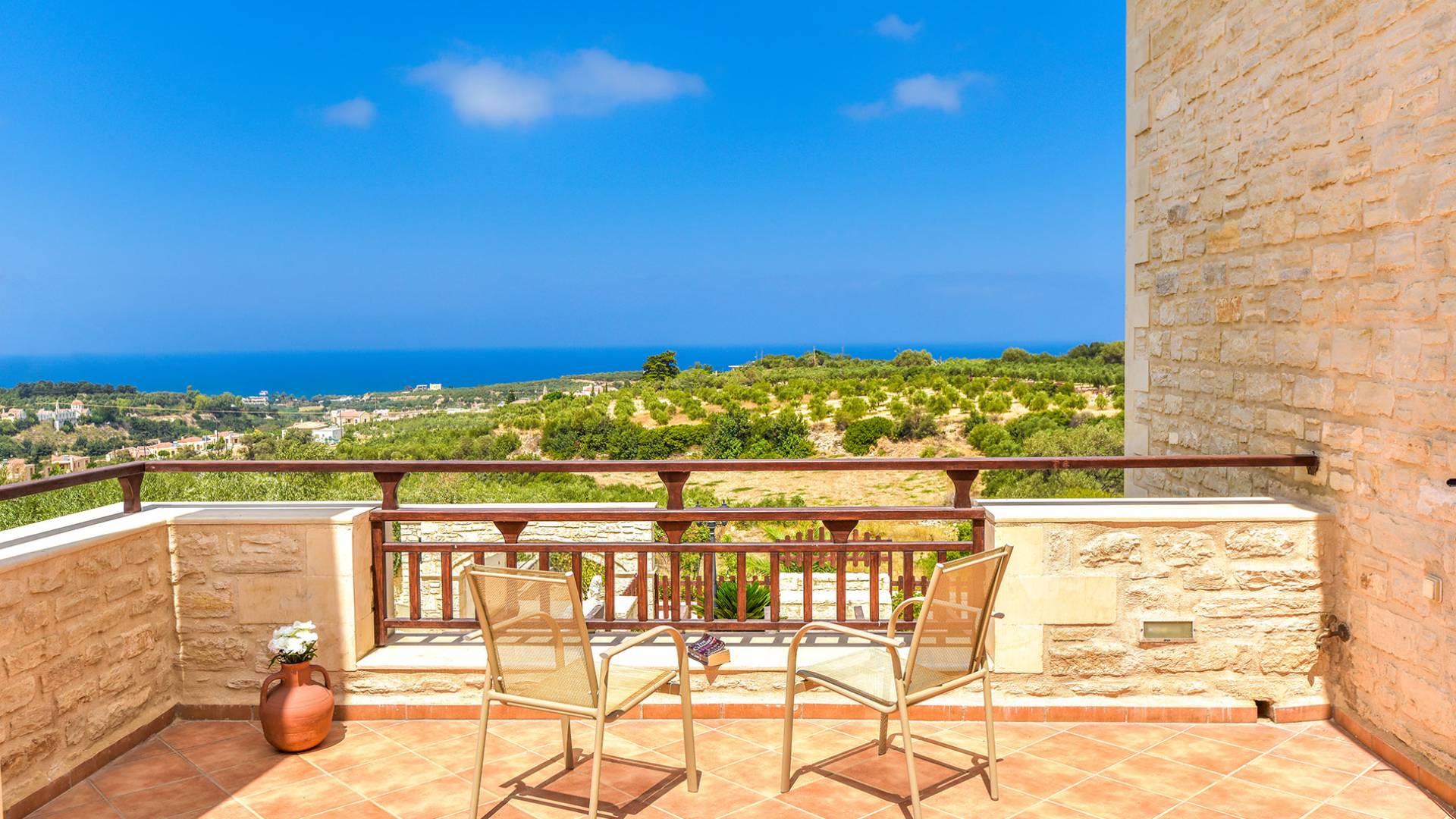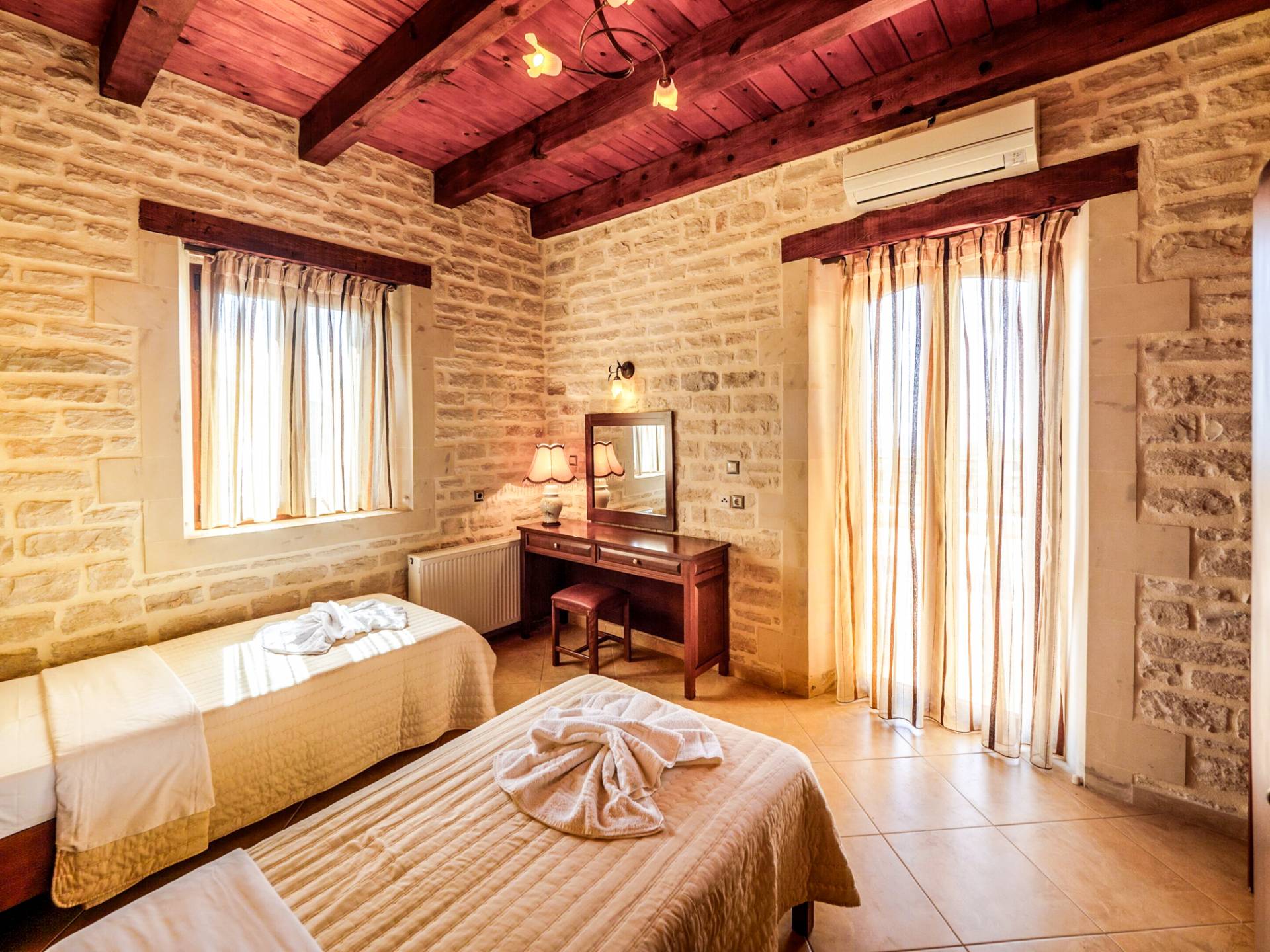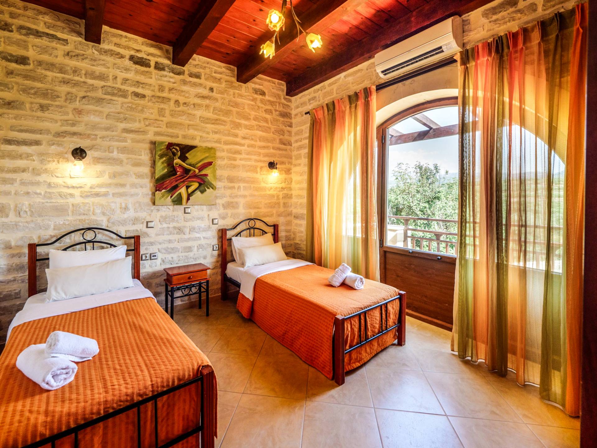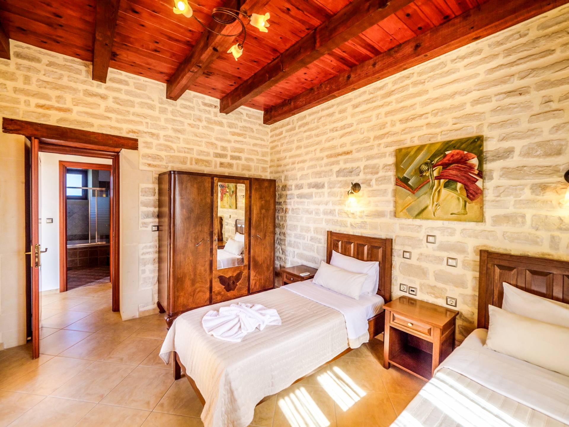 La camera da letto principale ha un letto matrimoniale e bagno/WC privato con vasca idromassaggio, le altre due hanno letti gemelli. Su questo piano si trova un altro ampio bagno con lavatrice e vasca. Ogni camera ha un balcone con una splendida vista sul mare e sulle montagne e tutte sono dotate di aria condizionata. La villa dispone anche di un bellissimo tetto di 30 mq, da cui si può godere della magnifica vista sul mare, sulle montagne e sulla città di Rethymno e rilassarsi. Eros Villa Crete offre anche ferro/asse da stiro, asciugacapelli, cassaforte, parcheggio ed è circondata da numerosi uliveti, che danno una speciale impressione di tranquillità ad ogni visitatore.