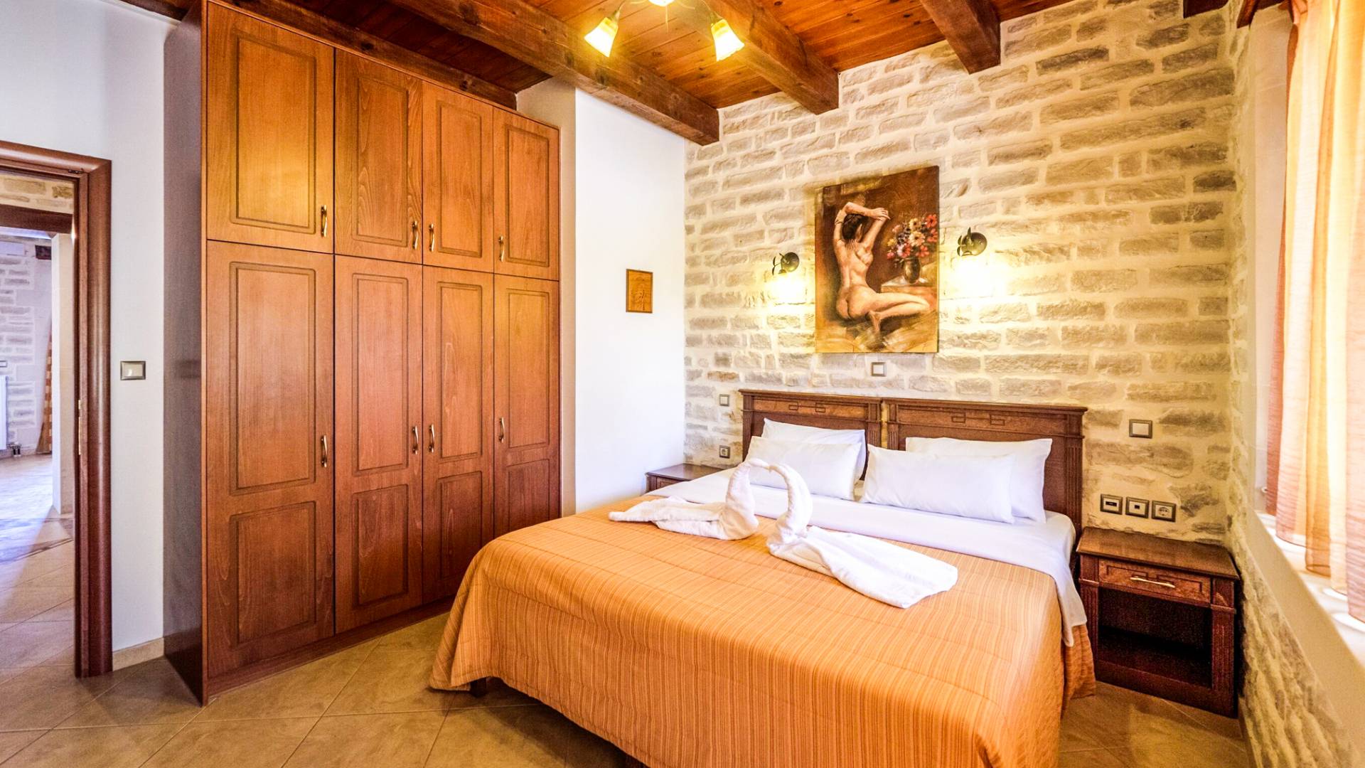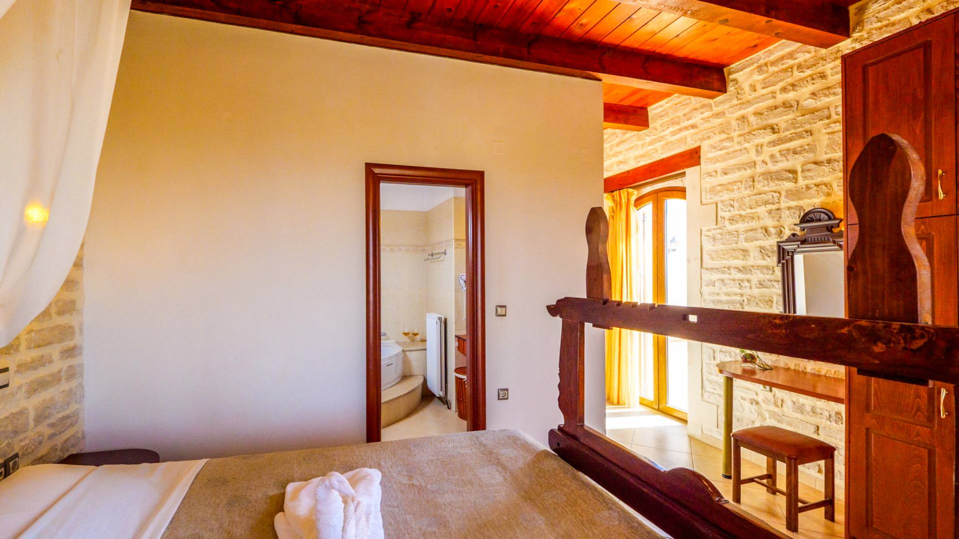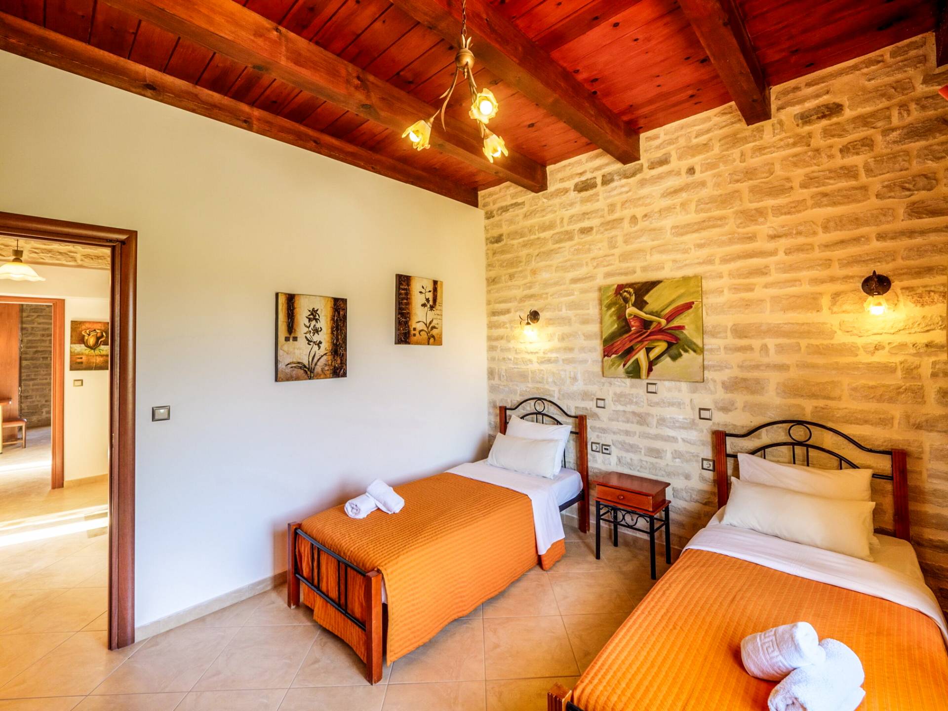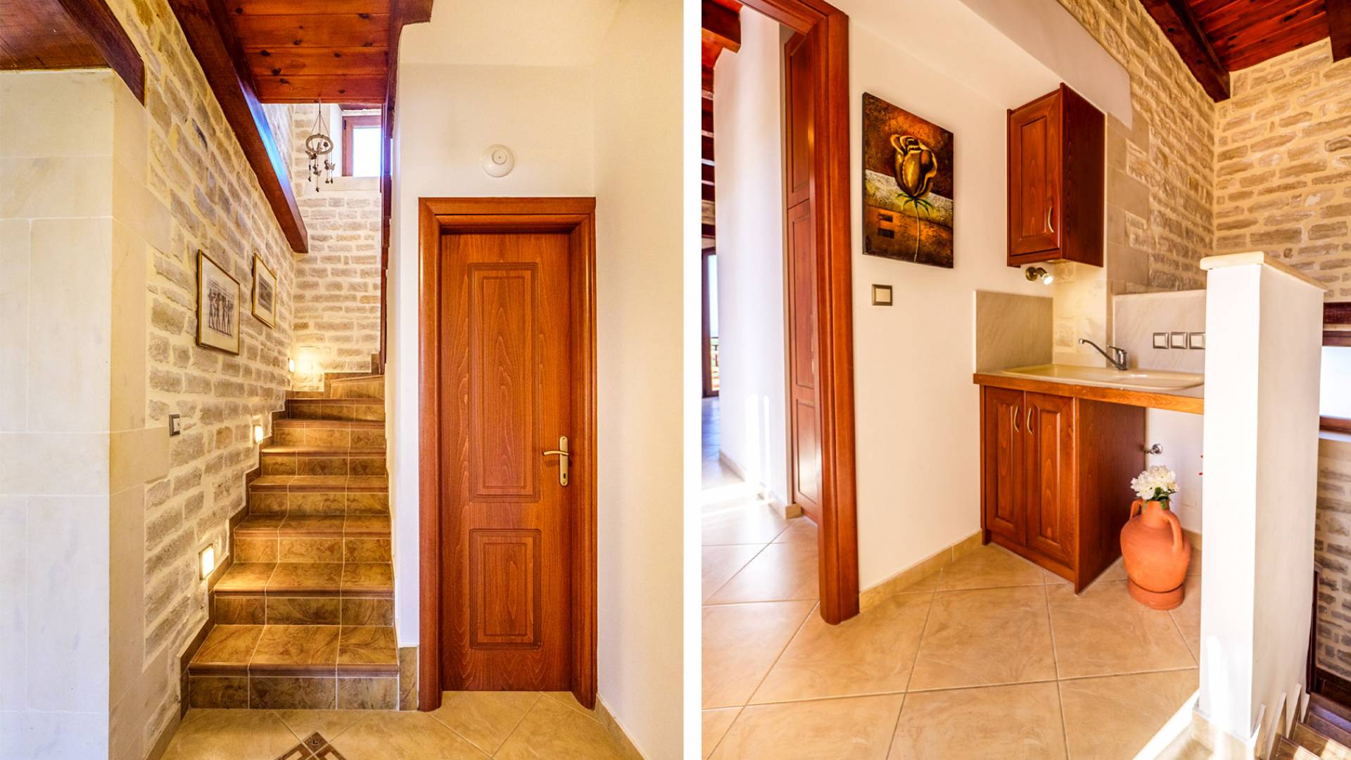 La camera da letto principale ha un letto matrimoniale e bagno/WC privato con vasca idromassaggio, le altre due hanno letti gemelli. Su questo piano si trova un altro ampio bagno con lavatrice e vasca. Ogni camera ha un balcone con una splendida vista sul mare e sulle montagne e tutte sono dotate di aria condizionata. La villa dispone anche di un bellissimo tetto di 30 mq, da cui si può godere della magnifica vista sul mare, sulle montagne e sulla città di Rethymno e rilassarsi. Eros Villa Crete offre anche ferro/asse da stiro, asciugacapelli, cassaforte, parcheggio ed è circondata da numerosi uliveti, che danno una speciale impressione di tranquillità ad ogni visitatore.