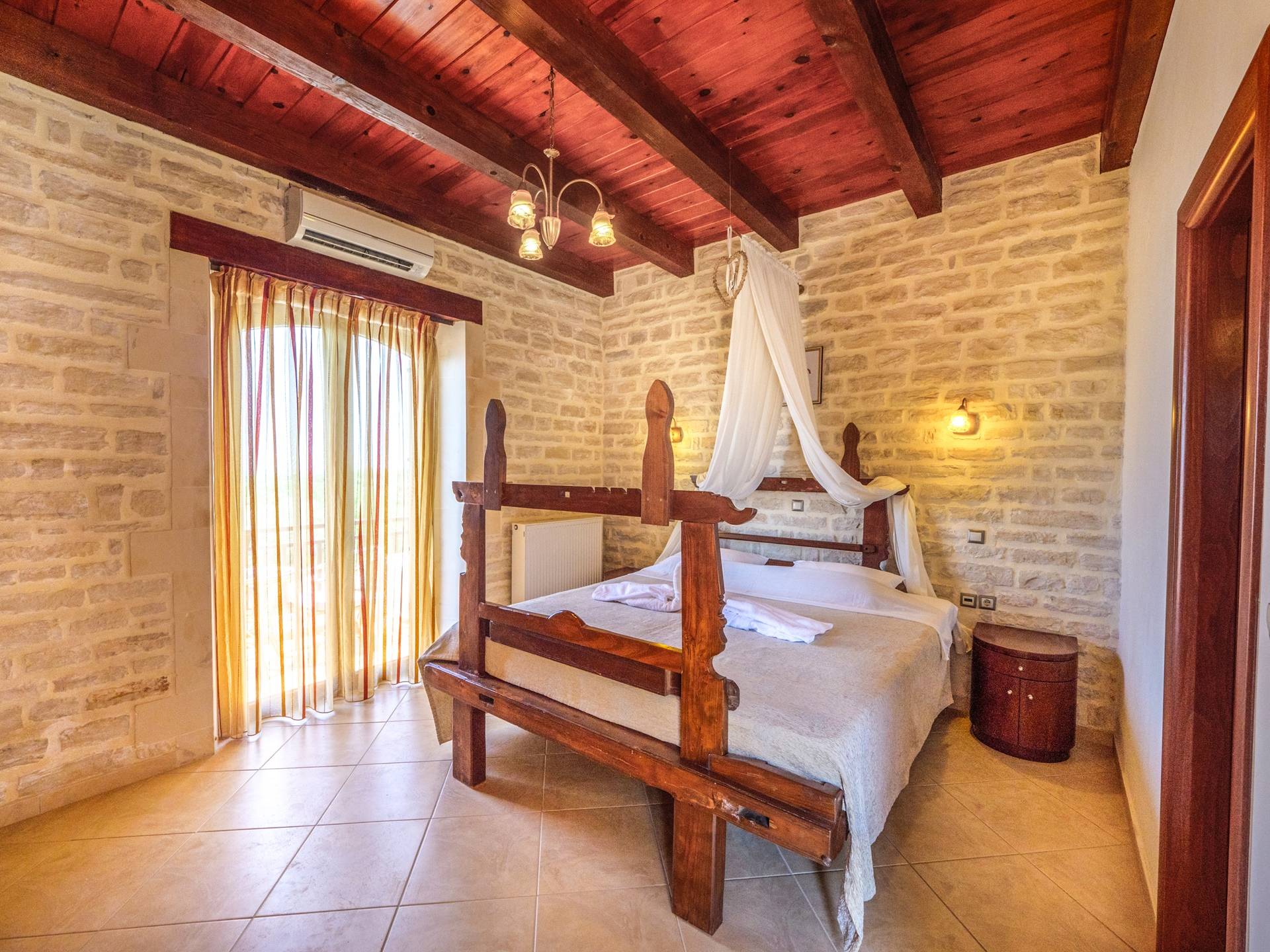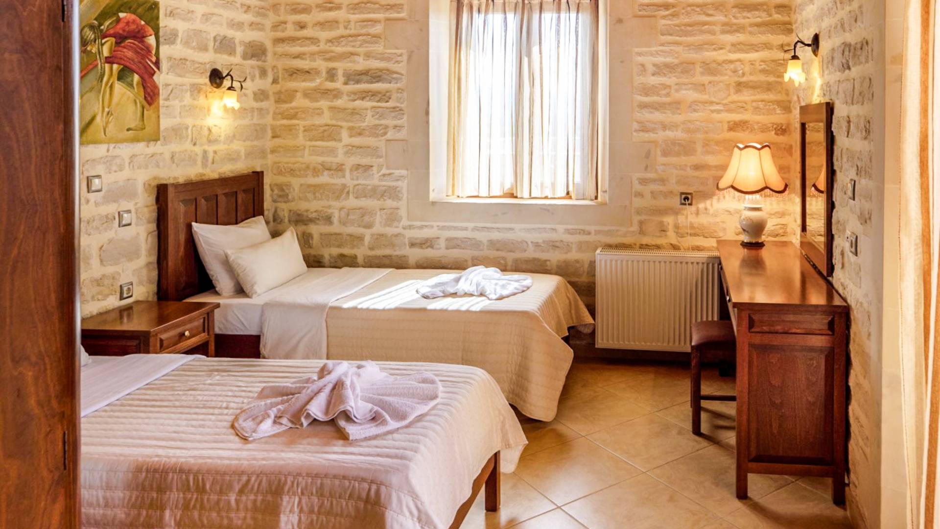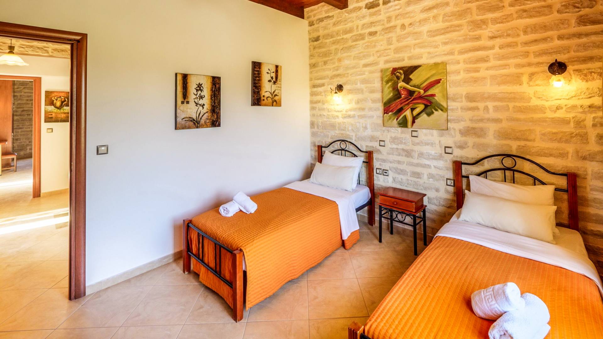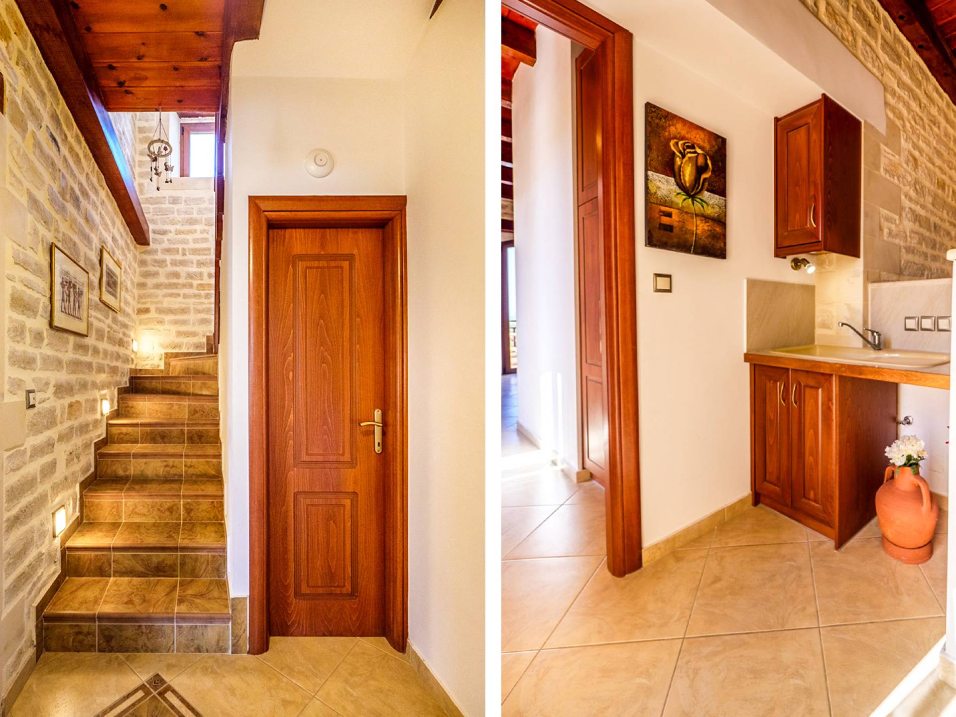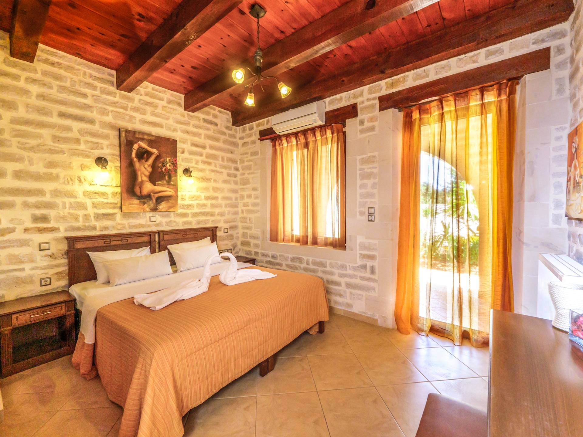 La camera da letto principale ha un letto matrimoniale e bagno/WC privato con vasca idromassaggio, le altre due hanno letti gemelli. Su questo piano si trova un altro ampio bagno con lavatrice e vasca. Ogni camera ha un balcone con una splendida vista sul mare e sulle montagne e tutte sono dotate di aria condizionata. La villa dispone anche di un bellissimo tetto di 30 mq, da cui si può godere della magnifica vista sul mare, sulle montagne e sulla città di Rethymno e rilassarsi. Eros Villa Crete offre anche ferro/asse da stiro, asciugacapelli, cassaforte, parcheggio ed è circondata da numerosi uliveti, che danno una speciale impressione di tranquillità ad ogni visitatore.