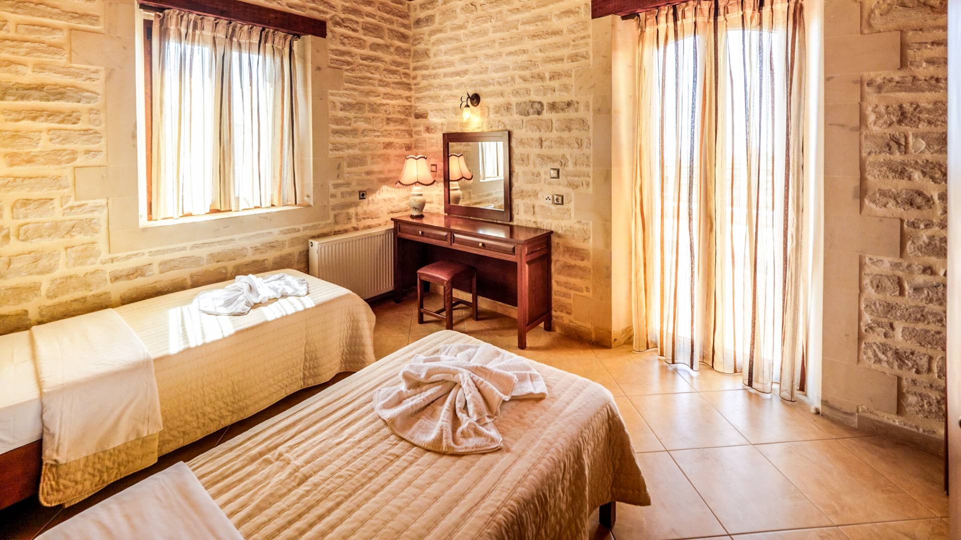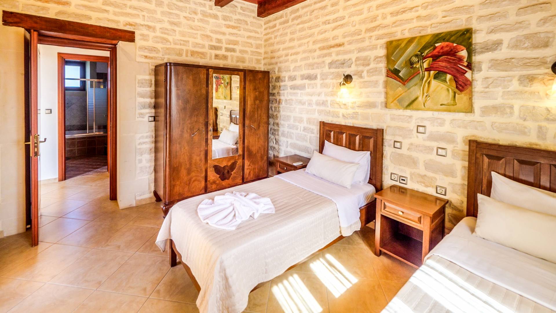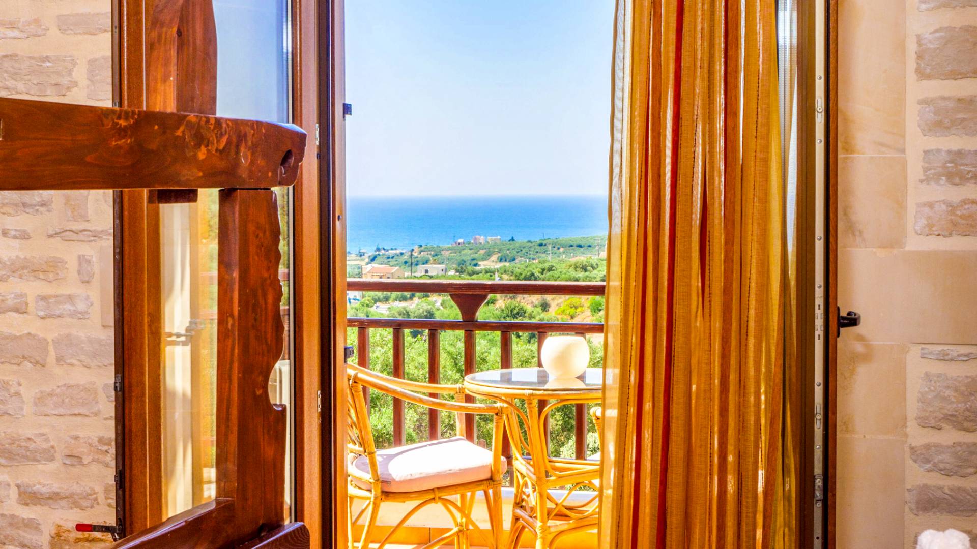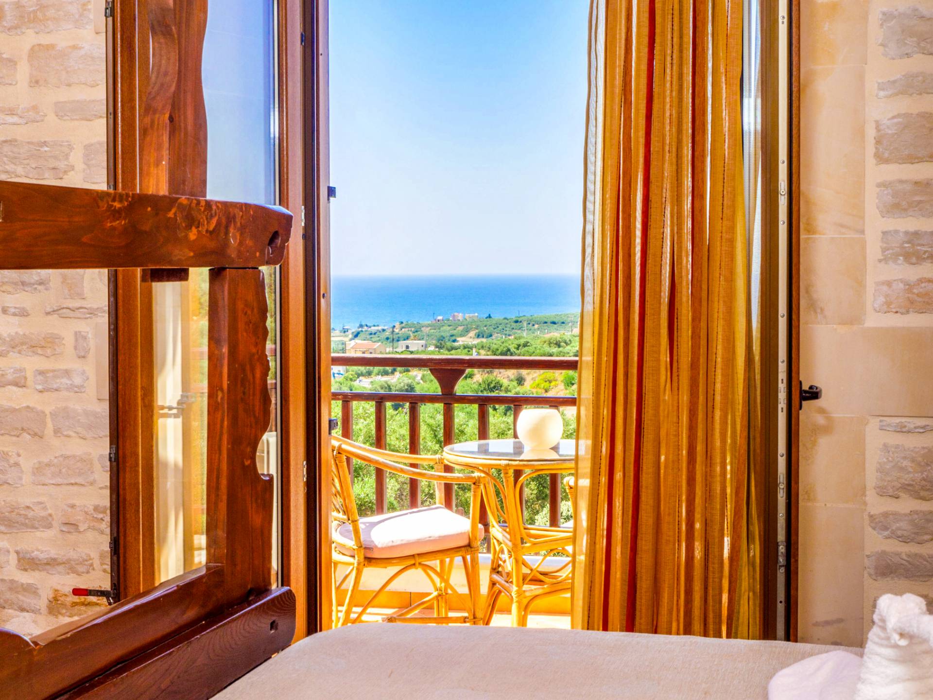 La camera da letto principale ha un letto matrimoniale e bagno/WC privato con vasca idromassaggio, le altre due hanno letti gemelli. Su questo piano si trova un altro ampio bagno con lavatrice e vasca. Ogni camera ha un balcone con una splendida vista sul mare e sulle montagne e tutte sono dotate di aria condizionata. La villa dispone anche di un bellissimo tetto di 30 mq, da cui si può godere della magnifica vista sul mare, sulle montagne e sulla città di Rethymno e rilassarsi. Eros Villa Crete offre anche ferro/asse da stiro, asciugacapelli, cassaforte, parcheggio ed è circondata da numerosi uliveti, che danno una speciale impressione di tranquillità ad ogni visitatore.