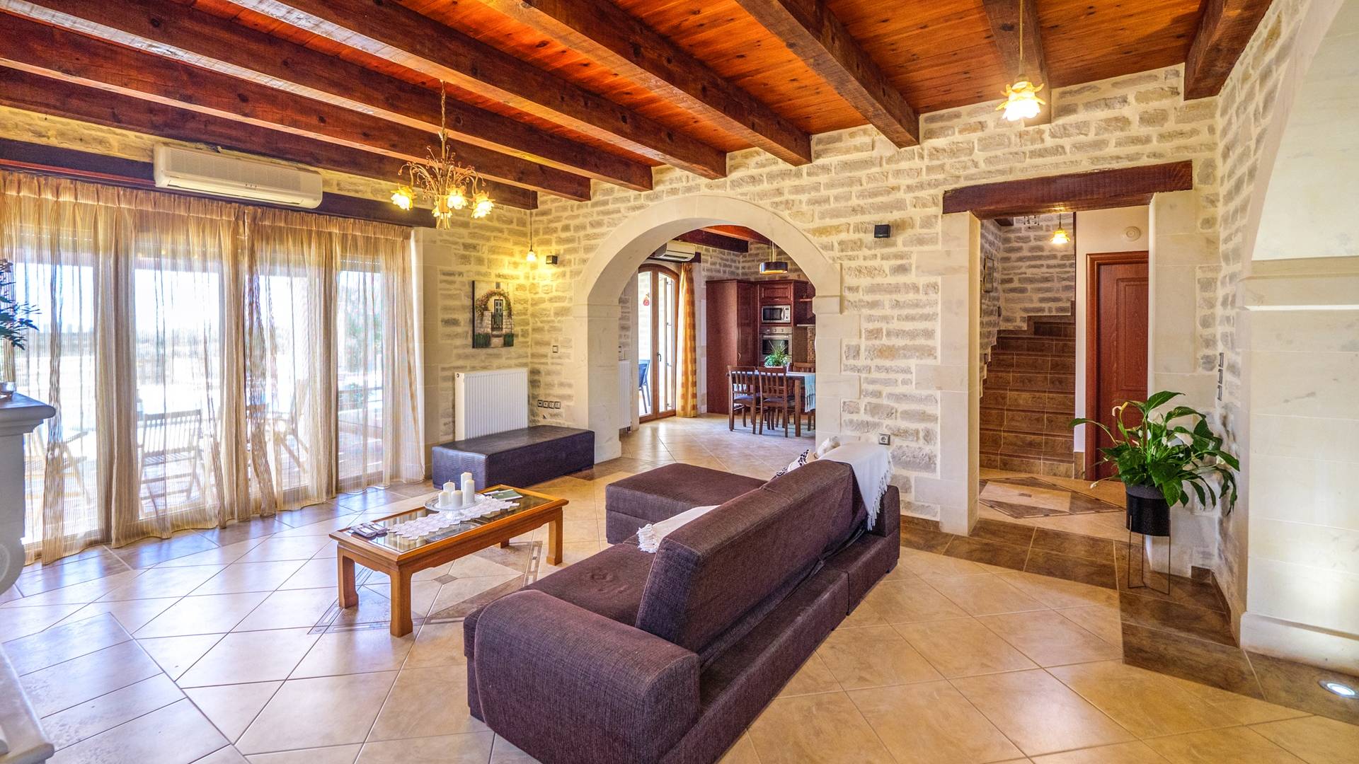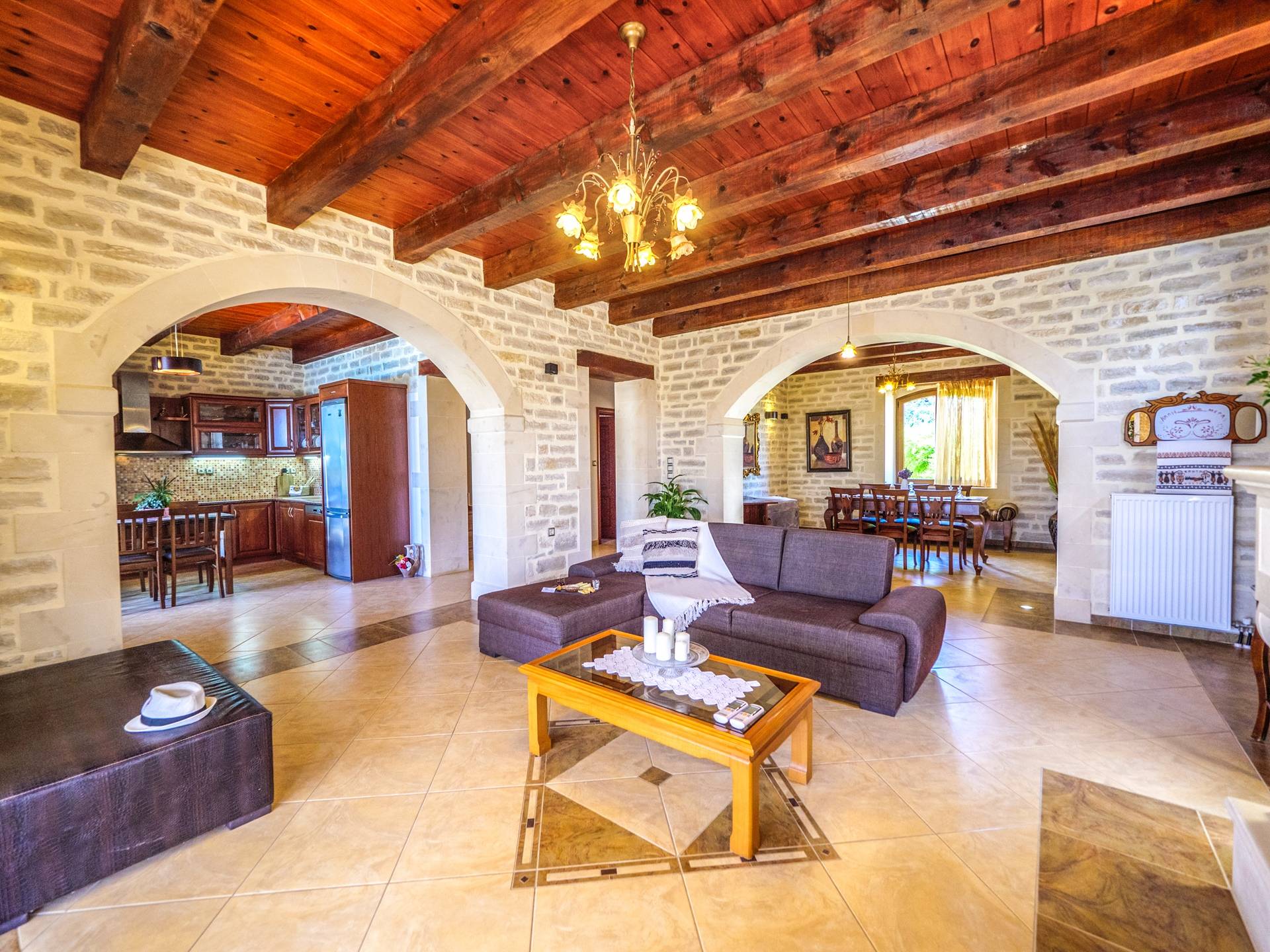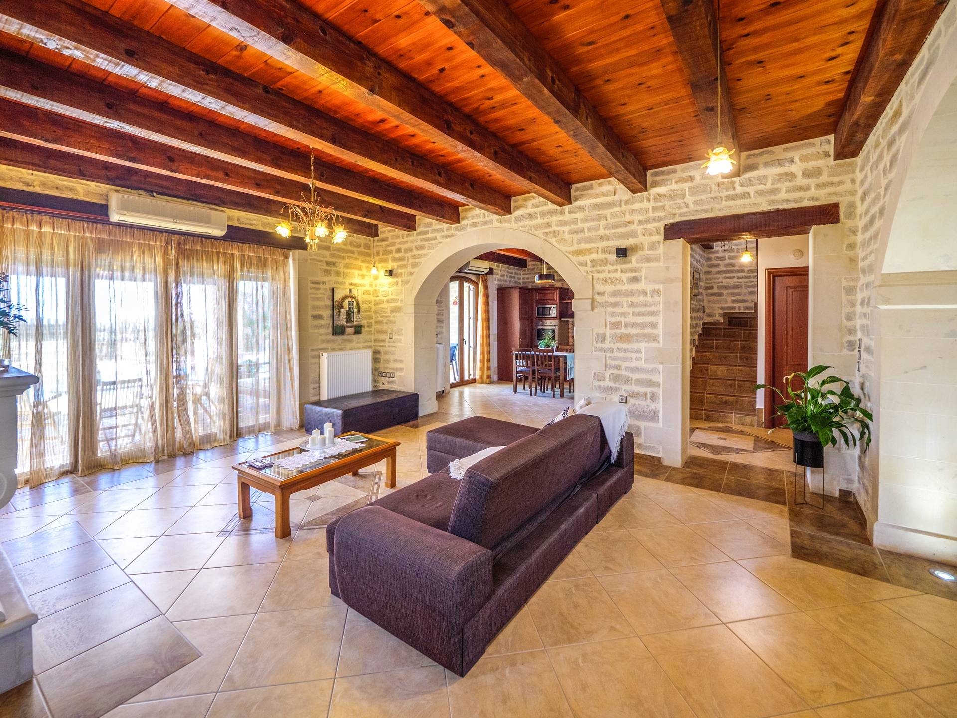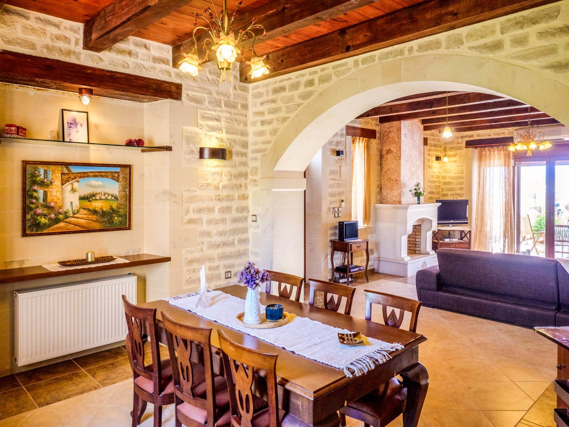 Eros Villa Crete dispone di 4 camere da letto e tre bagni adatti per 8 persone. L'ingresso conduce allo spazioso soggiorno/sala da pranzo a pianta aperta con camino, TV satellitare e confortevole area salotto. La cucina è moderna e completamente attrezzata con fornello elettrico, frigorifero/congelatore, lavastoviglie, forno a microonde, macchina per il caffè, ecc. e dispone anche di un balcone. Sempre su questo piano si trova una camera con due letti singoli e una doccia/WC. Una scala interna conduce al piano superiore dove si trovano altre tre camere da letto.