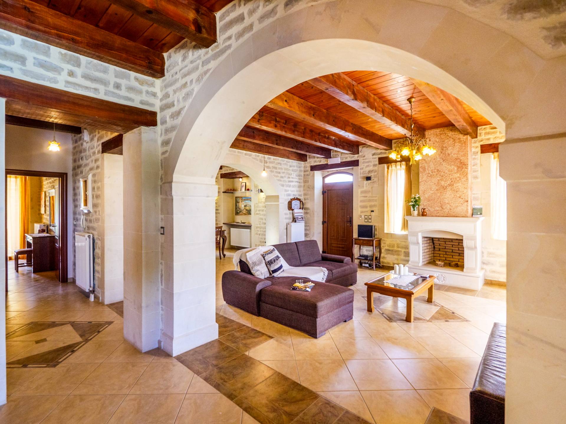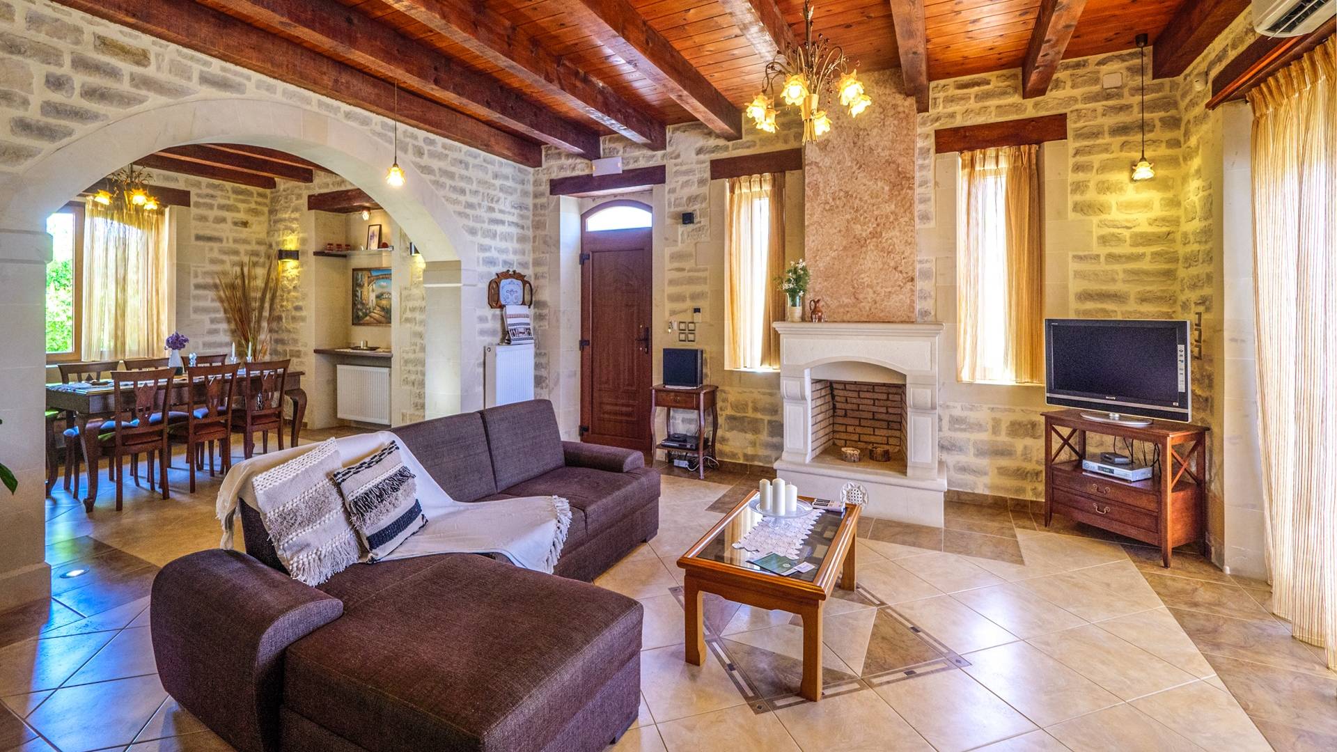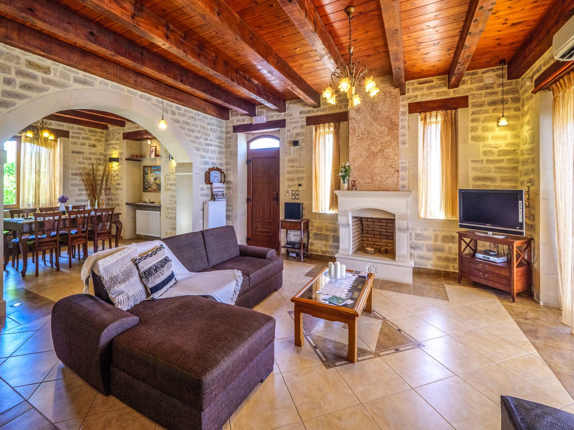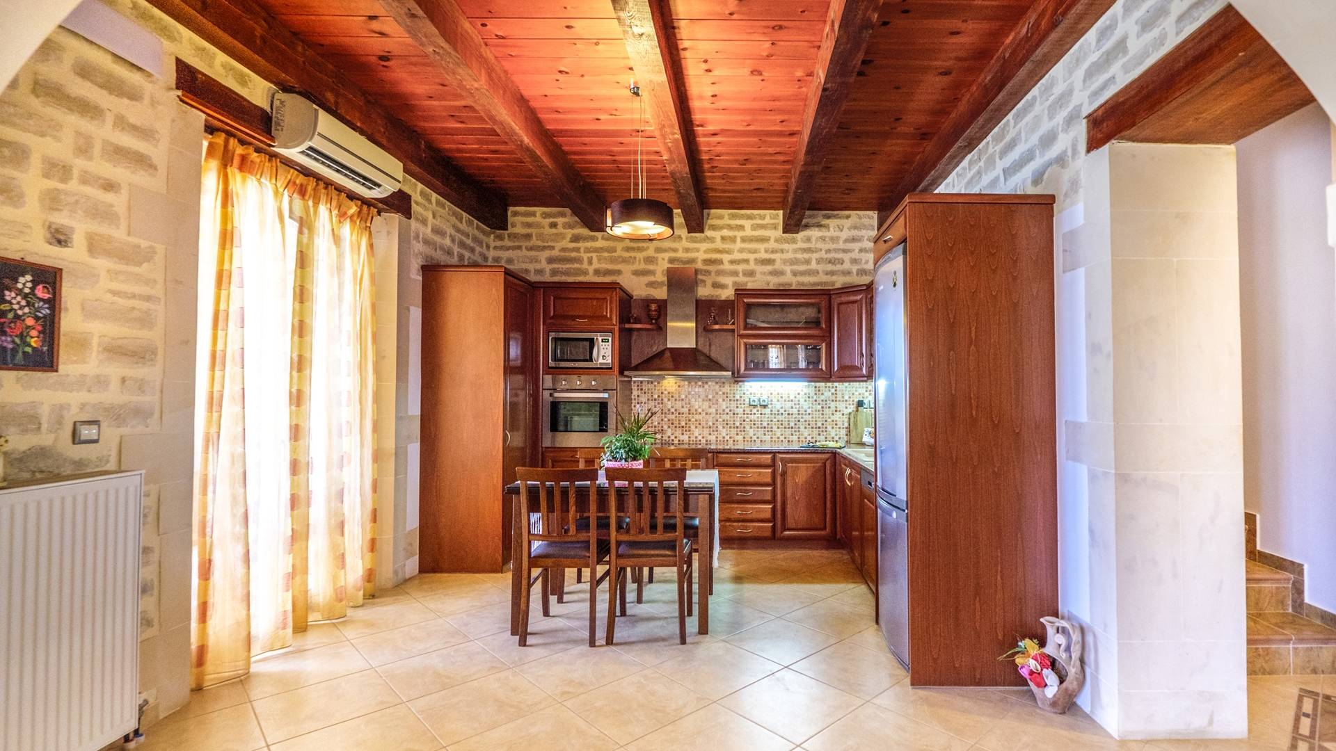 Eros Villa Crete dispone di 4 camere da letto e tre bagni adatti per 8 persone. L'ingresso conduce allo spazioso soggiorno/sala da pranzo a pianta aperta con camino, TV satellitare e confortevole area salotto. La cucina è moderna e completamente attrezzata con fornello elettrico, frigorifero/congelatore, lavastoviglie, forno a microonde, macchina per il caffè, ecc. e dispone anche di un balcone. Sempre su questo piano si trova una camera con due letti singoli e una doccia/WC. Una scala interna conduce al piano superiore dove si trovano altre tre camere da letto.