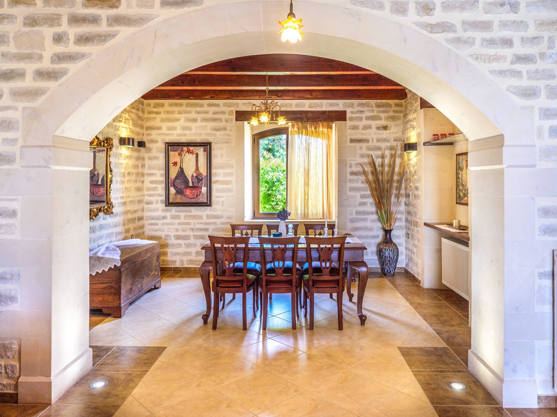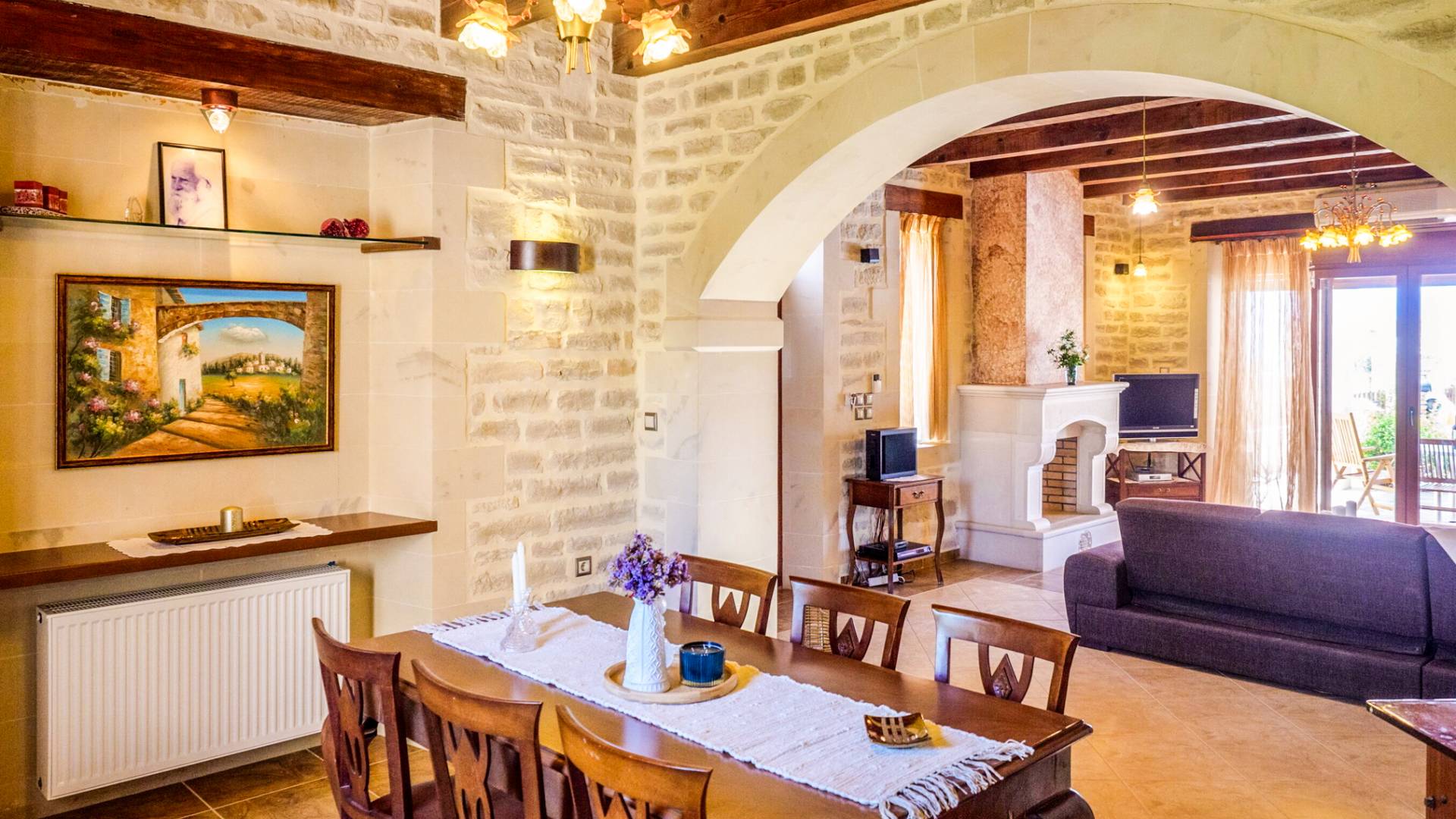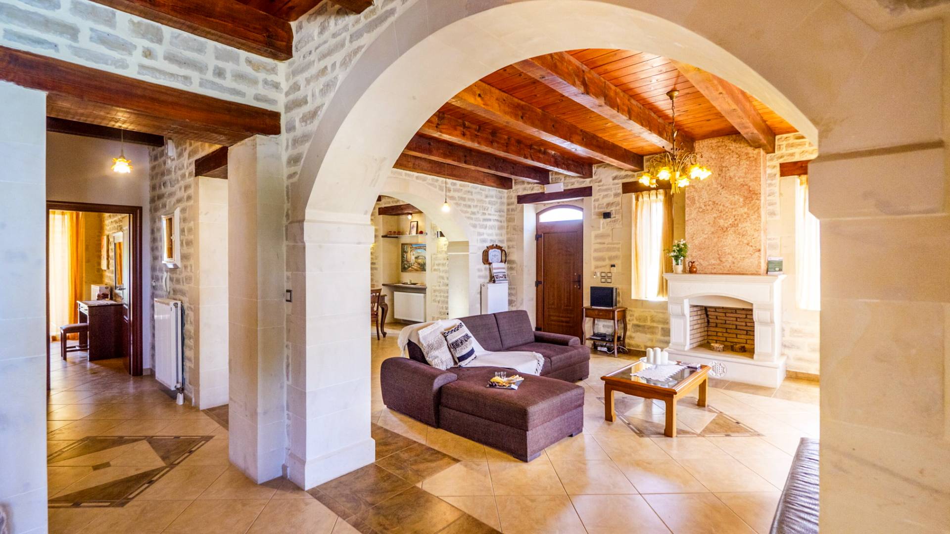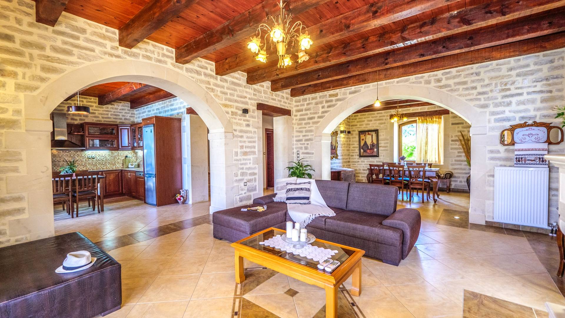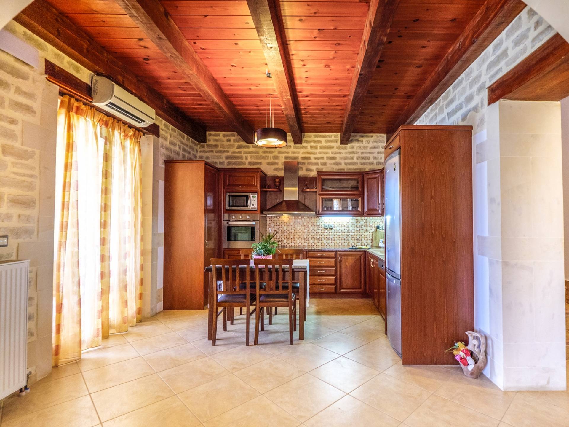 Eros Villa Crete dispone di 4 camere da letto e tre bagni adatti per 8 persone. L'ingresso conduce allo spazioso soggiorno/sala da pranzo a pianta aperta con camino, TV satellitare e confortevole area salotto. La cucina è moderna e completamente attrezzata con fornello elettrico, frigorifero/congelatore, lavastoviglie, forno a microonde, macchina per il caffè, ecc. e dispone anche di un balcone. Sempre su questo piano si trova una camera con due letti singoli e una doccia/WC. Una scala interna conduce al piano superiore dove si trovano altre tre camere da letto.