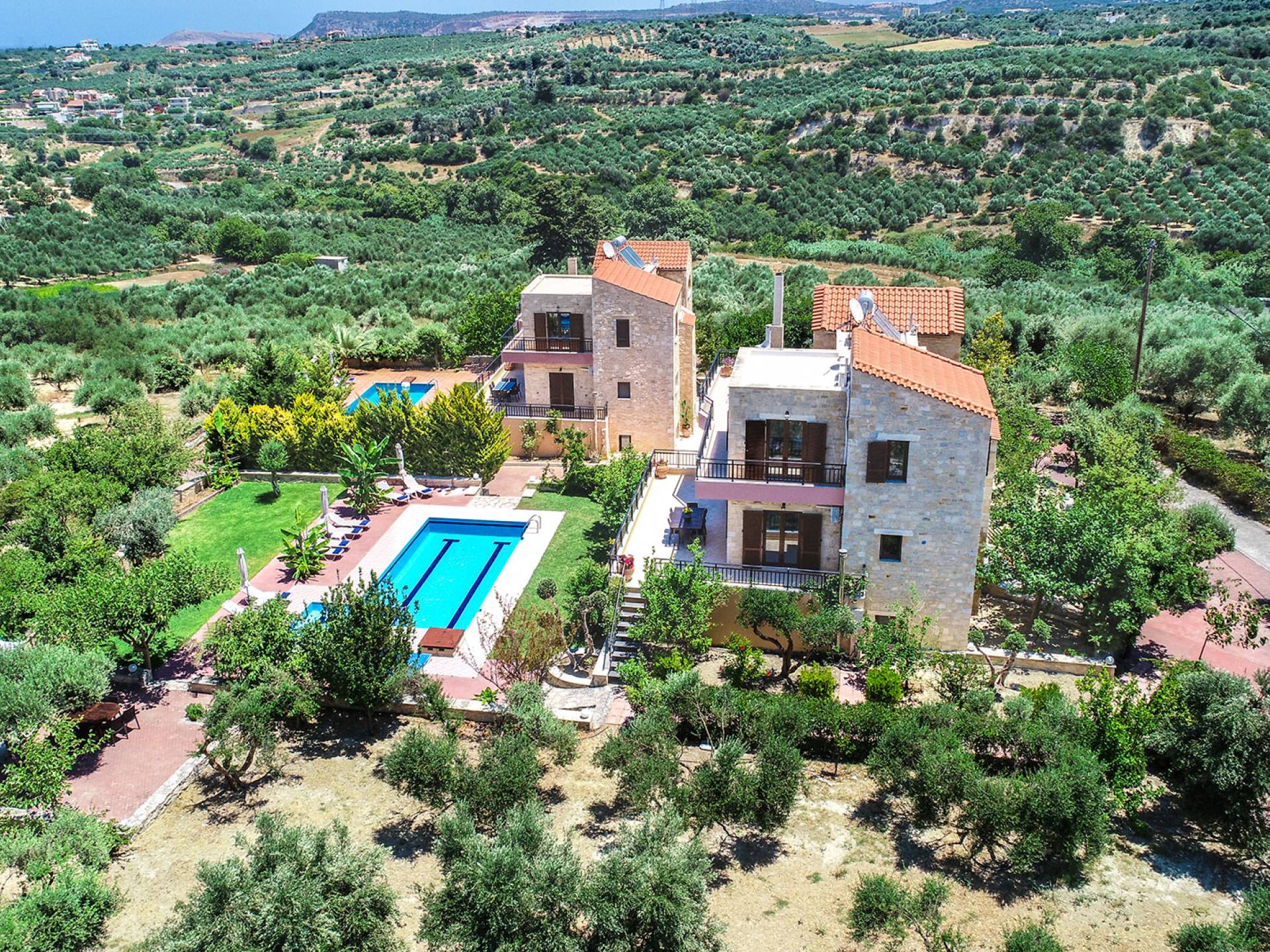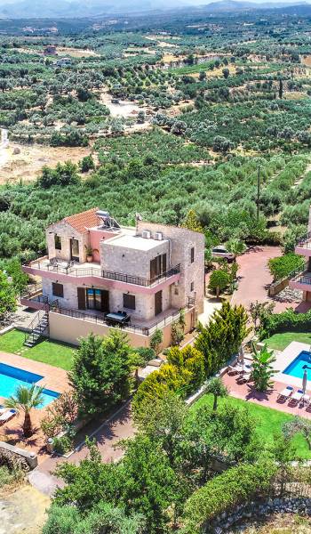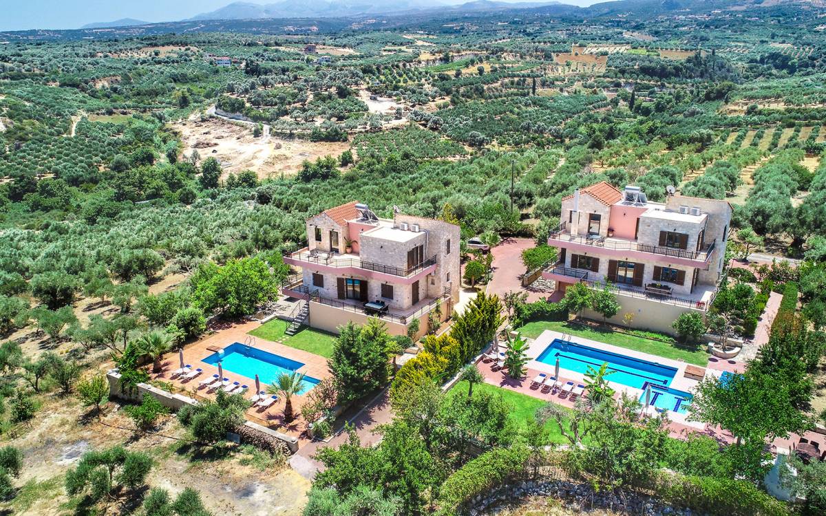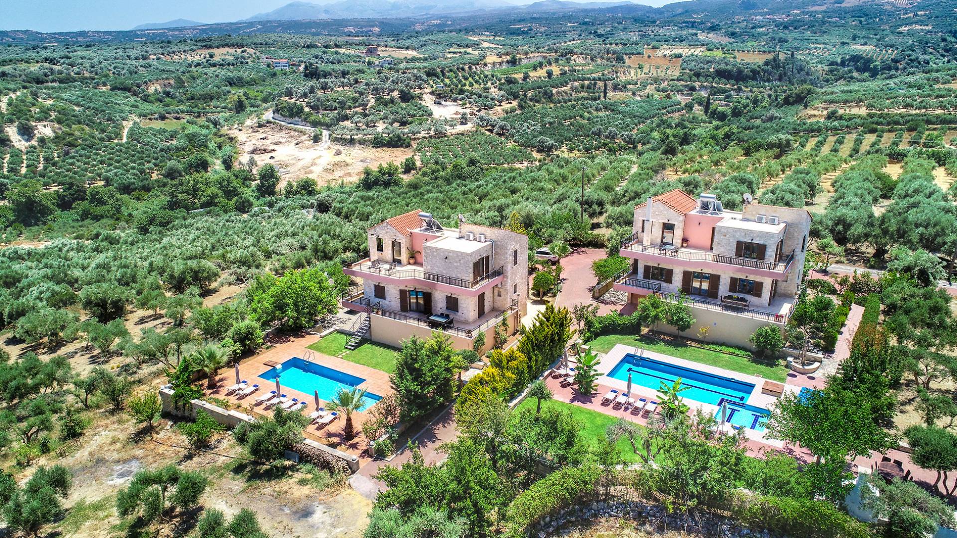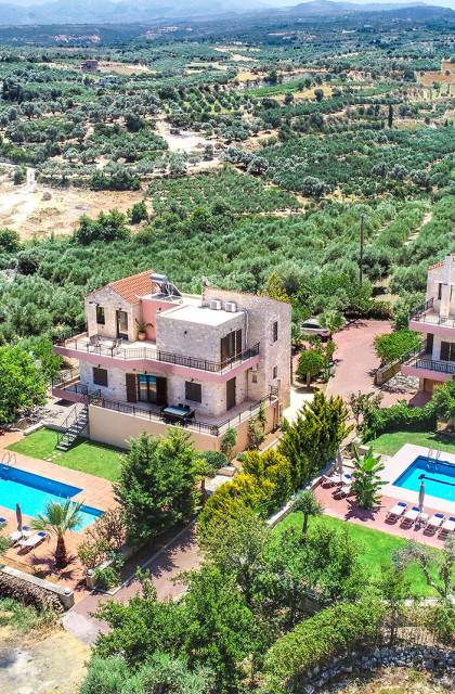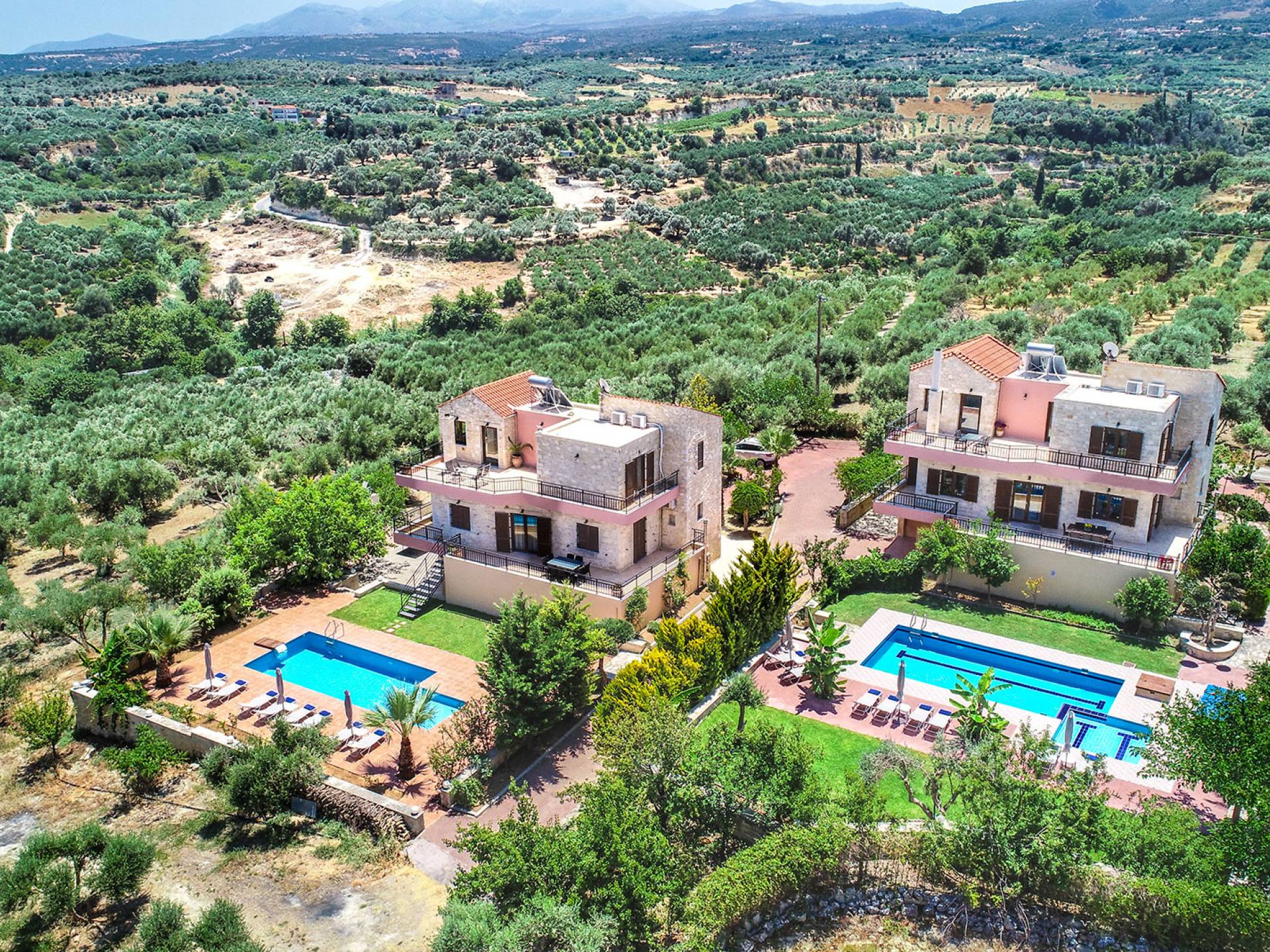 Ogni villa è composta da un interno confortevole, quattro camere da letto matrimoniali, un soggiorno, una sala da pranzo, un camino tradizionale, due bagni, una cucina completamente attrezzata, uno spazio semi-esterno e ampie verande. Entrambe le ville possono ospitare fino a 16 persone. Tutte le camere hanno una vista d'insieme sull'esclusivo paesaggio cretese. Grande enfasi è data alla decorazione che segue linee semplici e moderne che variano, con tocchi personali diversi in ogni villa per renderla unica. L'area circostante di entrambe le ville è circondata da un giardino con prato inglese, aiuole con fiori colorati, piscina privata e offre possibilità di relax e benessere. Ogni villa ha il proprio barbecue per indimenticabili serate barbecue.