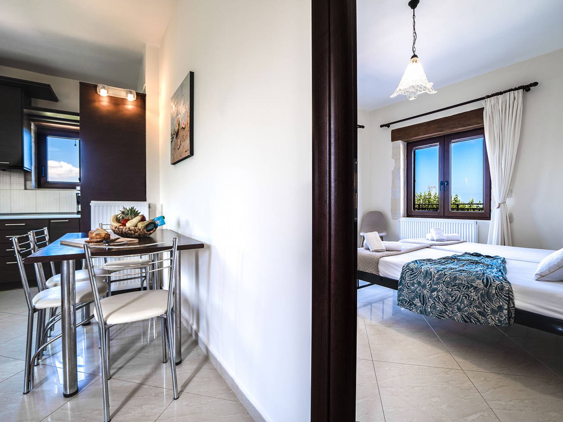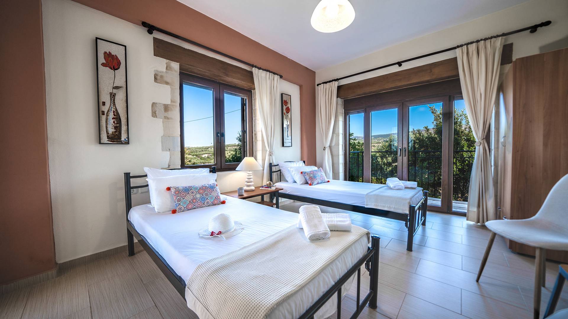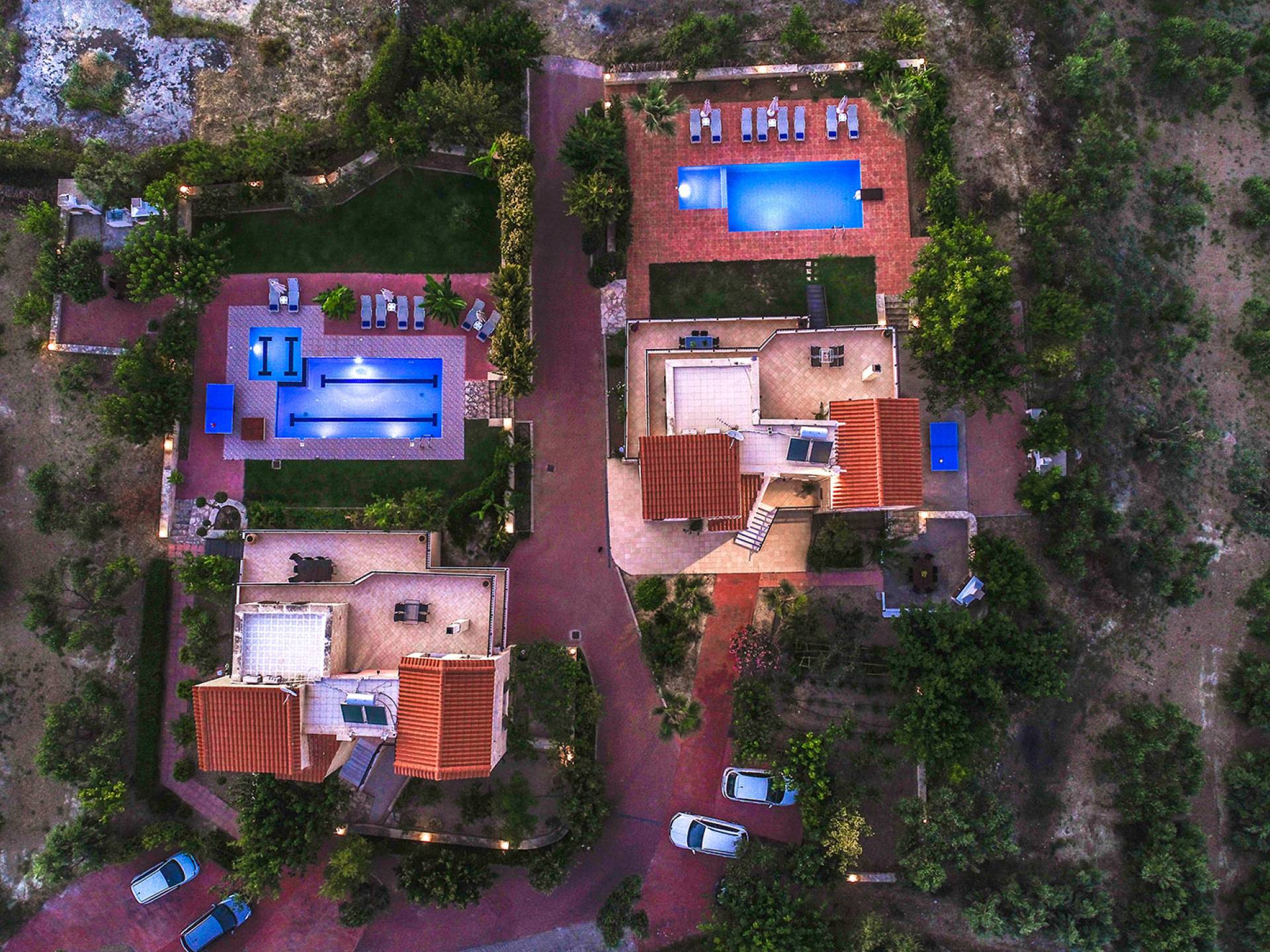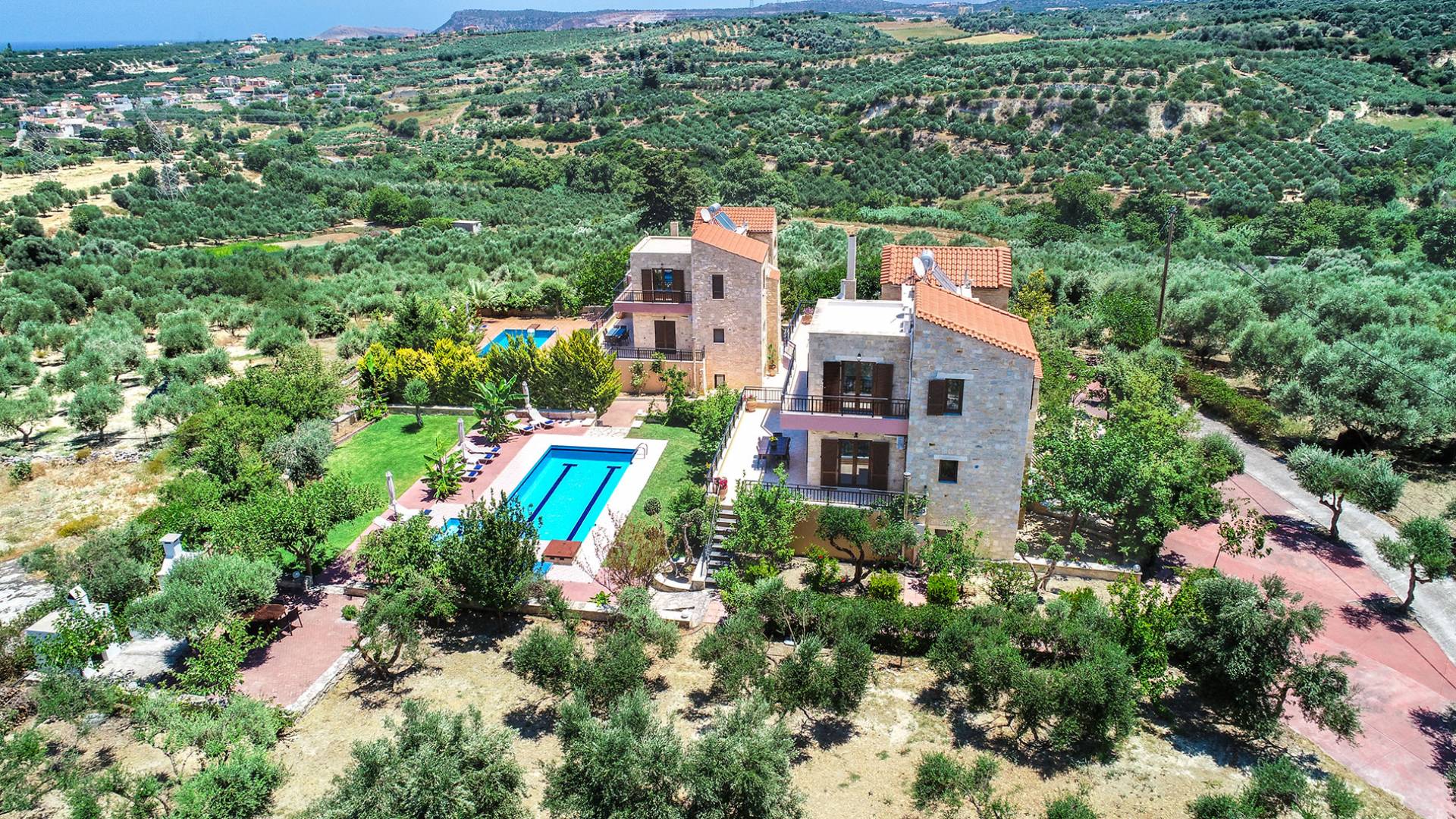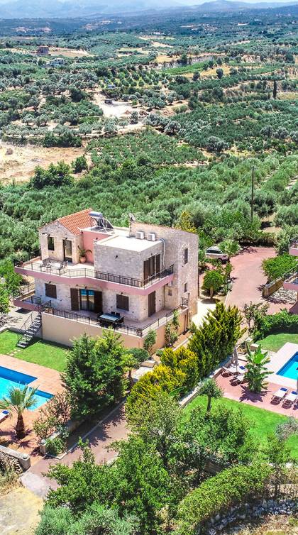 Ogni villa è composta da un interno confortevole, quattro camere da letto matrimoniali, un soggiorno, una sala da pranzo, un camino tradizionale, due bagni, una cucina completamente attrezzata, uno spazio semi-esterno e ampie verande. Entrambe le ville possono ospitare fino a 16 persone. Tutte le camere hanno una vista d'insieme sull'esclusivo paesaggio cretese. Grande enfasi è data alla decorazione che segue linee semplici e moderne che variano, con tocchi personali diversi in ogni villa per renderla unica. L'area circostante di entrambe le ville è circondata da un giardino con prato inglese, aiuole con fiori colorati, piscina privata e offre possibilità di relax e benessere. Ogni villa ha il proprio barbecue per indimenticabili serate barbecue.
