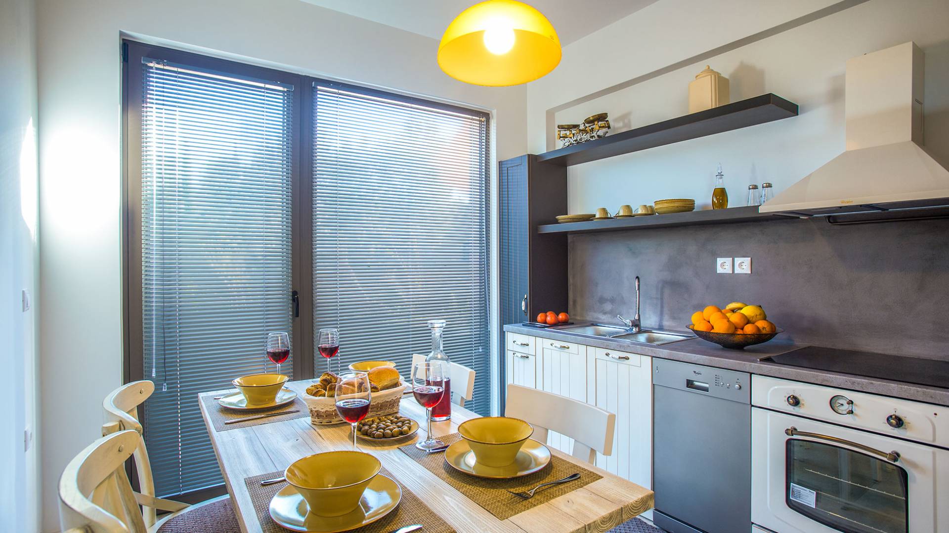 Elegante sala da pranzo e cucina moderna completamente attrezzata