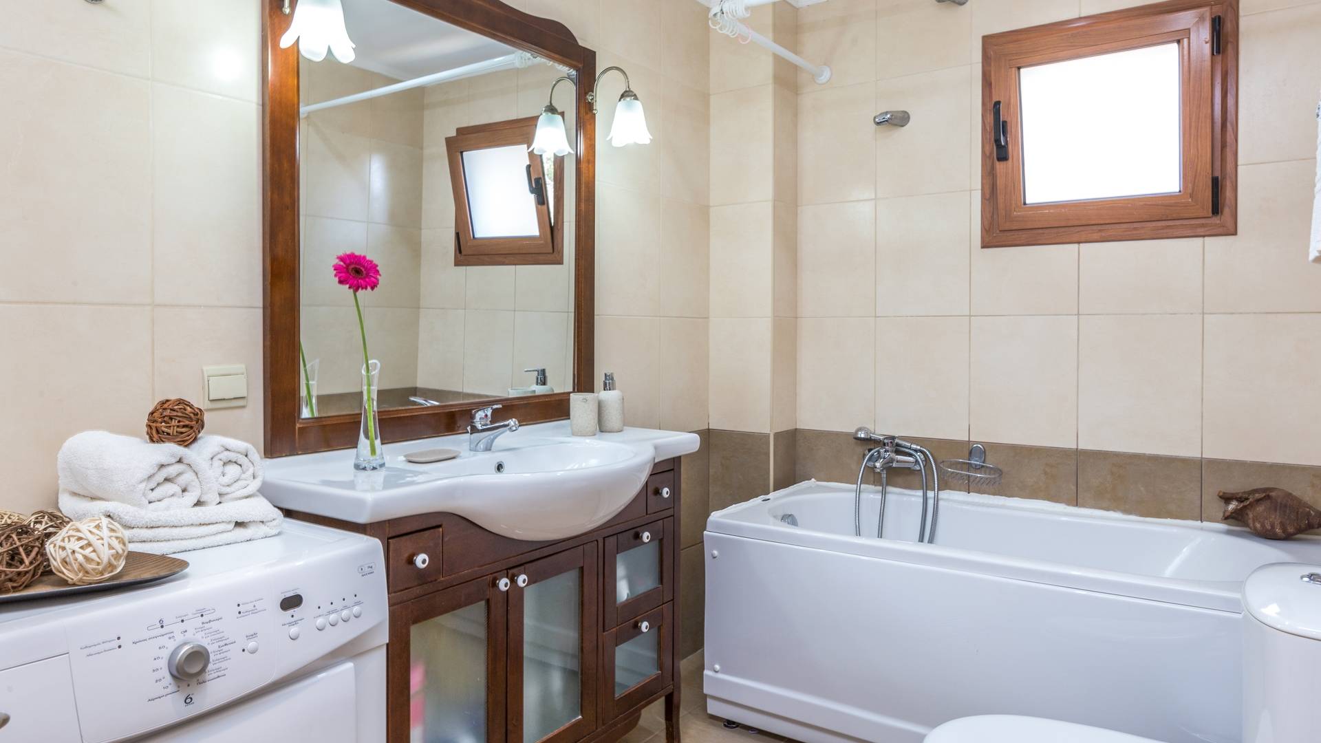 Al piano terra sono presenti un'area soggiorno a pianta aperta e una cucina completamente attrezzata con un tavolo da pranzo per 8 persone, un WC e un caminetto. Al primo piano si trova una camera da letto principale, che conduce a un balcone individuale con pergolato e una camera doppia con due letti singoli. Inoltre, c'è un lussuoso bagno con lavatrice, ferro e asse da stiro.