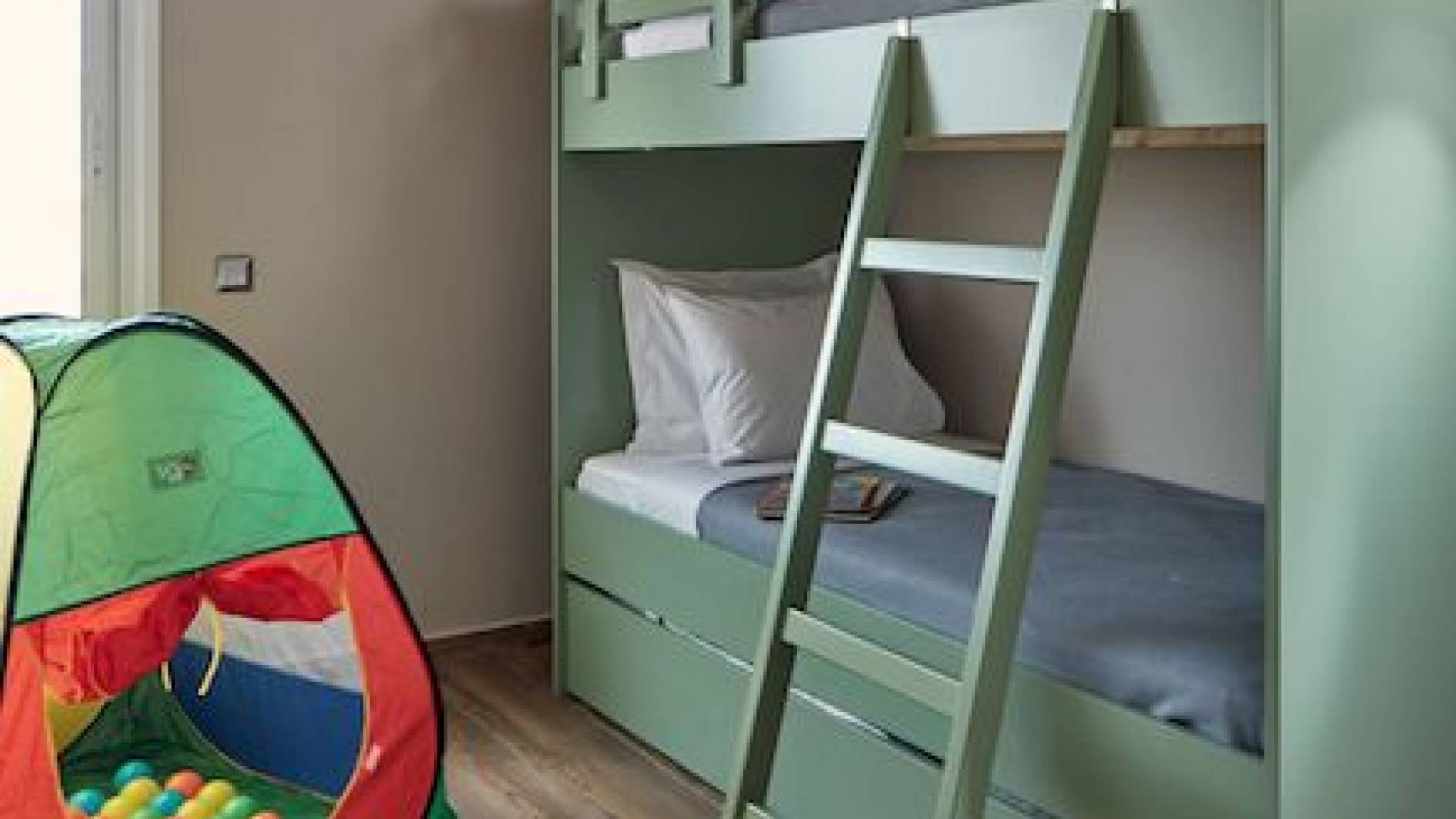 La suite familiare con due camere da letto e balcone (35 m2/376 piedi2) può ospitare fino a 5 persone, dispone di un letto queen-size, tre letti a castello, scrivania, doppio lavabo, doccia e Smart TV da 40' con balcone e vista sulla città. WiFi, caffè espresso e tè gratuiti.