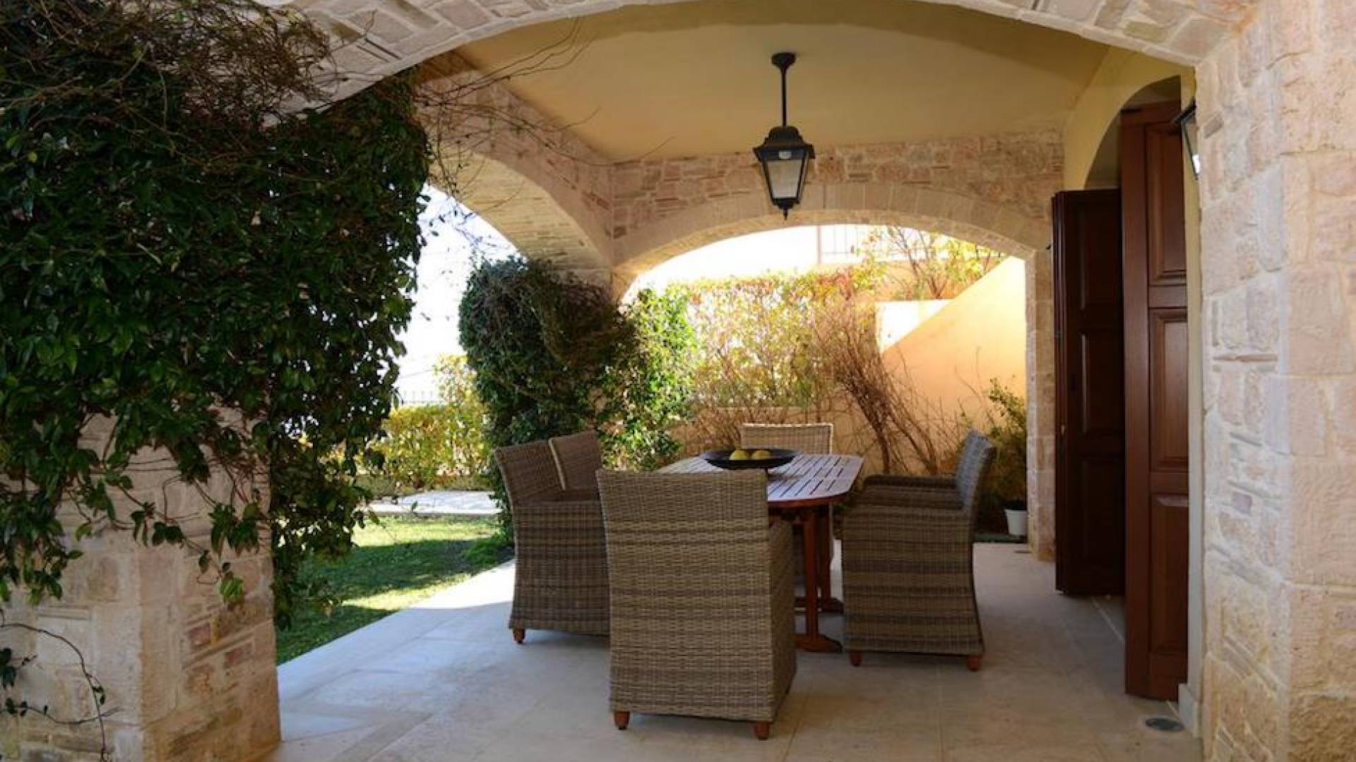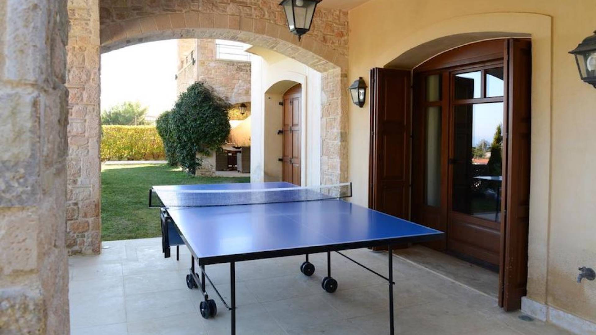 Villa Marina Neos Voutzas è circondata da un giardino sostanzialmente di tre livelli: Il primo livello è il livello della piscina. La piscina è circondata da un ponte in legno. C'è anche abbastanza spazio verde con erba e piante e alberi decorativi. Il secondo livello è il livello del secondo soggiorno, la cucina e due delle camere da letto, due bagni e la lavanderia. Qui gli ospiti possono godersi il sole sull'erba o rilassarsi, mangiare o giocare a ping-pong sotto due verande in pietra protette. Il terzo livello del giardino si trova nella parte posteriore della casa, al livello del soggiorno principale e della palestra. Qui gli ospiti possono godersi l'erba o la "loggia". Nel lodge c'è un barbecue in pietra, un forno in pietra e un lungo tavolo in legno del monastero.