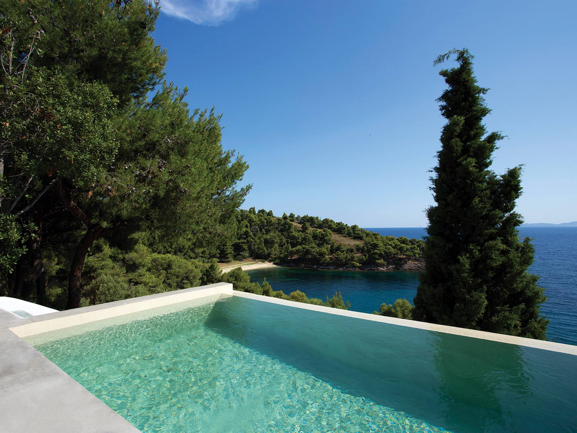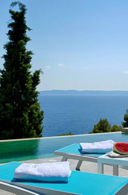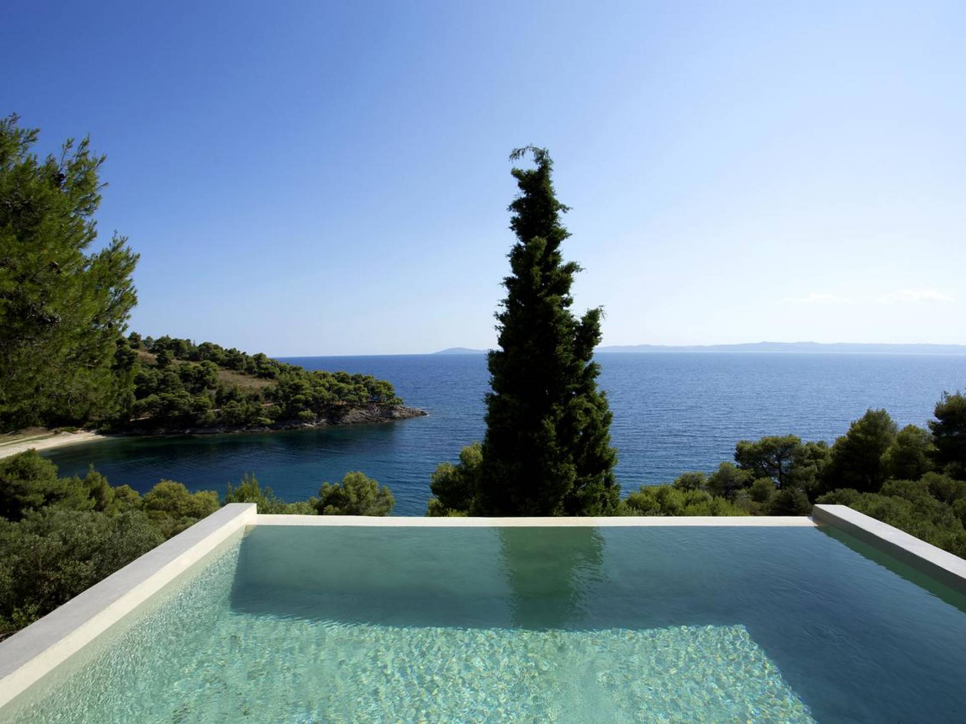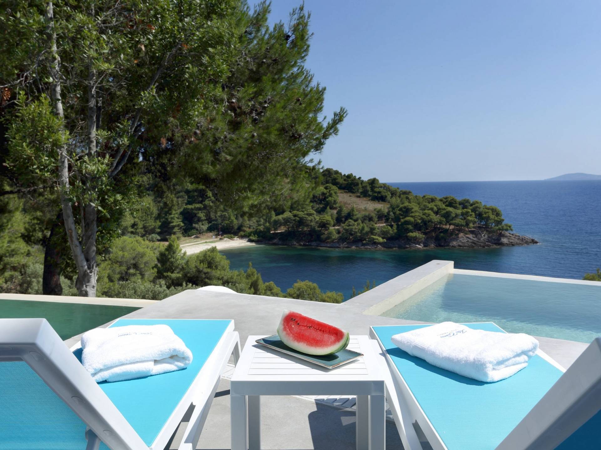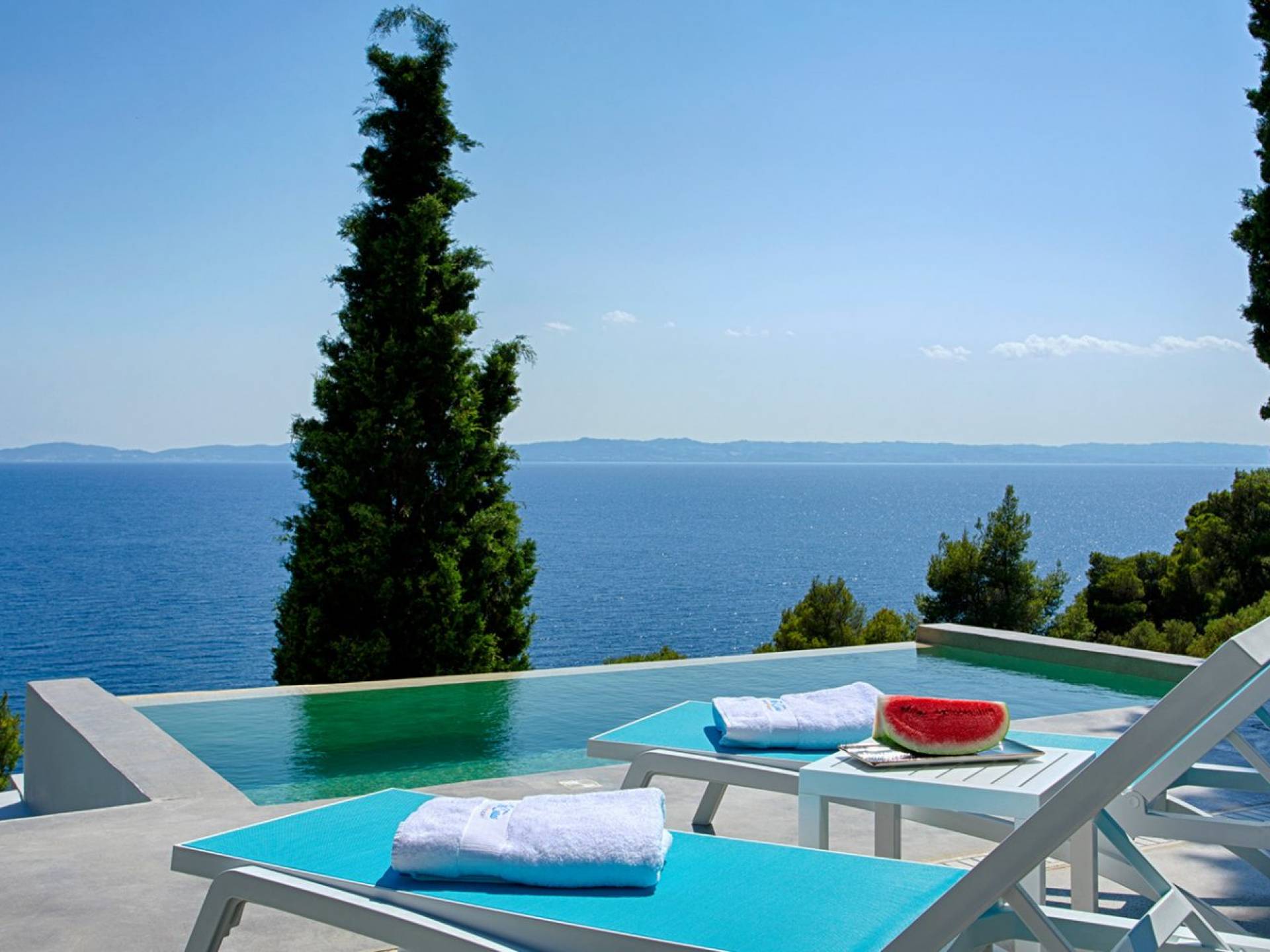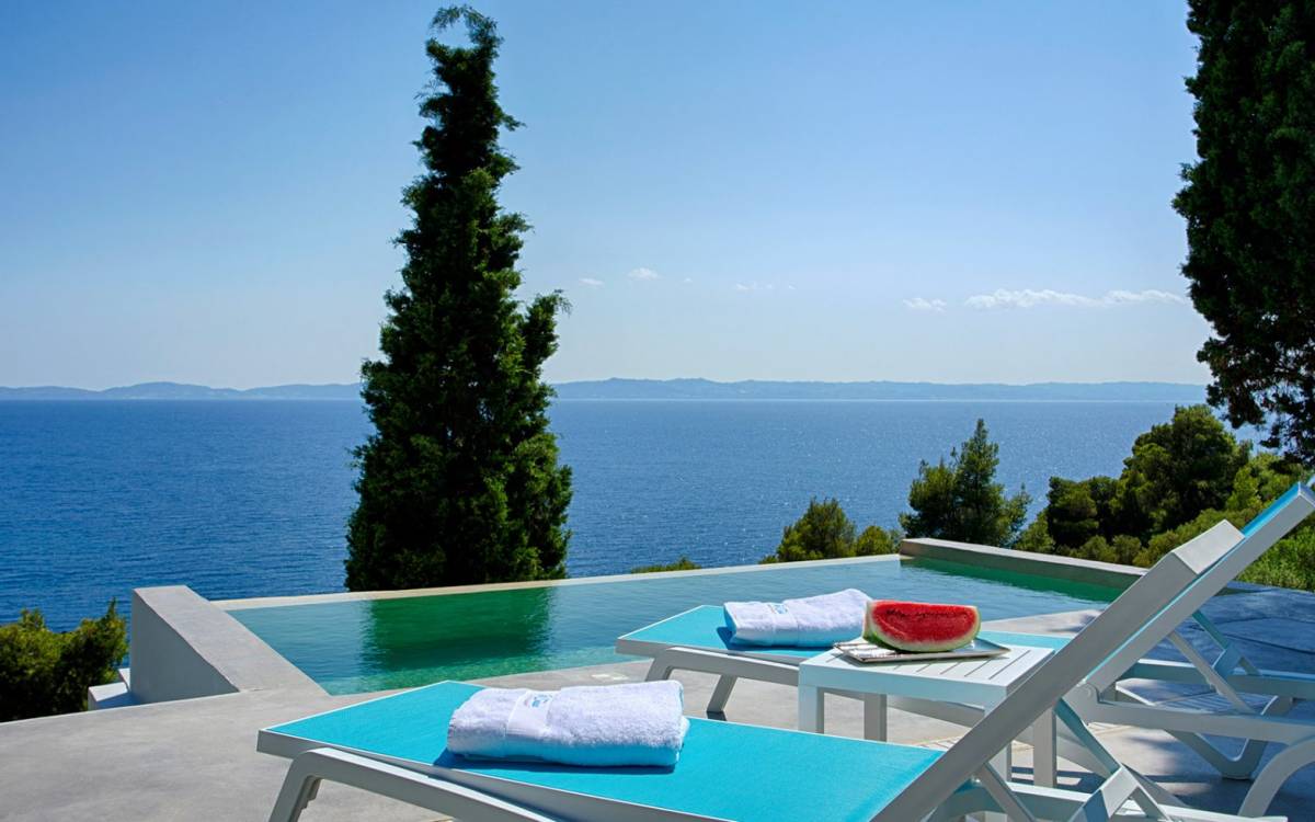 Questa versatile proprietà con cinque camere da letto di 245 mq. possono essere affittate come tre ville indipendenti e totalmente private con una o due camere da letto o semplicemente essere separate da porte comunicanti per creare combinazioni di due e quattro camere da letto in grado di ospitare un massimo di 14 ospiti. Ogni villa ha la propria piscina (con recinzione disponibile), un'accogliente zona soggiorno e pranzo e una cucina completamente attrezzata, mentre tutte le camere sono dotate di bagni moderni con doccia, letti king-size e TV/lettori DVD. Le tre ville sono poste in privato, complete di piante fiorite e lettini prendisole intorno alle piscine. Gli ospiti sono circondati da alberi di pino e godono di una vista superba sulle acque cristalline del Mar Egeo.