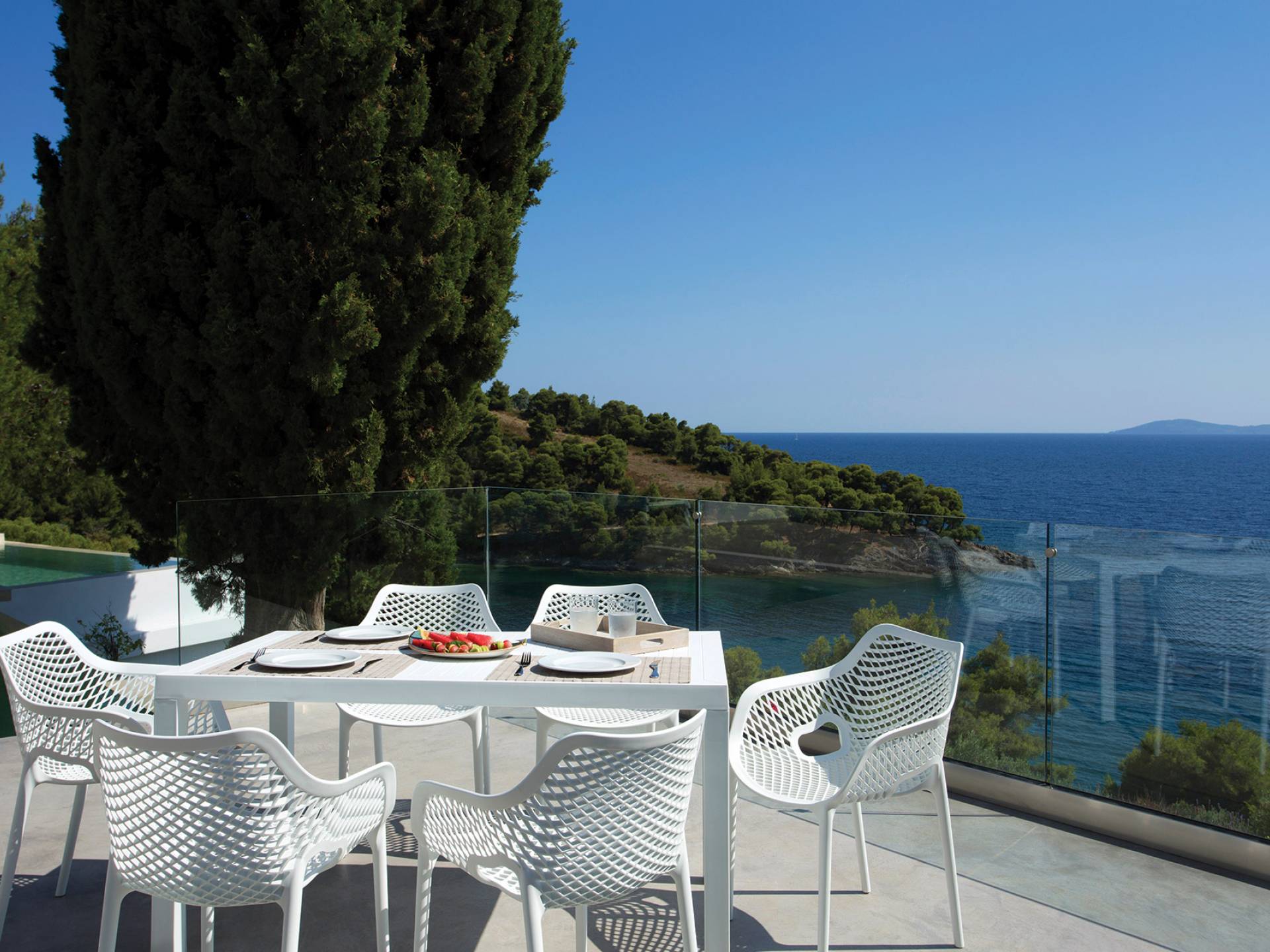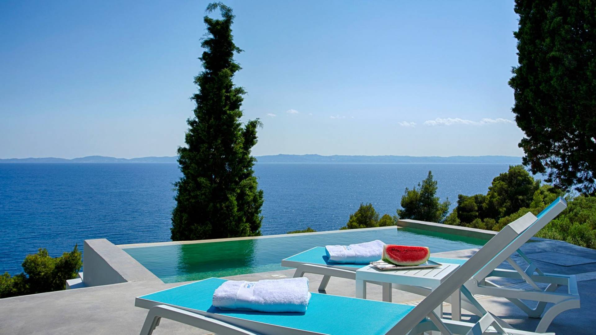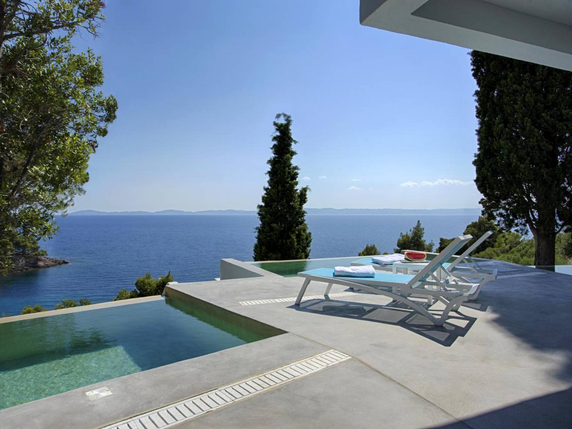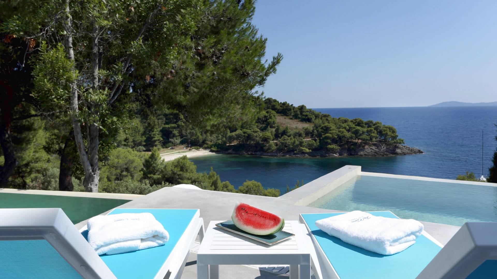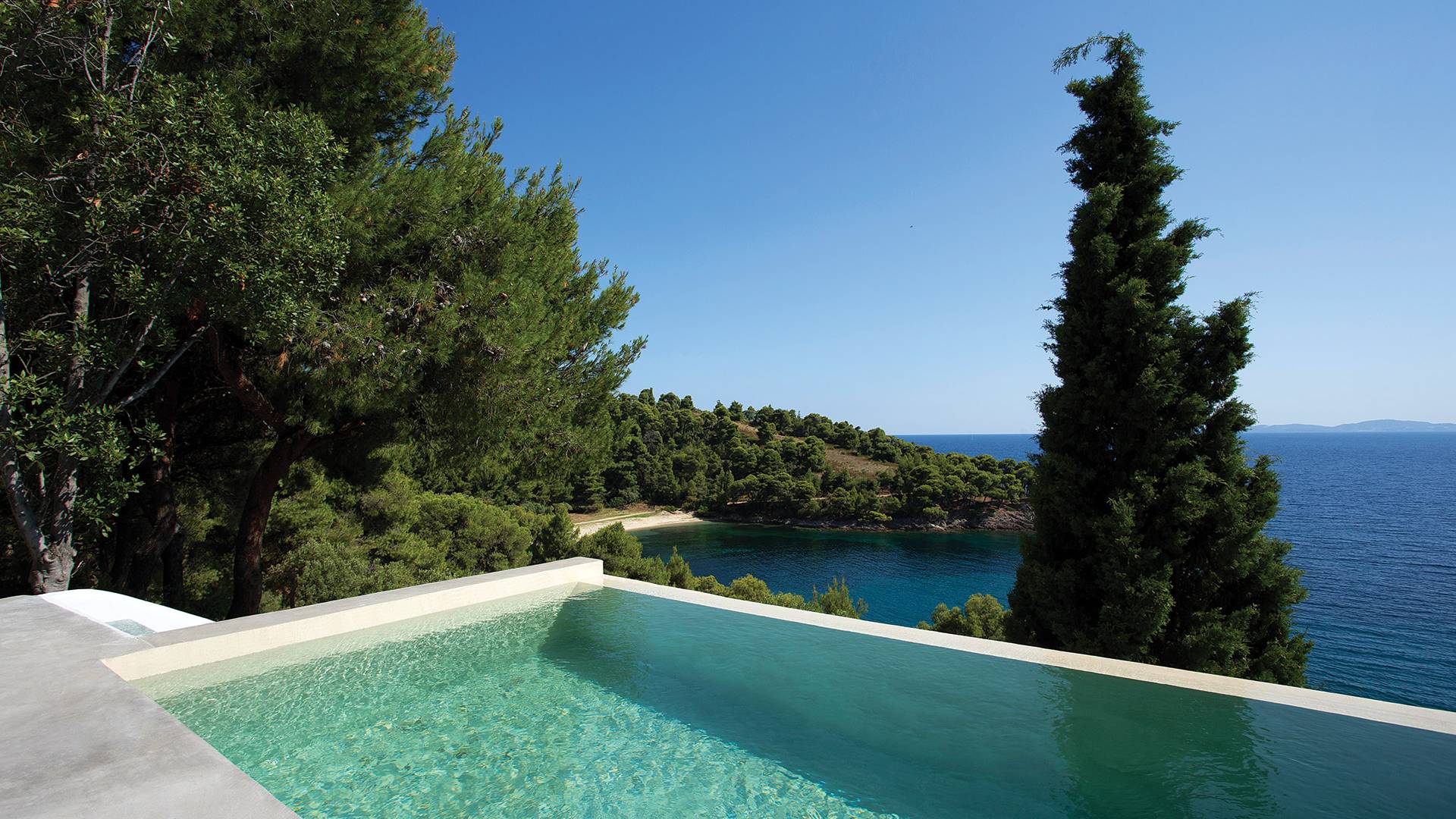 Questa versatile proprietà con cinque camere da letto di 245 mq. possono essere affittate come tre ville indipendenti e totalmente private con una o due camere da letto o semplicemente essere separate da porte comunicanti per creare combinazioni di due e quattro camere da letto in grado di ospitare un massimo di 14 ospiti. Ogni villa ha la propria piscina (con recinzione disponibile), un'accogliente zona soggiorno e pranzo e una cucina completamente attrezzata, mentre tutte le camere sono dotate di bagni moderni con doccia, letti king-size e TV/lettori DVD. Le tre ville sono poste in privato, complete di piante fiorite e lettini prendisole intorno alle piscine. Gli ospiti sono circondati da alberi di pino e godono di una vista superba sulle acque cristalline del Mar Egeo.