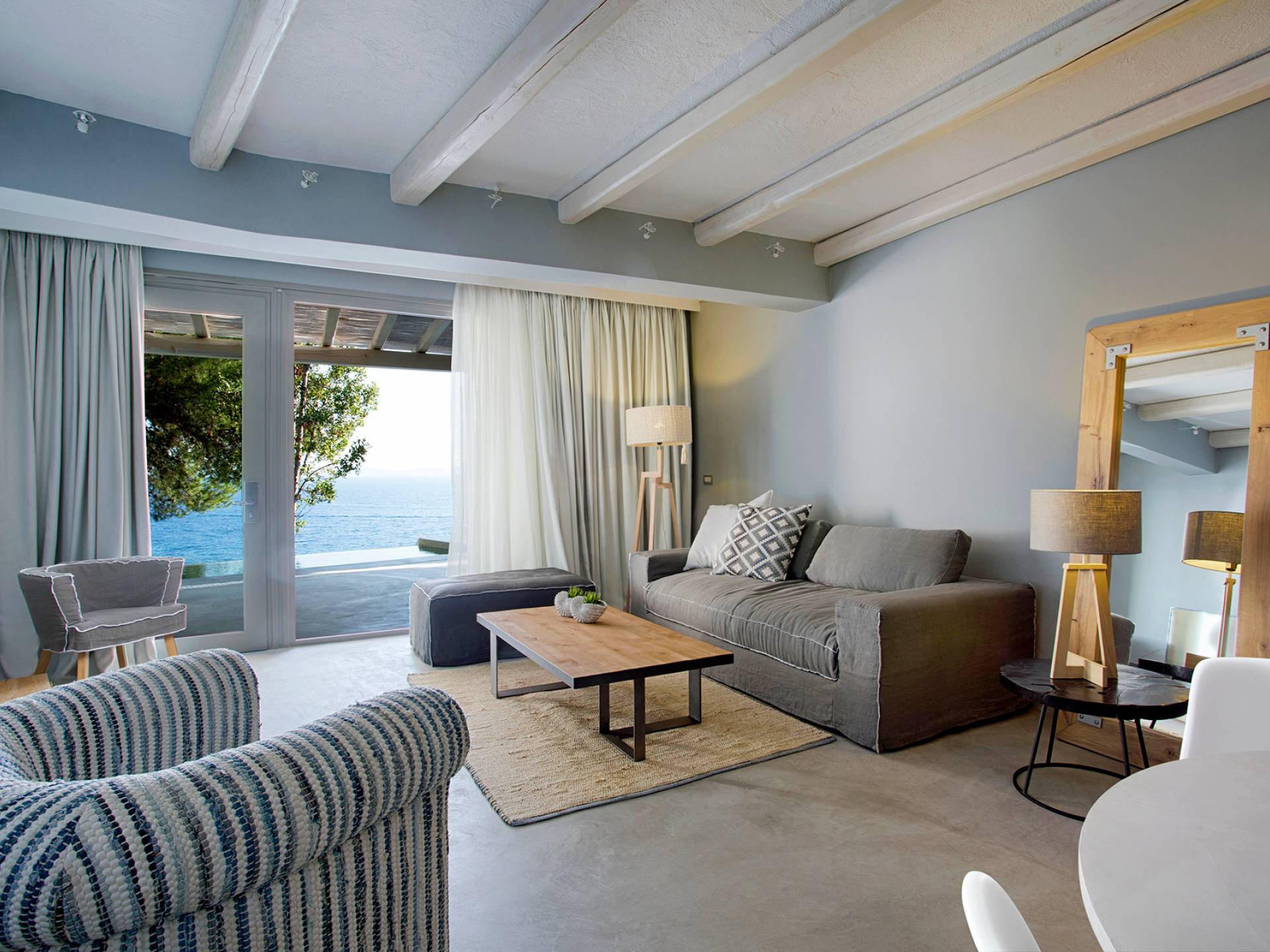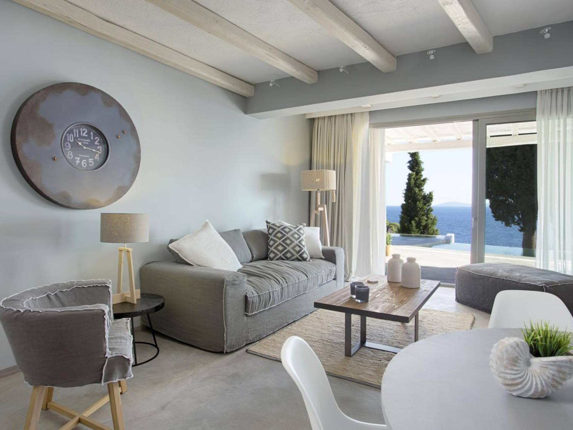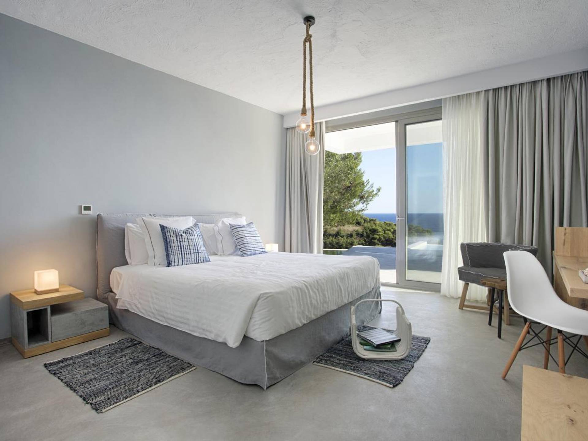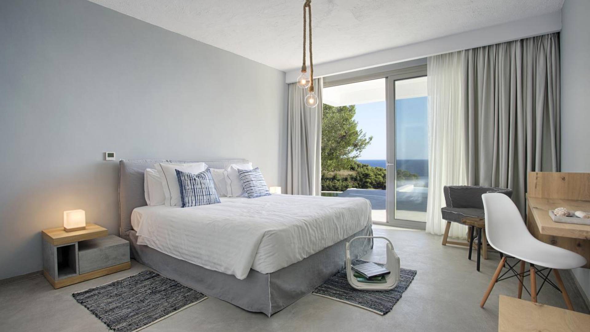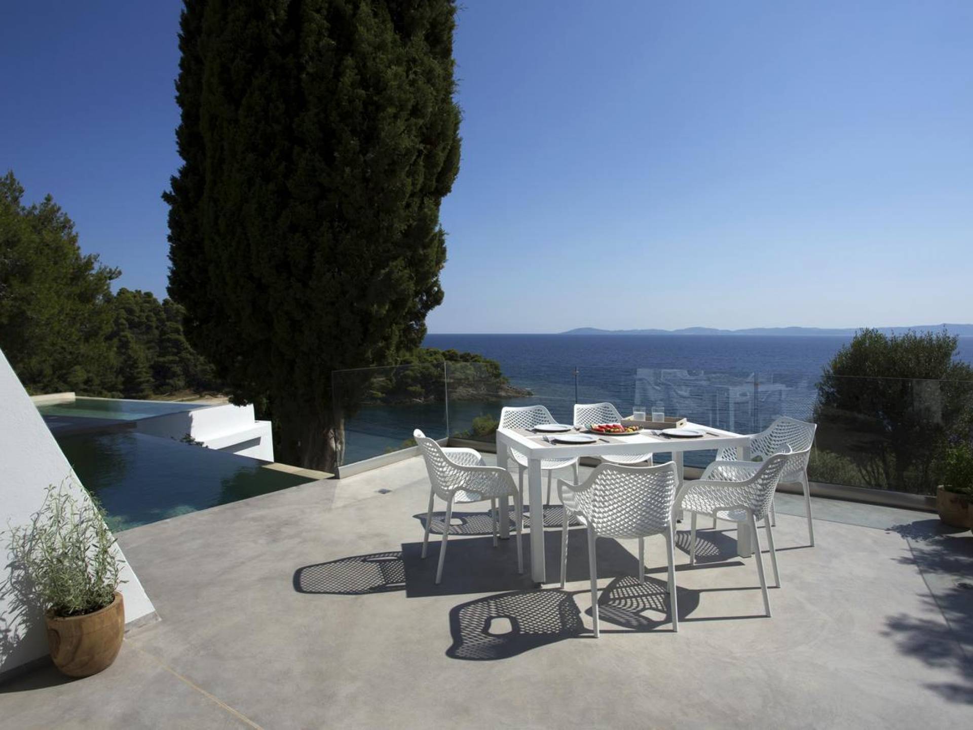 Questa versatile proprietà con cinque camere da letto di 245 mq. possono essere affittate come tre ville indipendenti e totalmente private con una o due camere da letto o semplicemente essere separate da porte comunicanti per creare combinazioni di due e quattro camere da letto in grado di ospitare un massimo di 14 ospiti. Ogni villa ha la propria piscina (con recinzione disponibile), un'accogliente zona soggiorno e pranzo e una cucina completamente attrezzata, mentre tutte le camere sono dotate di bagni moderni con doccia, letti king-size e TV/lettori DVD. Le tre ville sono poste in privato, complete di piante fiorite e lettini prendisole intorno alle piscine. Gli ospiti sono circondati da alberi di pino e godono di una vista superba sulle acque cristalline del Mar Egeo.